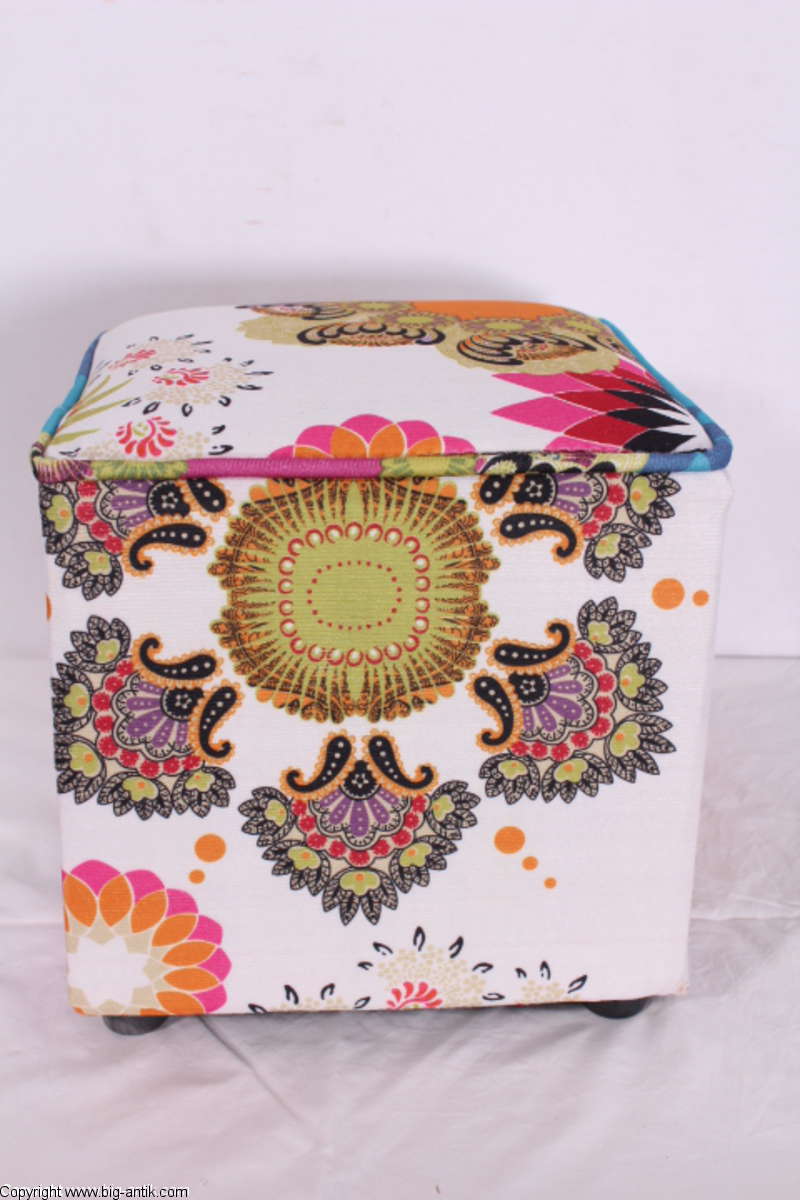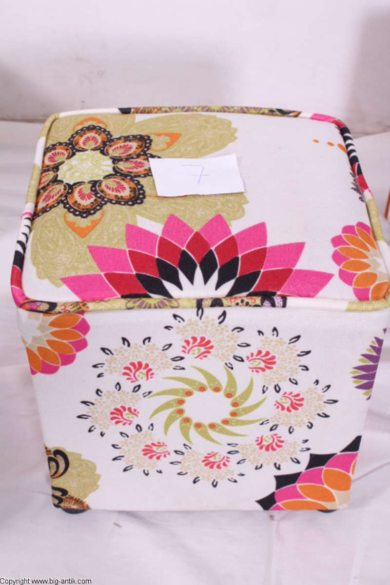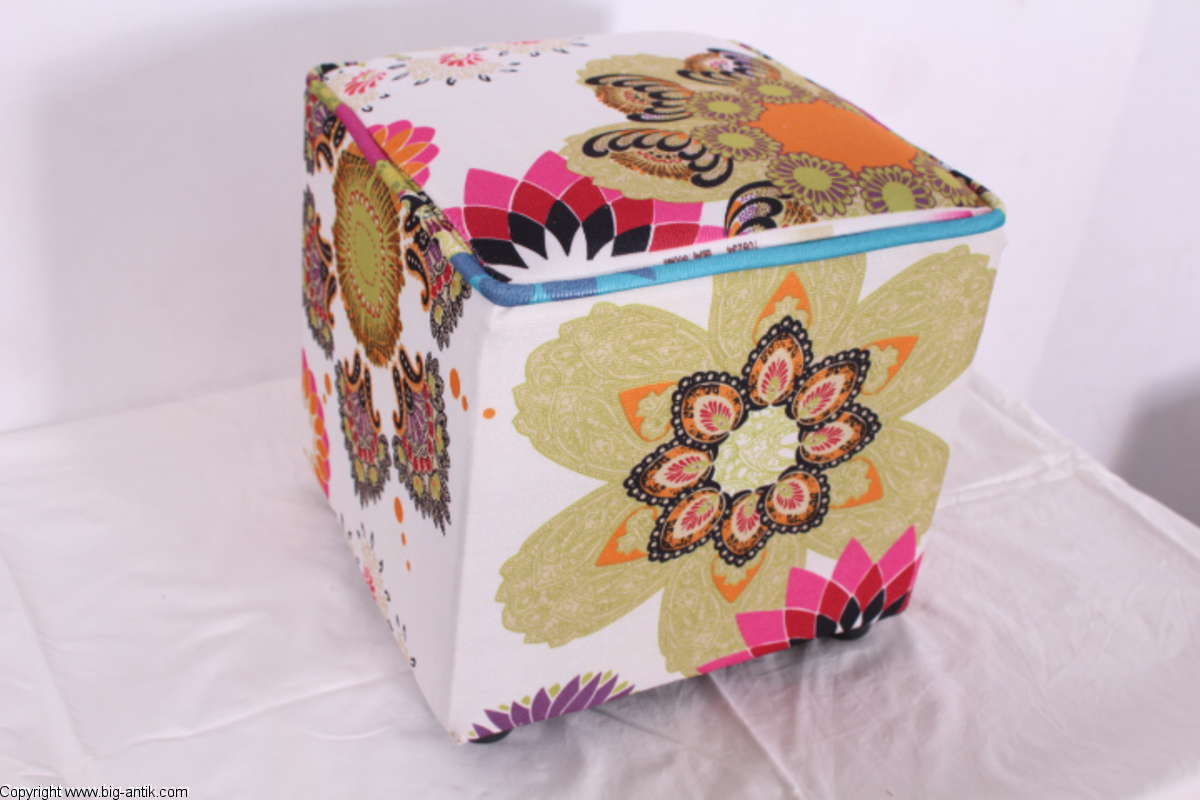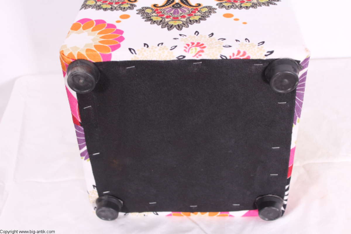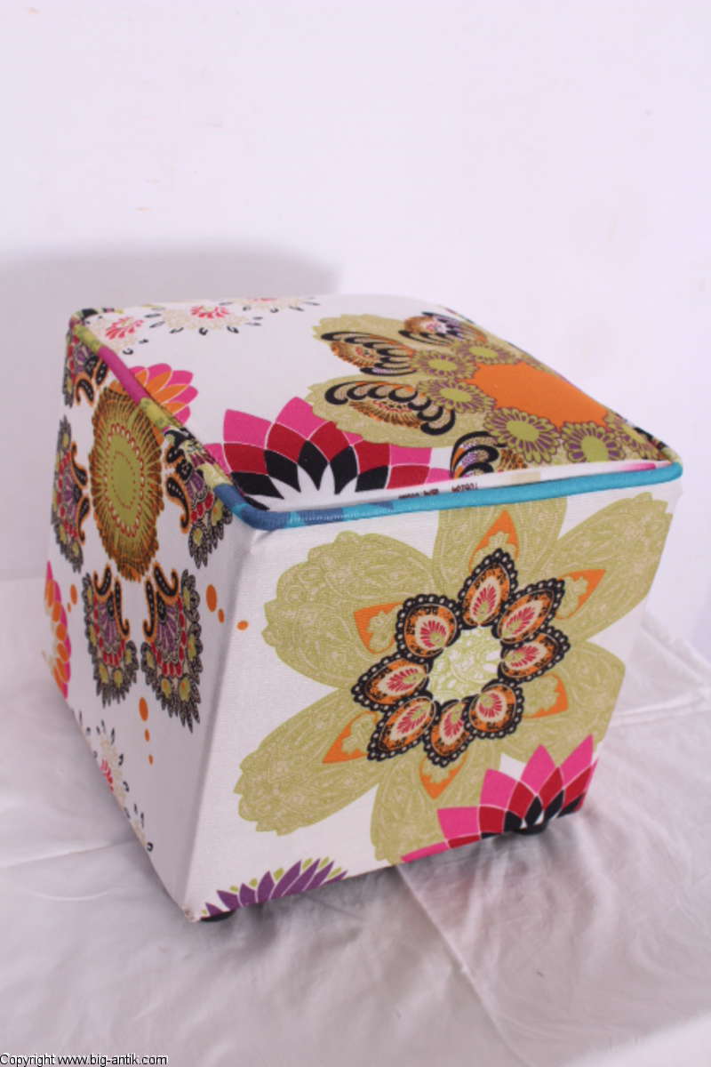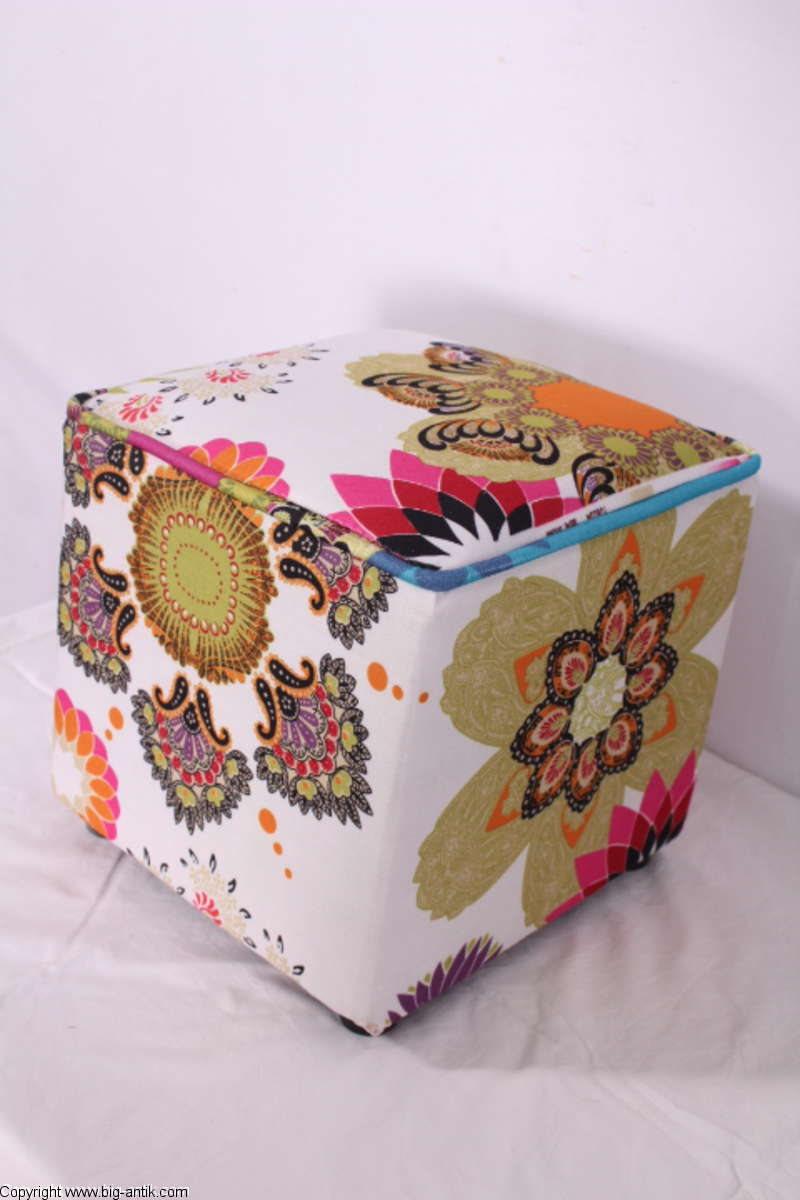 Angeboten wird ein wunderschöner kleiner Hocker / CUBE / Würfelhocker / Sitzhocker im schönen 70er Jahre Stil. Der farbenfrohe Würfelhocker ist mit einem bunt gemusterten Stoff bezogen und steht auf vier kleinen runden Kunststoffbeinen. Der kultige kleine Sitzhocker ist neu. Wir haben insgesamt 7 Hocker dieser Art und viele weitere mit unterschiedlichen Stoffmustern bzw. Farben in unserem Shop.