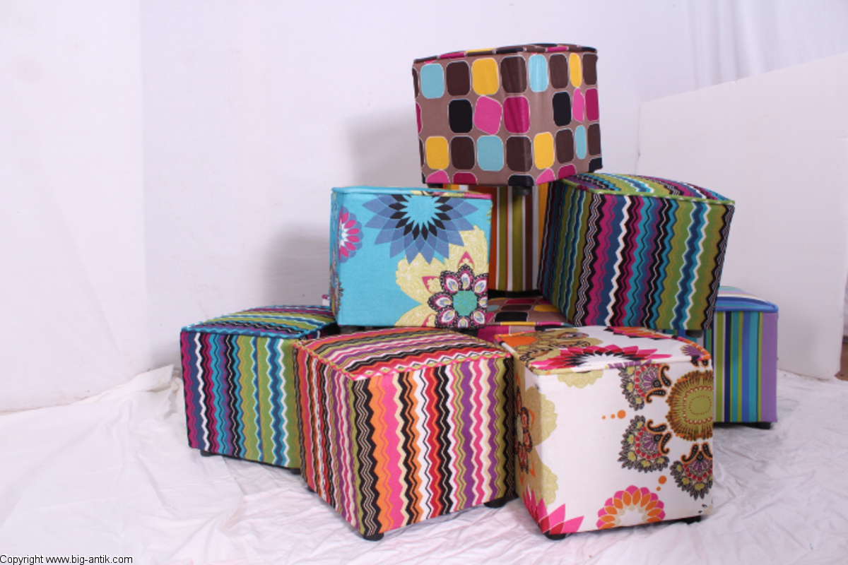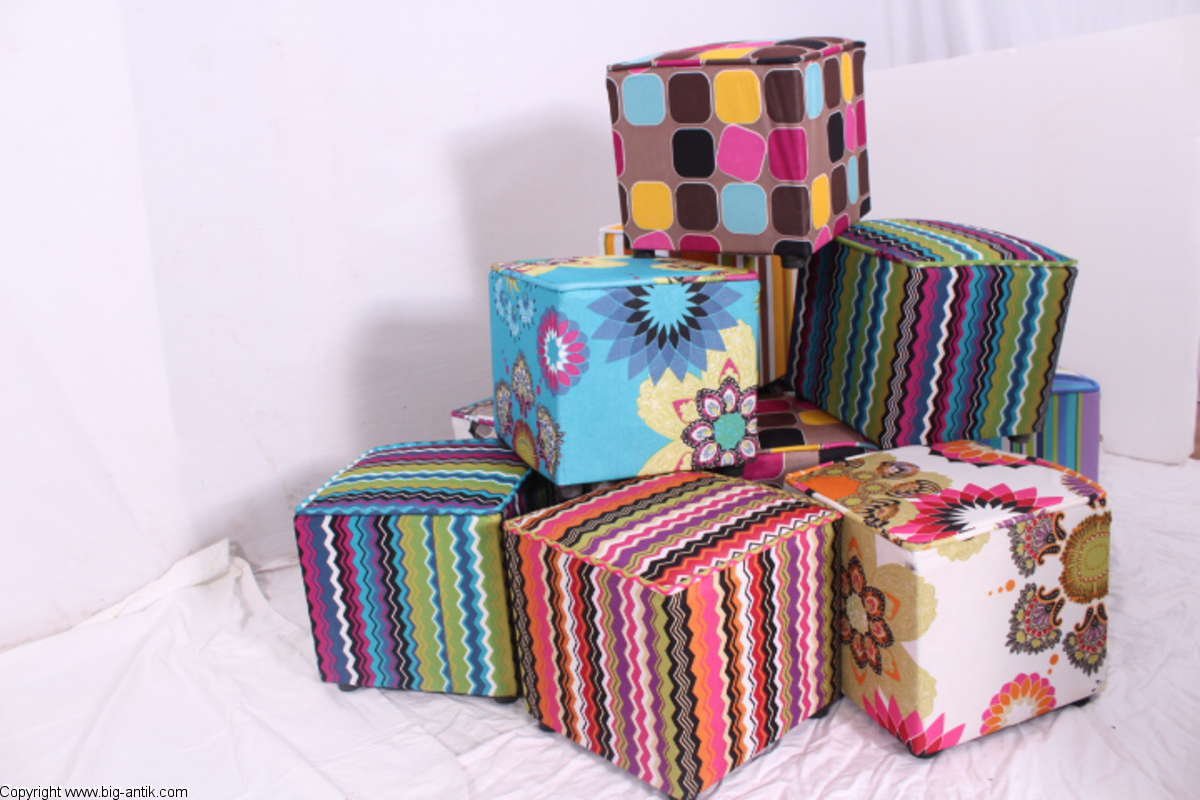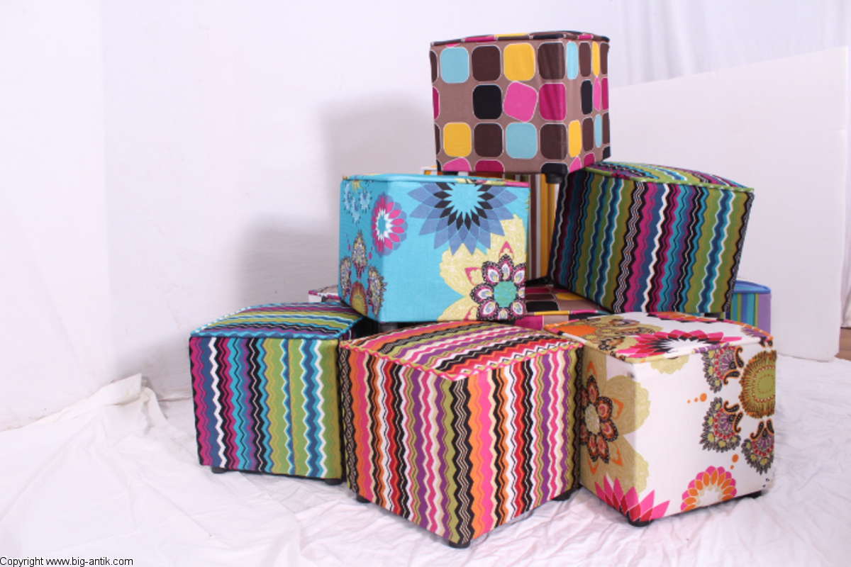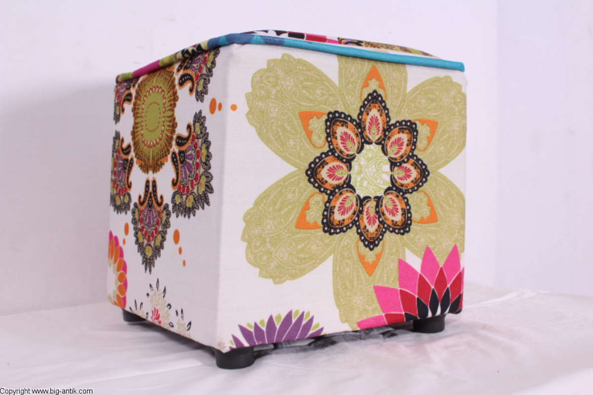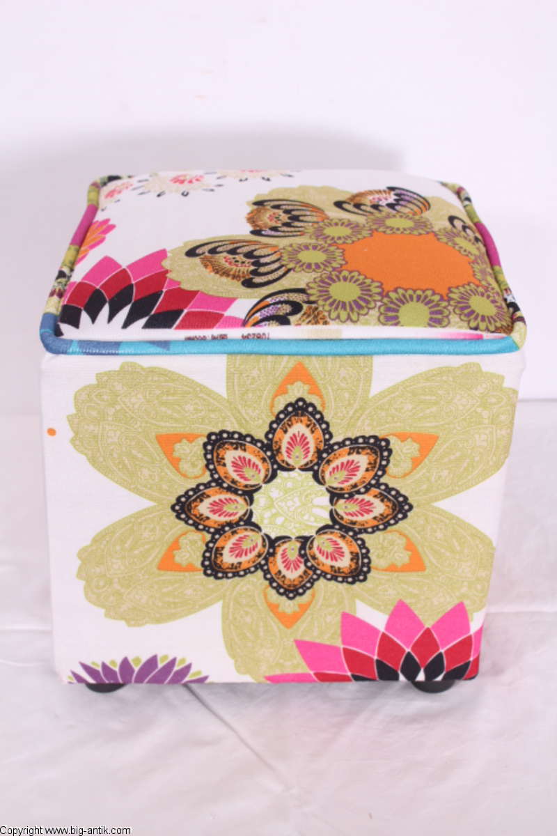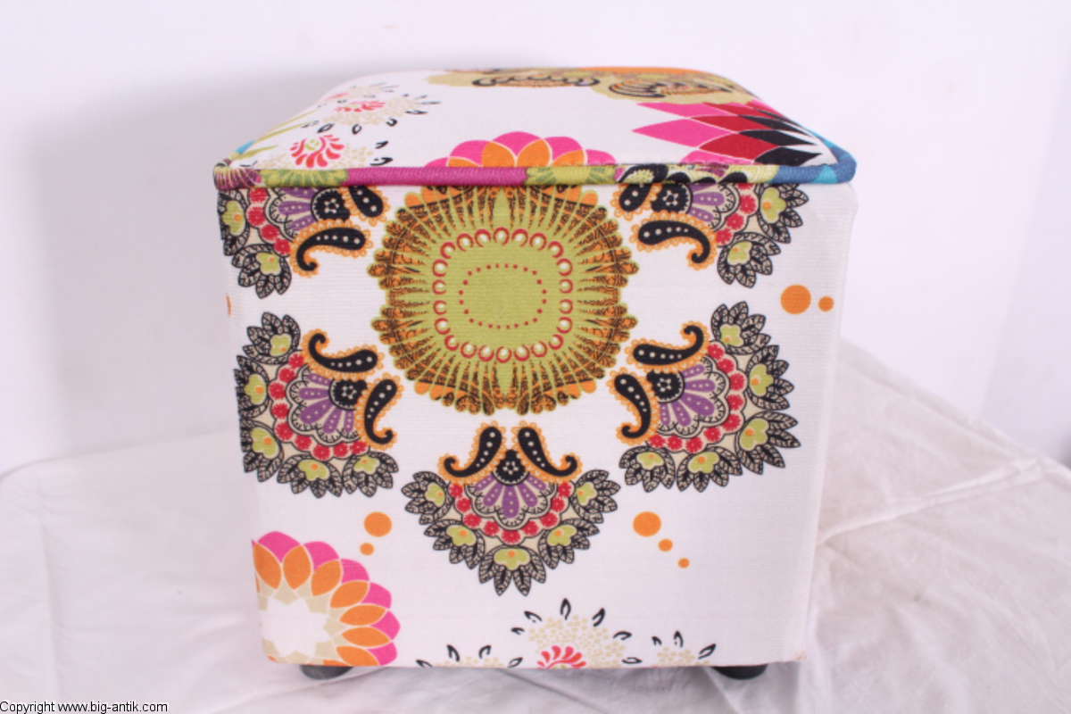 Angeboten wird ein wunderschöner kleiner Hocker / CUBE / Würfelhocker / Sitzhocker im schönen 70er Jahre Stil. Der farbenfrohe Würfelhocker ist mit einem bunt gemusterten Stoff bezogen und steht auf vier kleinen runden Kunststoffbeinen. Der kultige kleine Sitzhocker ist neu. Wir haben insgesamt 7 Hocker dieser Art und viele weitere mit unterschiedlichen Stoffmustern bzw. Farben in unserem Shop.