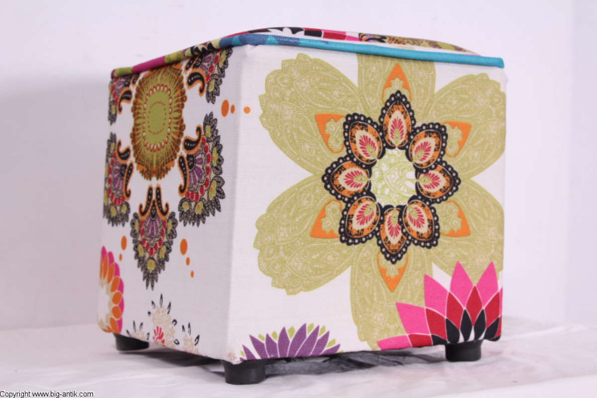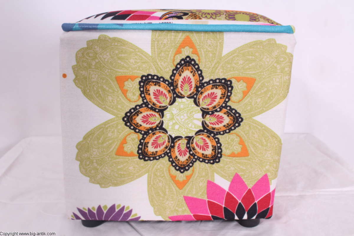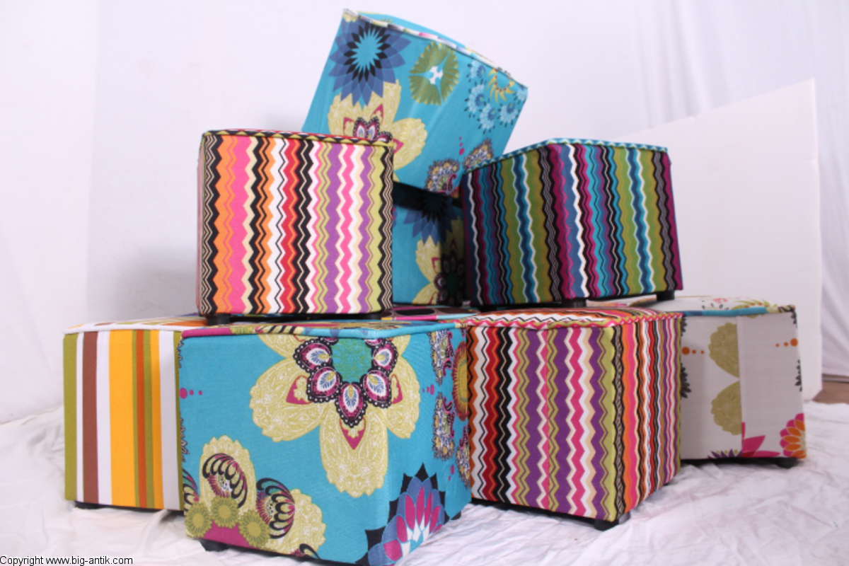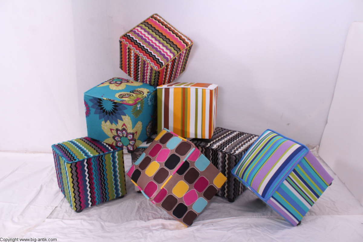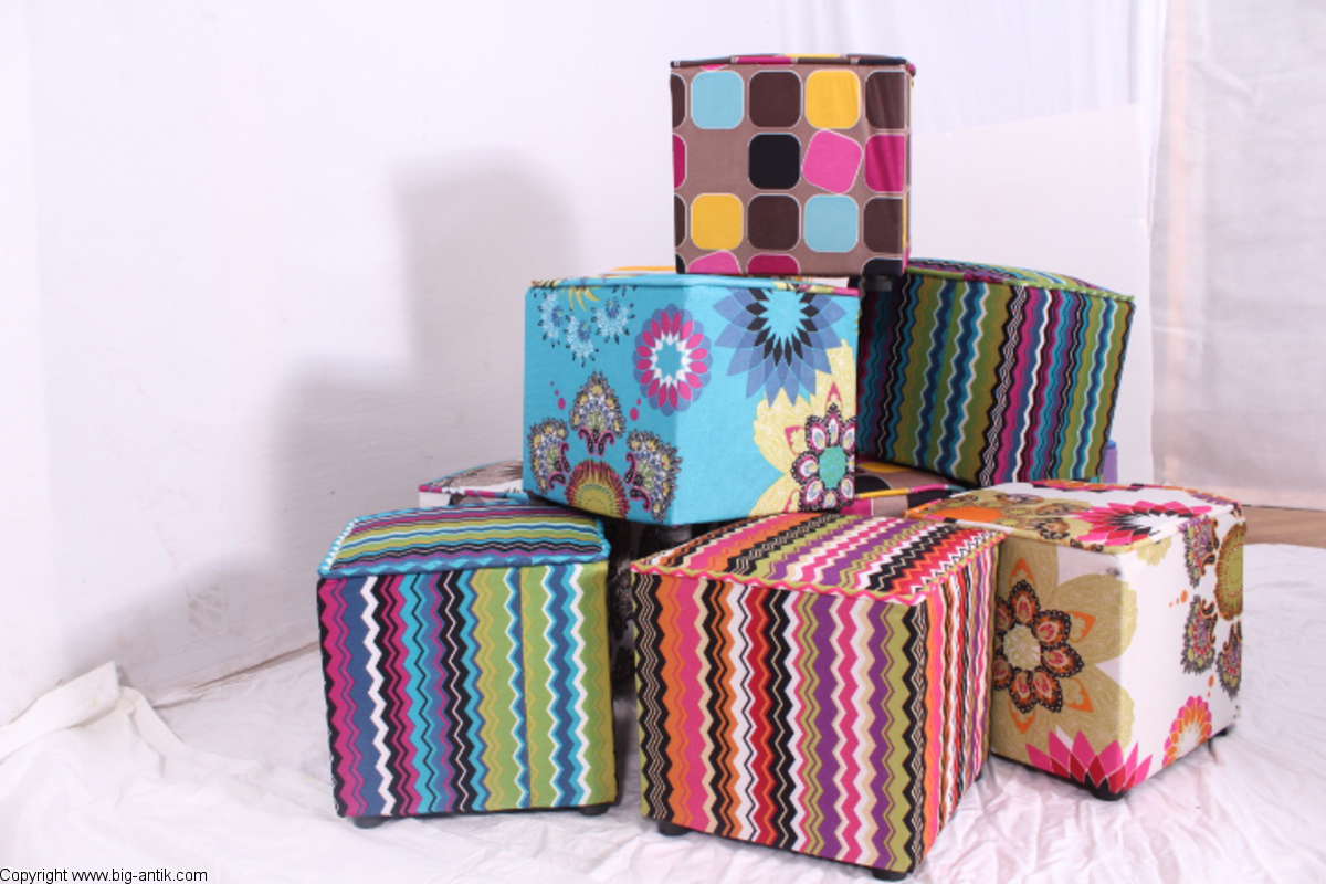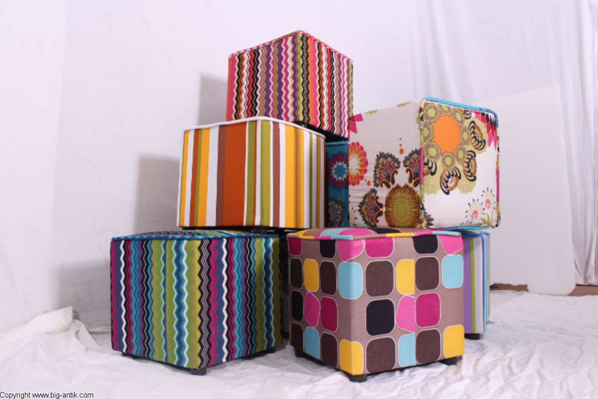 Angeboten wird ein wunderschöner kleiner Hocker / CUBE / Würfelhocker / Sitzhocker im schönen 70er Jahre Stil. Der farbenfrohe Würfelhocker ist mit einem bunt gemusterten Stoff bezogen und steht auf vier kleinen runden Kunststoffbeinen. Der kultige kleine Sitzhocker ist neu. Wir haben insgesamt 7 Hocker dieser Art und viele weitere mit unterschiedlichen Stoffmustern bzw. Farben in unserem Shop.
