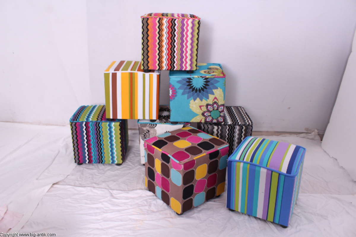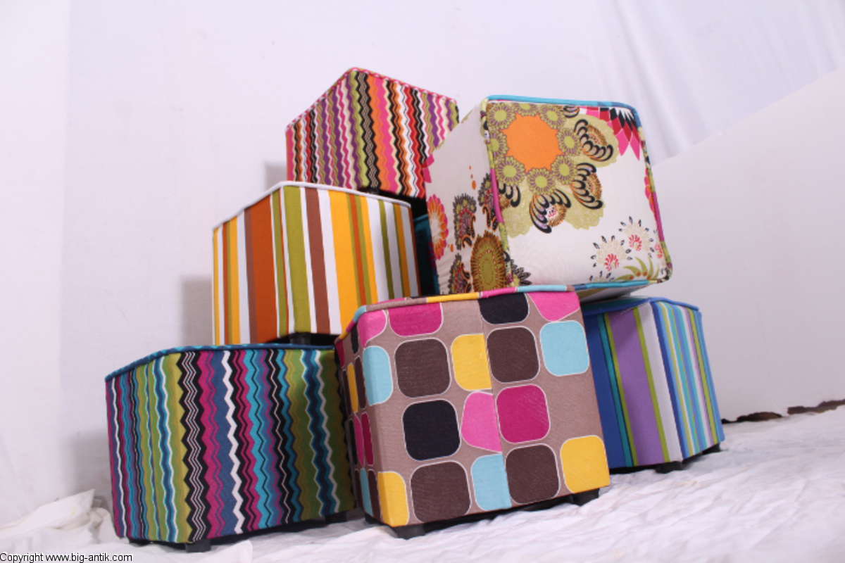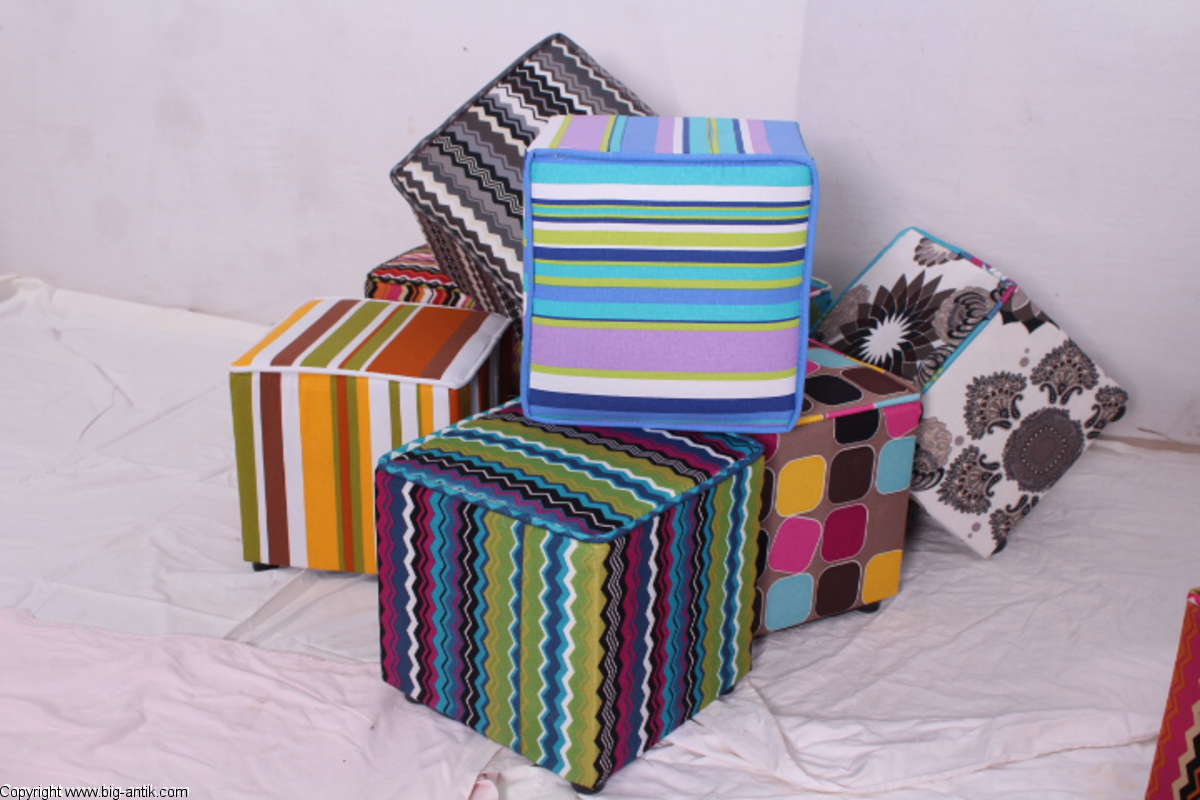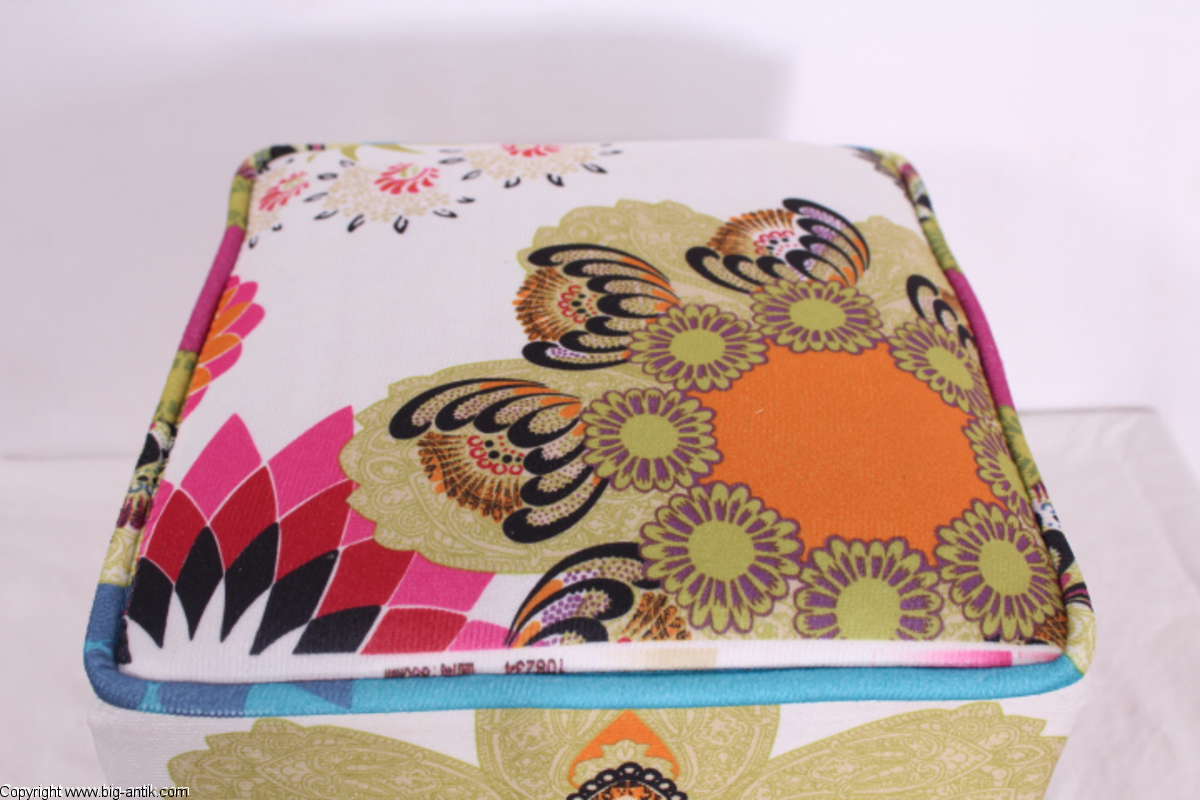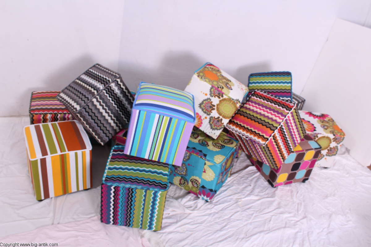 Angeboten wird ein wunderschöner kleiner Hocker / CUBE / Würfelhocker / Sitzhocker im schönen 70er Jahre Stil. Der farbenfrohe Würfelhocker ist mit einem bunt gemusterten Stoff bezogen und steht auf vier kleinen runden Kunststoffbeinen. Der kultige kleine Sitzhocker ist neu. Wir haben insgesamt 7 Hocker dieser Art und viele weitere mit unterschiedlichen Stoffmustern bzw. Farben in unserem Shop.
