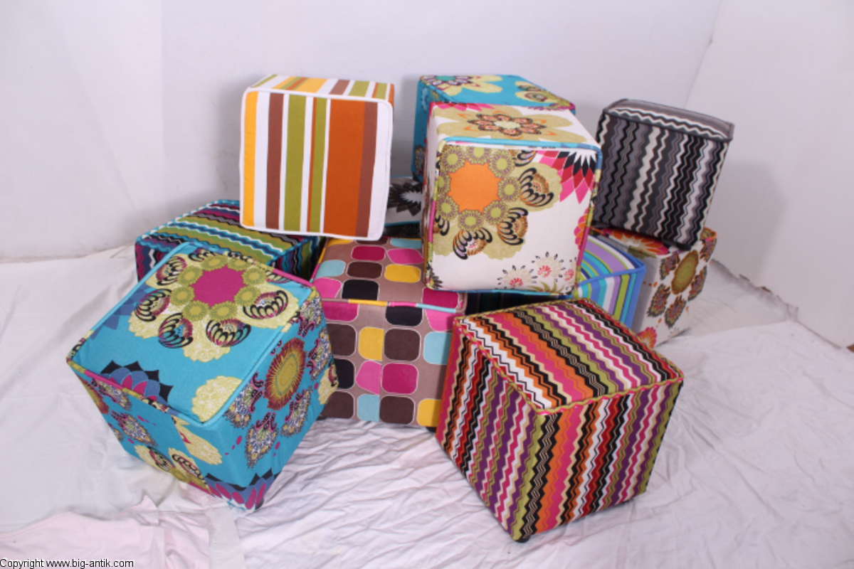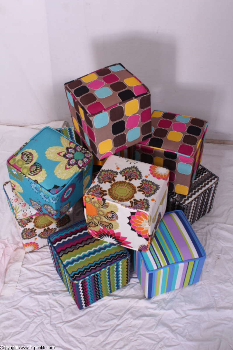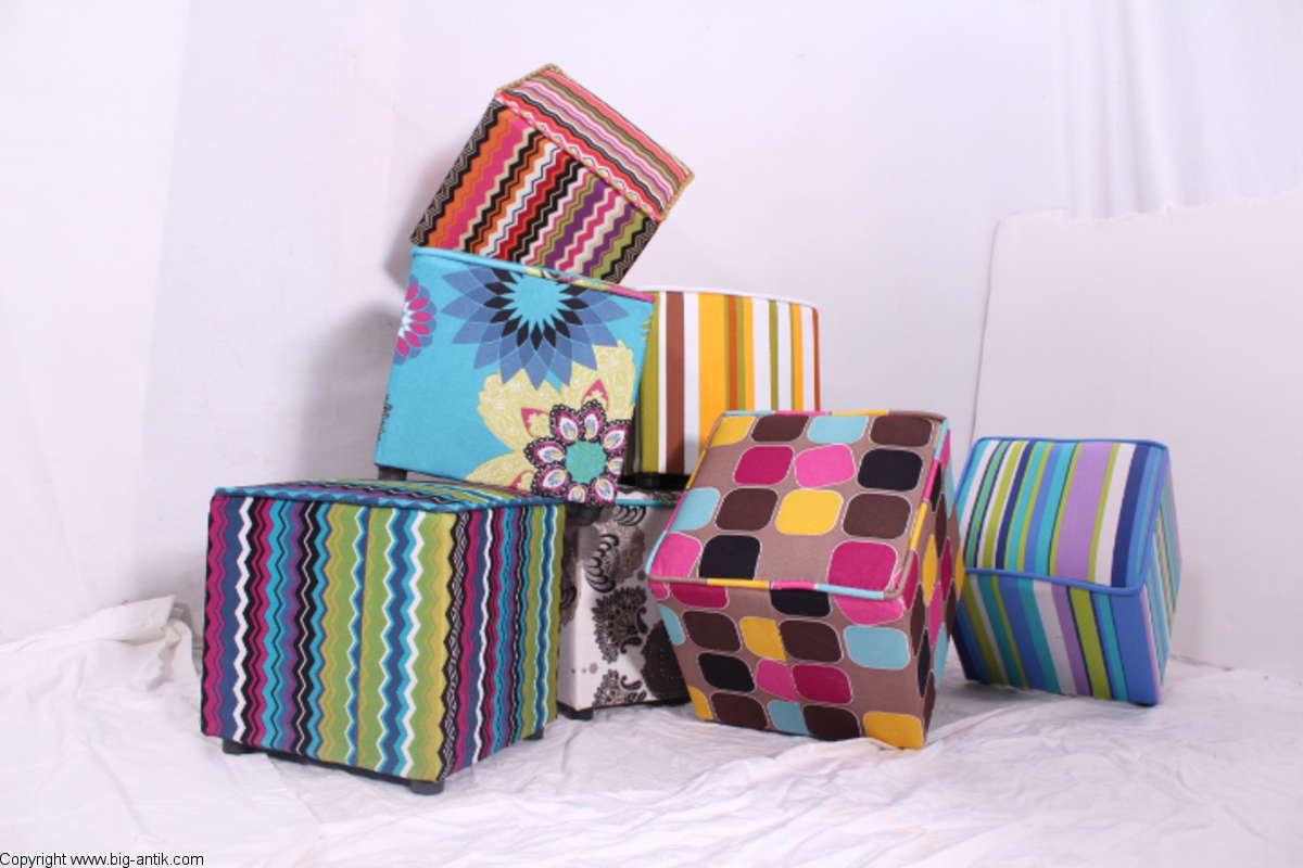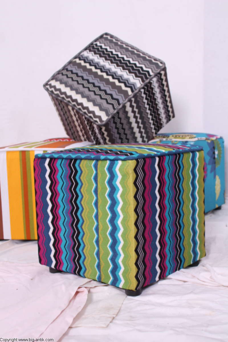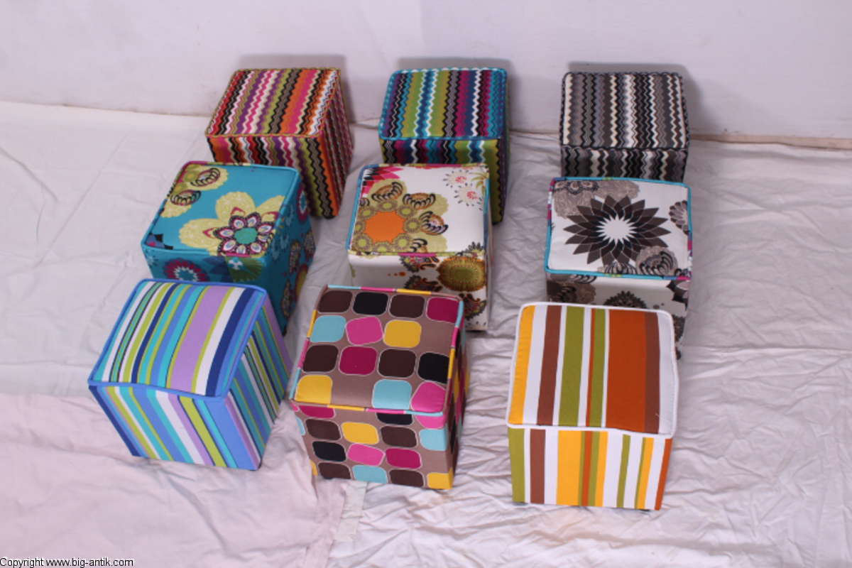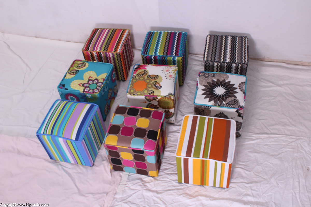 Angeboten wird ein wunderschöner kleiner Hocker / CUBE / Würfelhocker / Sitzhocker im schönen 70er Jahre Stil. Der farbenfrohe Würfelhocker ist mit einem bunt gemusterten Stoff bezogen und steht auf vier kleinen runden Kunststoffbeinen. Der kultige kleine Sitzhocker ist neu. Wir haben insgesamt 7 Hocker dieser Art und viele weitere mit unterschiedlichen Stoffmustern bzw. Farben in unserem Shop.