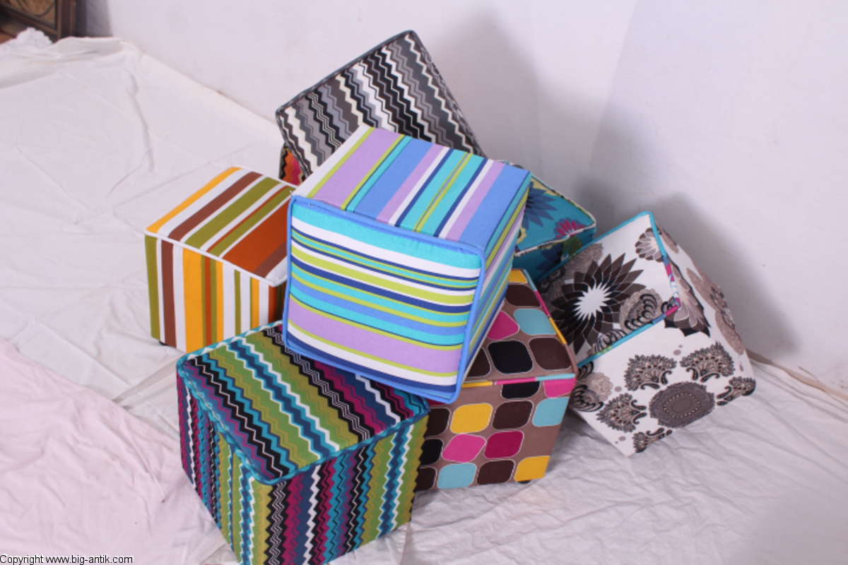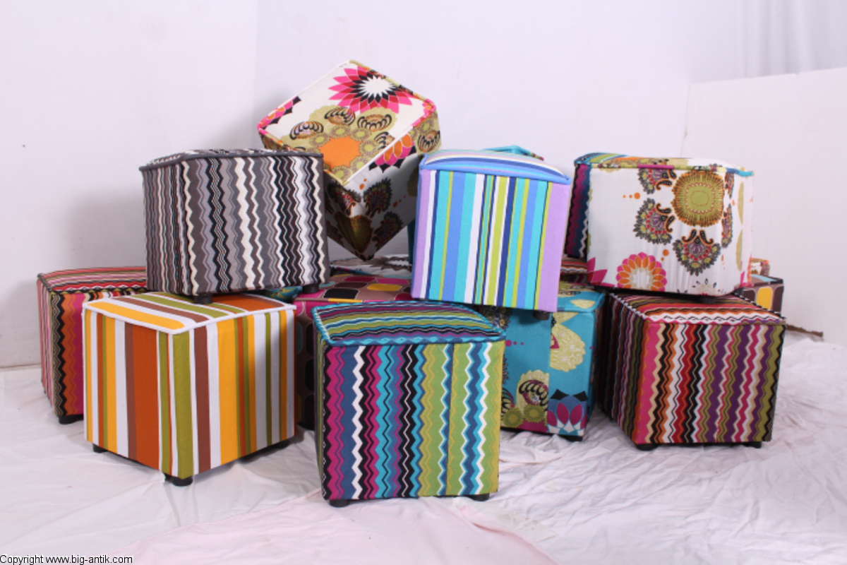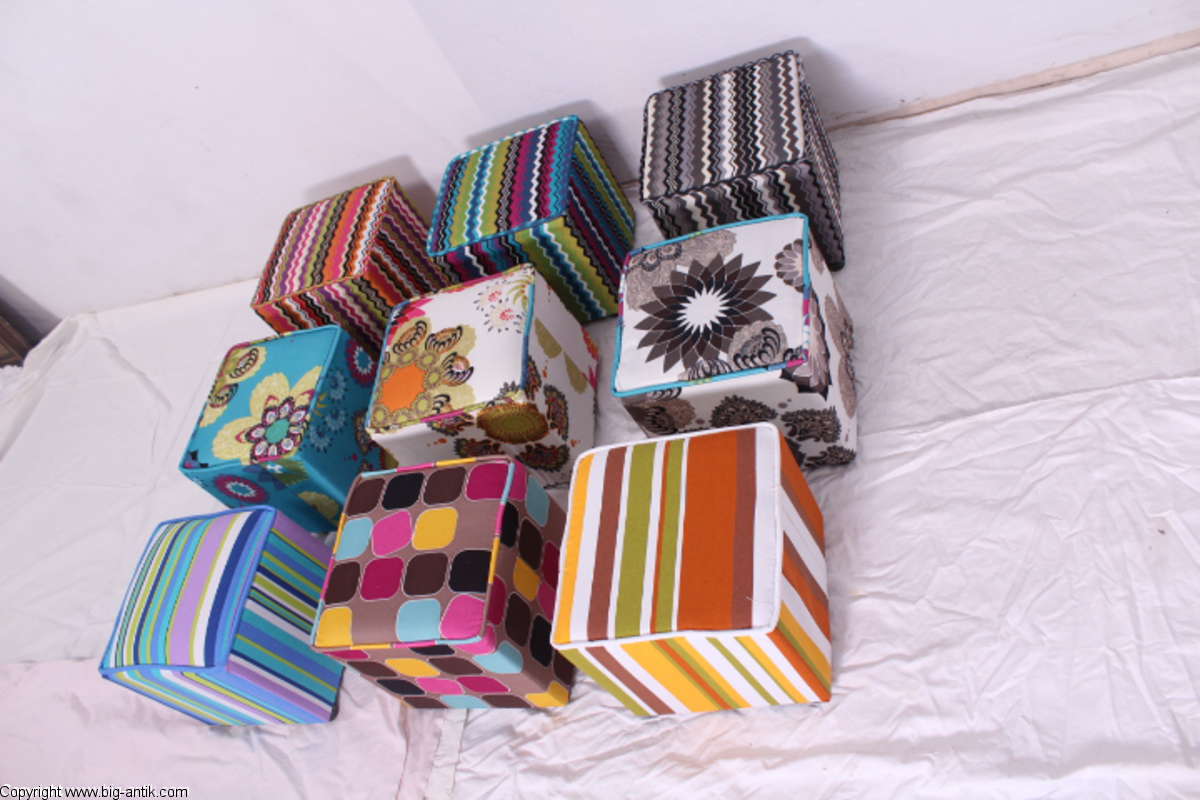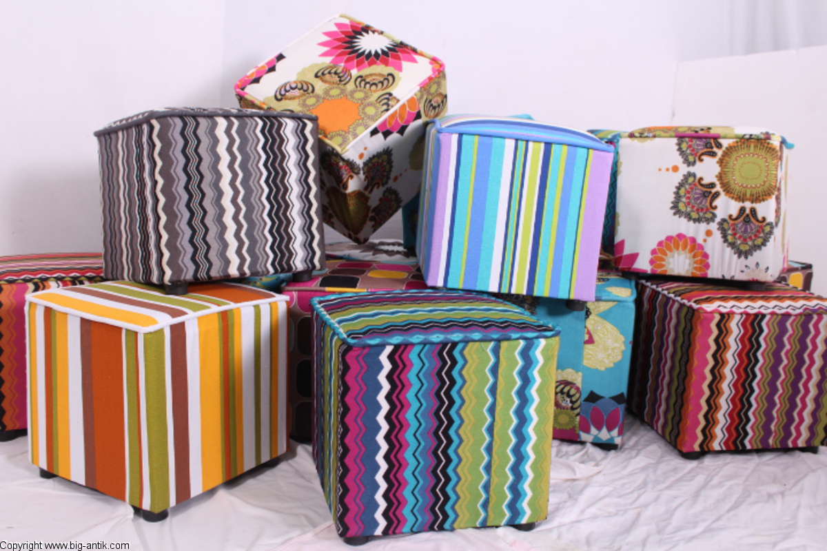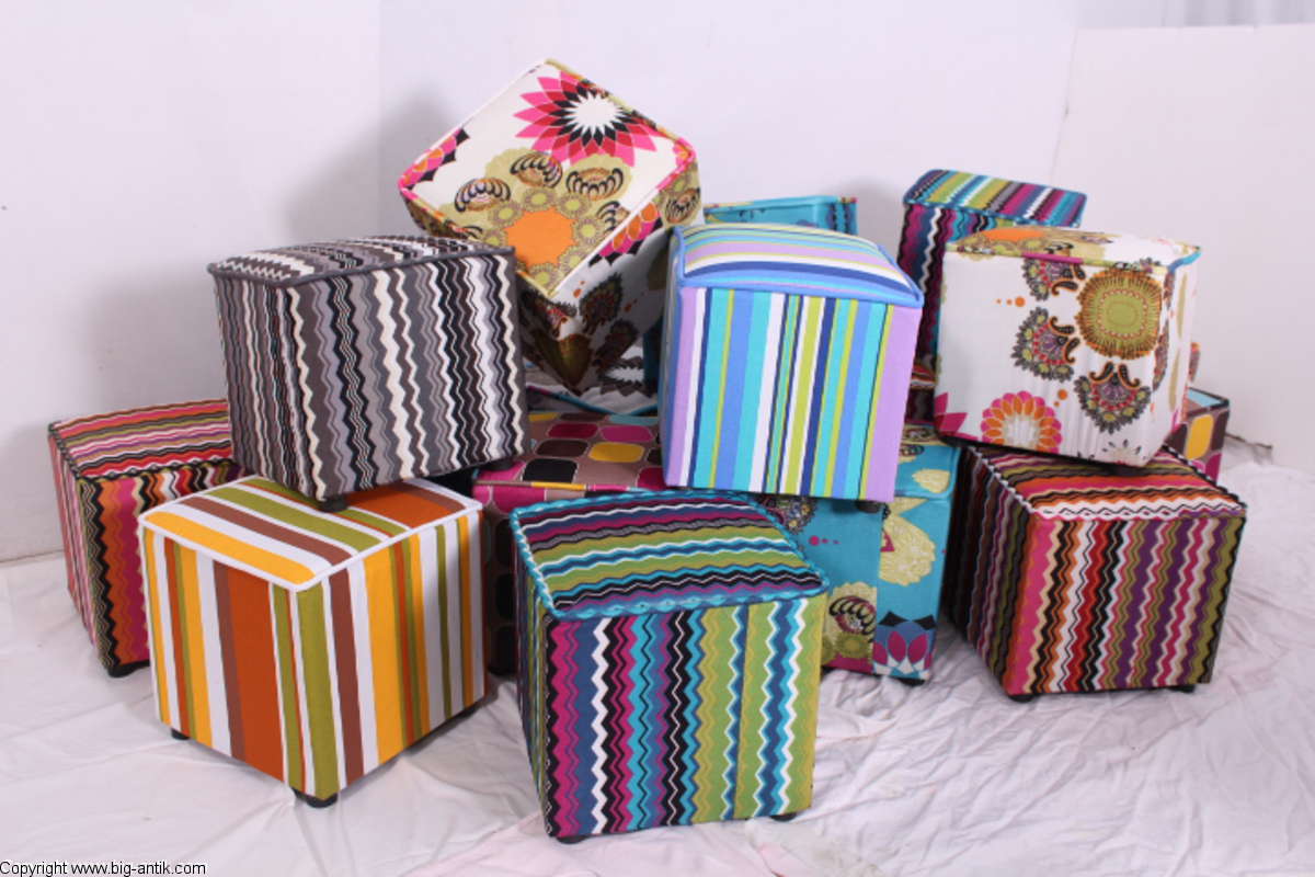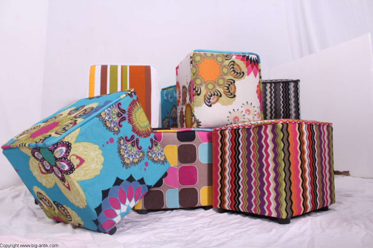 Angeboten wird ein wunderschöner kleiner Hocker / CUBE / Würfelhocker / Sitzhocker im schönen 70er Jahre Stil. Der farbenfrohe Würfelhocker ist mit einem bunt gemusterten Stoff bezogen und steht auf vier kleinen runden Kunststoffbeinen. Der kultige kleine Sitzhocker ist neu. Wir haben insgesamt 7 Hocker dieser Art und viele weitere mit unterschiedlichen Stoffmustern bzw. Farben in unserem Shop.