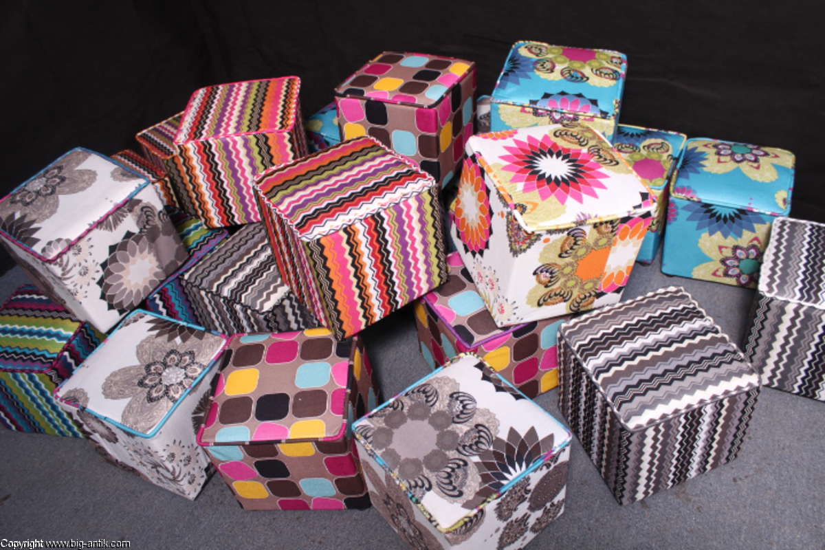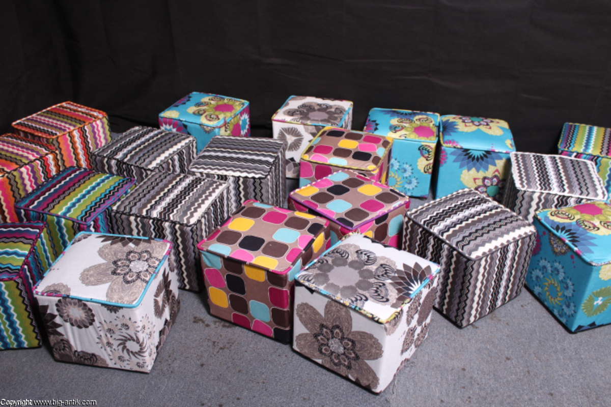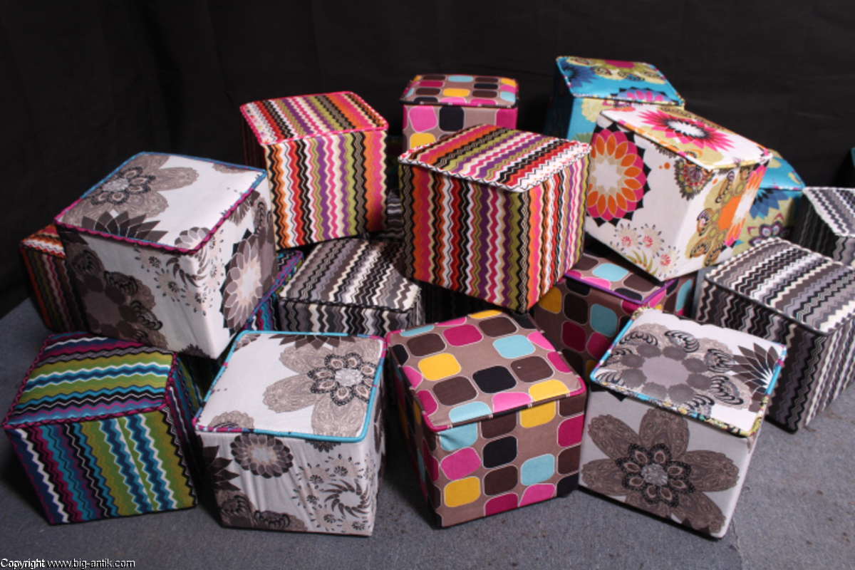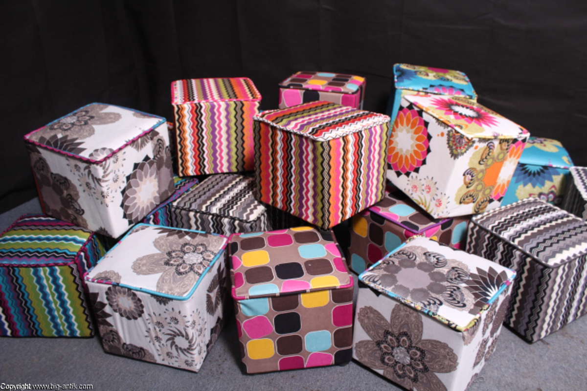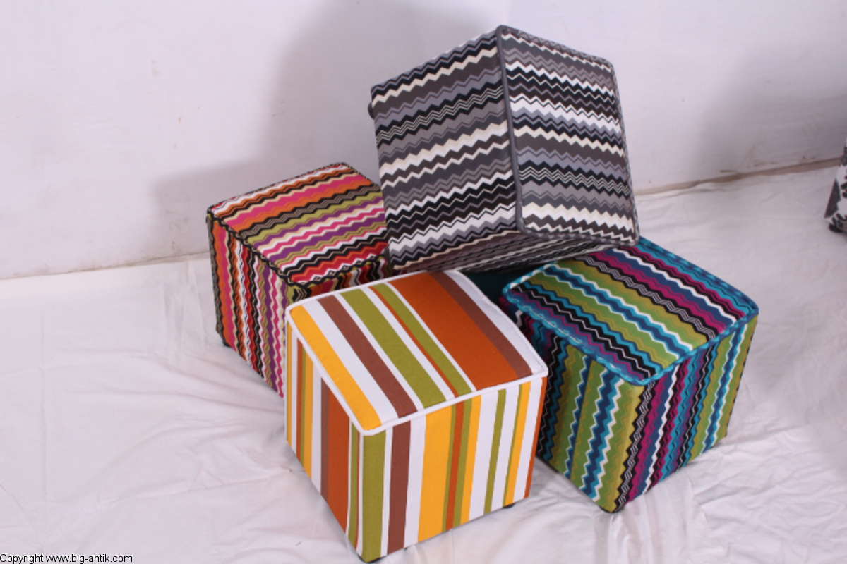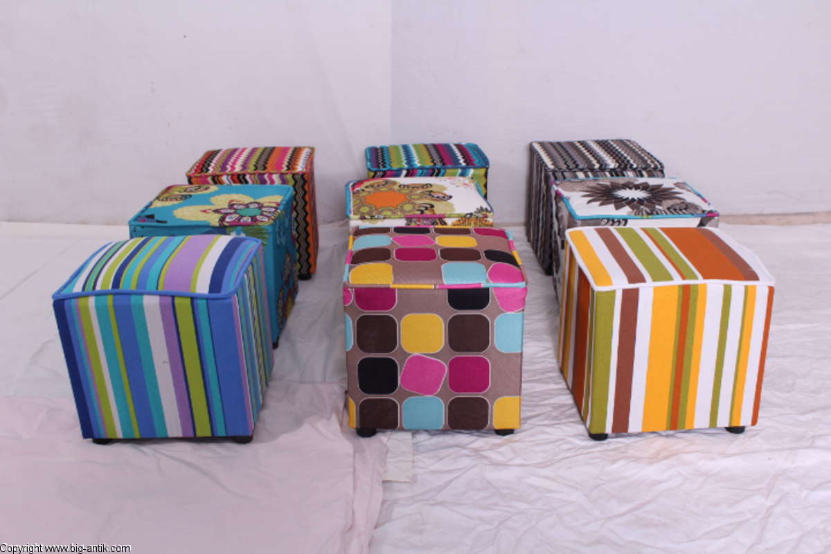 Angeboten wird ein wunderschöner kleiner Hocker / CUBE / Würfelhocker / Sitzhocker im schönen 70er Jahre Stil. Der farbenfrohe Würfelhocker ist mit einem bunt gemusterten Stoff bezogen und steht auf vier kleinen runden Kunststoffbeinen. Der kultige kleine Sitzhocker ist neu. Wir haben insgesamt 7 Hocker dieser Art und viele weitere mit unterschiedlichen Stoffmustern bzw. Farben in unserem Shop.