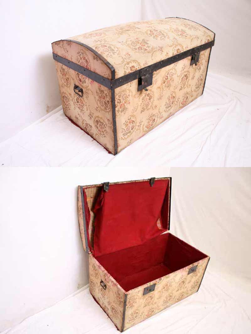 Tolle antike Runddeckeltruhe / Stoffbezug / SELTEN