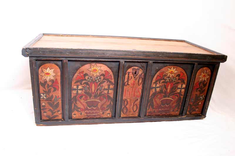 Museale Flachdeckel Truhe / 1686 / Bauernmalereien