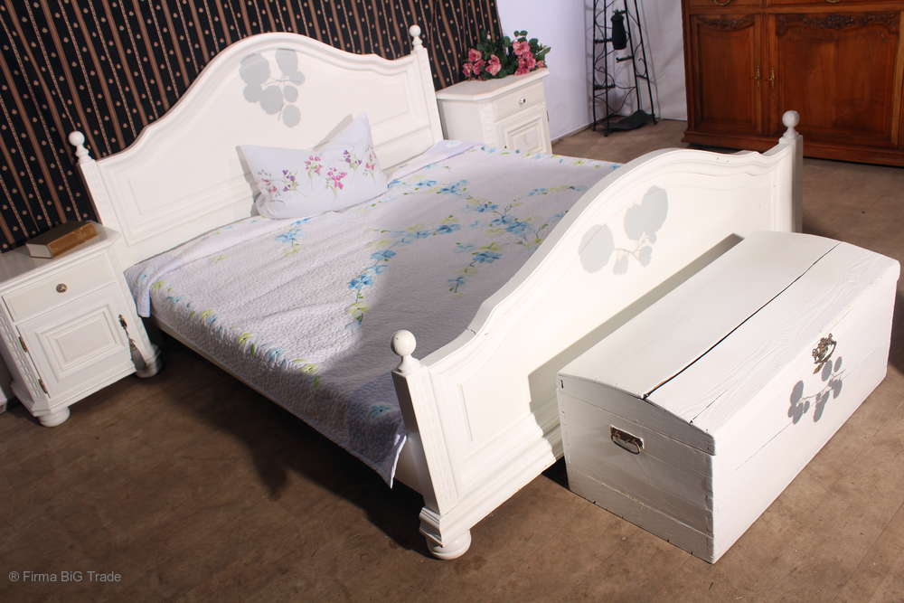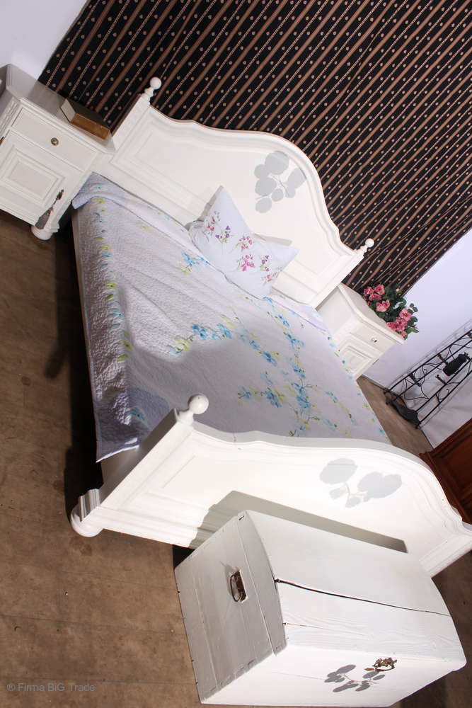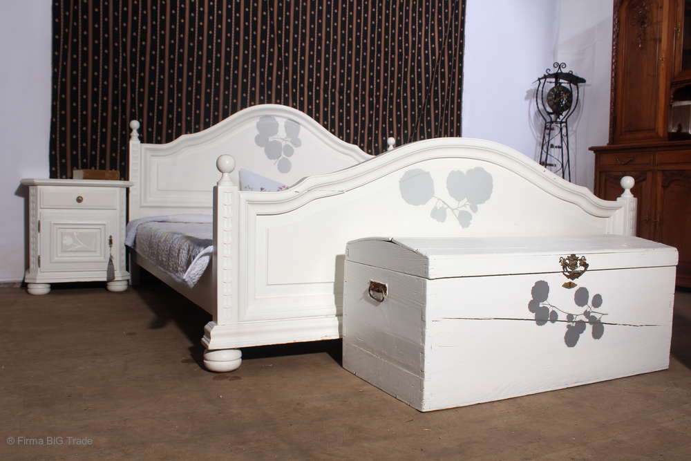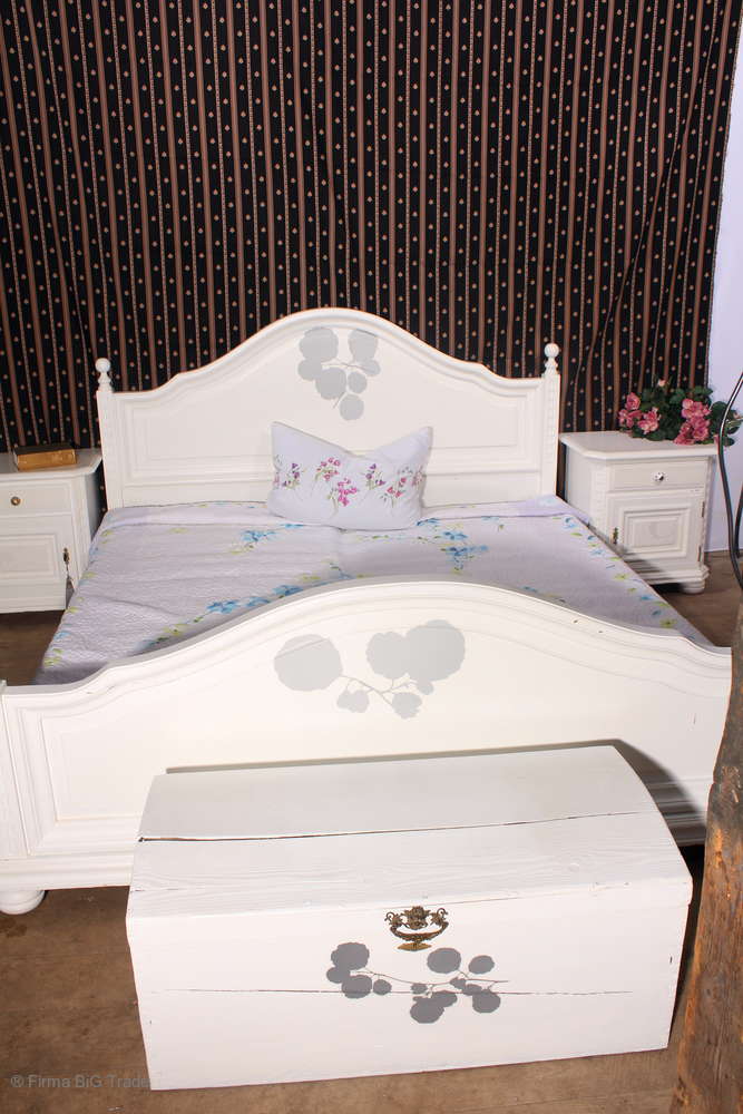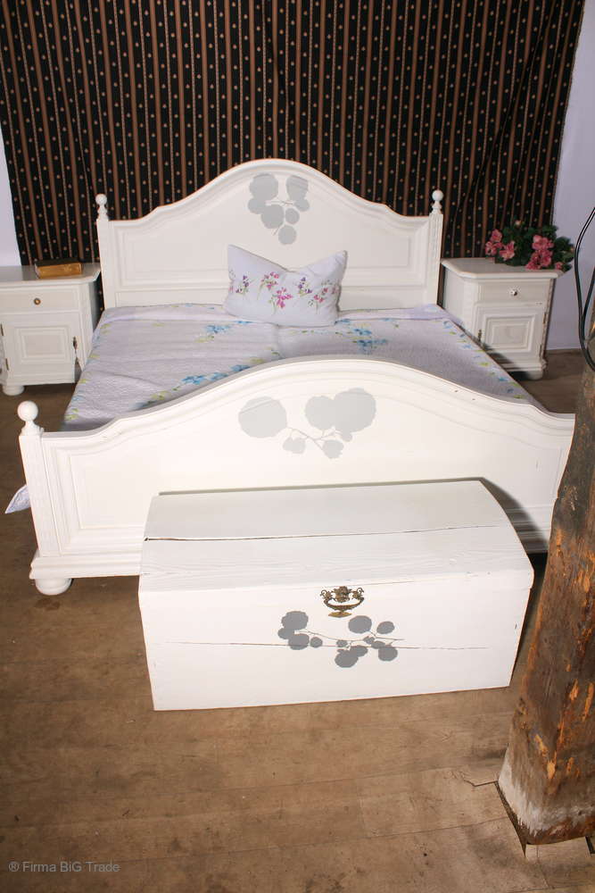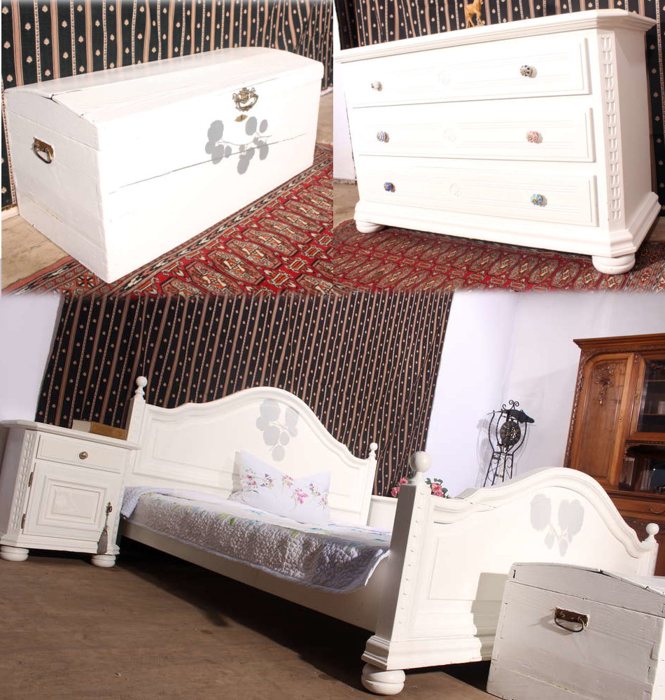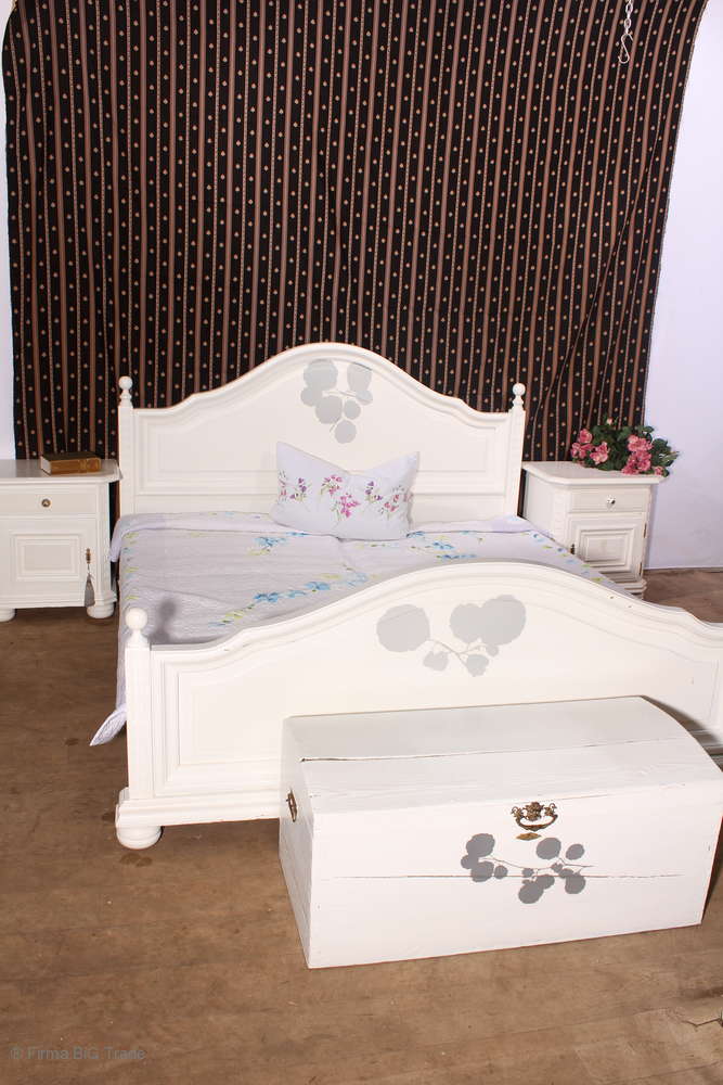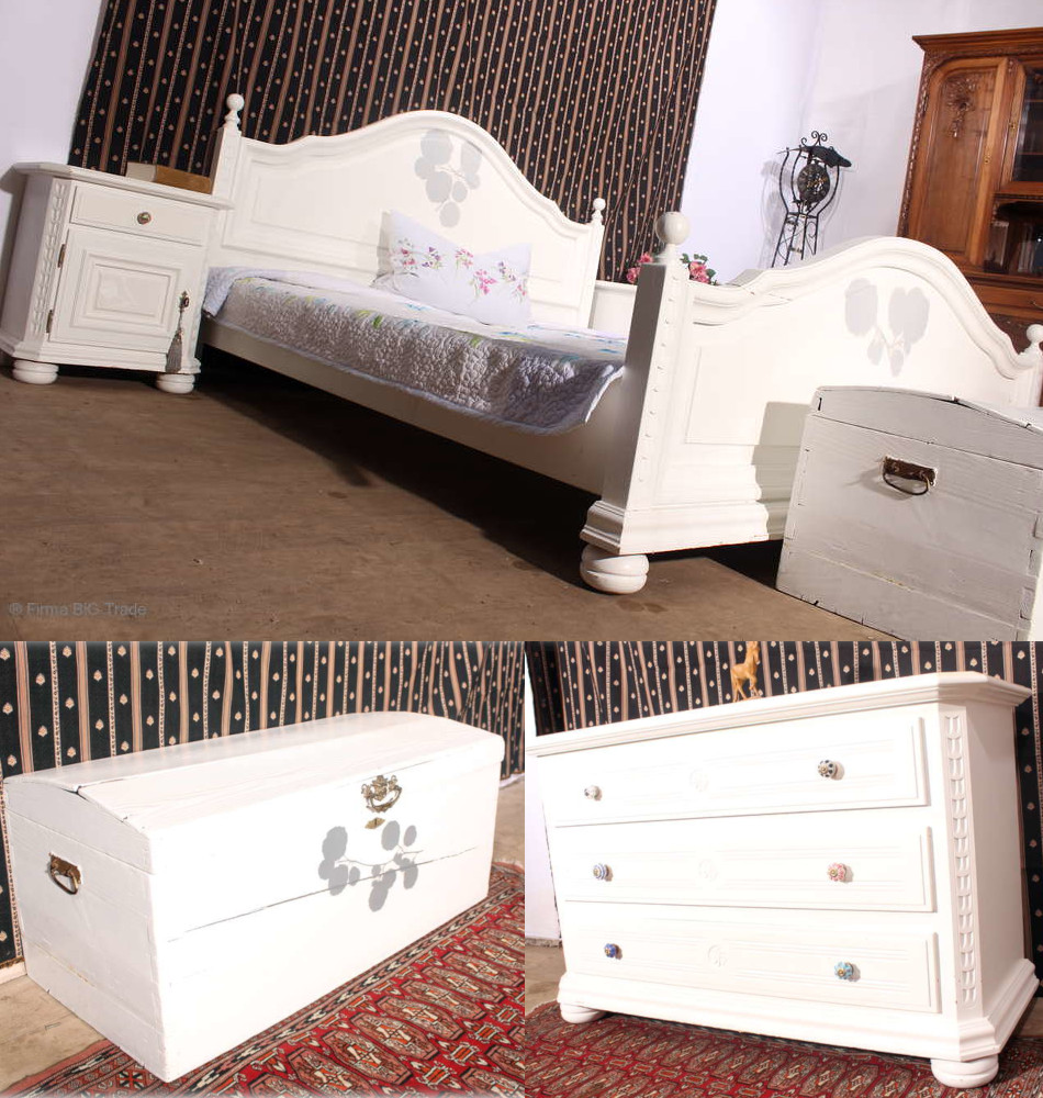 Angeboten wird ein zauberhaft schönes Landhaus Schlafzimmer bestehen aus einem prächtigen Doppelbett / Ehebett (King Size), 2 Lattenrosten, einer Wäschekommode mit 3 geräumigen Schubladen, 2 Nachtschränken und einer antiken Biedermeier Truhe aus massivem Holz. Das Herrschaftliche Doppelbett besitzt Kopf- und Fußteile, das an allen vier Ecken mit Kugelpfosten sowie Schnitzereien verziert ist. Die Kommode besitzt 3 leichtläufige Schubladen und 2 praktische Nachtschränke mit jeweils eine Schublade und einem abschließbaren Schrankfach. Alle Möbel bis auf die Biedermeier Truhe sind gleich dezent geschnitzt und elegant gestaltet und vom Vorbesitzer in Weiß Shabby Chic gestrichen. Die Möbel weisen Alters- und Gebrauchsspuren u.a. Risse am Fußteil des Bettes und der Truhe, Kratzer, Flecken und Abriebstellen (alles siehe Bilder), die schönen ausgefallenen Landhausmöbel befinden sich ansonsten in einem guten gebrauchten Zustand.