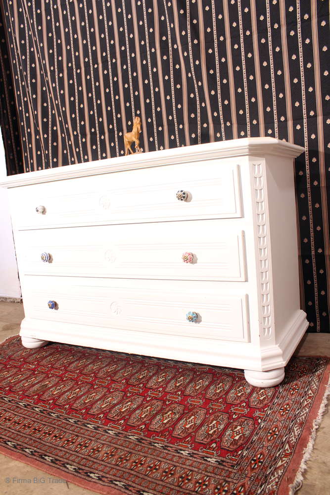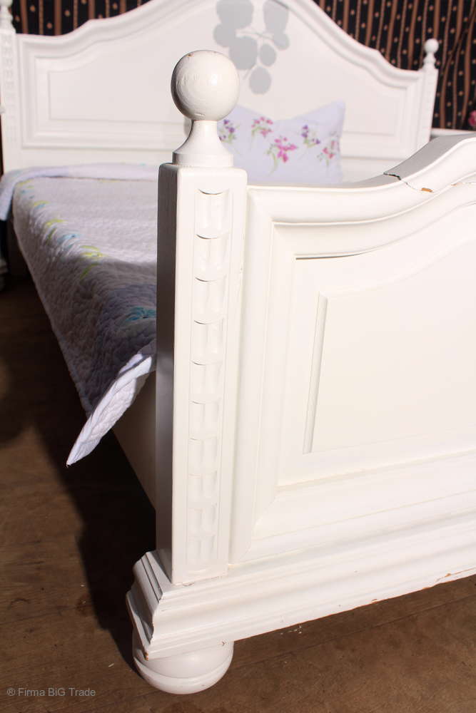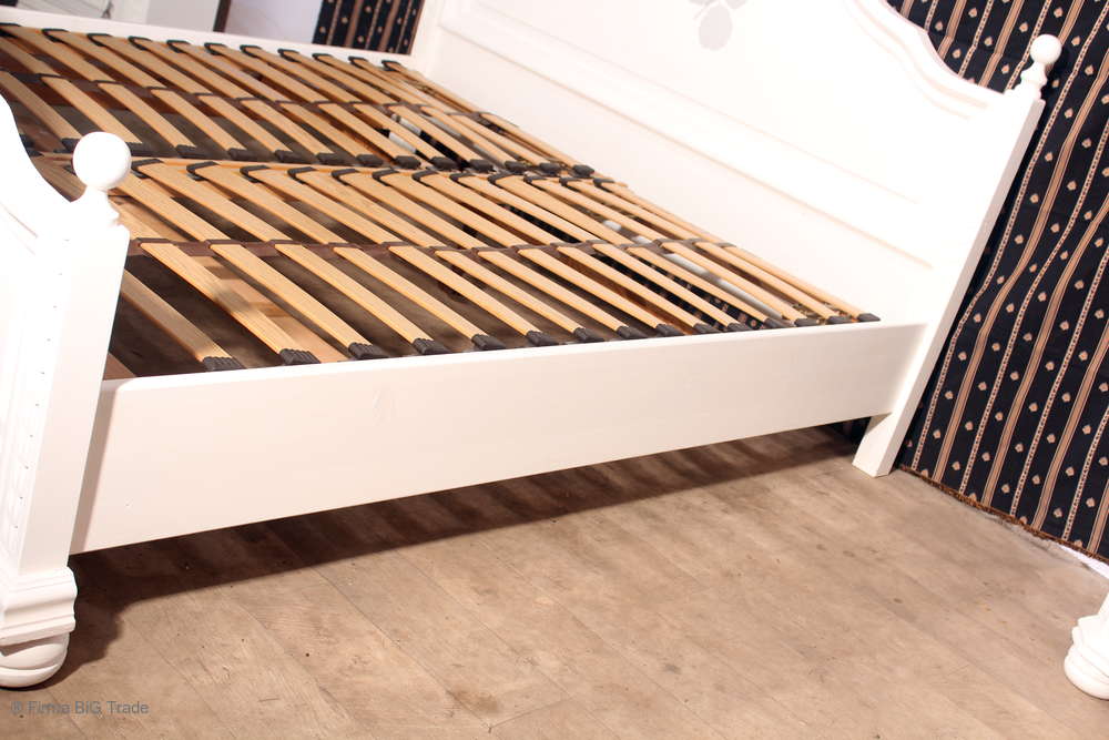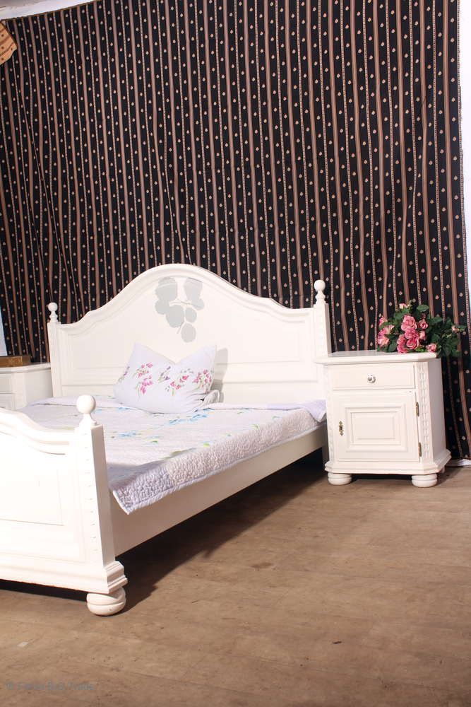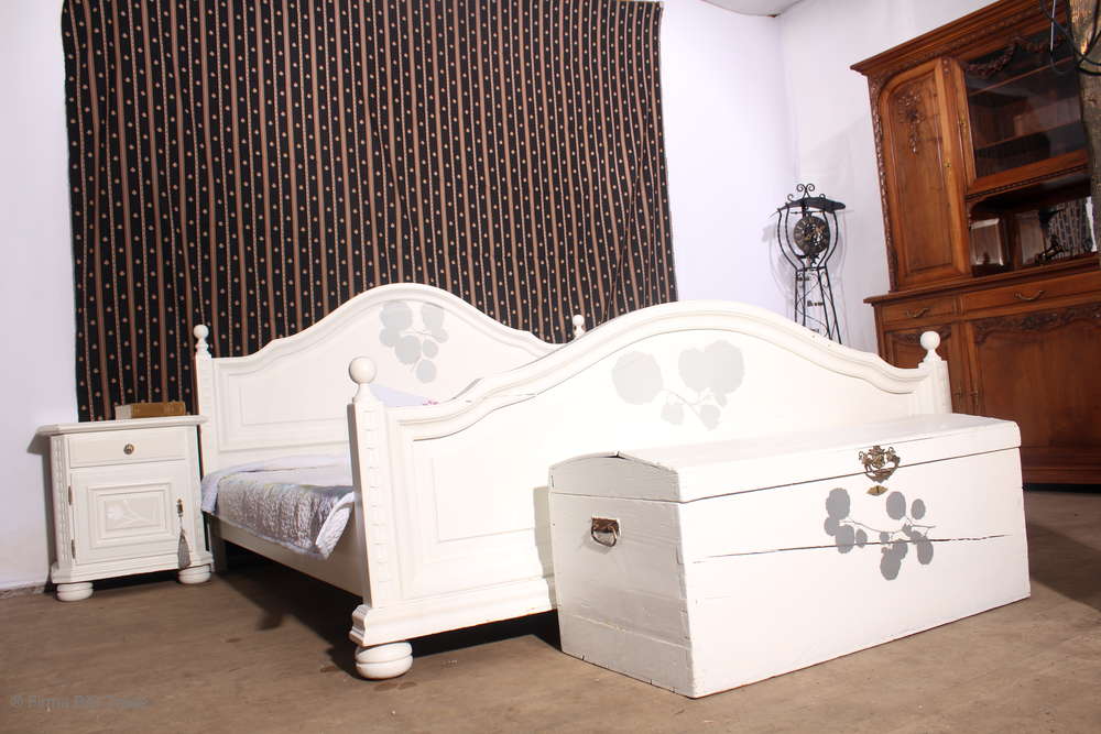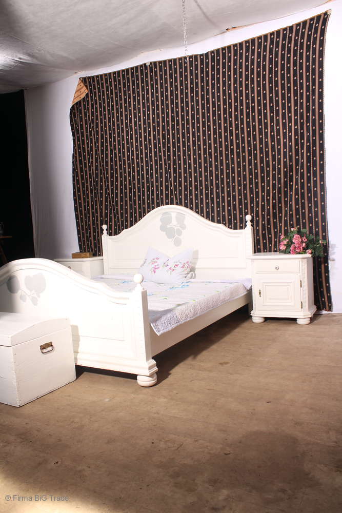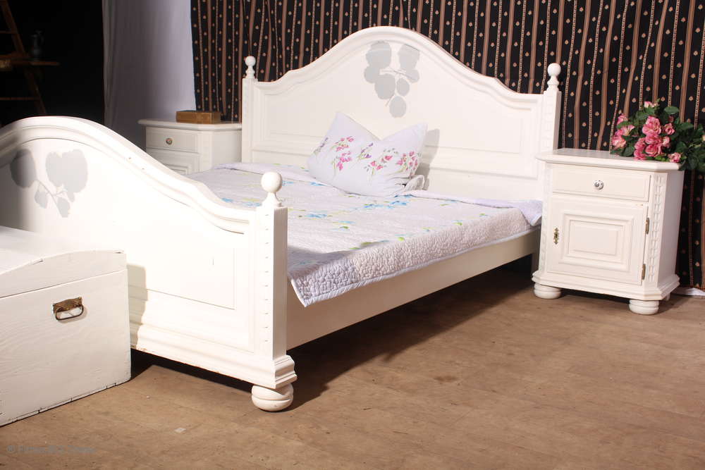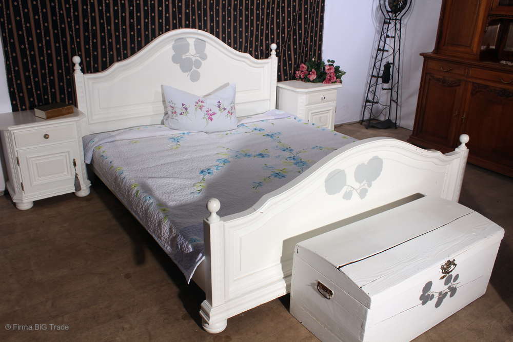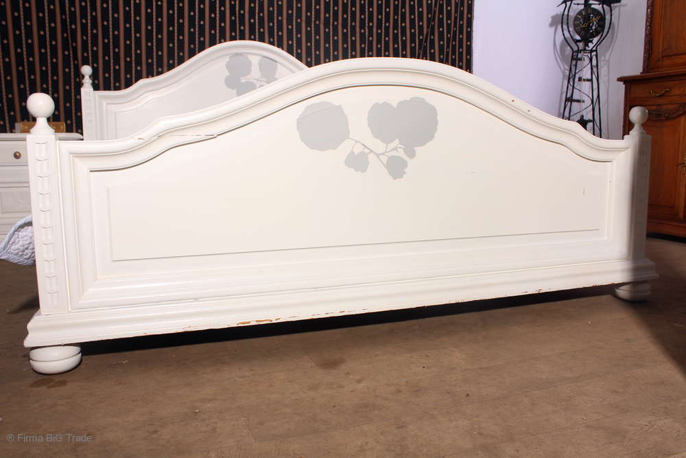 Angeboten wird ein zauberhaft schönes Landhaus Schlafzimmer bestehen aus einem prächtigen Doppelbett / Ehebett (King Size), 2 Lattenrosten, einer Wäschekommode mit 3 geräumigen Schubladen, 2 Nachtschränken und einer antiken Biedermeier Truhe aus massivem Holz. Das Herrschaftliche Doppelbett besitzt Kopf- und Fußteile, das an allen vier Ecken mit Kugelpfosten sowie Schnitzereien verziert ist. Die Kommode besitzt 3 leichtläufige Schubladen und 2 praktische Nachtschränke mit jeweils eine Schublade und einem abschließbaren Schrankfach. Alle Möbel bis auf die Biedermeier Truhe sind gleich dezent geschnitzt und elegant gestaltet und vom Vorbesitzer in Weiß Shabby Chic gestrichen. Die Möbel weisen Alters- und Gebrauchsspuren u.a. Risse am Fußteil des Bettes und der Truhe, Kratzer, Flecken und Abriebstellen (alles siehe Bilder), die schönen ausgefallenen Landhausmöbel befinden sich ansonsten in einem guten gebrauchten Zustand.