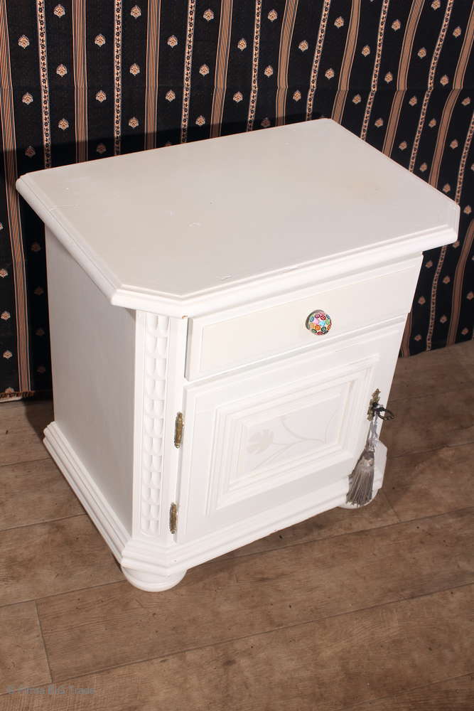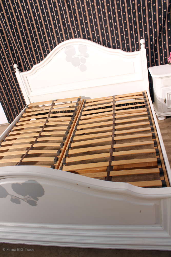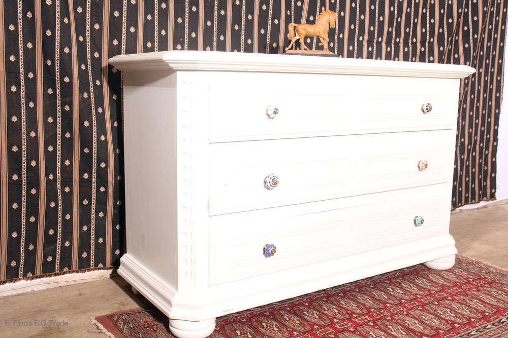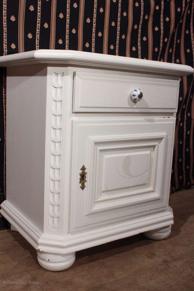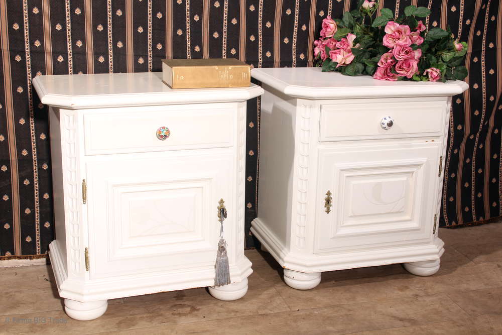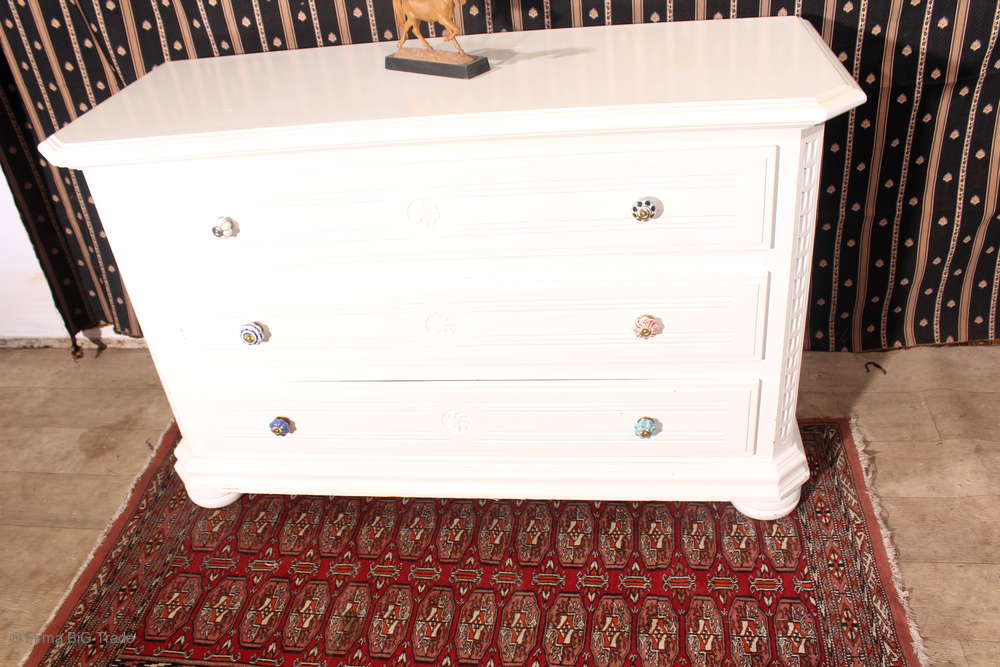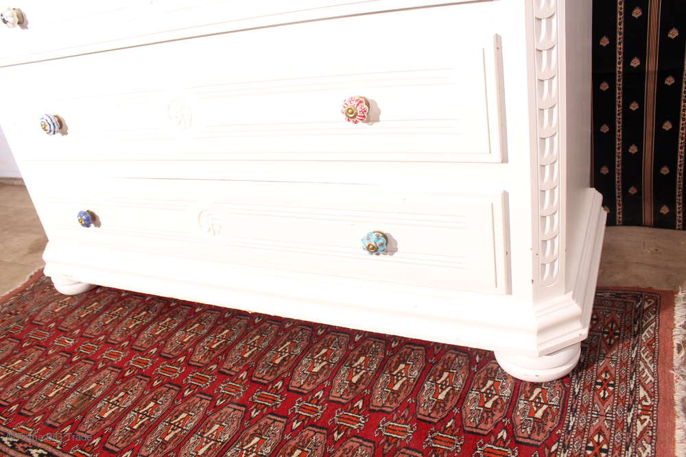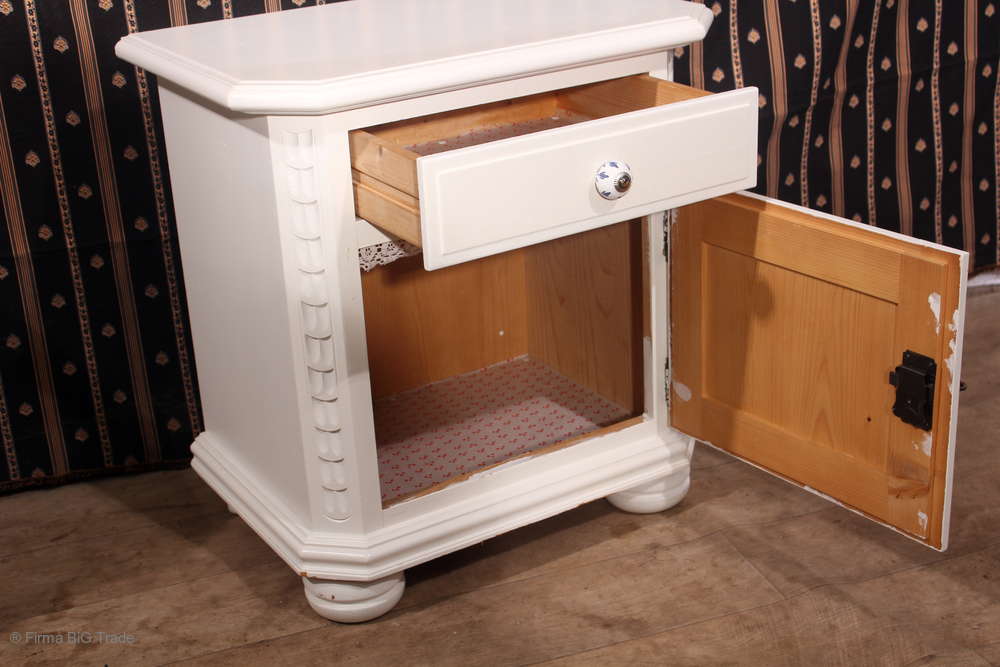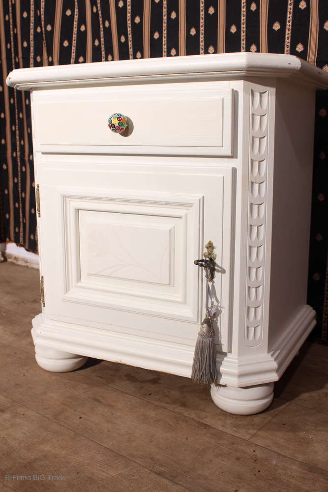 Angeboten wird ein zauberhaft schönes Landhaus Schlafzimmer bestehen aus einem prächtigen Doppelbett / Ehebett (King Size), 2 Lattenrosten, einer Wäschekommode mit 3 geräumigen Schubladen, 2 Nachtschränken und einer antiken Biedermeier Truhe aus massivem Holz. Das Herrschaftliche Doppelbett besitzt Kopf- und Fußteile, das an allen vier Ecken mit Kugelpfosten sowie Schnitzereien verziert ist. Die Kommode besitzt 3 leichtläufige Schubladen und 2 praktische Nachtschränke mit jeweils eine Schublade und einem abschließbaren Schrankfach. Alle Möbel bis auf die Biedermeier Truhe sind gleich dezent geschnitzt und elegant gestaltet und vom Vorbesitzer in Weiß Shabby Chic gestrichen. Die Möbel weisen Alters- und Gebrauchsspuren u.a. Risse am Fußteil des Bettes und der Truhe, Kratzer, Flecken und Abriebstellen (alles siehe Bilder), die schönen ausgefallenen Landhausmöbel befinden sich ansonsten in einem guten gebrauchten Zustand.