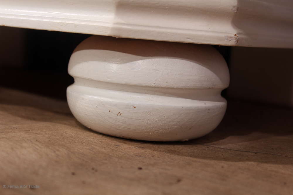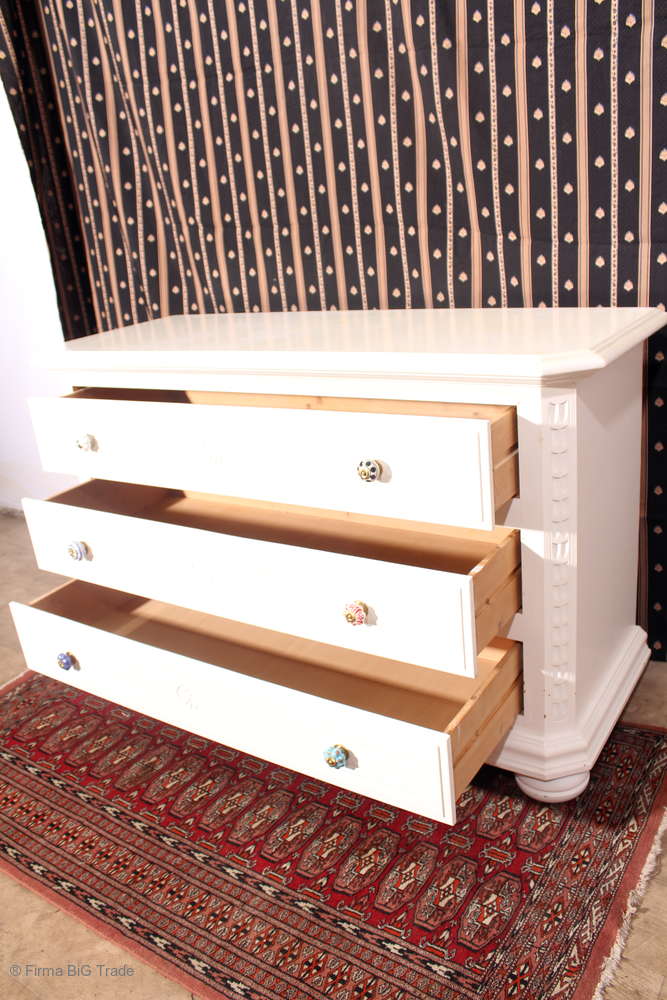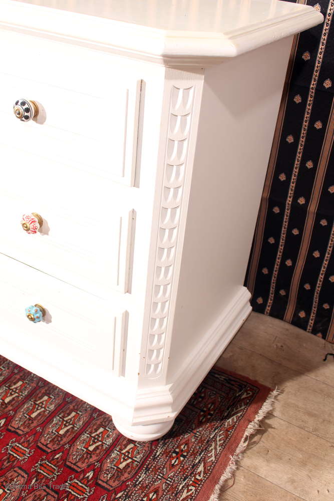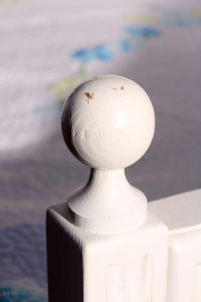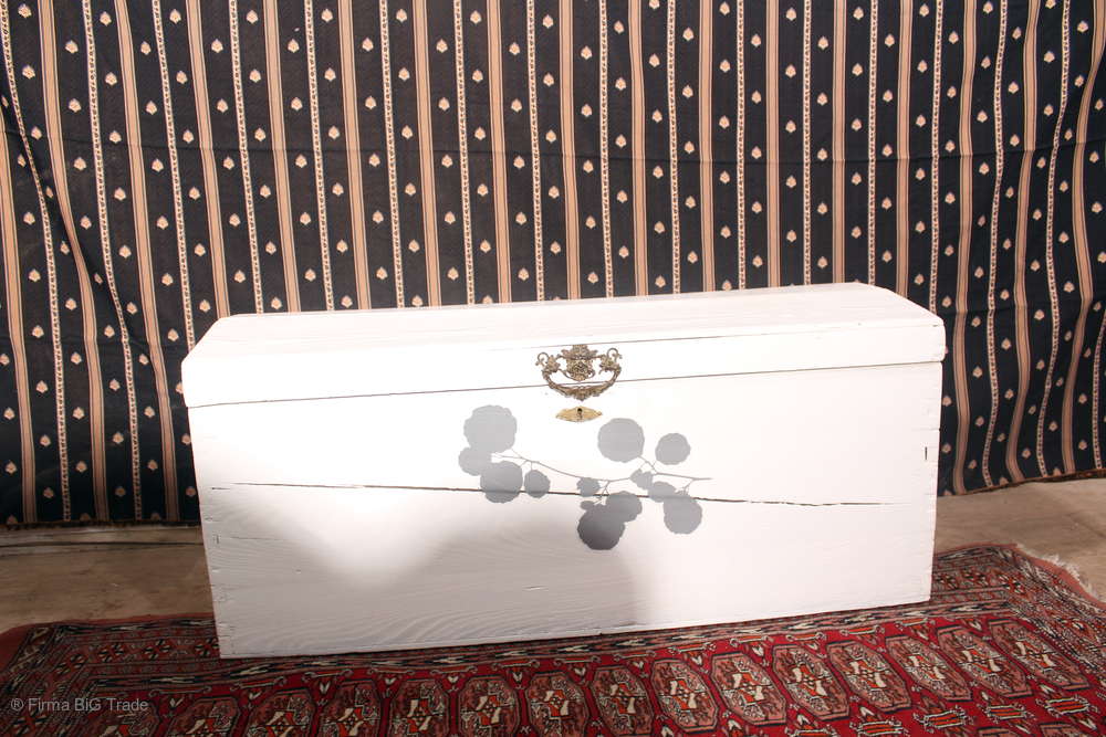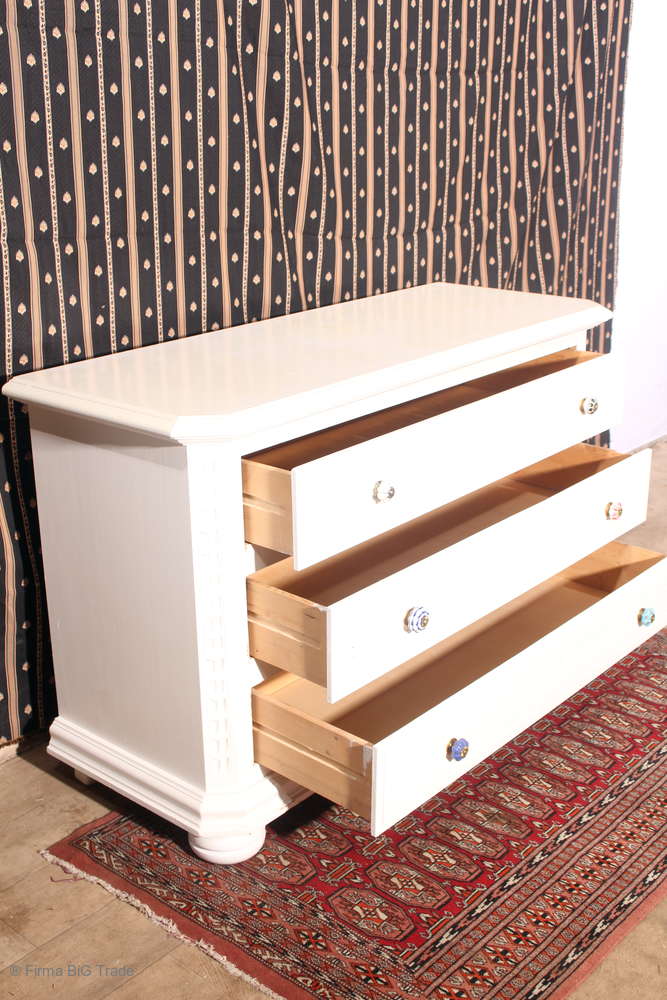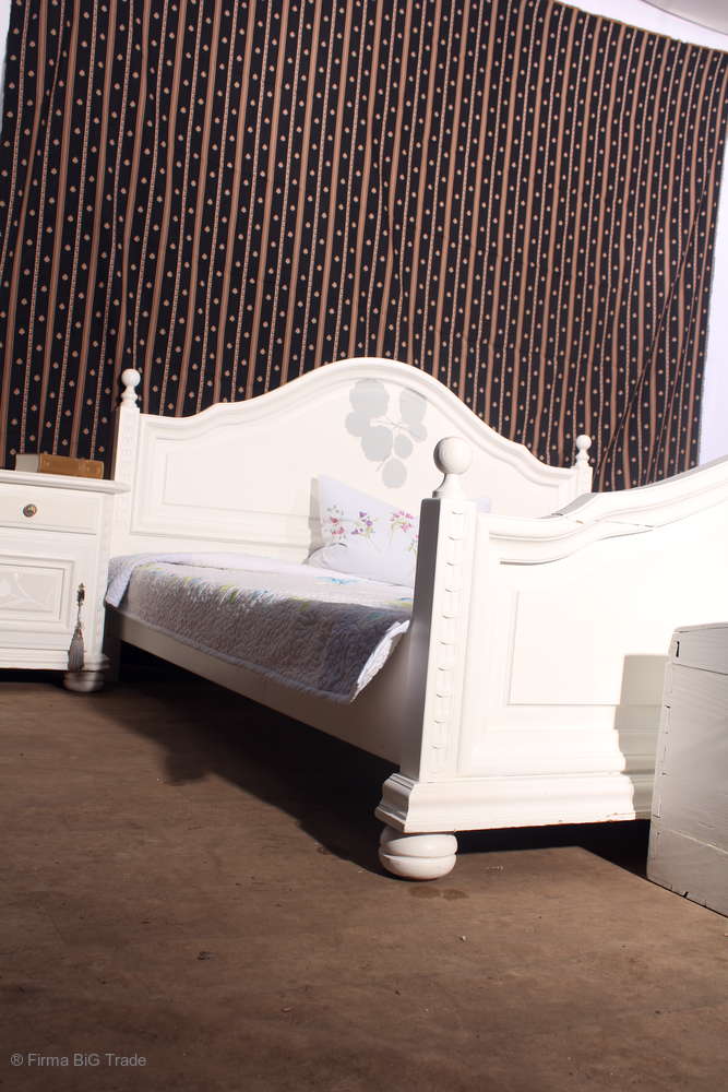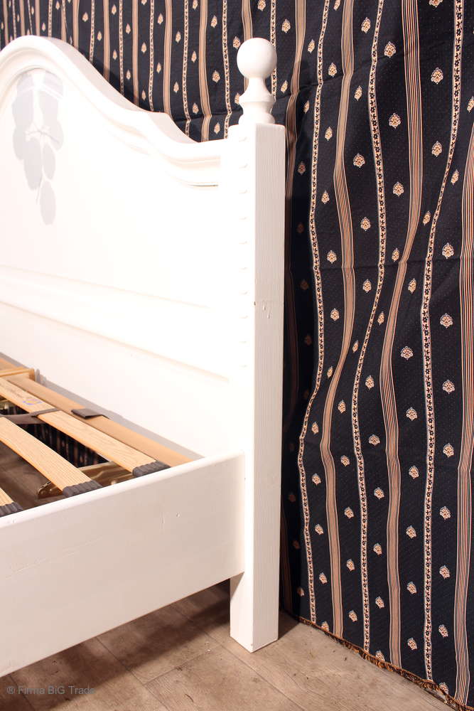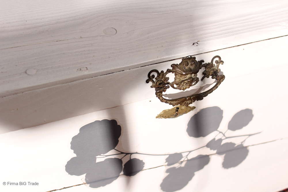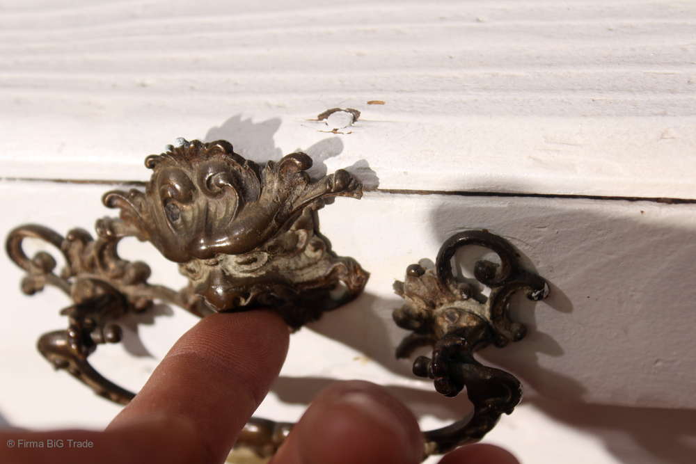 Angeboten wird ein zauberhaft schönes Landhaus Schlafzimmer bestehen aus einem prächtigen Doppelbett / Ehebett (King Size), 2 Lattenrosten, einer Wäschekommode mit 3 geräumigen Schubladen, 2 Nachtschränken und einer antiken Biedermeier Truhe aus massivem Holz. Das Herrschaftliche Doppelbett besitzt Kopf- und Fußteile, das an allen vier Ecken mit Kugelpfosten sowie Schnitzereien verziert ist. Die Kommode besitzt 3 leichtläufige Schubladen und 2 praktische Nachtschränke mit jeweils eine Schublade und einem abschließbaren Schrankfach. Alle Möbel bis auf die Biedermeier Truhe sind gleich dezent geschnitzt und elegant gestaltet und vom Vorbesitzer in Weiß Shabby Chic gestrichen. Die Möbel weisen Alters- und Gebrauchsspuren u.a. Risse am Fußteil des Bettes und der Truhe, Kratzer, Flecken und Abriebstellen (alles siehe Bilder), die schönen ausgefallenen Landhausmöbel befinden sich ansonsten in einem guten gebrauchten Zustand.