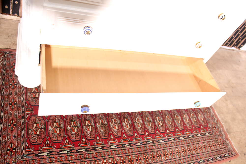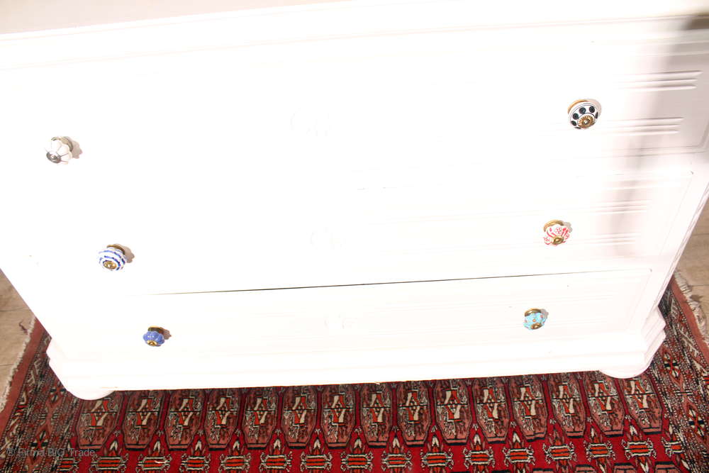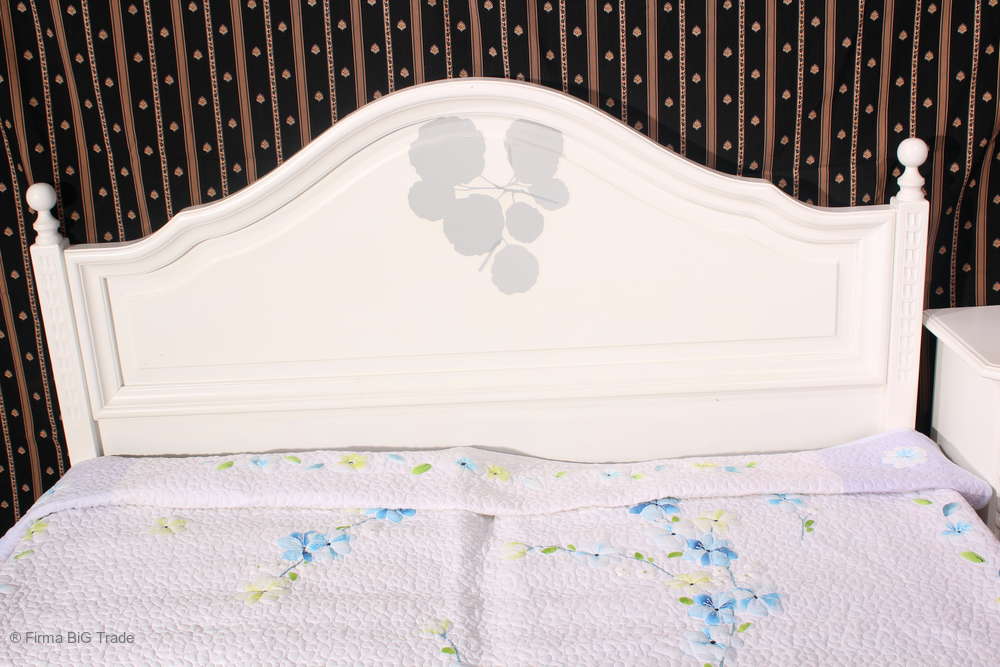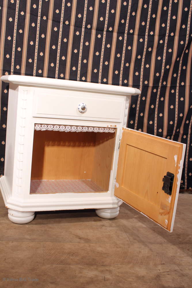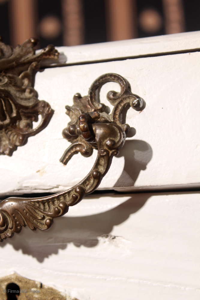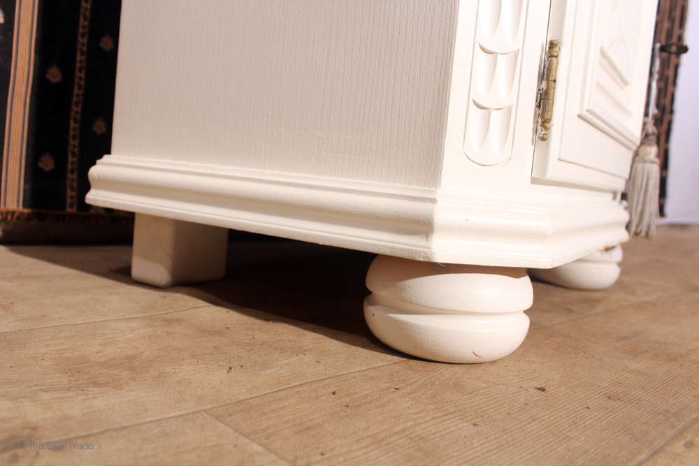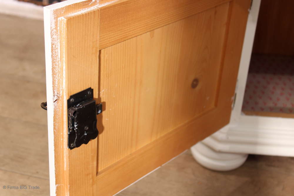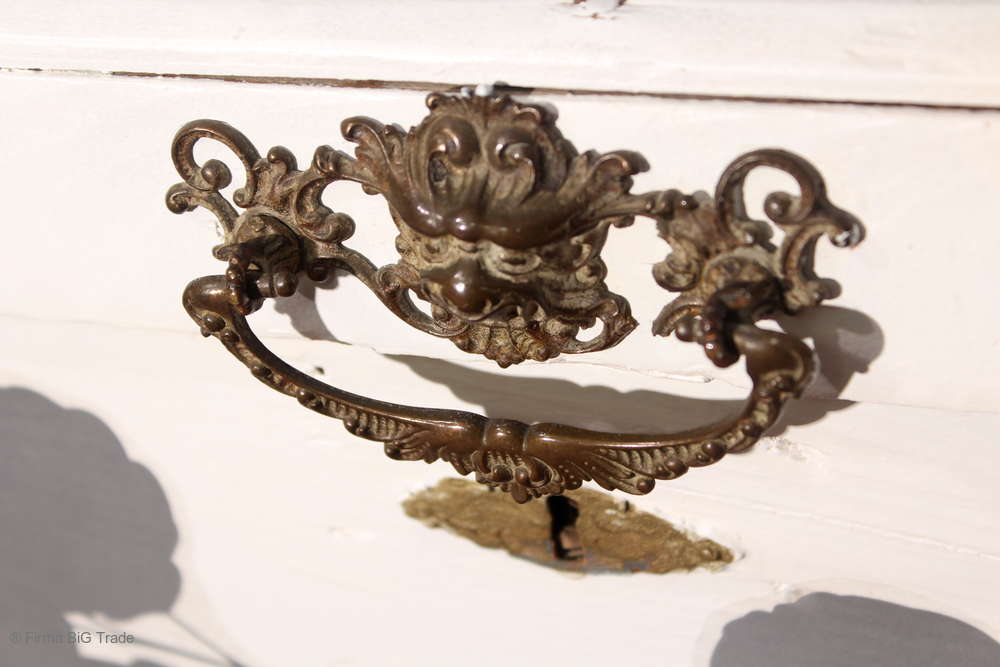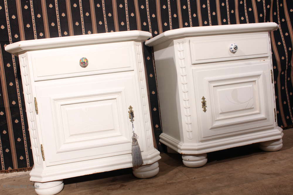 Angeboten wird ein zauberhaft schönes Landhaus Schlafzimmer bestehen aus einem prächtigen Doppelbett / Ehebett (King Size), 2 Lattenrosten, einer Wäschekommode mit 3 geräumigen Schubladen, 2 Nachtschränken und einer antiken Biedermeier Truhe aus massivem Holz. Das Herrschaftliche Doppelbett besitzt Kopf- und Fußteile, das an allen vier Ecken mit Kugelpfosten sowie Schnitzereien verziert ist. Die Kommode besitzt 3 leichtläufige Schubladen und 2 praktische Nachtschränke mit jeweils eine Schublade und einem abschließbaren Schrankfach. Alle Möbel bis auf die Biedermeier Truhe sind gleich dezent geschnitzt und elegant gestaltet und vom Vorbesitzer in Weiß Shabby Chic gestrichen. Die Möbel weisen Alters- und Gebrauchsspuren u.a. Risse am Fußteil des Bettes und der Truhe, Kratzer, Flecken und Abriebstellen (alles siehe Bilder), die schönen ausgefallenen Landhausmöbel befinden sich ansonsten in einem guten gebrauchten Zustand.