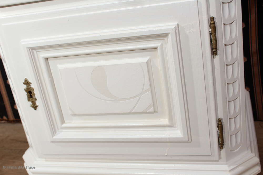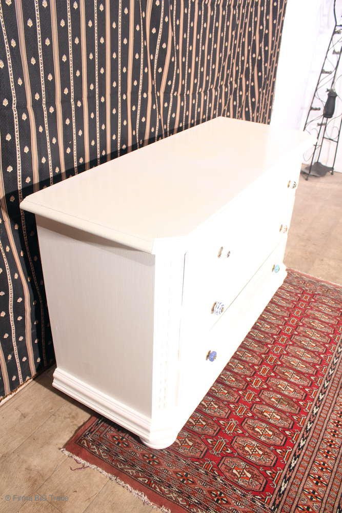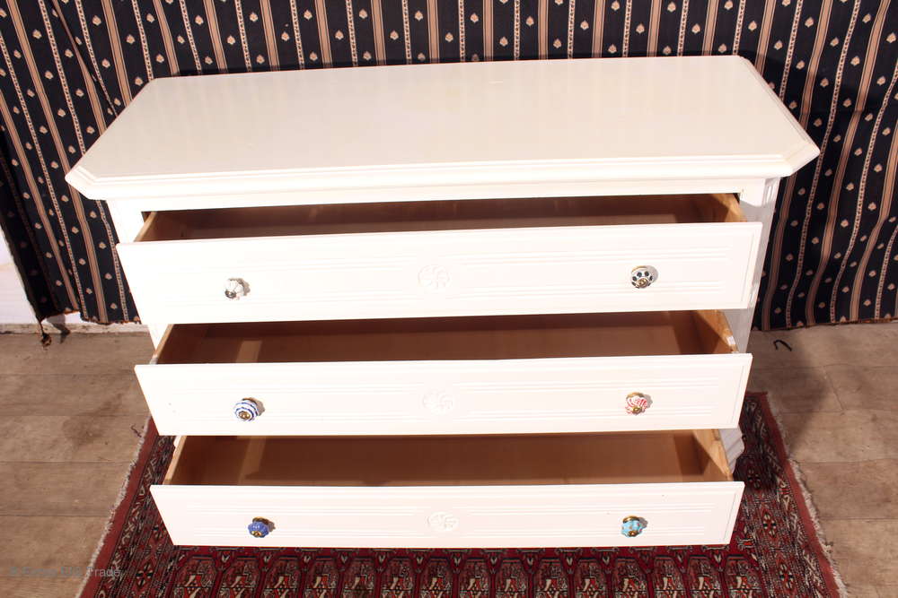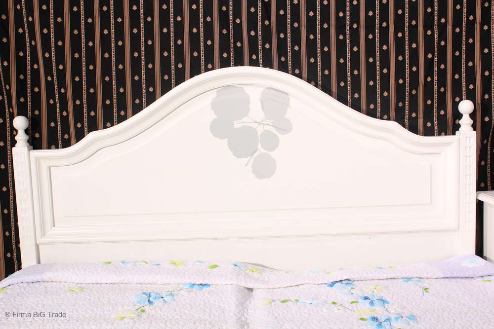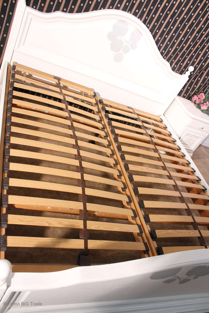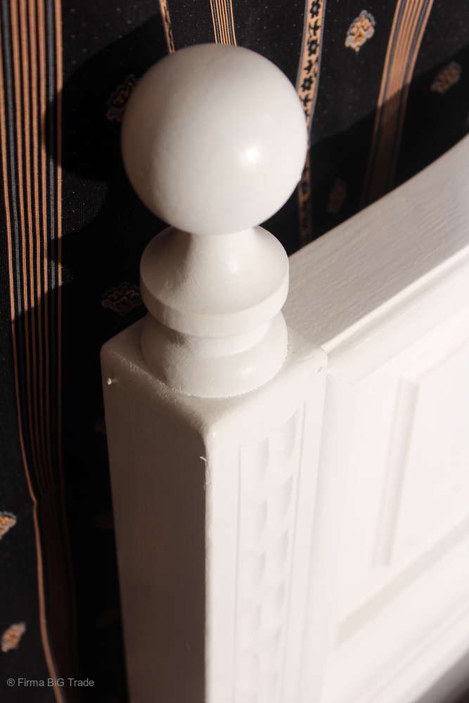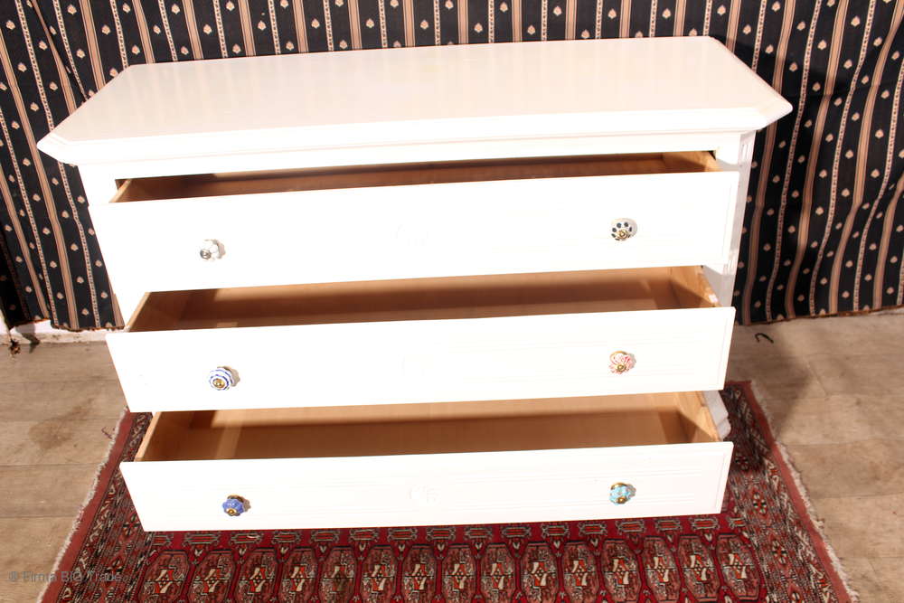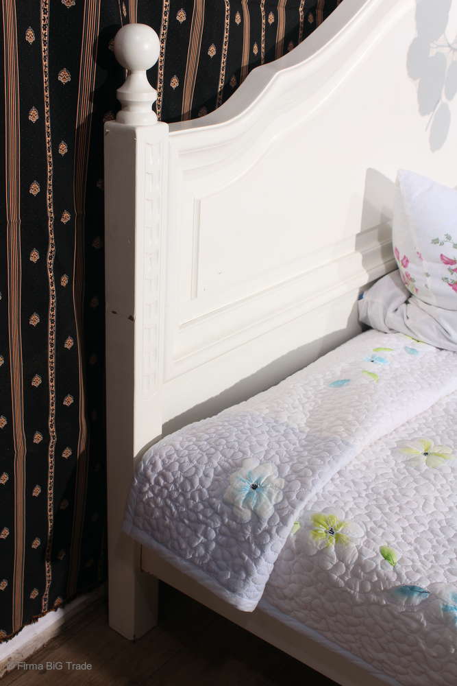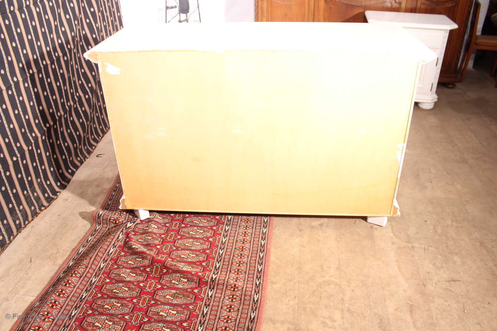 Angeboten wird ein zauberhaft schönes Landhaus Schlafzimmer bestehen aus einem prächtigen Doppelbett / Ehebett (King Size), 2 Lattenrosten, einer Wäschekommode mit 3 geräumigen Schubladen, 2 Nachtschränken und einer antiken Biedermeier Truhe aus massivem Holz. Das Herrschaftliche Doppelbett besitzt Kopf- und Fußteile, das an allen vier Ecken mit Kugelpfosten sowie Schnitzereien verziert ist. Die Kommode besitzt 3 leichtläufige Schubladen und 2 praktische Nachtschränke mit jeweils eine Schublade und einem abschließbaren Schrankfach. Alle Möbel bis auf die Biedermeier Truhe sind gleich dezent geschnitzt und elegant gestaltet und vom Vorbesitzer in Weiß Shabby Chic gestrichen. Die Möbel weisen Alters- und Gebrauchsspuren u.a. Risse am Fußteil des Bettes und der Truhe, Kratzer, Flecken und Abriebstellen (alles siehe Bilder), die schönen ausgefallenen Landhausmöbel befinden sich ansonsten in einem guten gebrauchten Zustand.