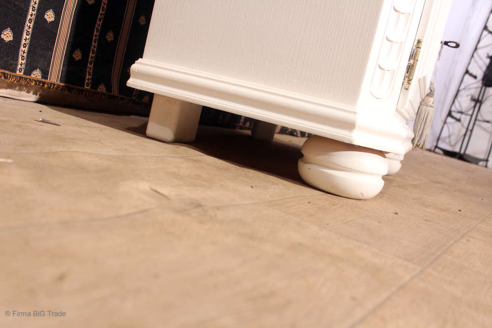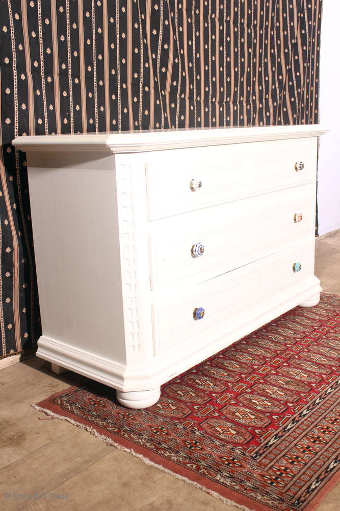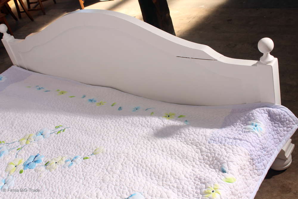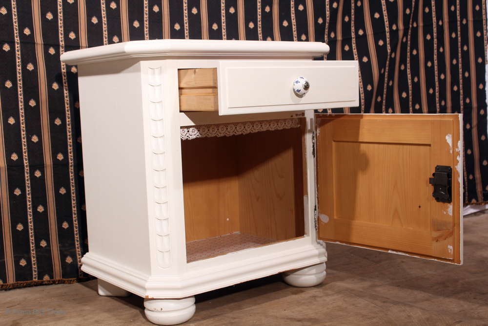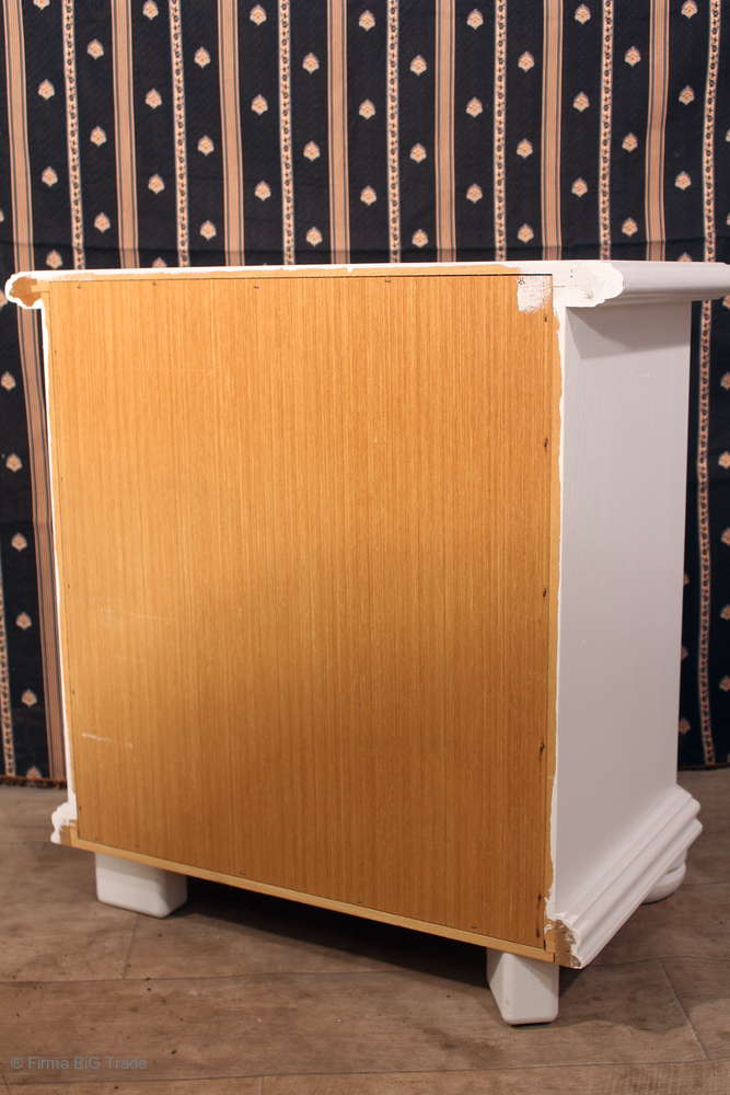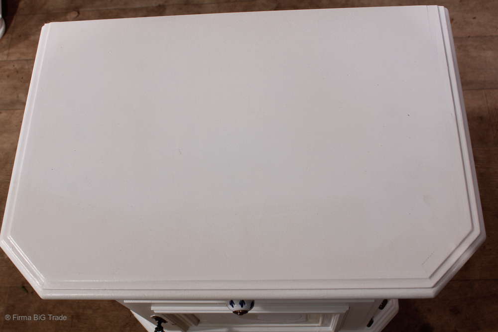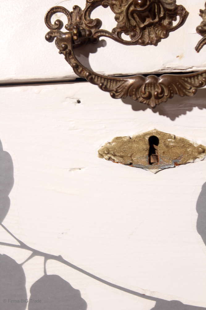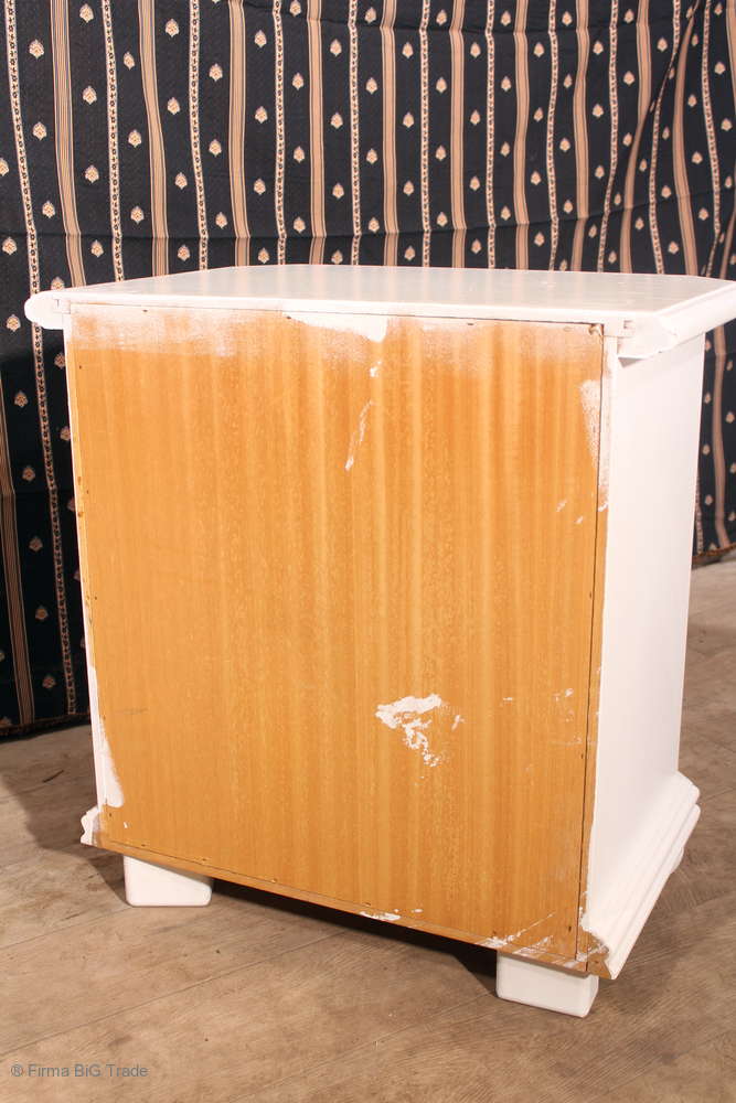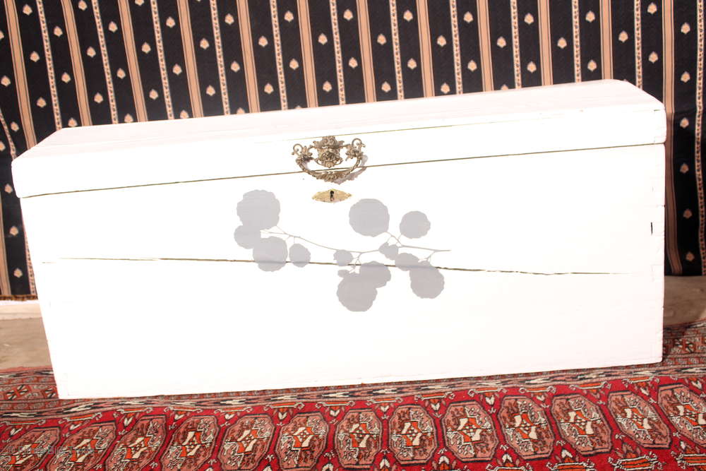 Angeboten wird ein zauberhaft schönes Landhaus Schlafzimmer bestehen aus einem prächtigen Doppelbett / Ehebett (King Size), 2 Lattenrosten, einer Wäschekommode mit 3 geräumigen Schubladen, 2 Nachtschränken und einer antiken Biedermeier Truhe aus massivem Holz. Das Herrschaftliche Doppelbett besitzt Kopf- und Fußteile, das an allen vier Ecken mit Kugelpfosten sowie Schnitzereien verziert ist. Die Kommode besitzt 3 leichtläufige Schubladen und 2 praktische Nachtschränke mit jeweils eine Schublade und einem abschließbaren Schrankfach. Alle Möbel bis auf die Biedermeier Truhe sind gleich dezent geschnitzt und elegant gestaltet und vom Vorbesitzer in Weiß Shabby Chic gestrichen. Die Möbel weisen Alters- und Gebrauchsspuren u.a. Risse am Fußteil des Bettes und der Truhe, Kratzer, Flecken und Abriebstellen (alles siehe Bilder), die schönen ausgefallenen Landhausmöbel befinden sich ansonsten in einem guten gebrauchten Zustand.