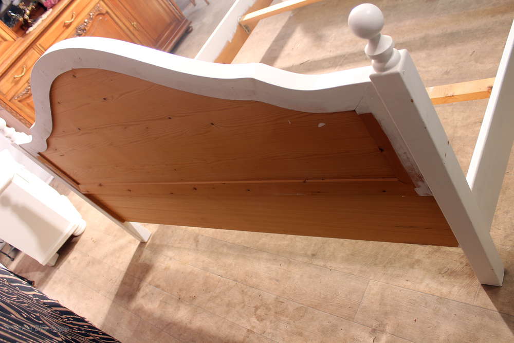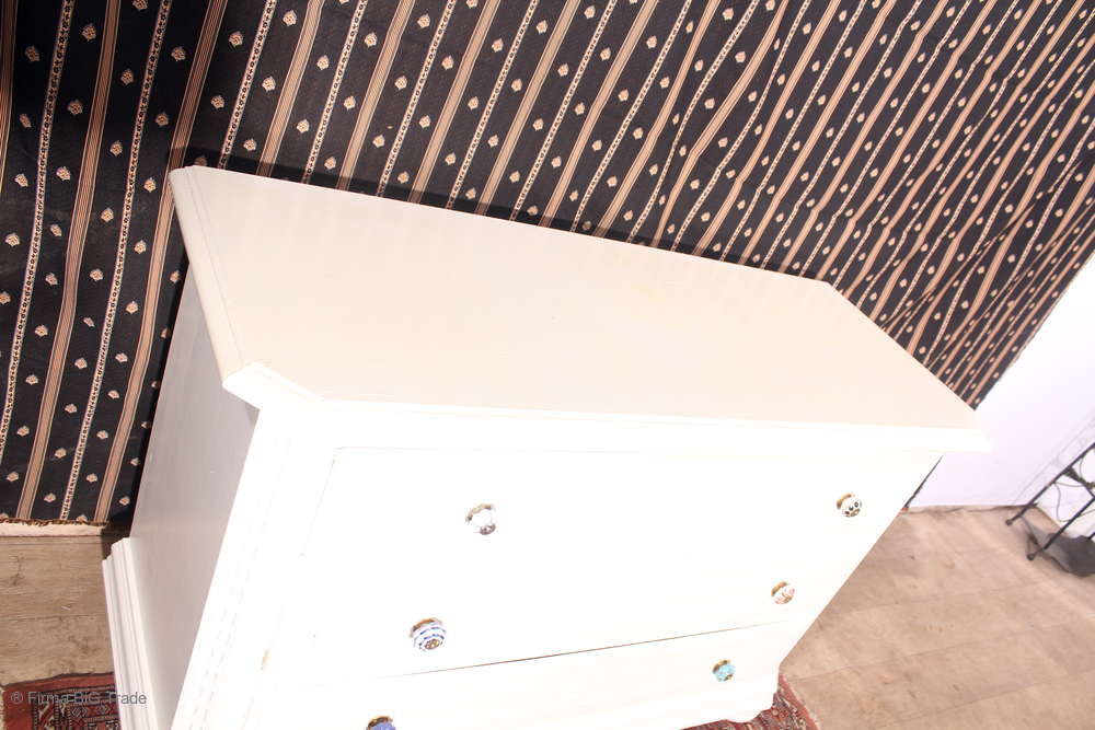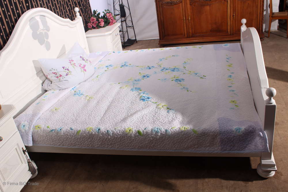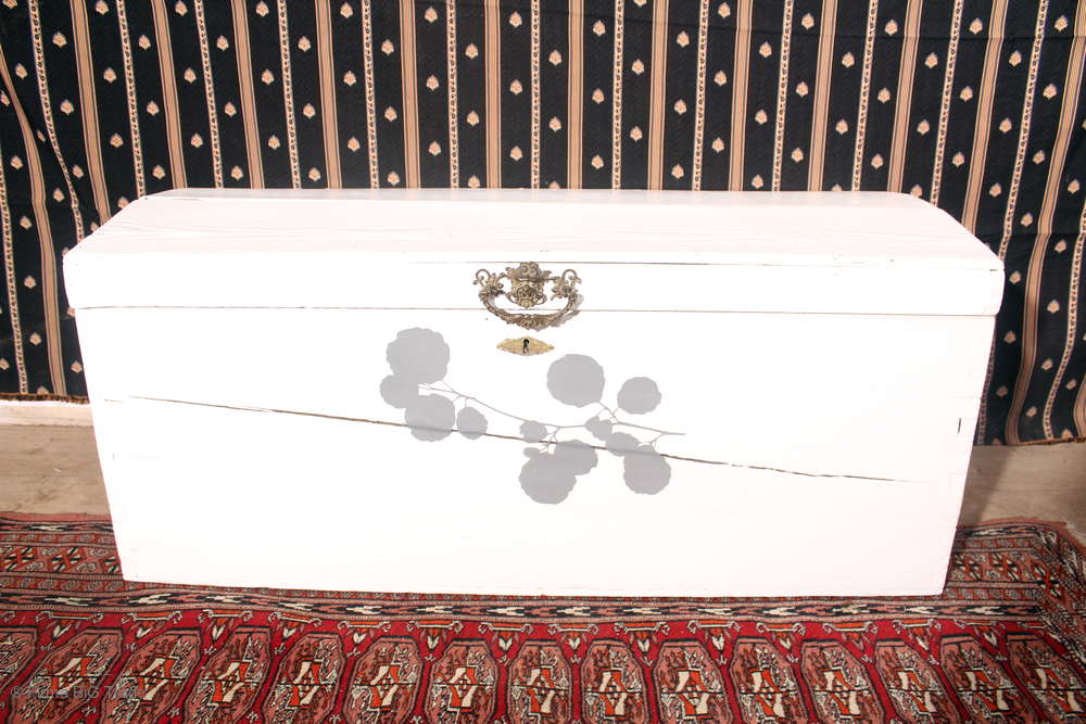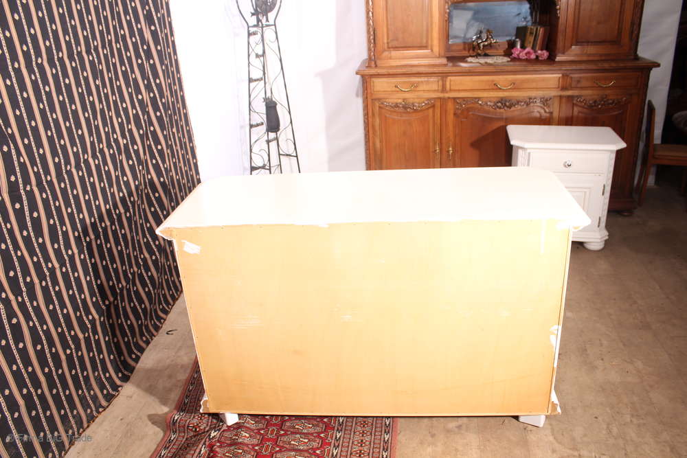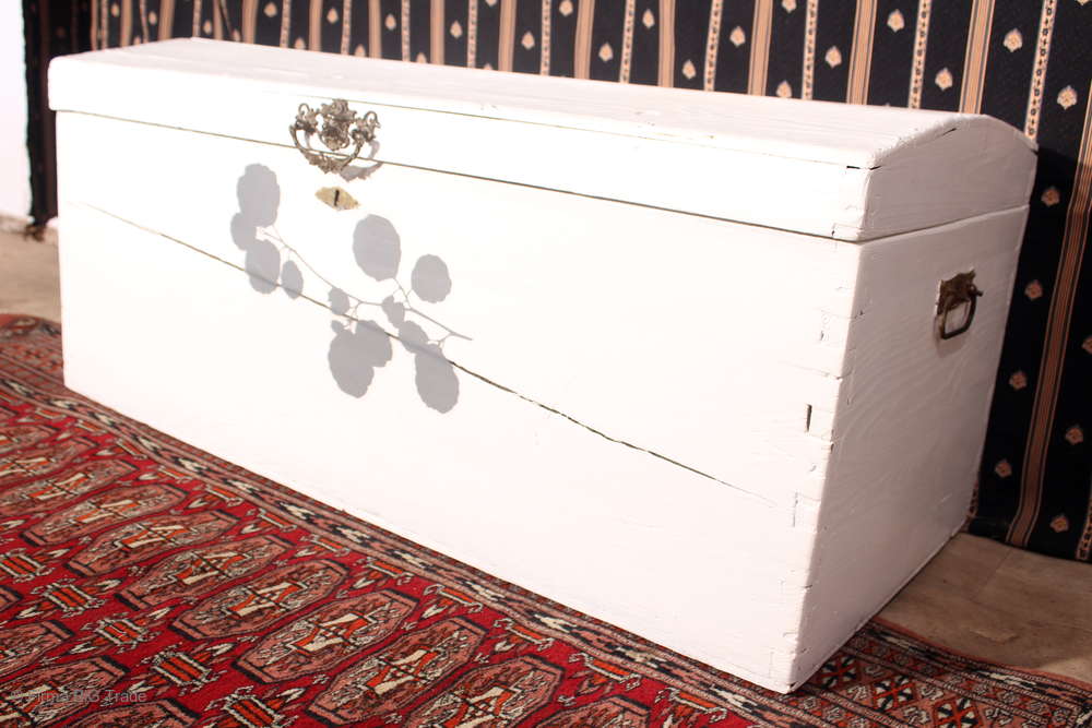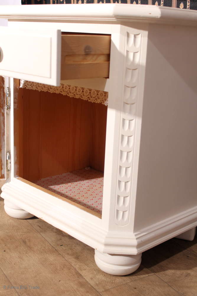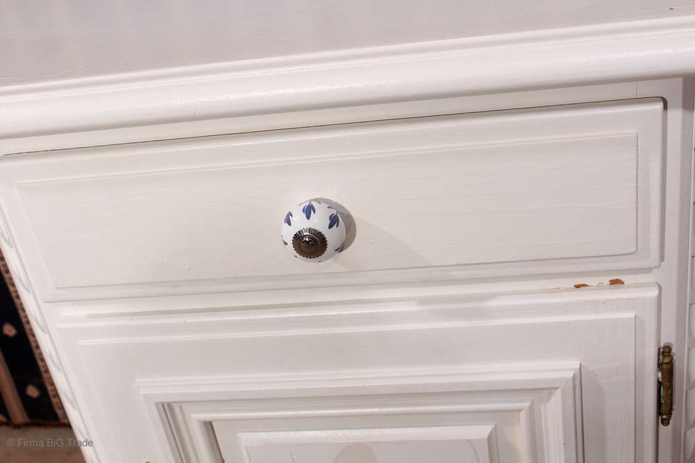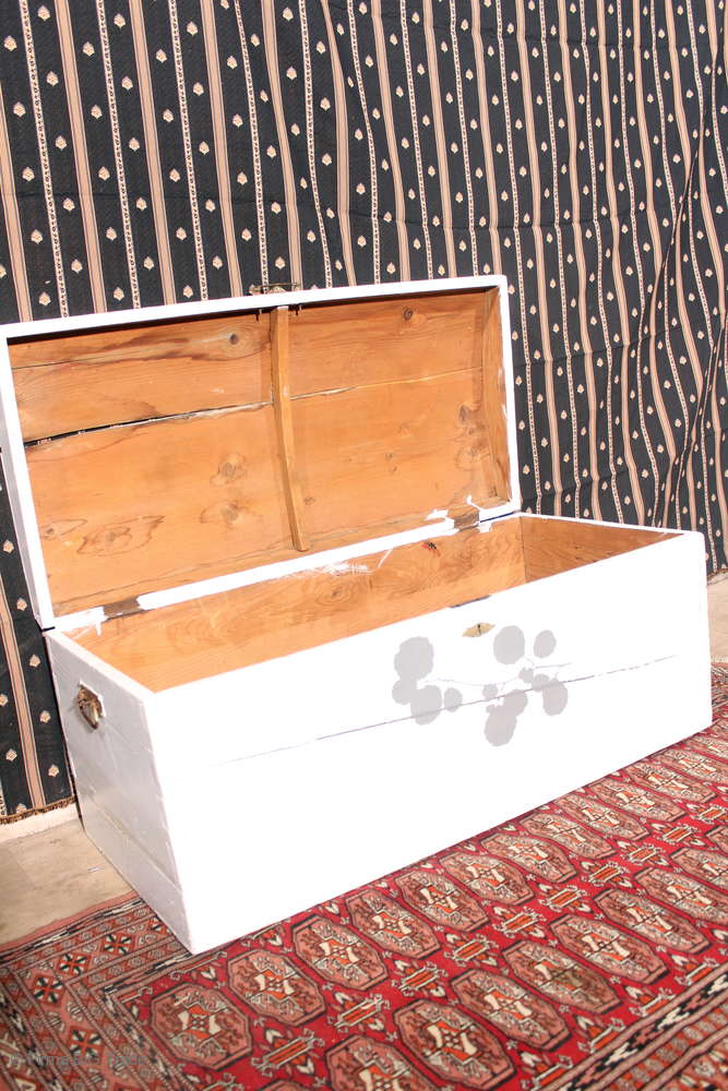 Angeboten wird ein zauberhaft schönes Landhaus Schlafzimmer bestehen aus einem prächtigen Doppelbett / Ehebett (King Size), 2 Lattenrosten, einer Wäschekommode mit 3 geräumigen Schubladen, 2 Nachtschränken und einer antiken Biedermeier Truhe aus massivem Holz. Das Herrschaftliche Doppelbett besitzt Kopf- und Fußteile, das an allen vier Ecken mit Kugelpfosten sowie Schnitzereien verziert ist. Die Kommode besitzt 3 leichtläufige Schubladen und 2 praktische Nachtschränke mit jeweils eine Schublade und einem abschließbaren Schrankfach. Alle Möbel bis auf die Biedermeier Truhe sind gleich dezent geschnitzt und elegant gestaltet und vom Vorbesitzer in Weiß Shabby Chic gestrichen. Die Möbel weisen Alters- und Gebrauchsspuren u.a. Risse am Fußteil des Bettes und der Truhe, Kratzer, Flecken und Abriebstellen (alles siehe Bilder), die schönen ausgefallenen Landhausmöbel befinden sich ansonsten in einem guten gebrauchten Zustand.