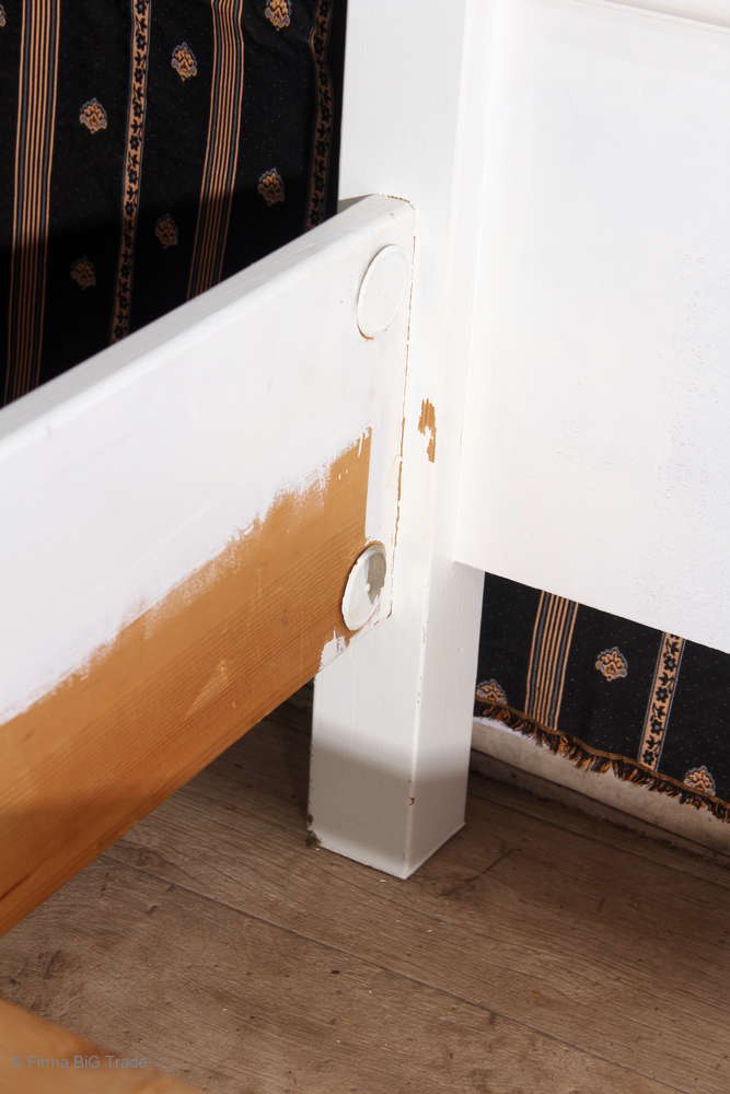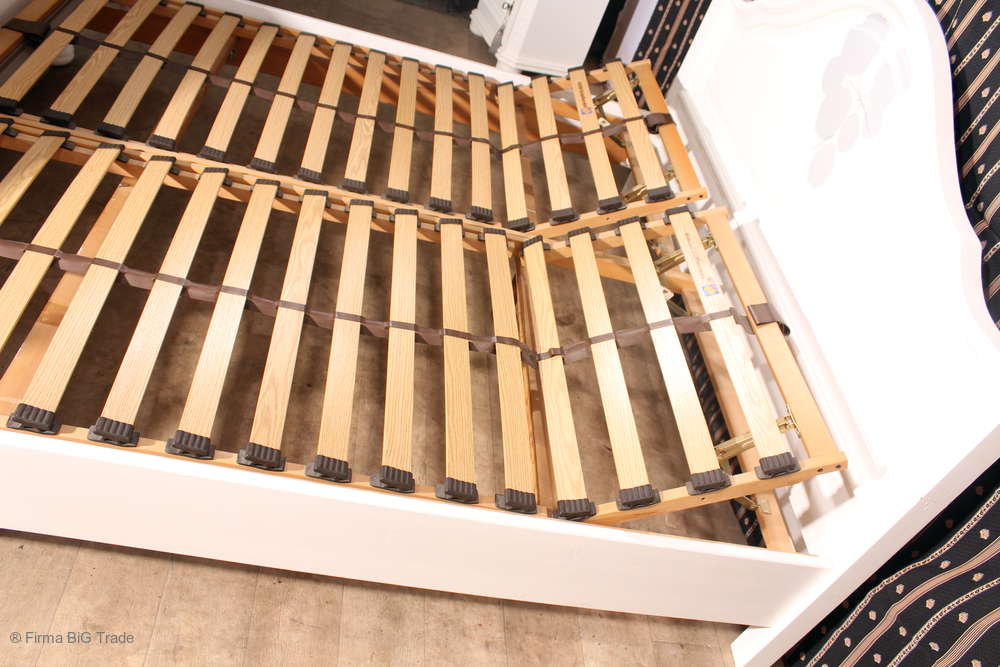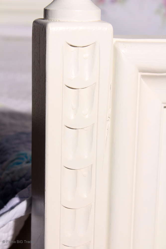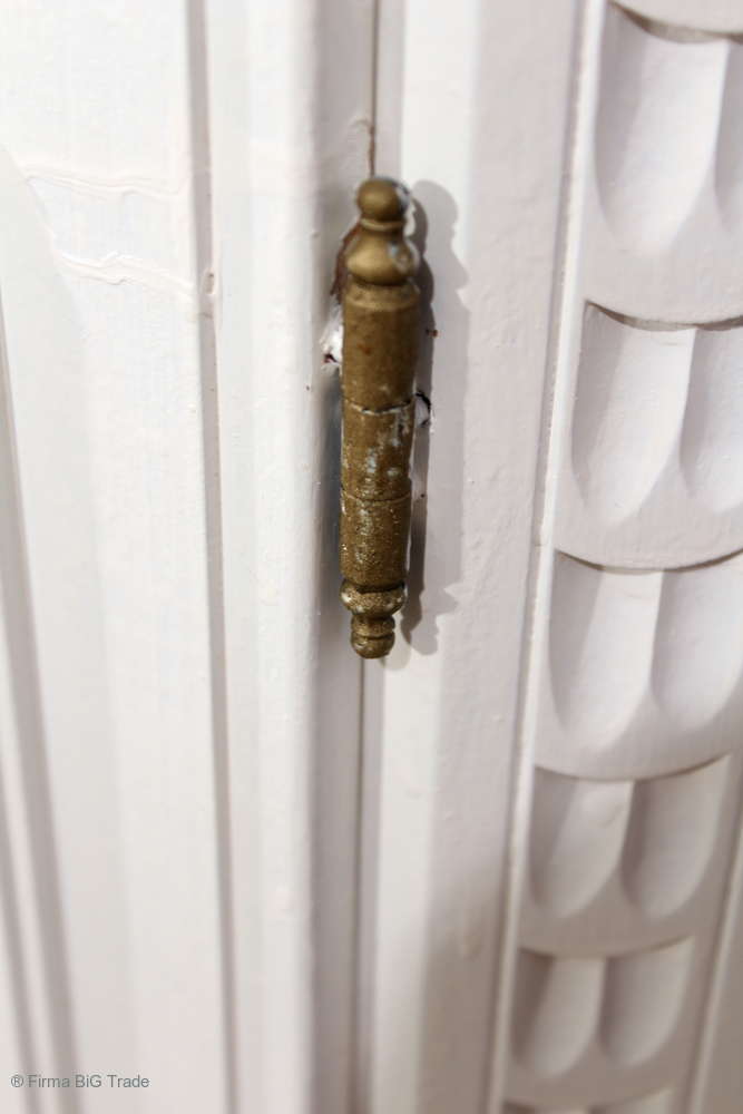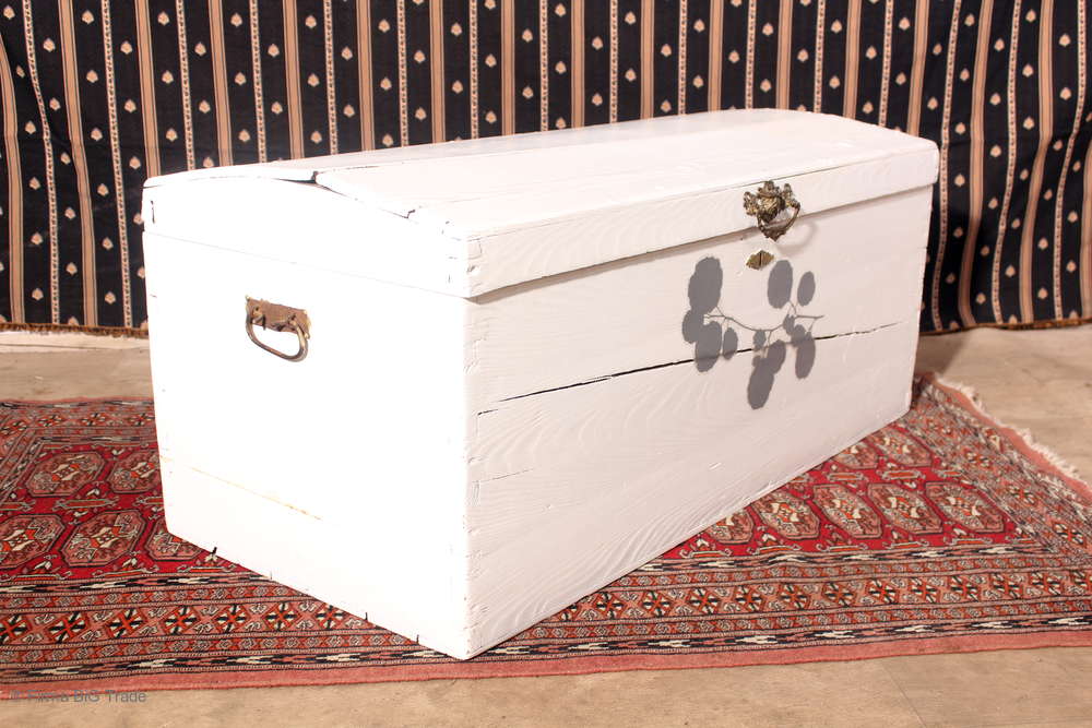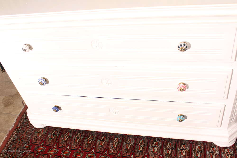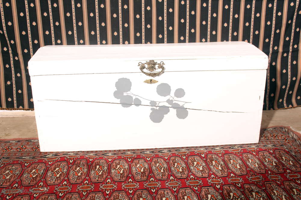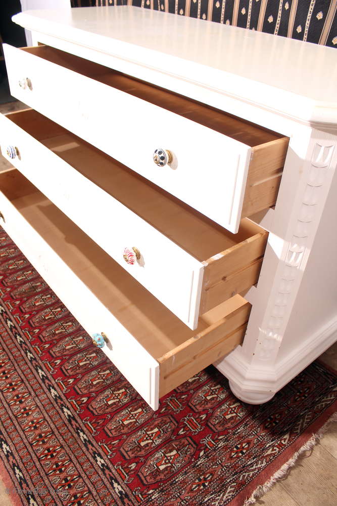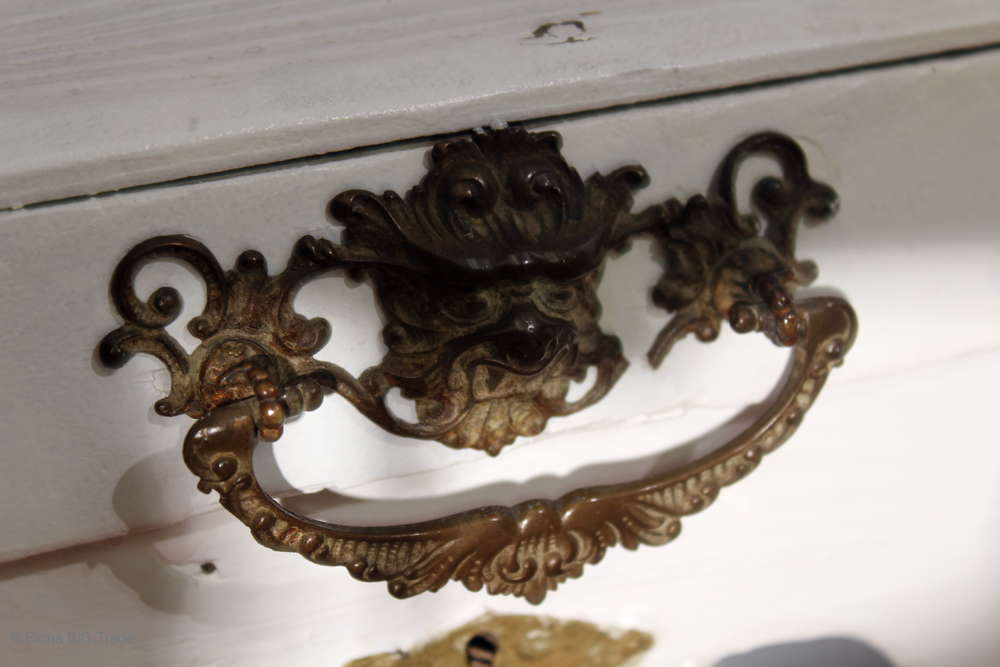 Angeboten wird ein zauberhaft schönes Landhaus Schlafzimmer bestehen aus einem prächtigen Doppelbett / Ehebett (King Size), 2 Lattenrosten, einer Wäschekommode mit 3 geräumigen Schubladen, 2 Nachtschränken und einer antiken Biedermeier Truhe aus massivem Holz. Das Herrschaftliche Doppelbett besitzt Kopf- und Fußteile, das an allen vier Ecken mit Kugelpfosten sowie Schnitzereien verziert ist. Die Kommode besitzt 3 leichtläufige Schubladen und 2 praktische Nachtschränke mit jeweils eine Schublade und einem abschließbaren Schrankfach. Alle Möbel bis auf die Biedermeier Truhe sind gleich dezent geschnitzt und elegant gestaltet und vom Vorbesitzer in Weiß Shabby Chic gestrichen. Die Möbel weisen Alters- und Gebrauchsspuren u.a. Risse am Fußteil des Bettes und der Truhe, Kratzer, Flecken und Abriebstellen (alles siehe Bilder), die schönen ausgefallenen Landhausmöbel befinden sich ansonsten in einem guten gebrauchten Zustand.