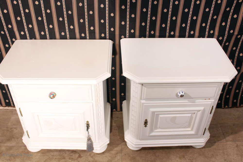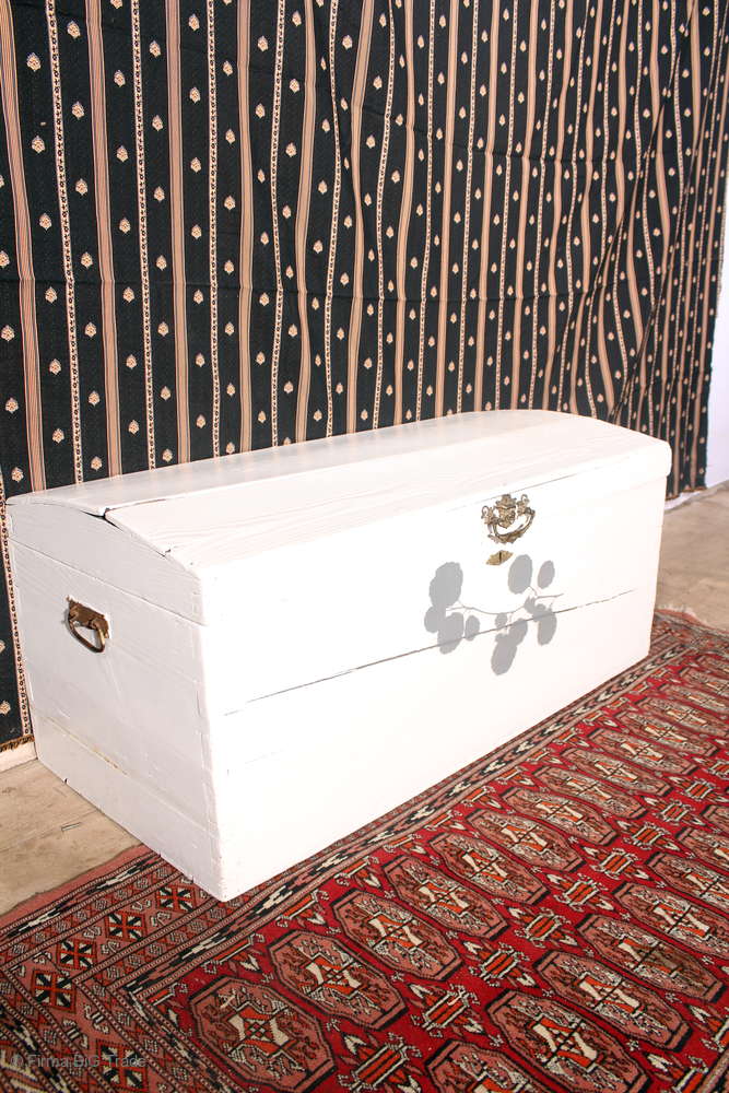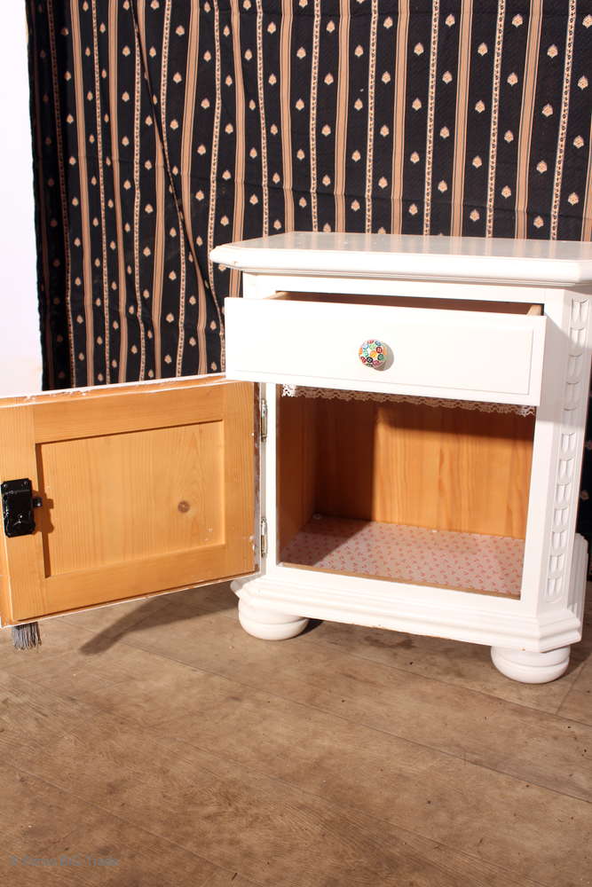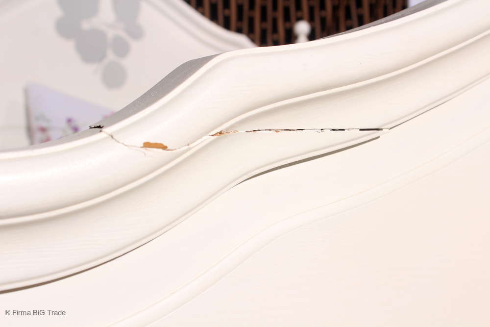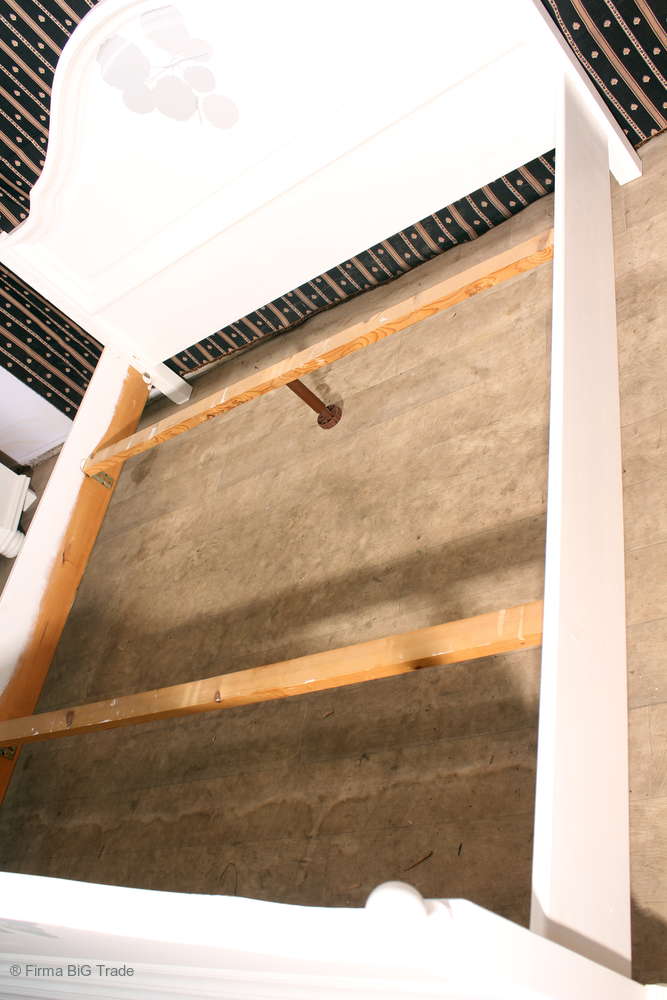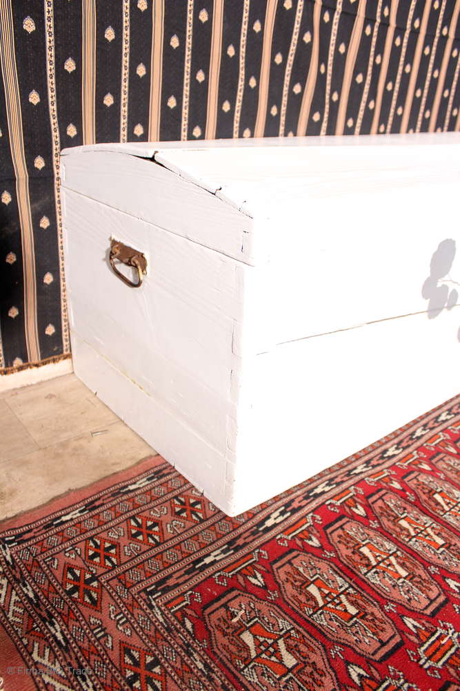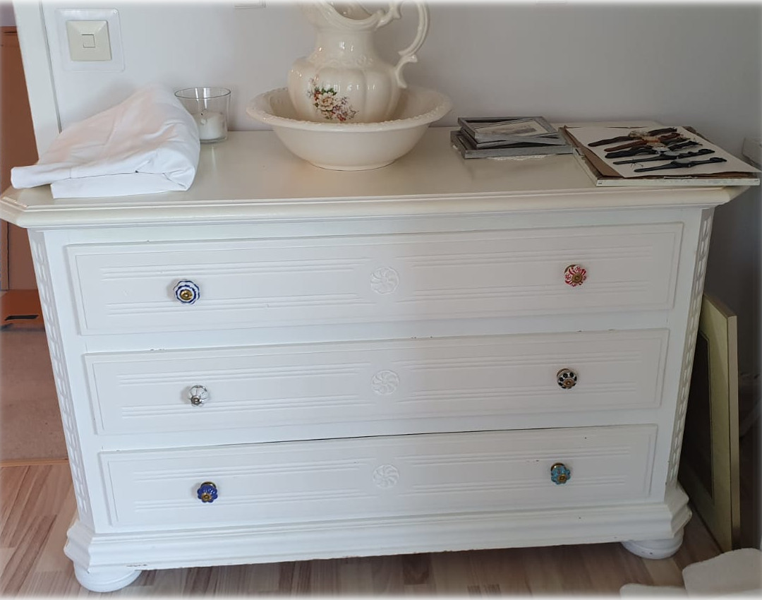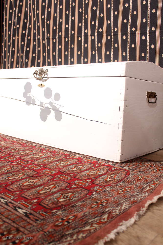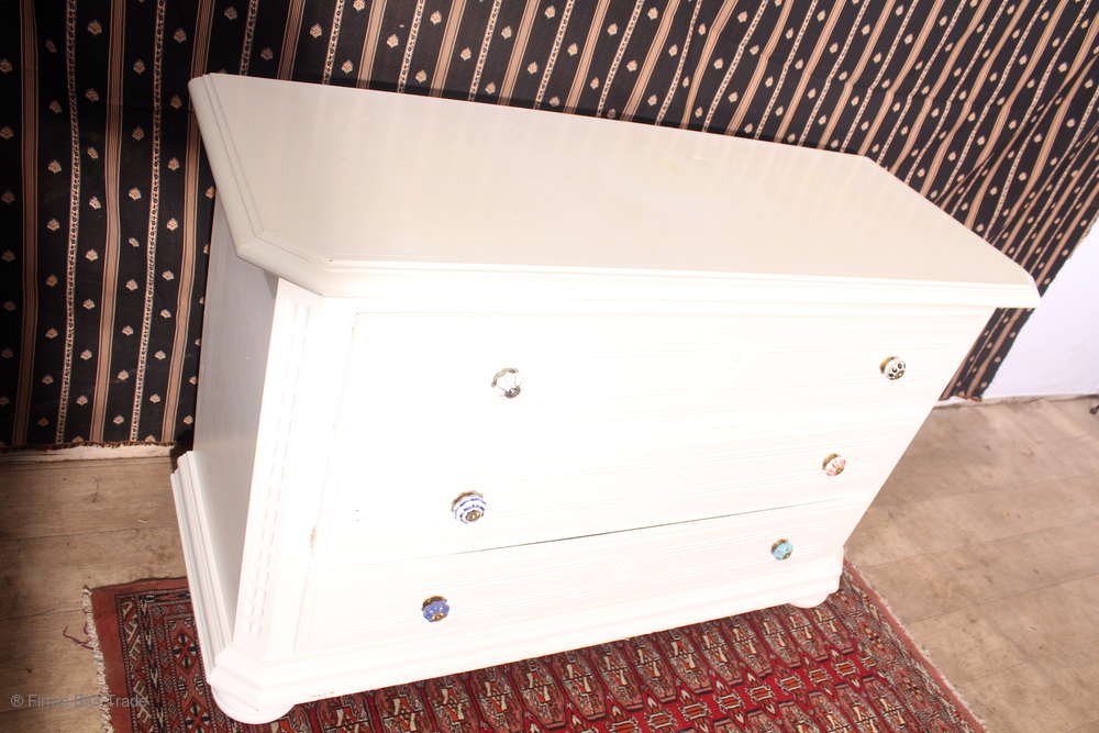 Angeboten wird ein zauberhaft schönes Landhaus Schlafzimmer bestehen aus einem prächtigen Doppelbett / Ehebett (King Size), 2 Lattenrosten, einer Wäschekommode mit 3 geräumigen Schubladen, 2 Nachtschränken und einer antiken Biedermeier Truhe aus massivem Holz. Das Herrschaftliche Doppelbett besitzt Kopf- und Fußteile, das an allen vier Ecken mit Kugelpfosten sowie Schnitzereien verziert ist. Die Kommode besitzt 3 leichtläufige Schubladen und 2 praktische Nachtschränke mit jeweils eine Schublade und einem abschließbaren Schrankfach. Alle Möbel bis auf die Biedermeier Truhe sind gleich dezent geschnitzt und elegant gestaltet und vom Vorbesitzer in Weiß Shabby Chic gestrichen. Die Möbel weisen Alters- und Gebrauchsspuren u.a. Risse am Fußteil des Bettes und der Truhe, Kratzer, Flecken und Abriebstellen (alles siehe Bilder), die schönen ausgefallenen Landhausmöbel befinden sich ansonsten in einem guten gebrauchten Zustand.