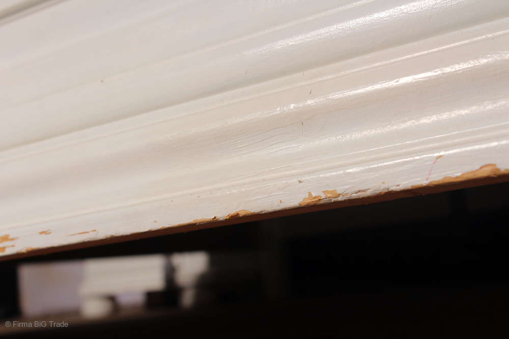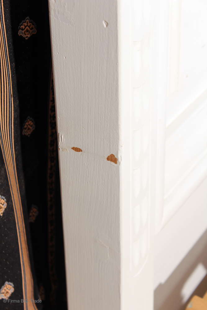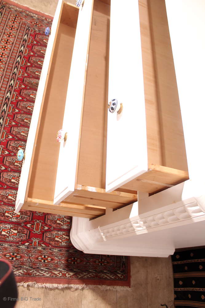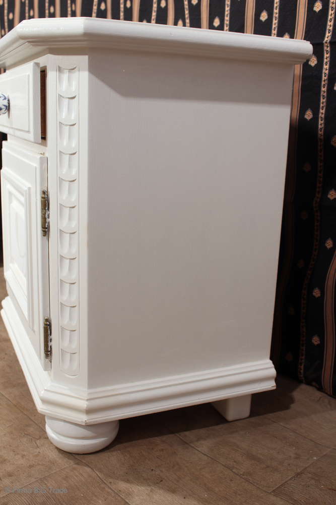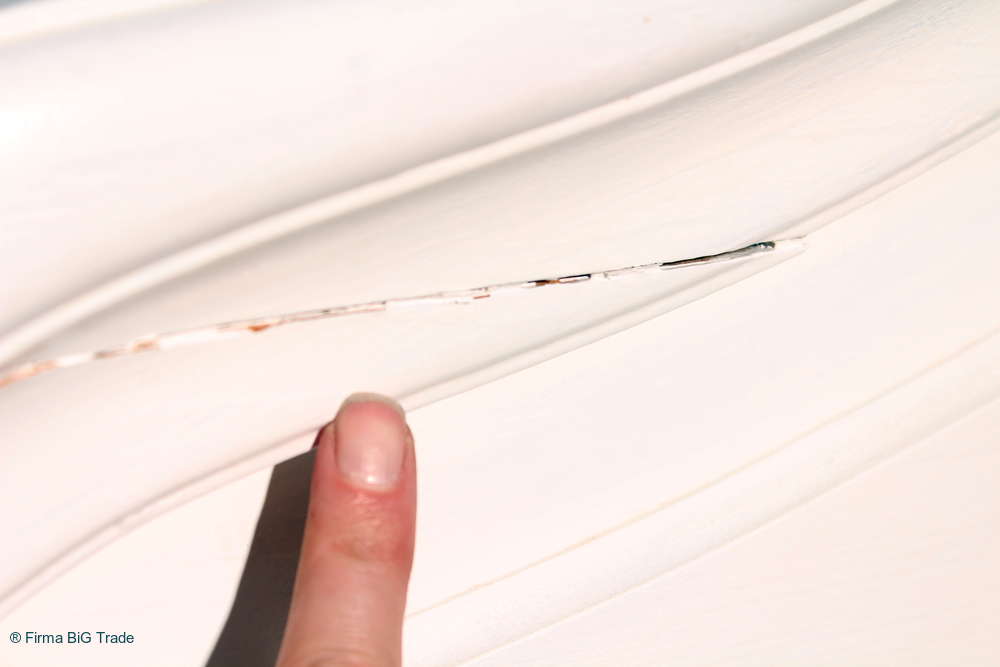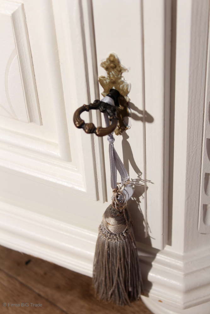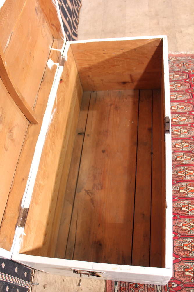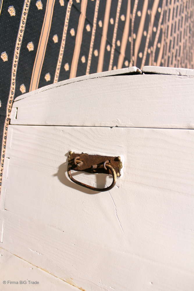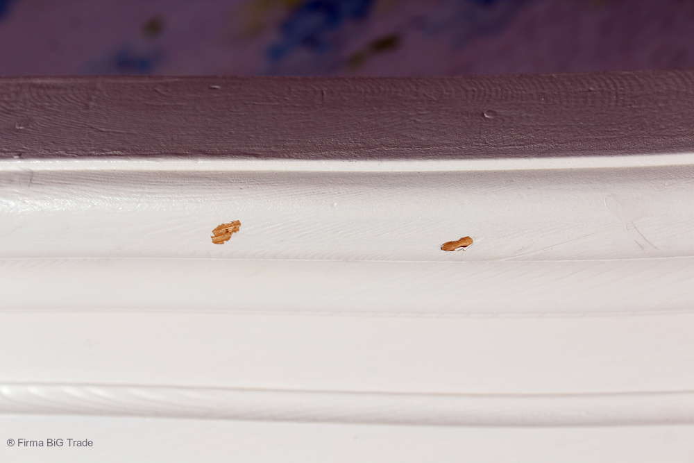 Angeboten wird ein zauberhaft schönes Landhaus Schlafzimmer bestehen aus einem prächtigen Doppelbett / Ehebett (King Size), 2 Lattenrosten, einer Wäschekommode mit 3 geräumigen Schubladen, 2 Nachtschränken und einer antiken Biedermeier Truhe aus massivem Holz. Das Herrschaftliche Doppelbett besitzt Kopf- und Fußteile, das an allen vier Ecken mit Kugelpfosten sowie Schnitzereien verziert ist. Die Kommode besitzt 3 leichtläufige Schubladen und 2 praktische Nachtschränke mit jeweils eine Schublade und einem abschließbaren Schrankfach. Alle Möbel bis auf die Biedermeier Truhe sind gleich dezent geschnitzt und elegant gestaltet und vom Vorbesitzer in Weiß Shabby Chic gestrichen. Die Möbel weisen Alters- und Gebrauchsspuren u.a. Risse am Fußteil des Bettes und der Truhe, Kratzer, Flecken und Abriebstellen (alles siehe Bilder), die schönen ausgefallenen Landhausmöbel befinden sich ansonsten in einem guten gebrauchten Zustand.