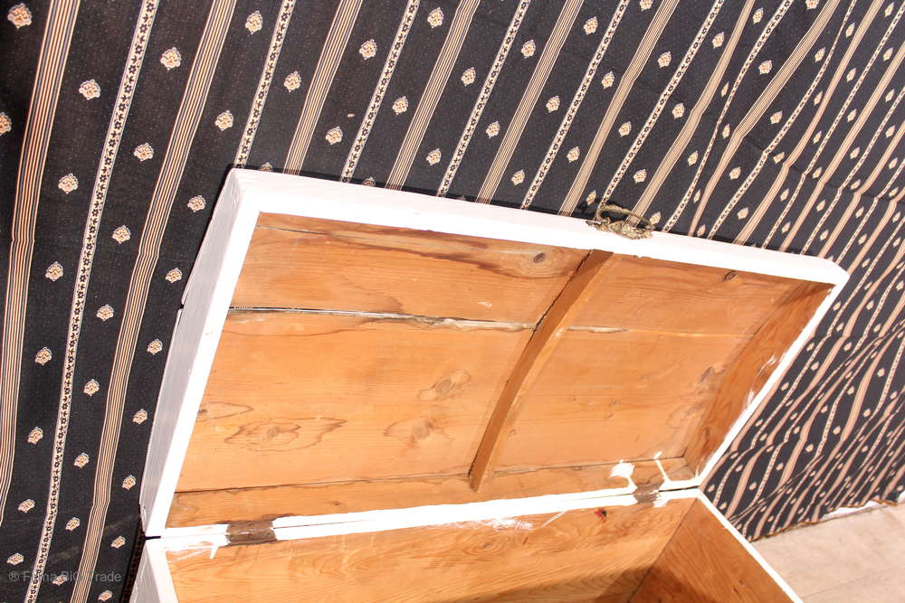7tlg. Landhaus Schlafzimmer / Bauernzimmer Ehebett m. 2 Lattenroste / 2 Nachttische / Kommode u. Antike Biedermeier Truh