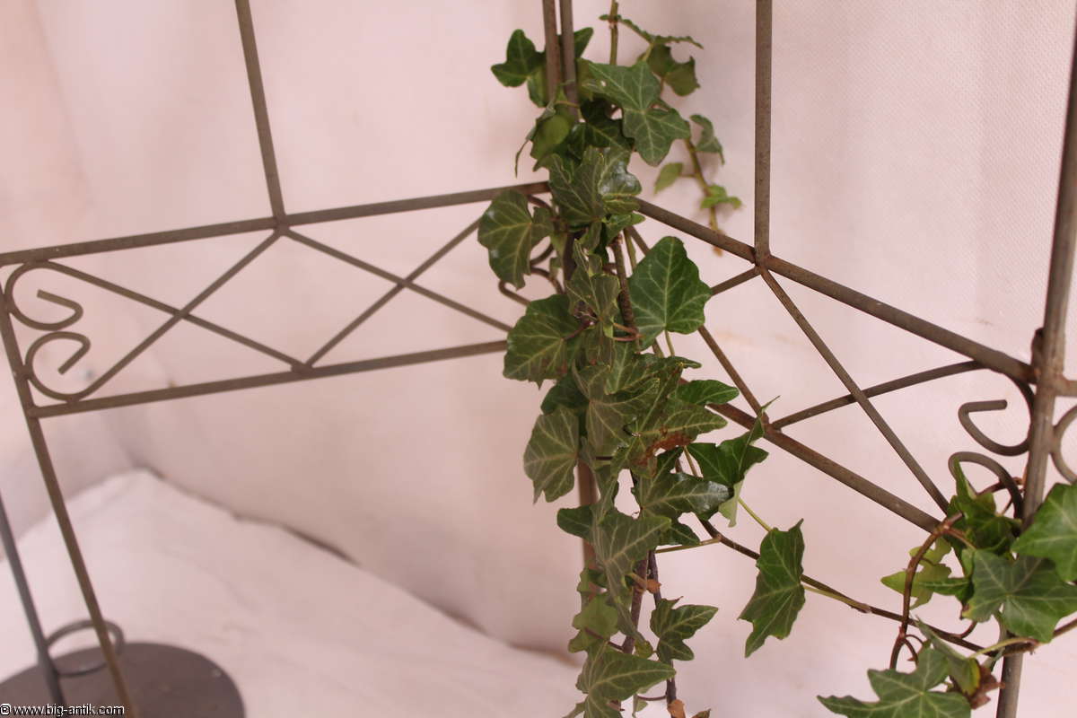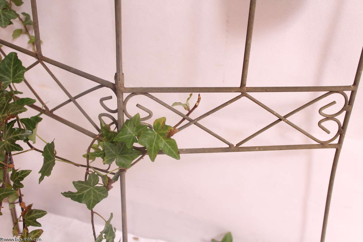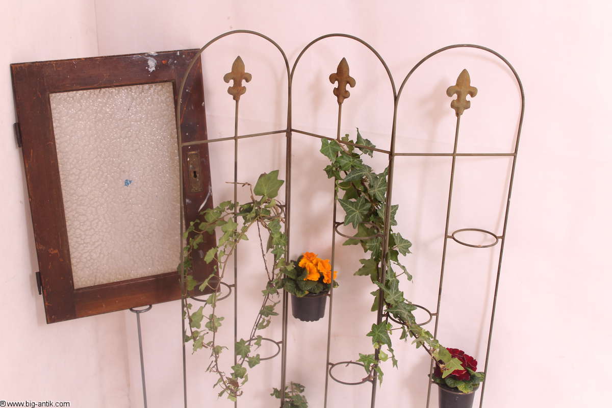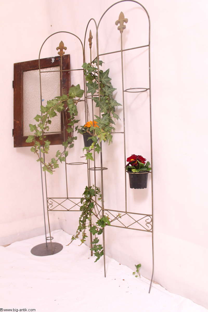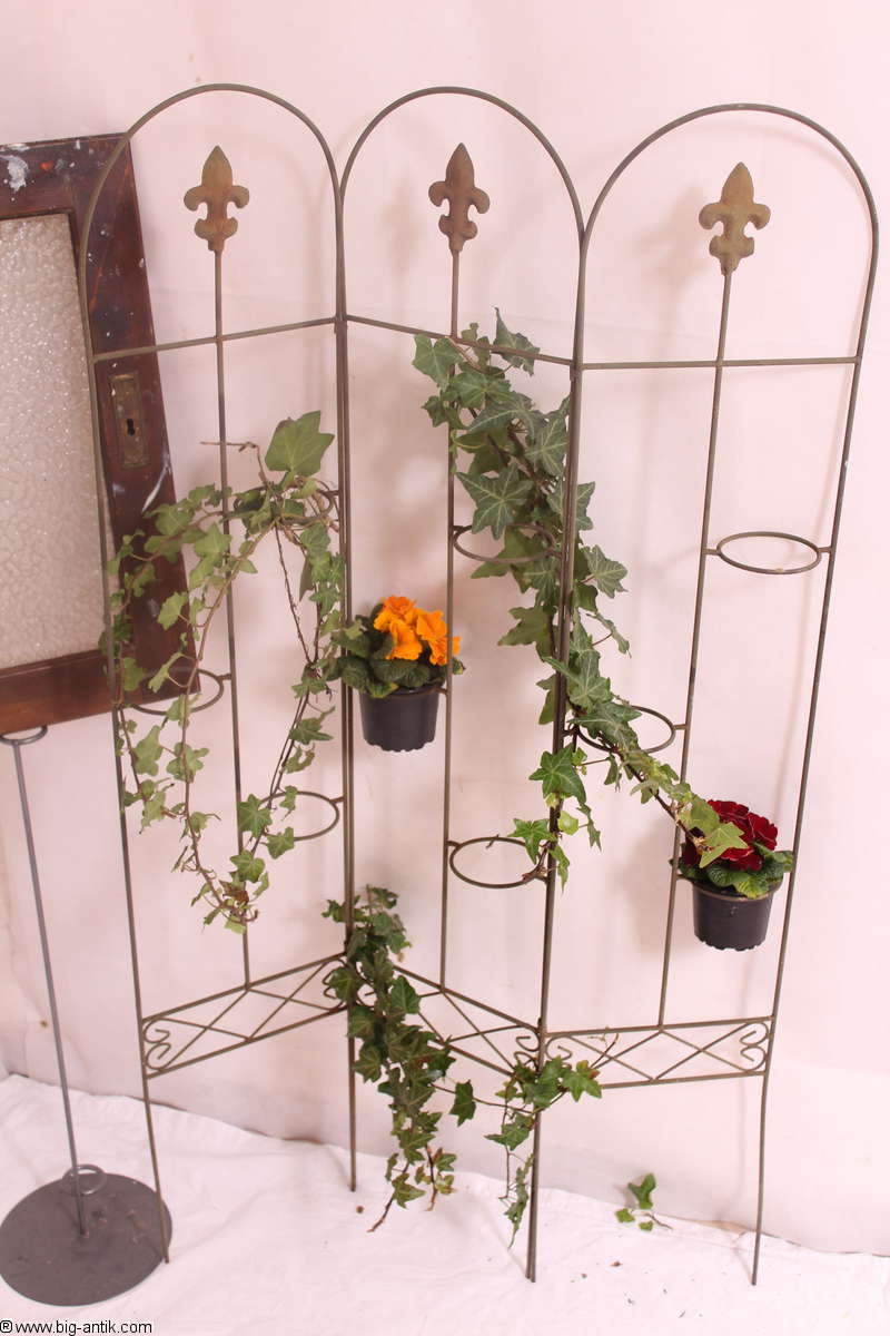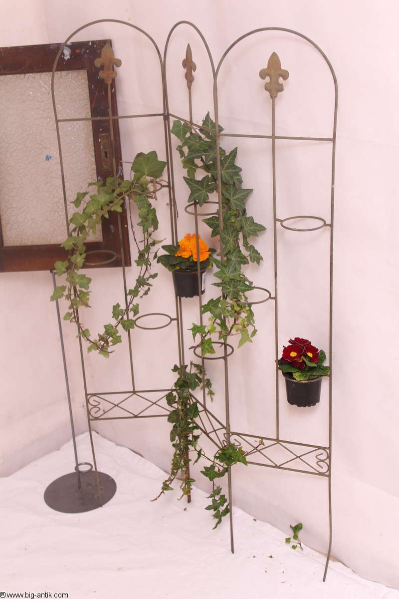 Angeboten wird ein wunderschönes Blumengitter / Pflanzengitter / Rankengitter / Gartendekoration / Gitter aus Metall. Das dreiteilig gestaltete Pflanzengitter ist zusammenklappbar und besitzt 9 Öffnungen zum Einsatz für Pflanztöpfe. Das formschöne Blumengitter weist einige Gebrauchsspuren auf u.a. Kratzer, Farbe verblast bzw. Rost, eine Seitenstange unten verbogen (siehe Bilder). Das Rankengitter eignet sich als zur Gartendekoration.