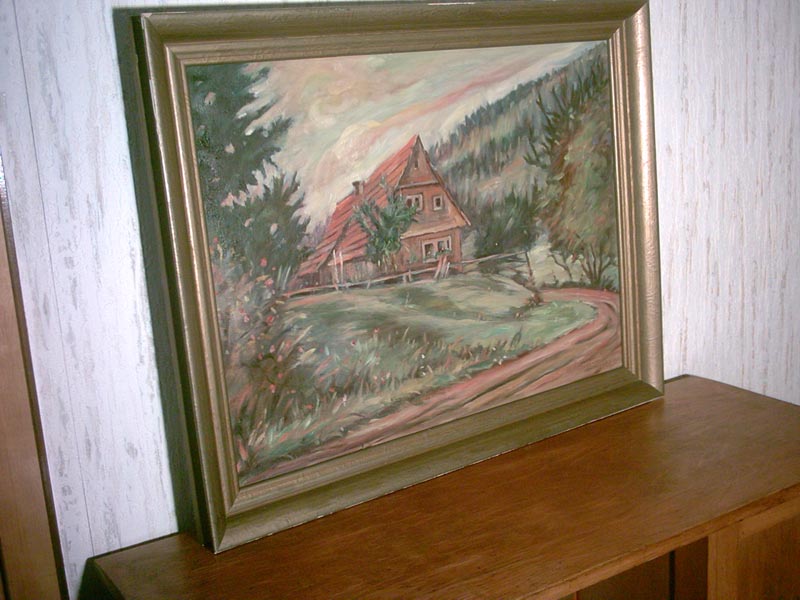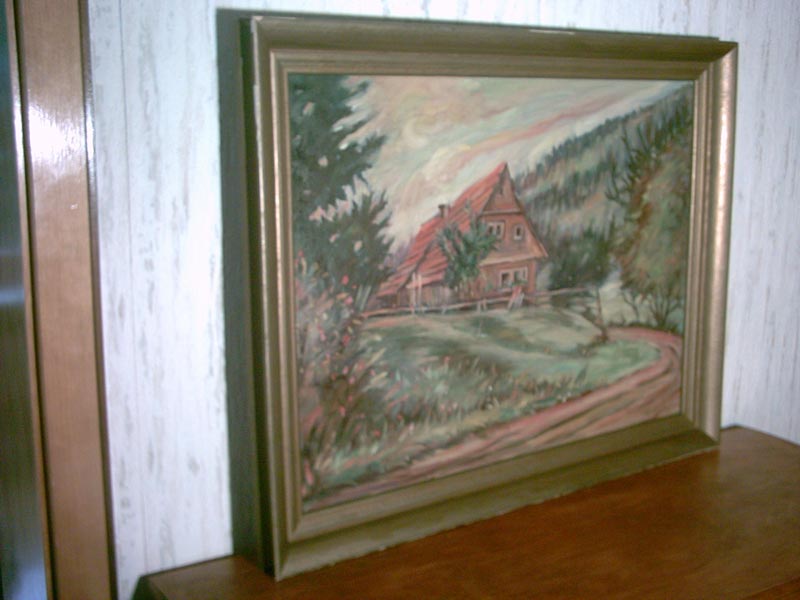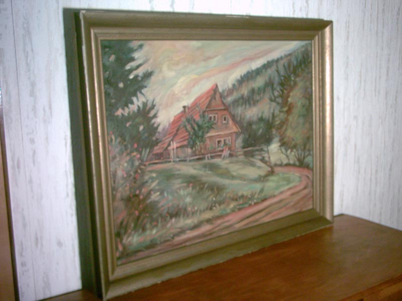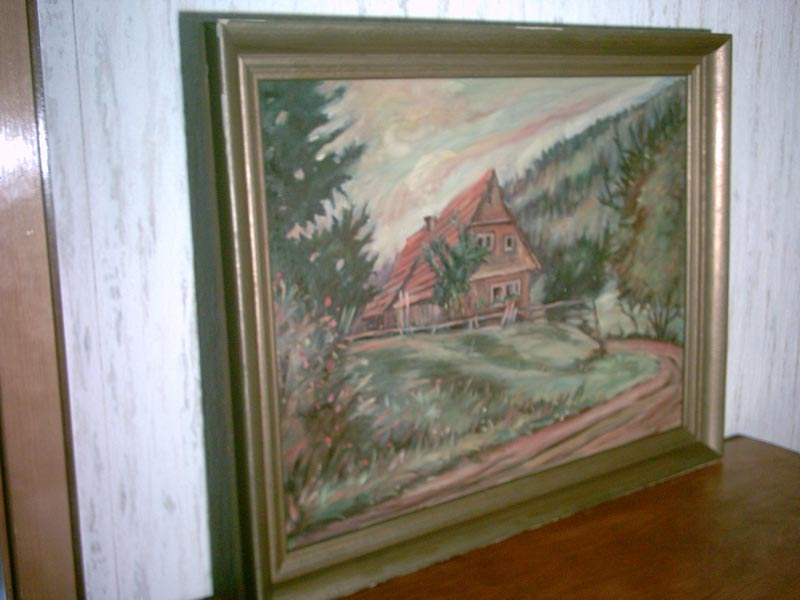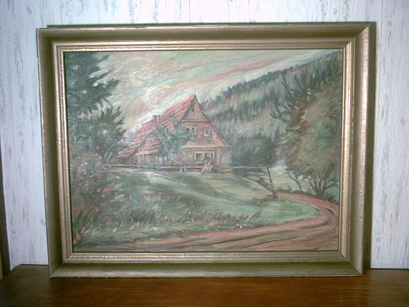 Angeboten wird ein großes Ölgemälde aus dem Jahr 1941, das ein Holzhaus am Rande eines Waldweges zeigt. Der Rahmen ist aus massivem Holz An den Rändern des Rahmens ist der Lack an ein paar Stellen abgeplatzt.