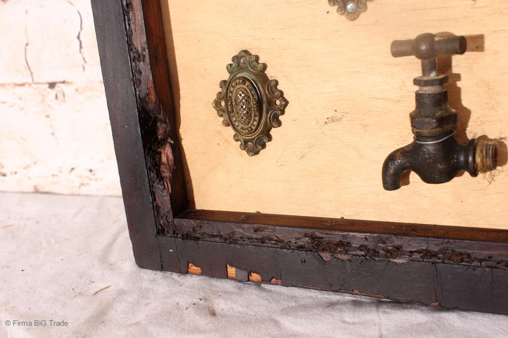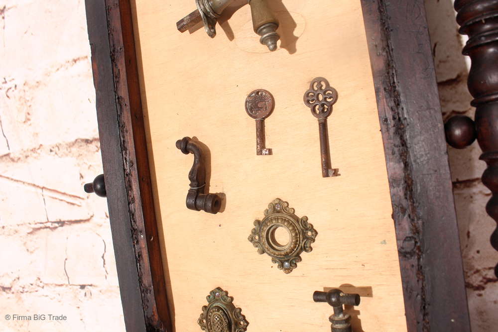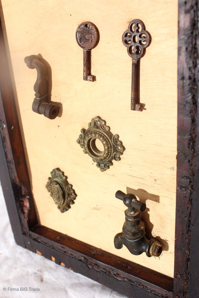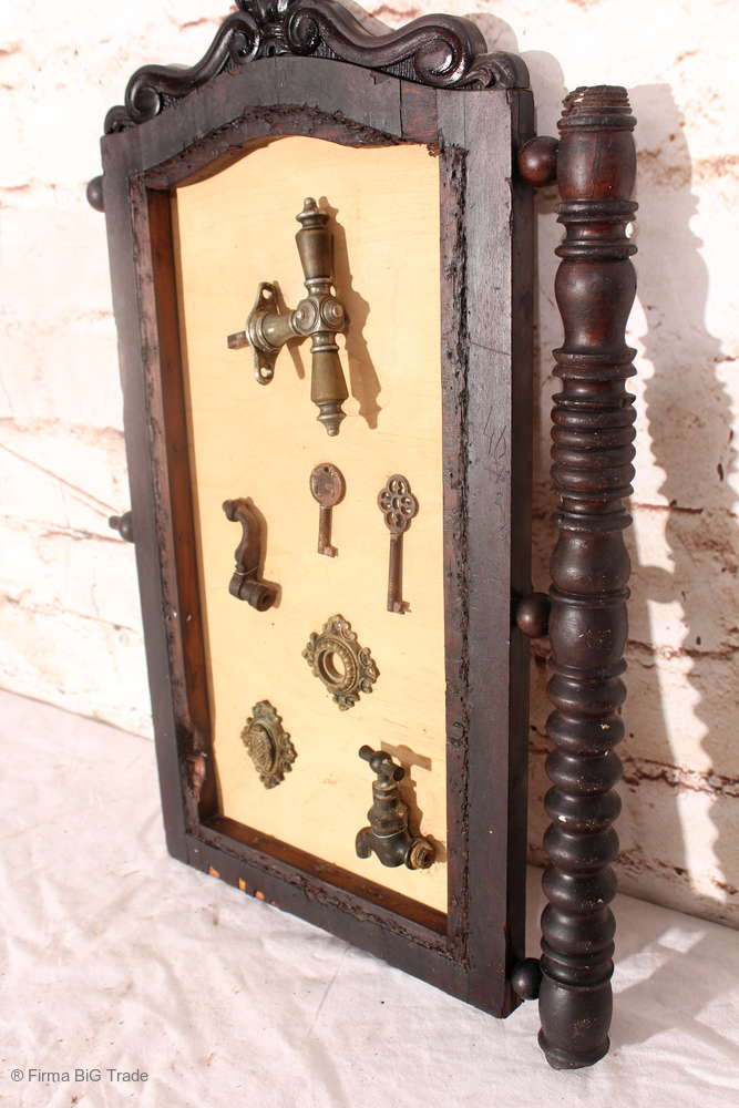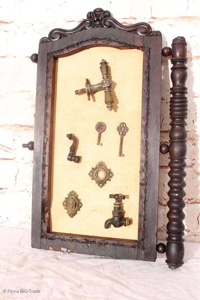 Angeboten wird ein ausgefallenes antikes Dekorationsstück bestehend aus einem antiken Holzrahmen mit einer Rückwand aus hellem Holz, auf der antike Griffe, Schlüssel, Wasserhahn und Beschläge angebracht wurden.