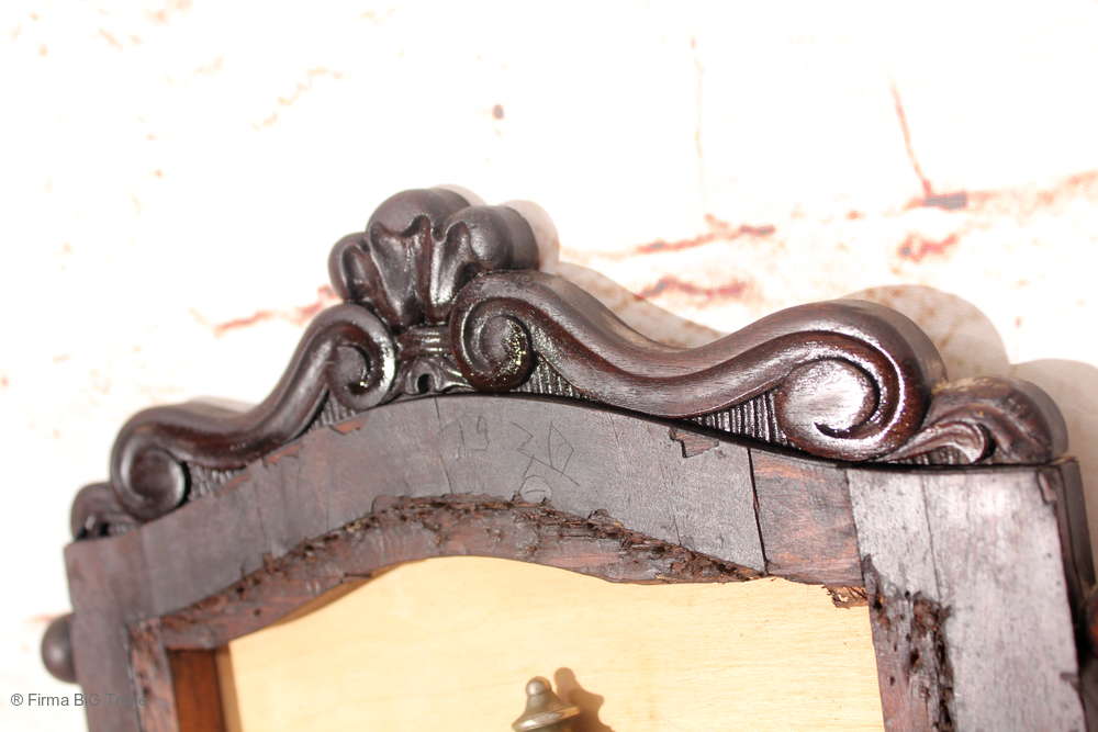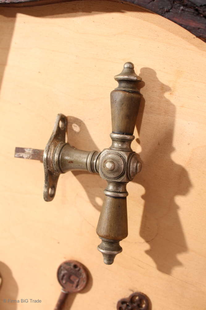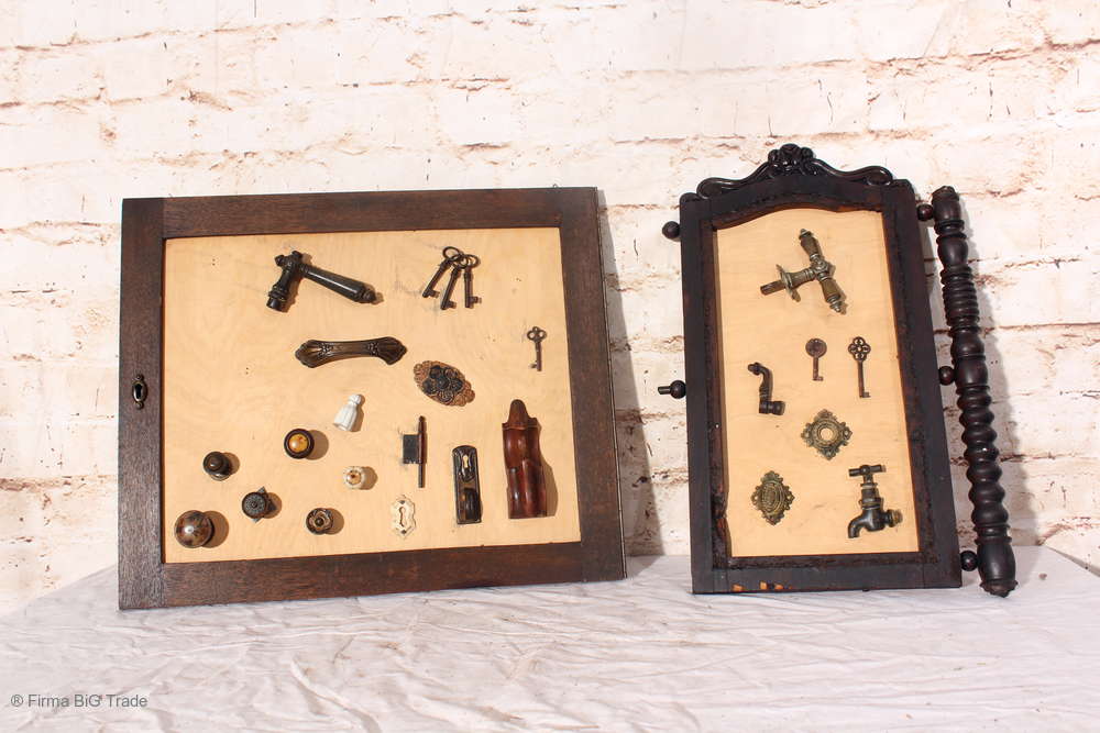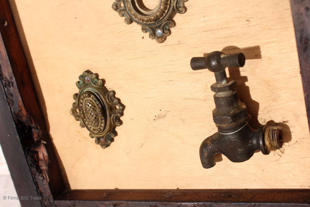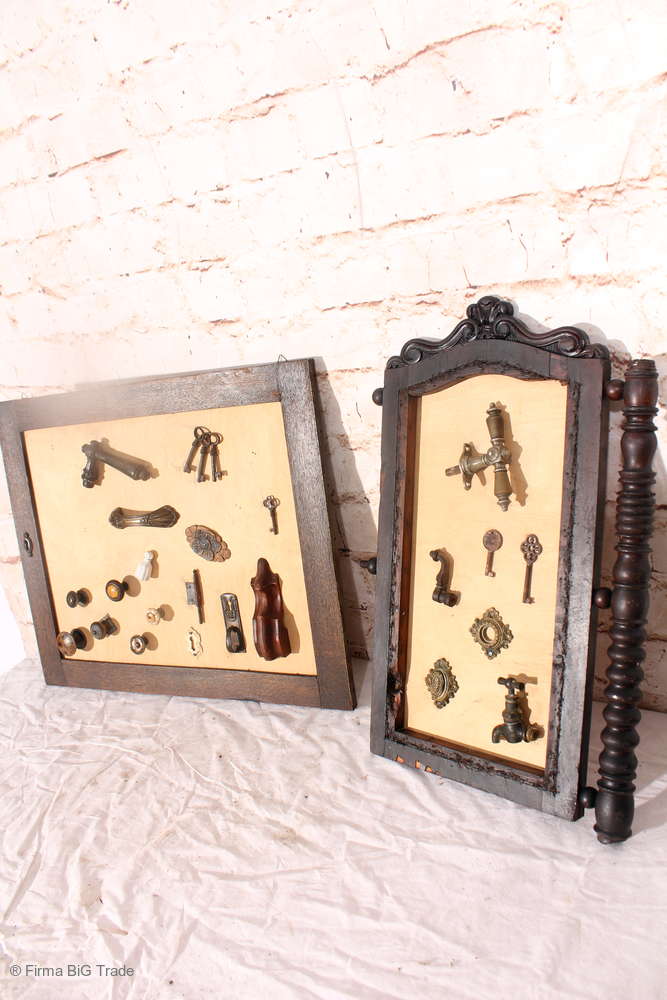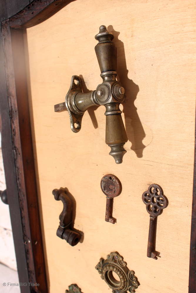 Angeboten wird ein ausgefallenes antikes Dekorationsstück bestehend aus einem antiken Holzrahmen mit einer Rückwand aus hellem Holz, auf der antike Griffe, Schlüssel, Wasserhahn und Beschläge angebracht wurden.