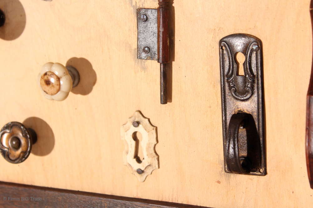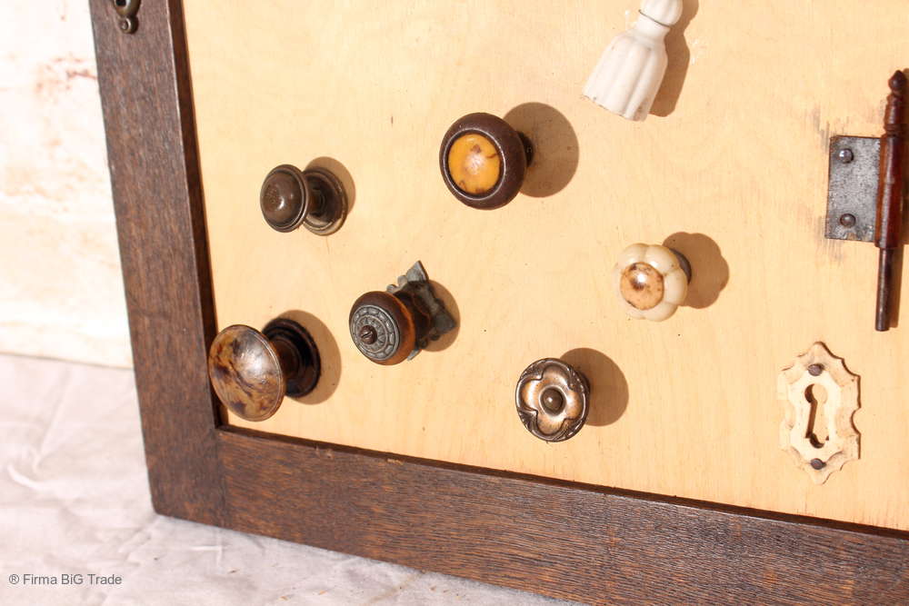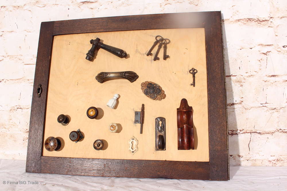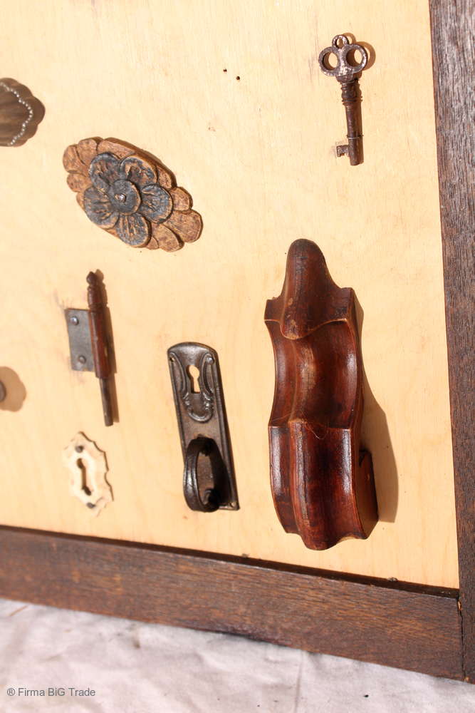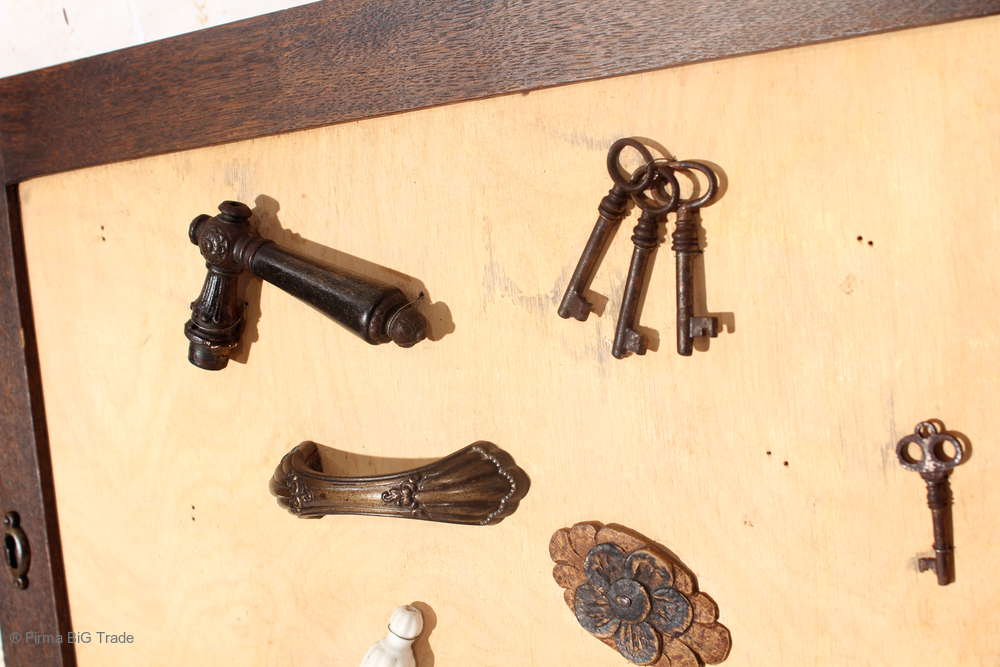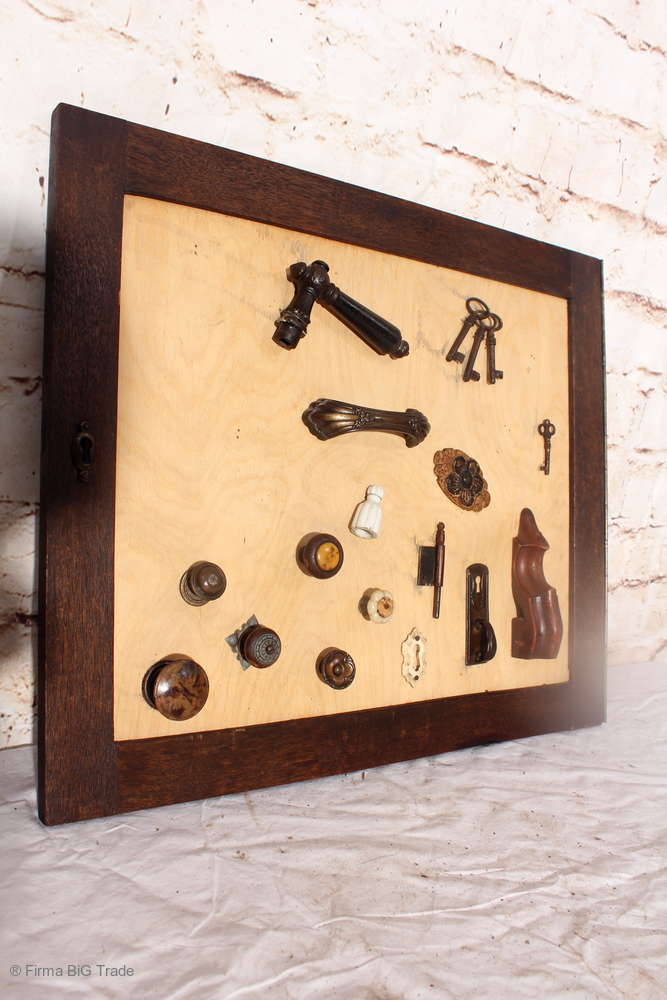Angeboten wird ein ausgefallenes antikes Dekorationsstück bestehend aus einem antiken Holzrahmen mit einer Rückwand aus hellem Holz, auf der antike Griffe, Knöpfe Schlüssel, und Beschläge angebracht wurden.