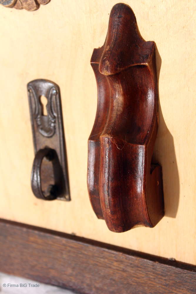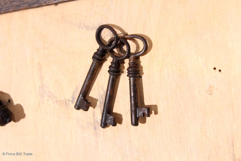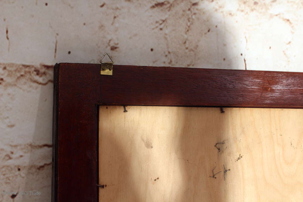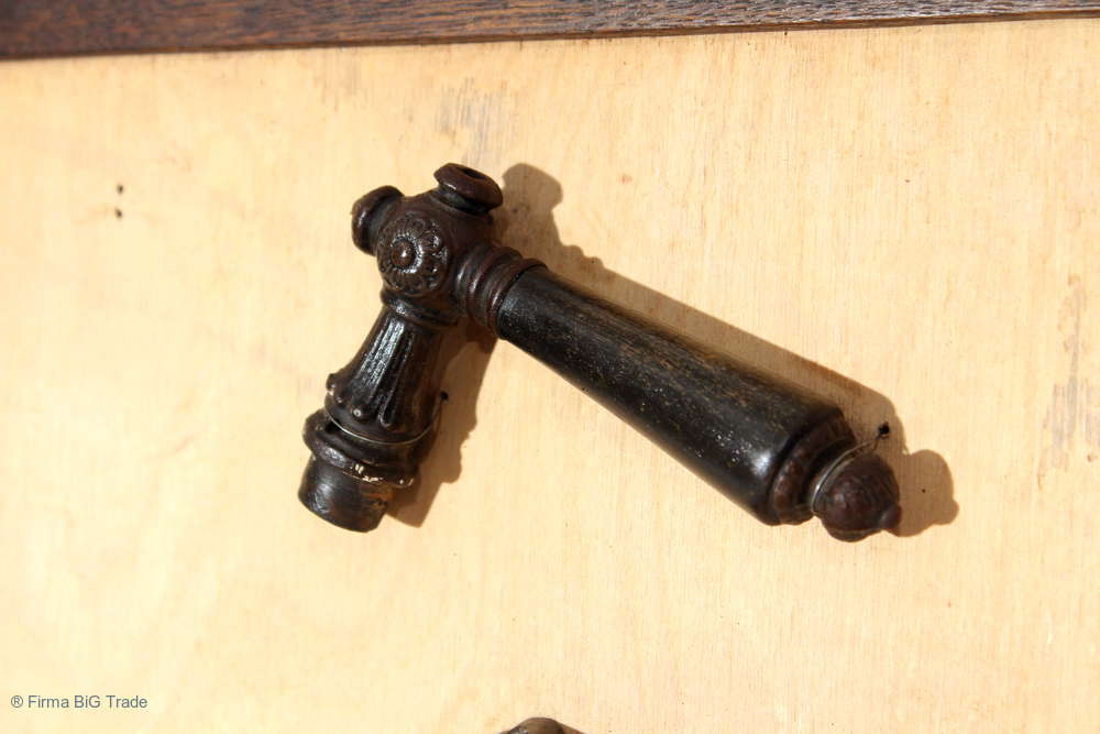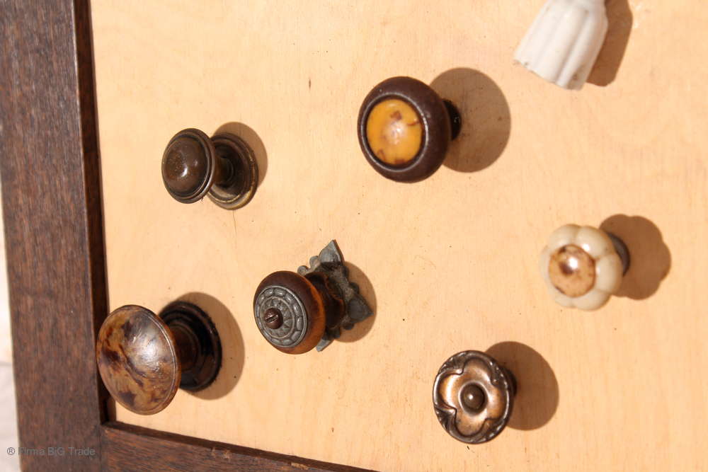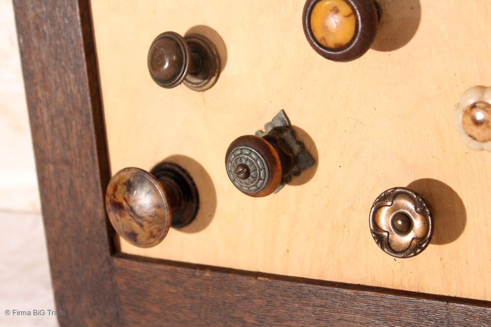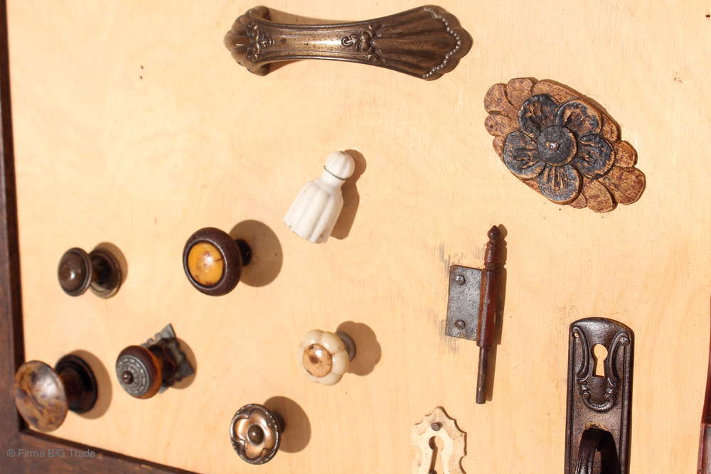 Angeboten wird ein ausgefallenes antikes Dekorationsstück bestehend aus einem antiken Holzrahmen mit einer Rückwand aus hellem Holz, auf der antike Griffe, Knöpfe Schlüssel, und Beschläge angebracht wurden.