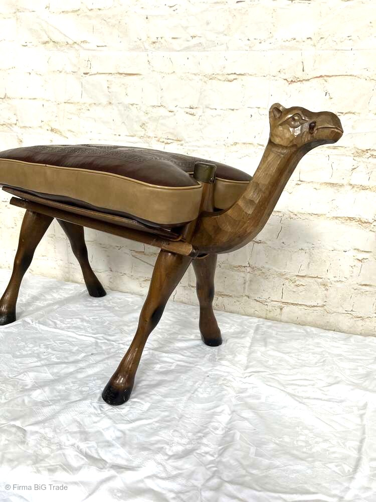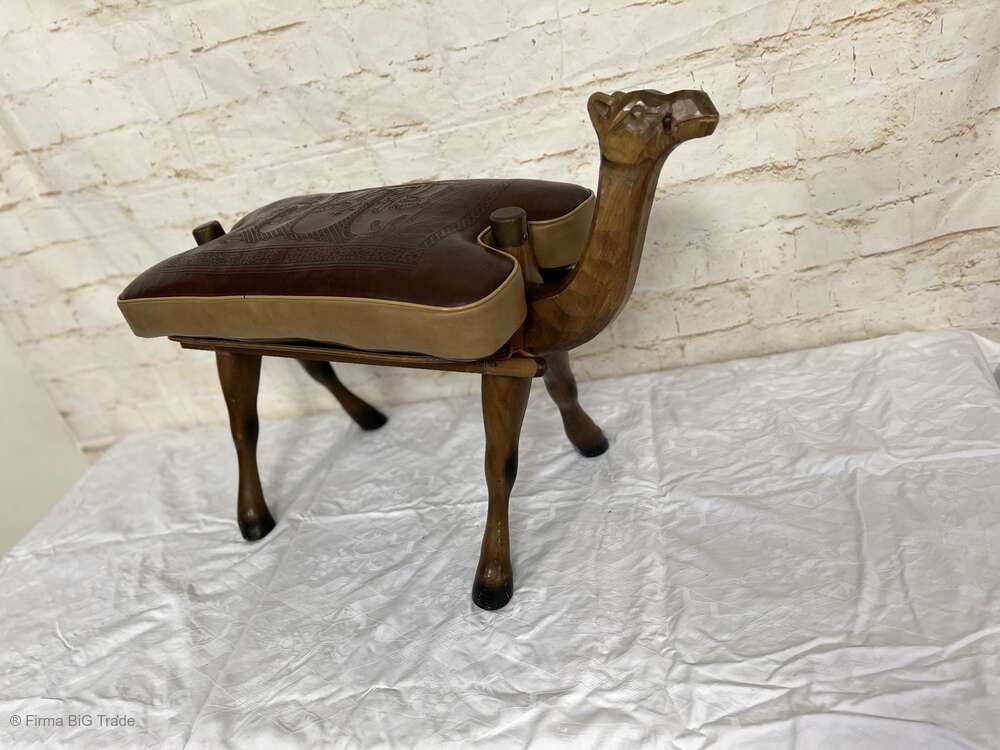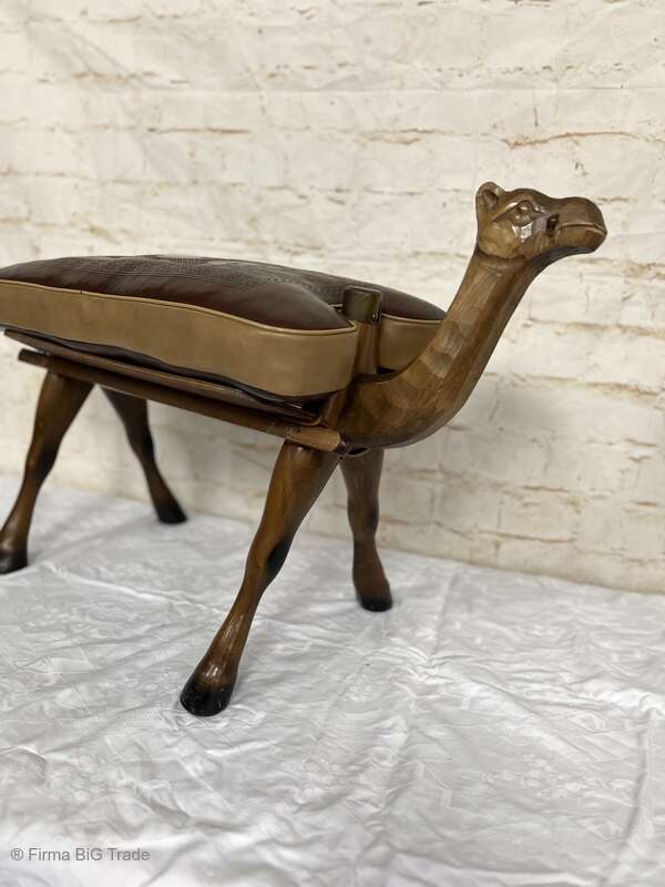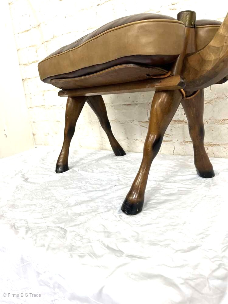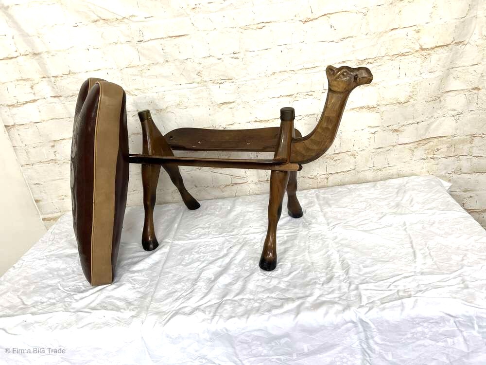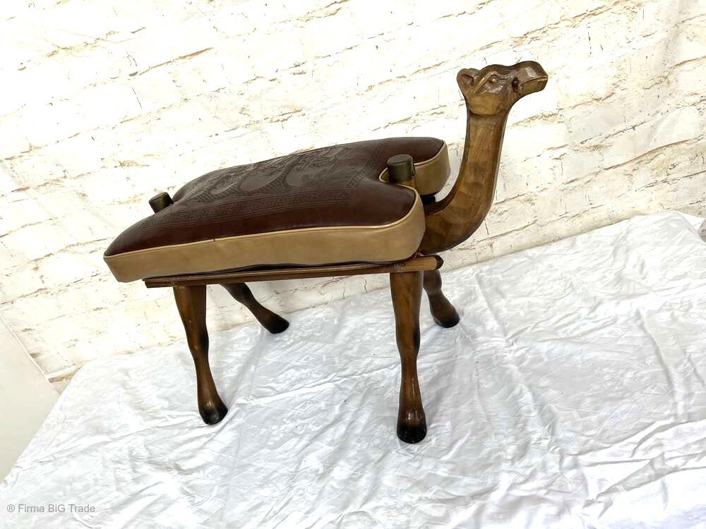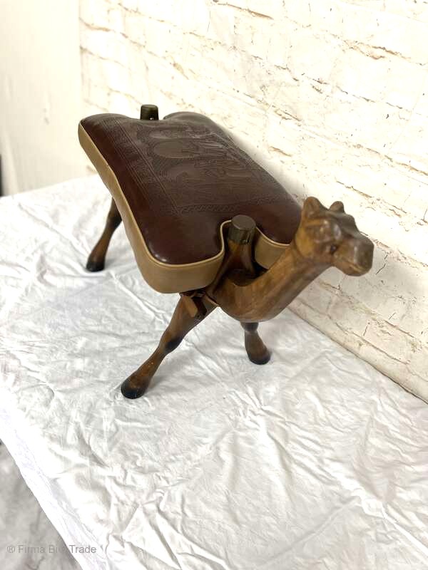 Angeboten wird ein wunderschöner orientalischer Hocker / Beduinenhocker / Sitzhocker / Fußhocker / Schaukelhocker / Schemel in toller Kamel-Form. Das Gestell ist aus Holz. Die Kamelkopf und die Beine sind schön geschnitzt. Die Sitzfläche besteht aus einem tollen Lederkissen. Am Holz sind Alters- und Gebrauchsspuren u.a. Risse, Kratzer vorhanden (siehe Bilder).