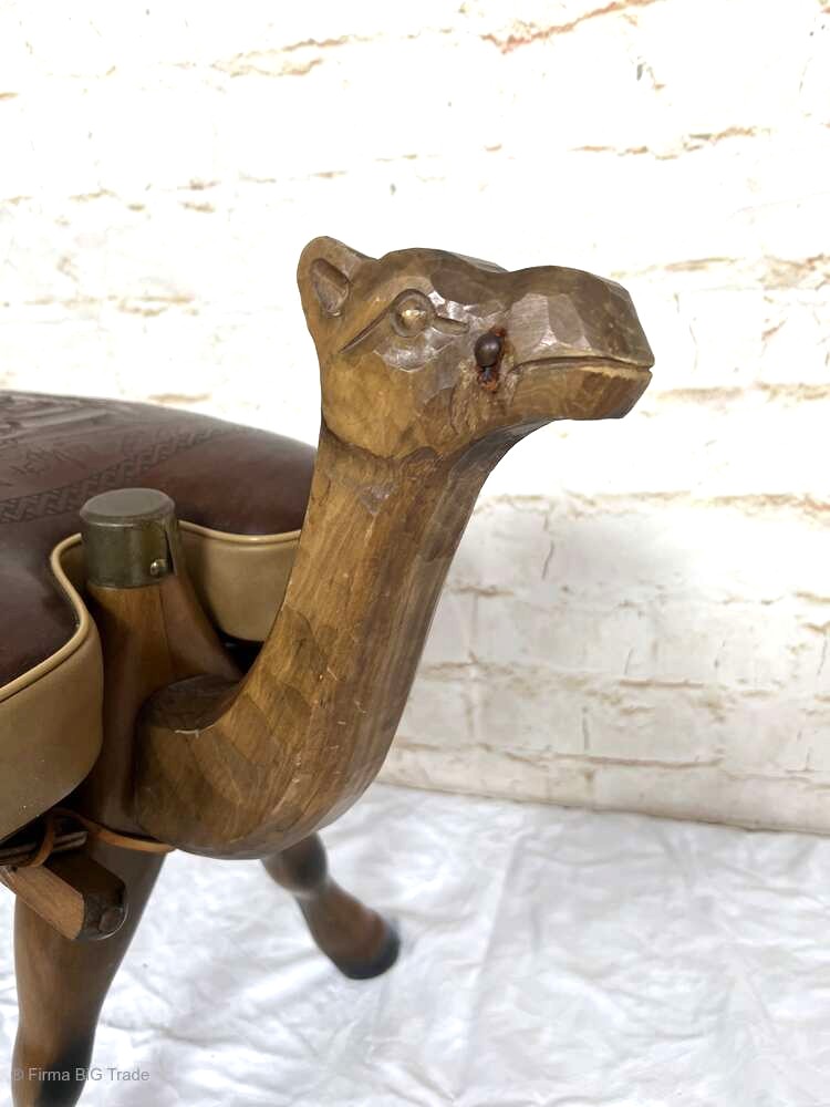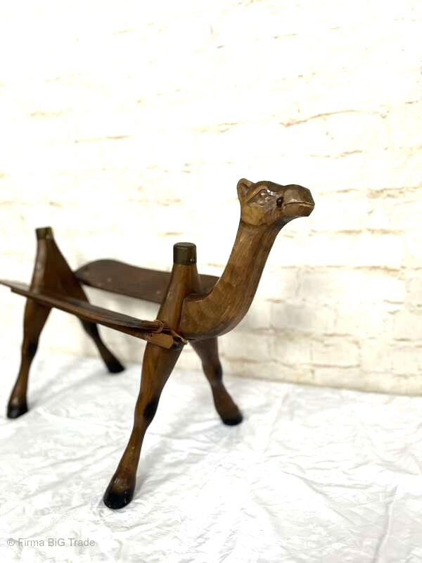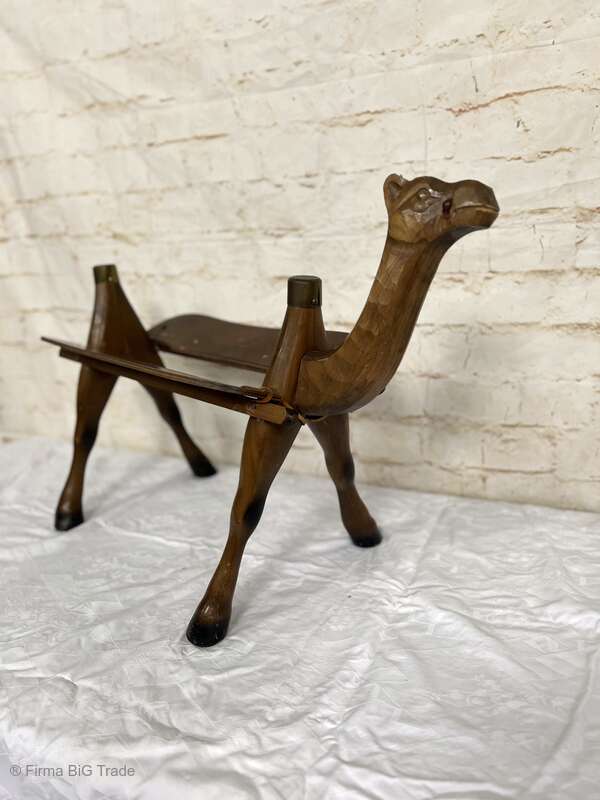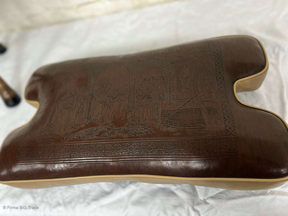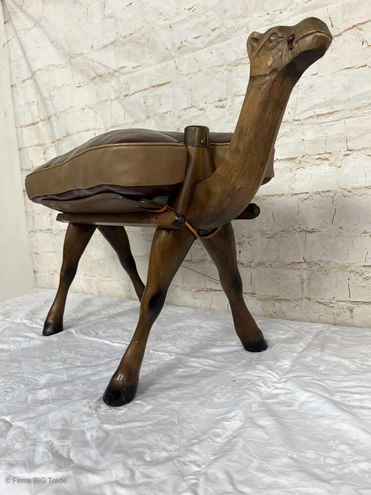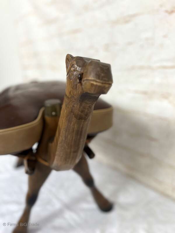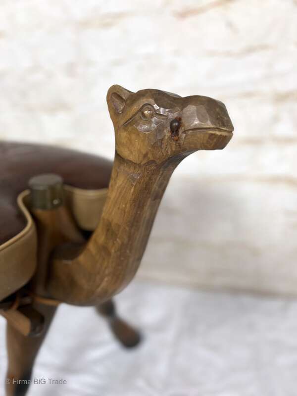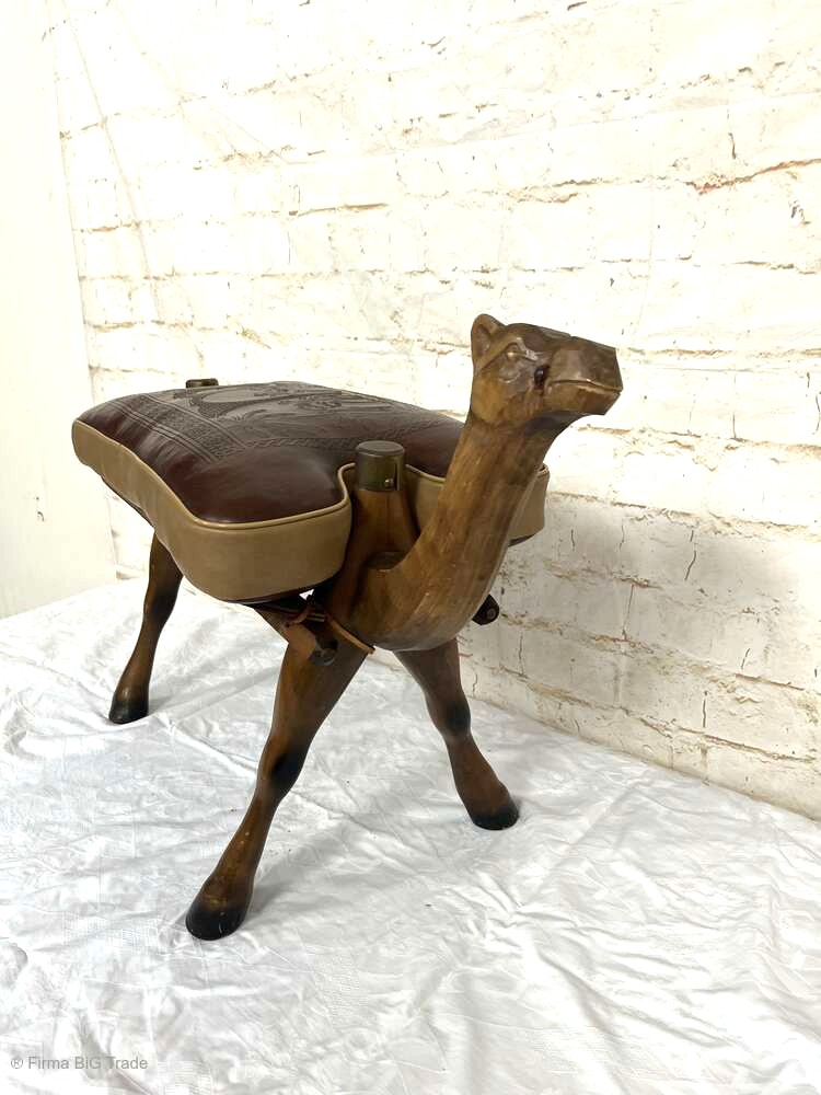 Angeboten wird ein wunderschöner orientalischer Hocker / Beduinenhocker / Sitzhocker / Fußhocker / Schaukelhocker / Schemel in toller Kamel-Form. Das Gestell ist aus Holz. Die Kamelkopf und die Beine sind schön geschnitzt. Die Sitzfläche besteht aus einem tollen Lederkissen. Am Holz sind Alters- und Gebrauchsspuren u.a. Risse, Kratzer vorhanden (siehe Bilder).