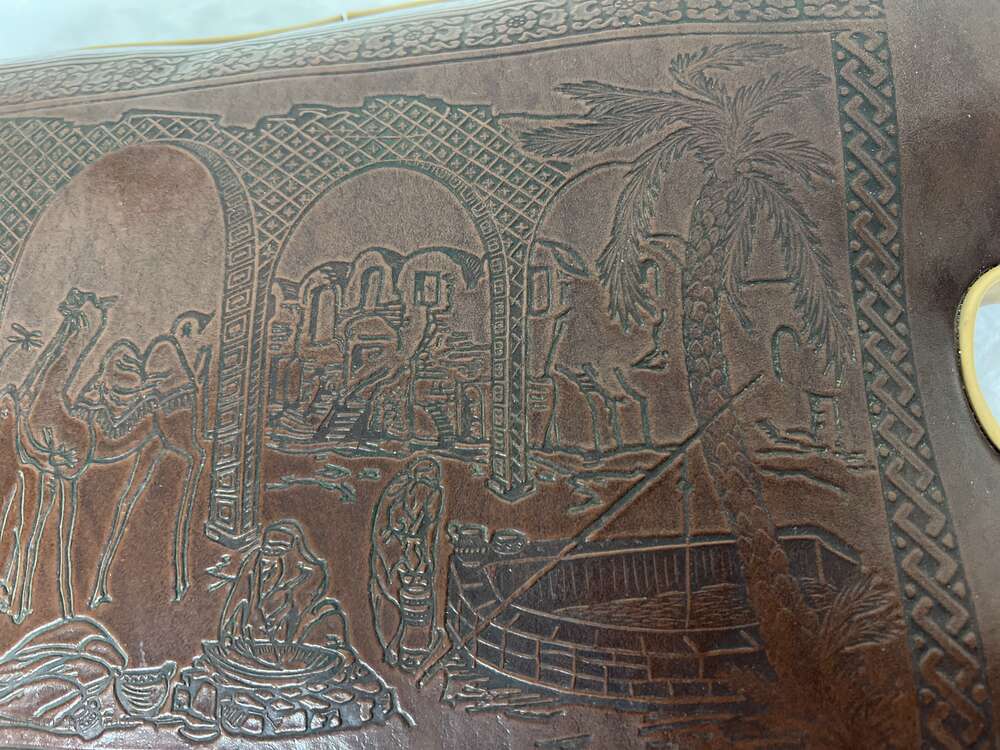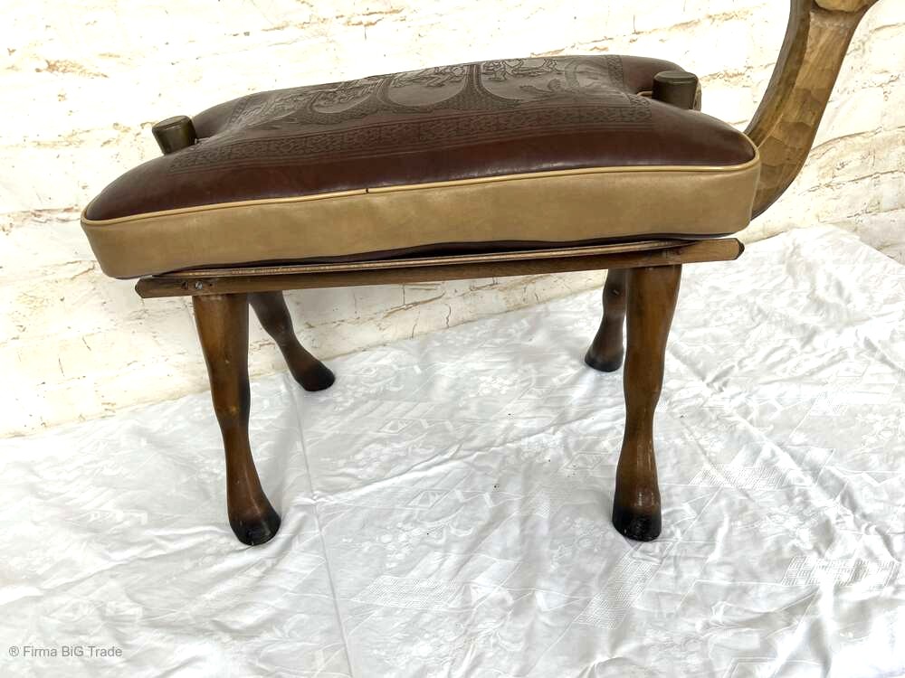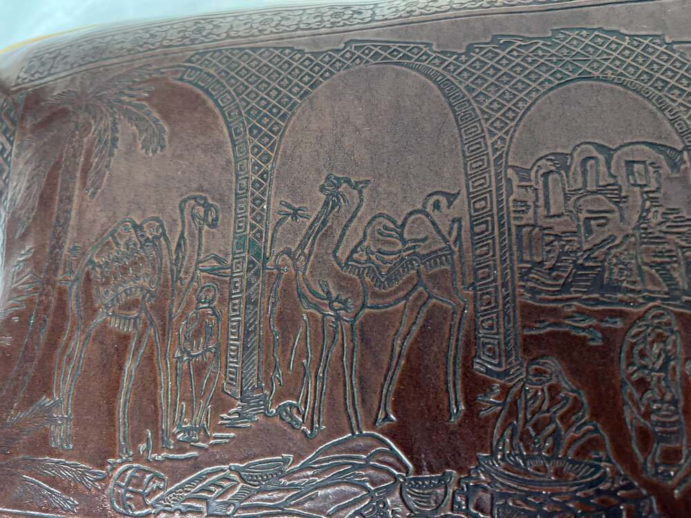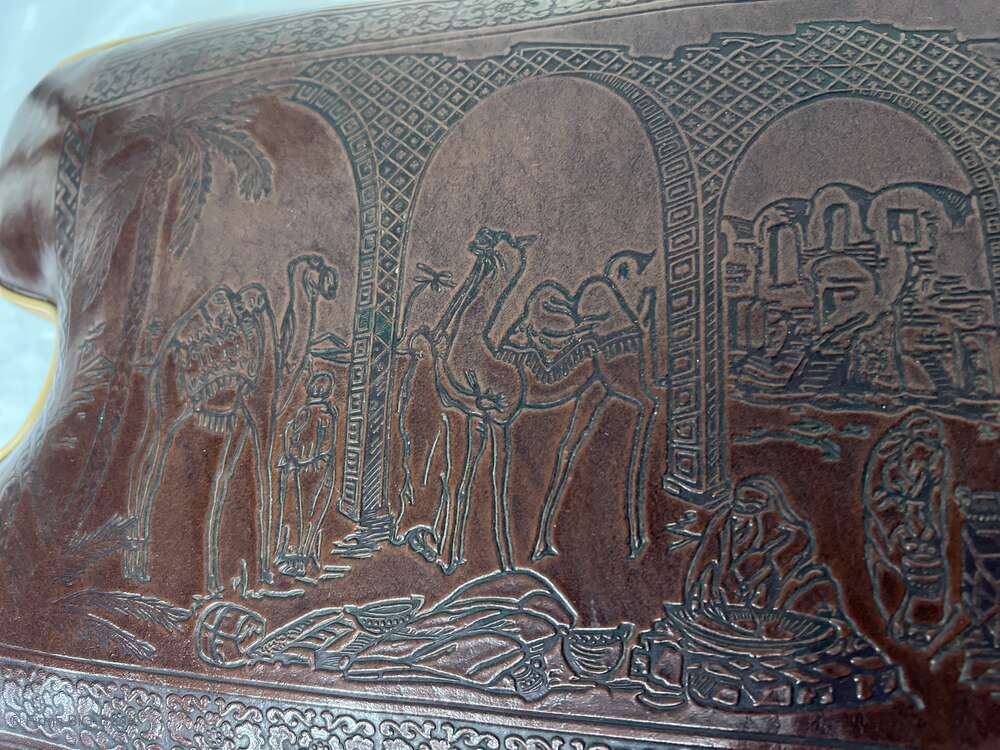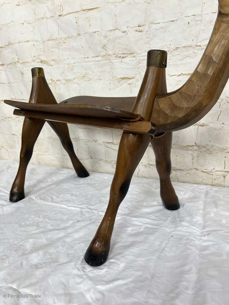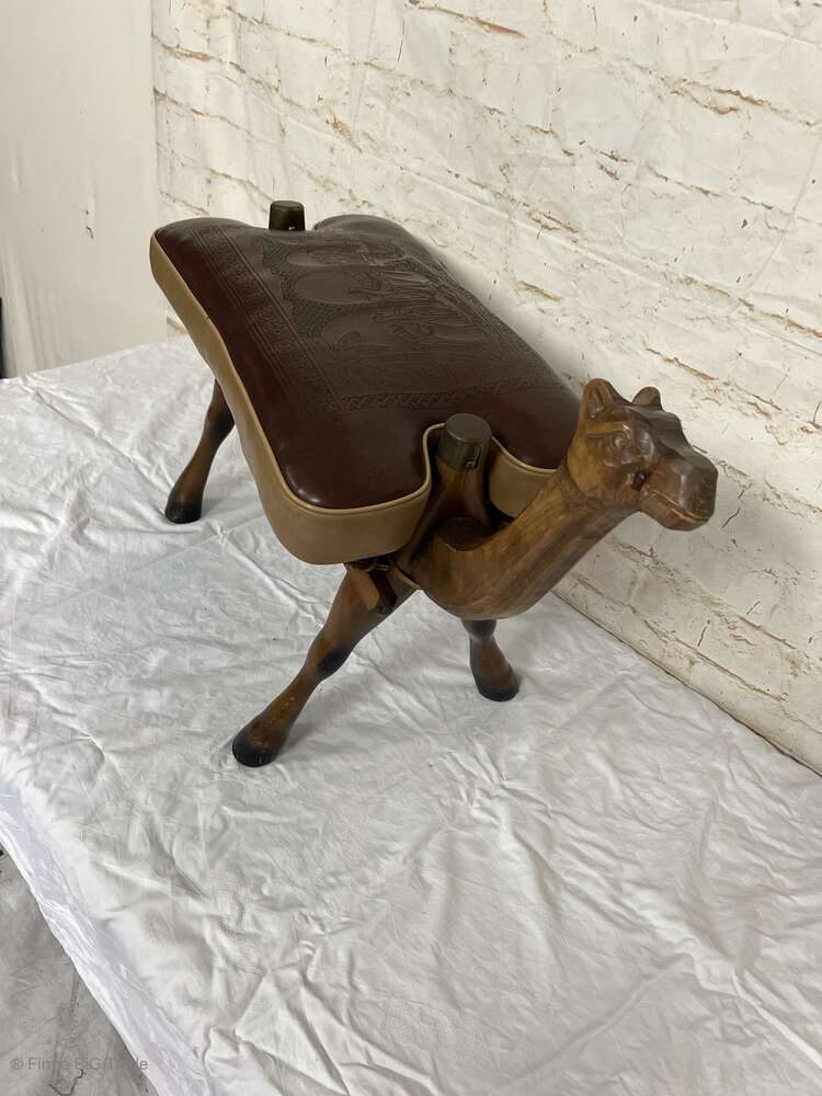 Angeboten wird ein wunderschöner orientalischer Hocker / Beduinenhocker / Sitzhocker / Fußhocker / Schaukelhocker / Schemel in toller Kamel-Form. Das Gestell ist aus Holz. Die Kamelkopf und die Beine sind schön geschnitzt. Die Sitzfläche besteht aus einem tollen Lederkissen. Am Holz sind Alters- und Gebrauchsspuren u.a. Risse, Kratzer vorhanden (siehe Bilder).