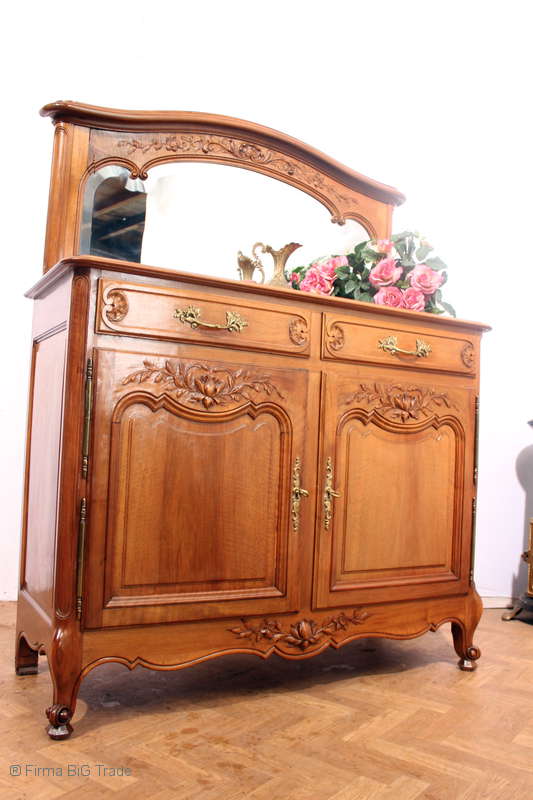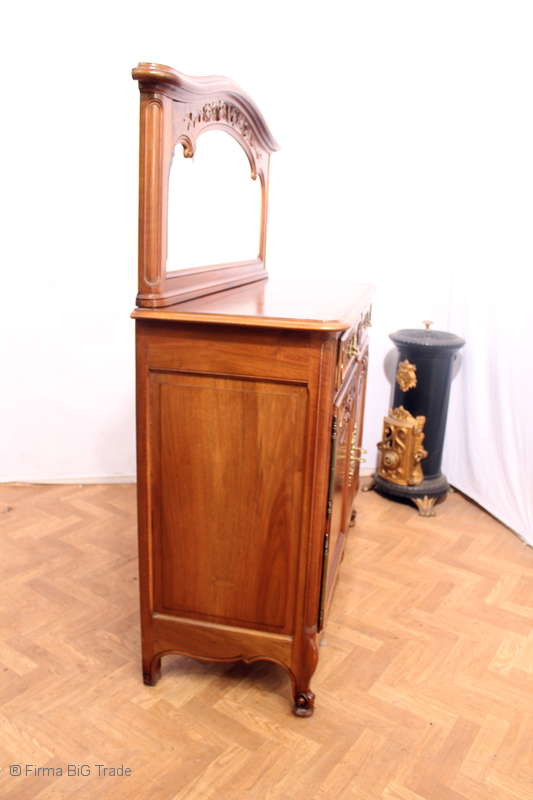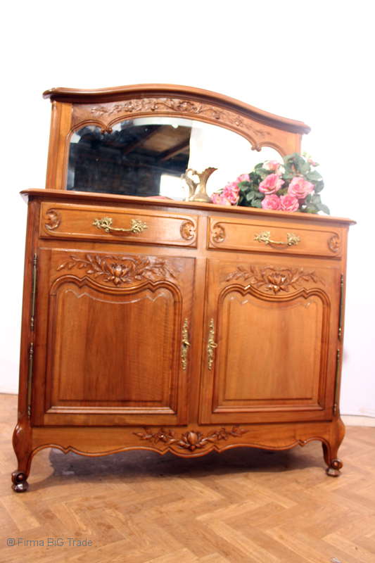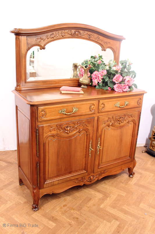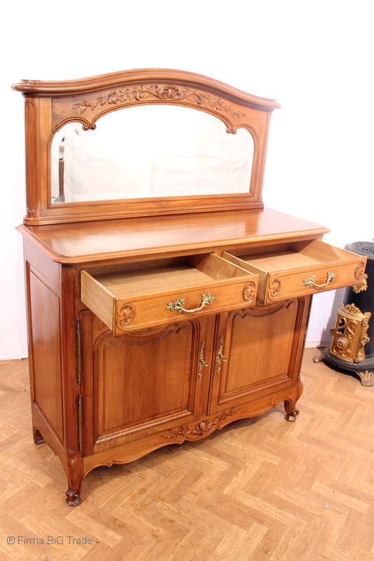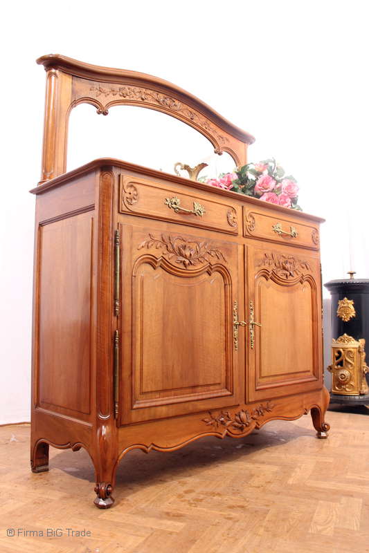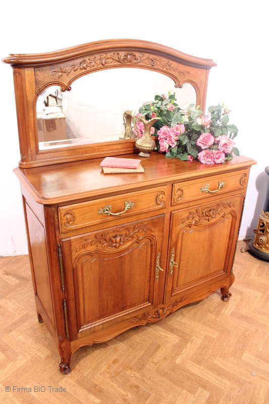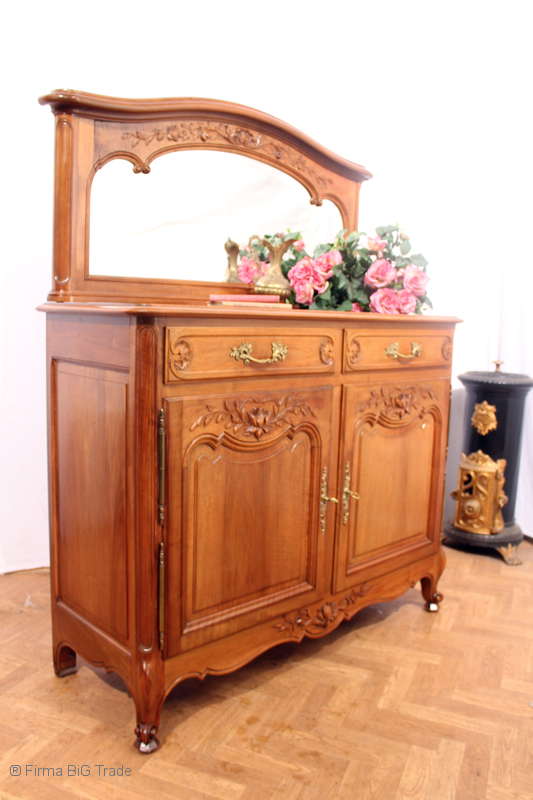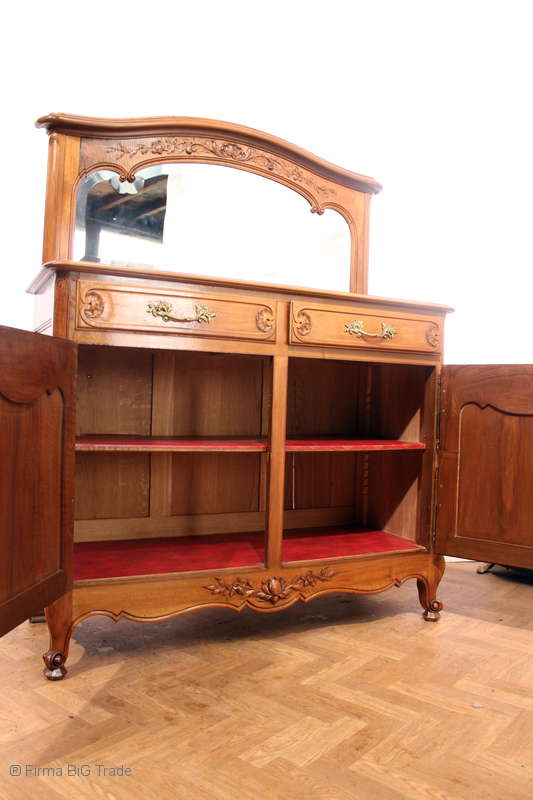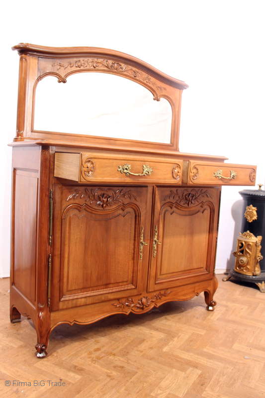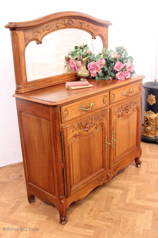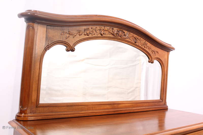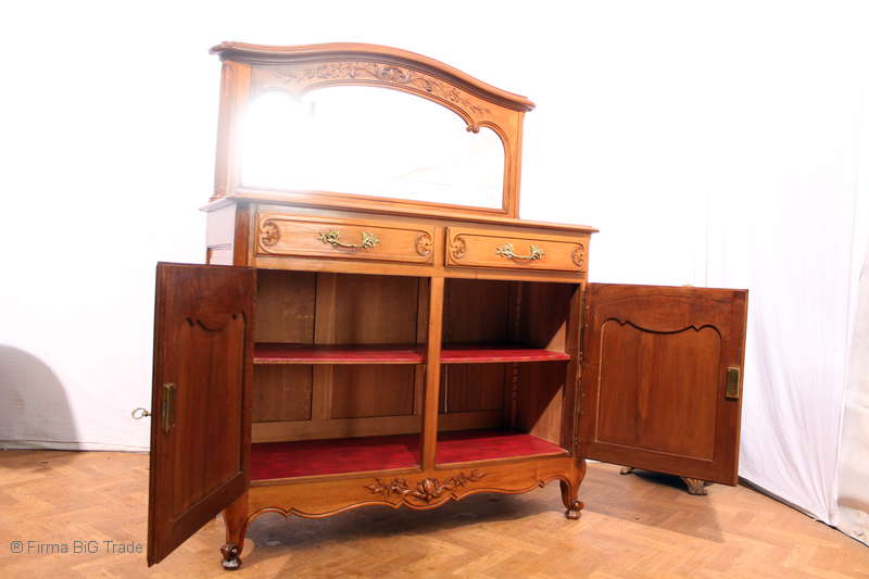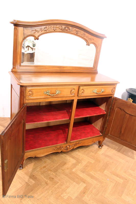 Angeboten wird ein zauberhafter antiker Jugendstil Wohnzimmerschrank / Kredenz / Kommode / Anrichte / Aufsatzschrank aus massivem Eichenholz. Der schöne Schrank besitzt zwei Schubladen darunter im Schrankberiech mit zwei Flügeltüren eine durchgehende Einlageplatte. Die Schubladen und Türen sind meisterlich geschnitzt und mit schweren Metallbeschlägen verziert. Ein breiter bogenförmiger Spiegel mit eleganten Schnitzereien rundet das Bild ab. Die Füße der Kommode wurden in englischen Chippendale Stil geschwungen gestaltet und ebenfalls schön geschnitzt. Der Boden und die Einlageplatte wurden mit einer roten Folie belegt. Der antike Schrank weist hier und da Alters- und Gebrauchsspuren auf u.a. kleine Spannungsrisse am linken oberen Spiegelrahmen (siehe Bilder), befindet sich dennoch in einem guten Zustand. 2 Schlüssel liegen bei.
