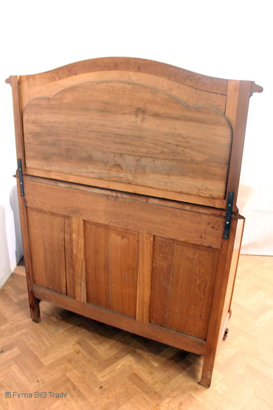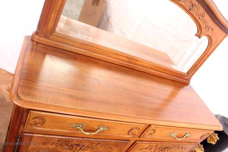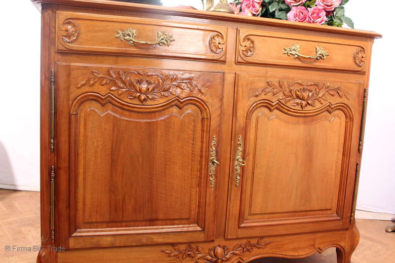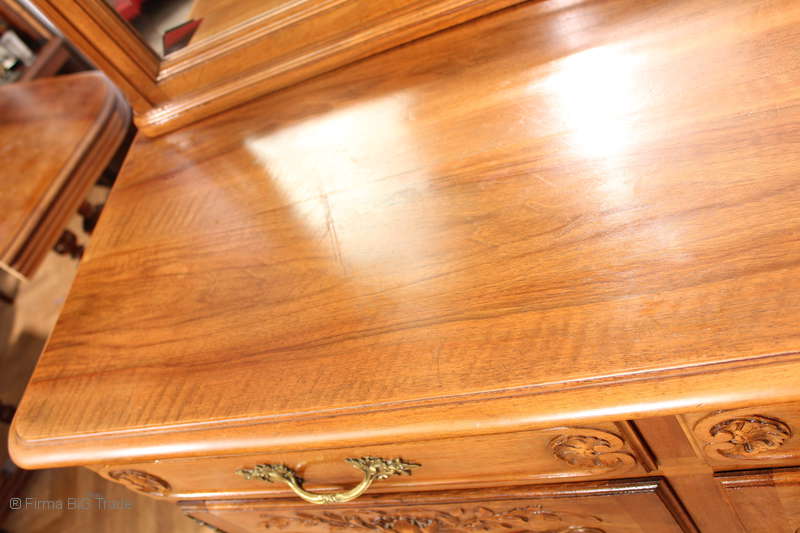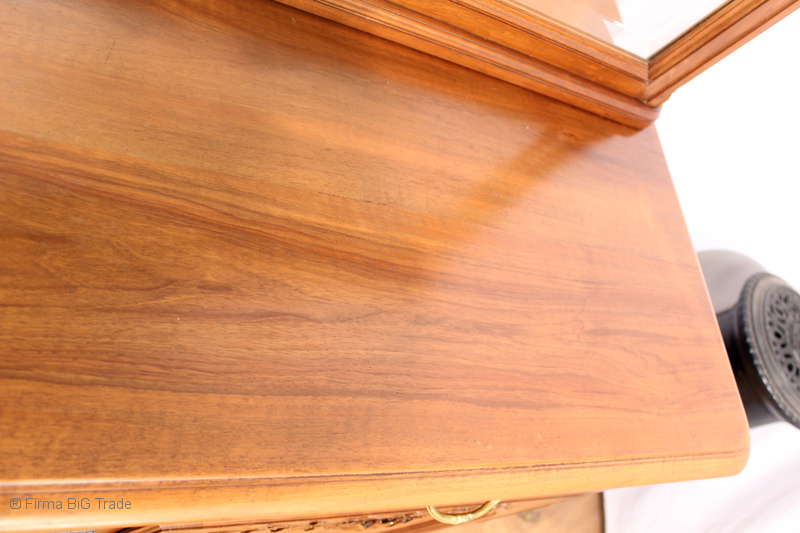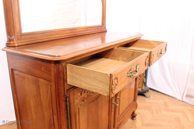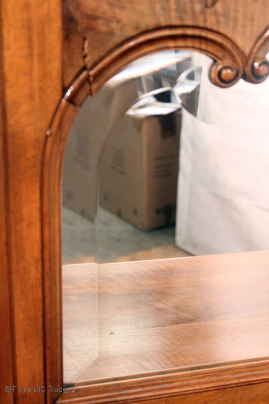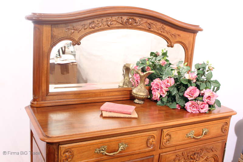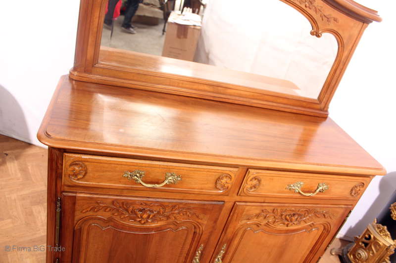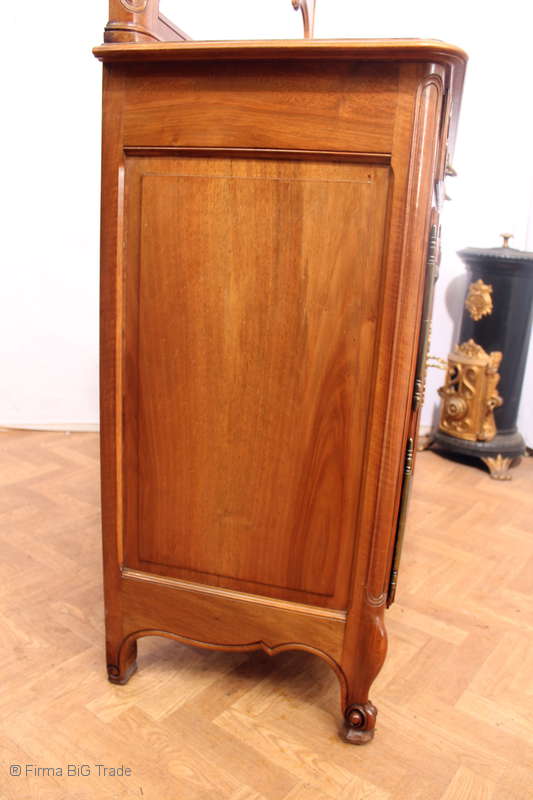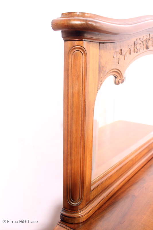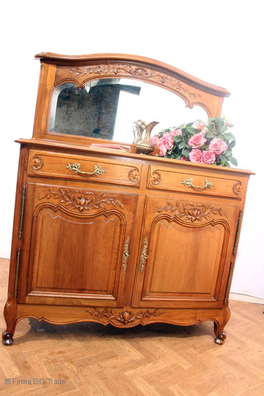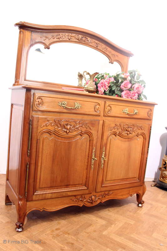 Angeboten wird ein zauberhafter antiker Jugendstil Wohnzimmerschrank / Kredenz / Kommode / Anrichte / Aufsatzschrank aus massivem Eichenholz. Der schöne Schrank besitzt zwei Schubladen darunter im Schrankberiech mit zwei Flügeltüren eine durchgehende Einlageplatte. Die Schubladen und Türen sind meisterlich geschnitzt und mit schweren Metallbeschlägen verziert. Ein breiter bogenförmiger Spiegel mit eleganten Schnitzereien rundet das Bild ab. Die Füße der Kommode wurden in englischen Chippendale Stil geschwungen gestaltet und ebenfalls schön geschnitzt. Der Boden und die Einlageplatte wurden mit einer roten Folie belegt. Der antike Schrank weist hier und da Alters- und Gebrauchsspuren auf u.a. kleine Spannungsrisse am linken oberen Spiegelrahmen (siehe Bilder), befindet sich dennoch in einem guten Zustand. 2 Schlüssel liegen bei.
