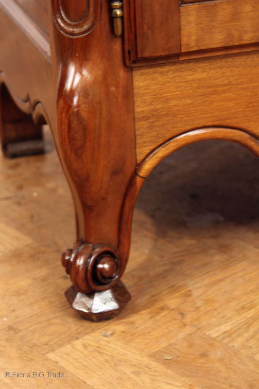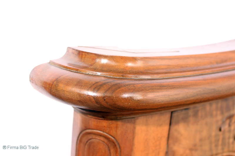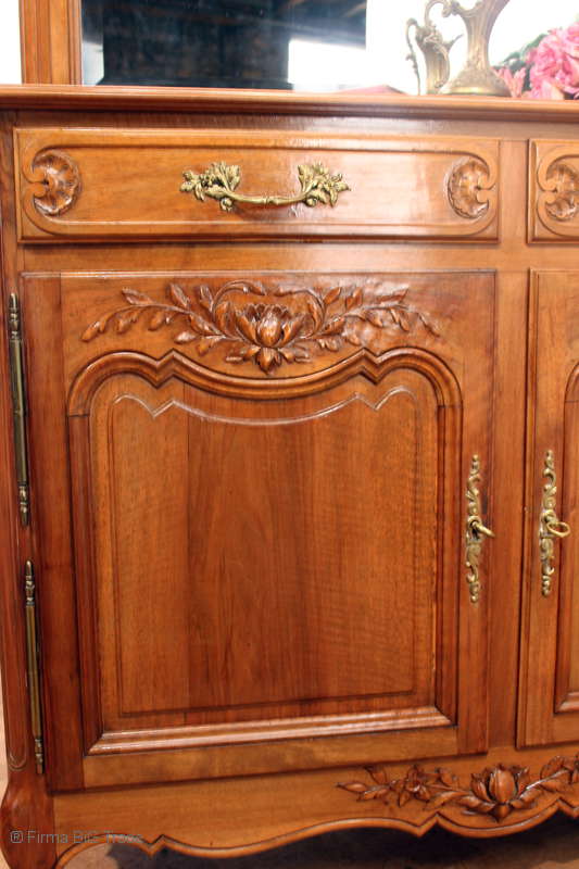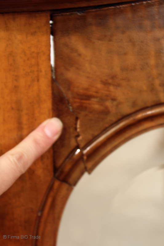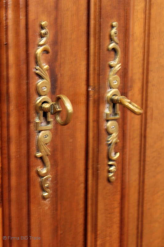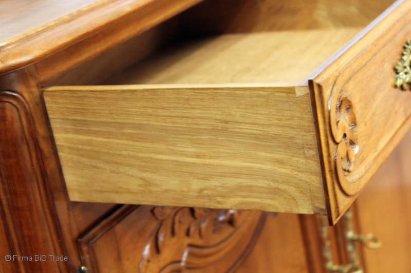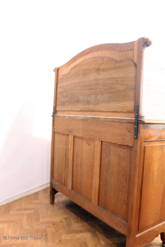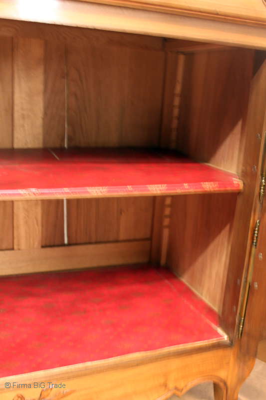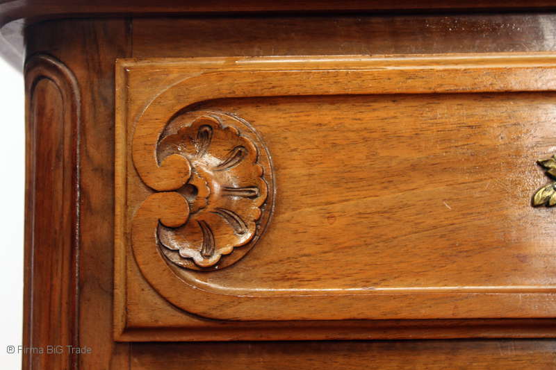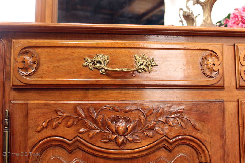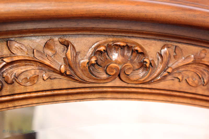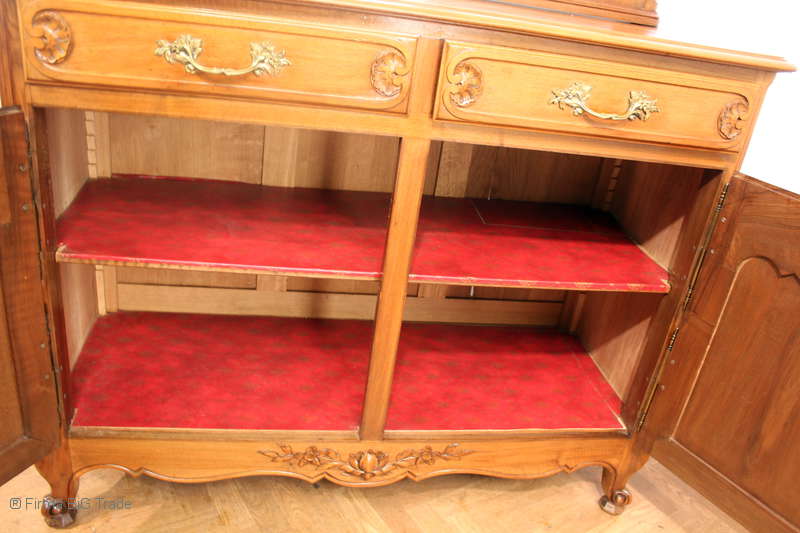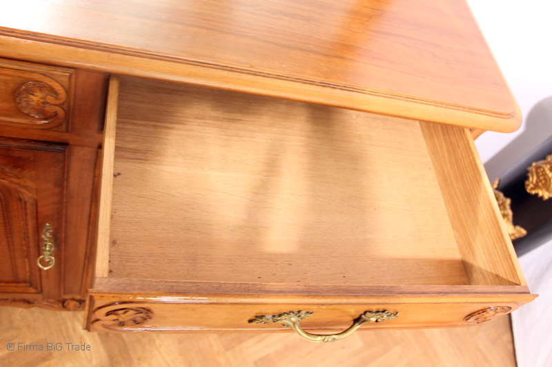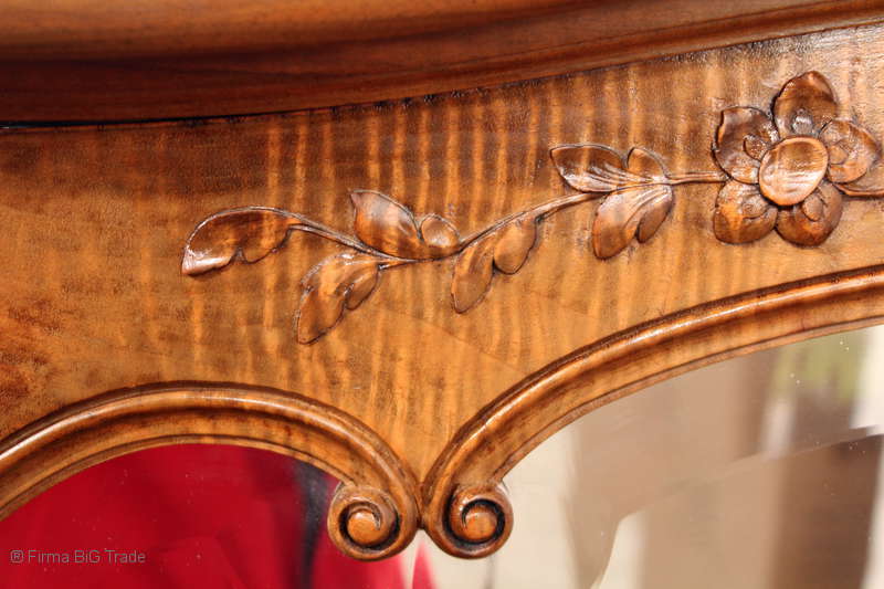 Angeboten wird ein zauberhafter antiker Jugendstil Wohnzimmerschrank / Kredenz / Kommode / Anrichte / Aufsatzschrank aus massivem Eichenholz. Der schöne Schrank besitzt zwei Schubladen darunter im Schrankberiech mit zwei Flügeltüren eine durchgehende Einlageplatte. Die Schubladen und Türen sind meisterlich geschnitzt und mit schweren Metallbeschlägen verziert. Ein breiter bogenförmiger Spiegel mit eleganten Schnitzereien rundet das Bild ab. Die Füße der Kommode wurden in englischen Chippendale Stil geschwungen gestaltet und ebenfalls schön geschnitzt. Der Boden und die Einlageplatte wurden mit einer roten Folie belegt. Der antike Schrank weist hier und da Alters- und Gebrauchsspuren auf u.a. kleine Spannungsrisse am linken oberen Spiegelrahmen (siehe Bilder), befindet sich dennoch in einem guten Zustand. 2 Schlüssel liegen bei.