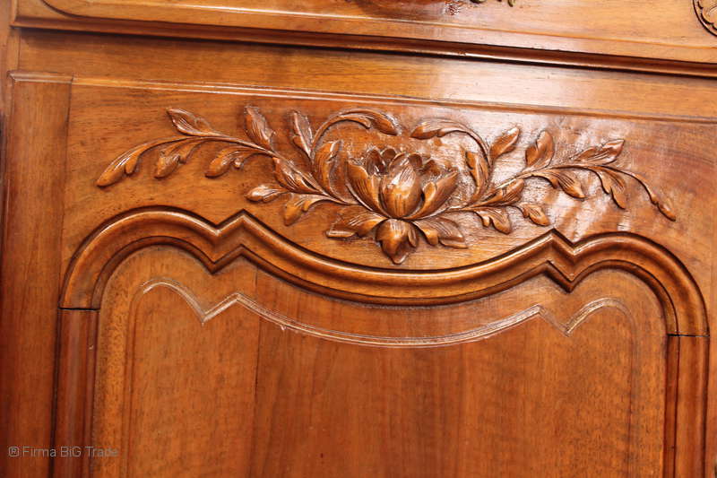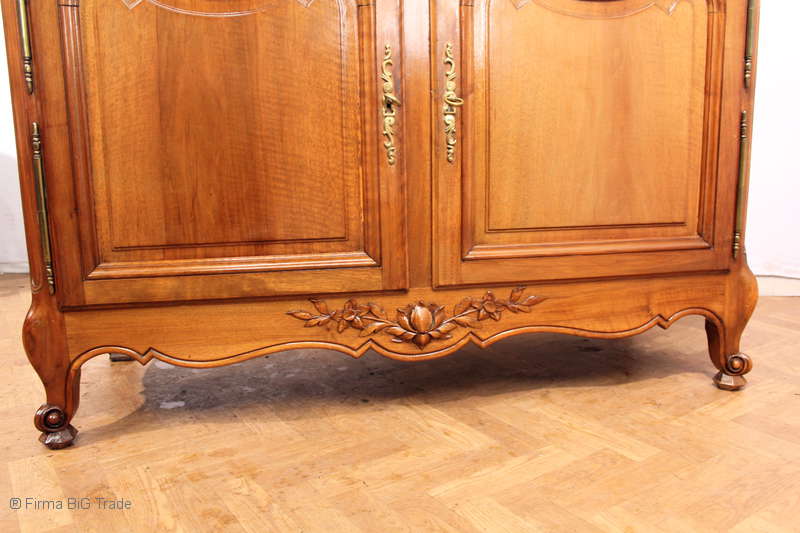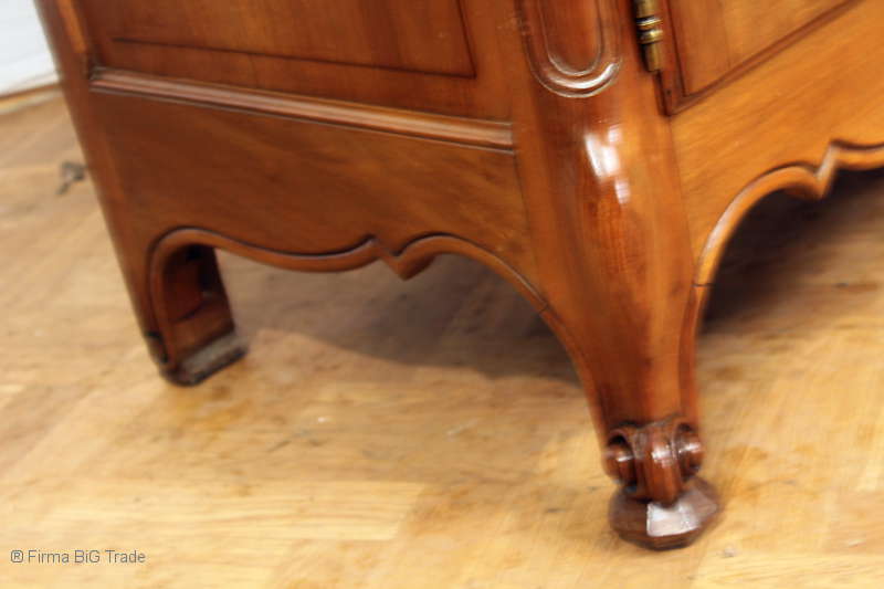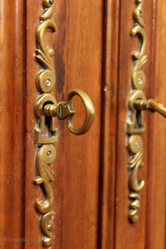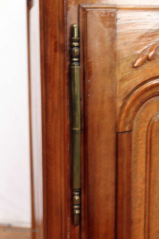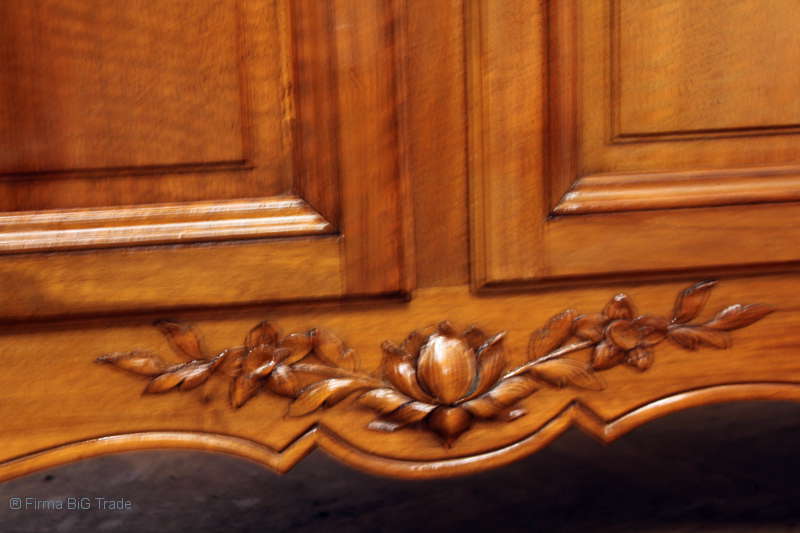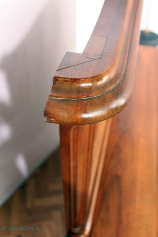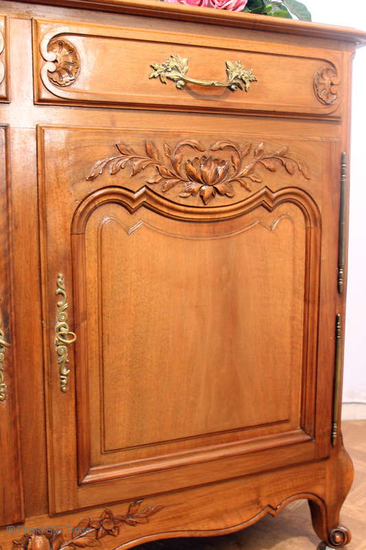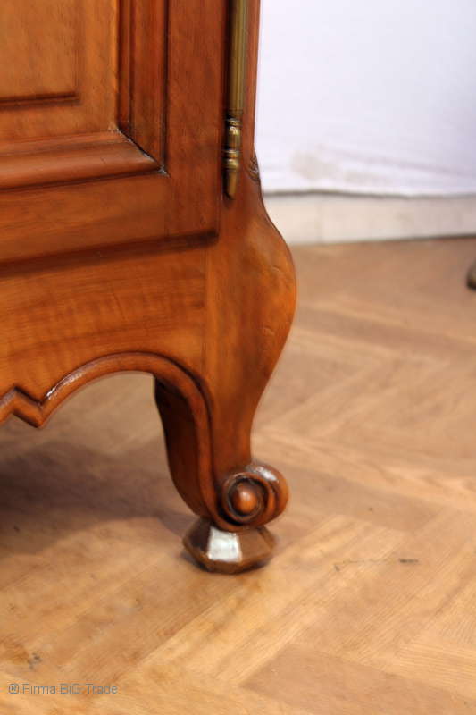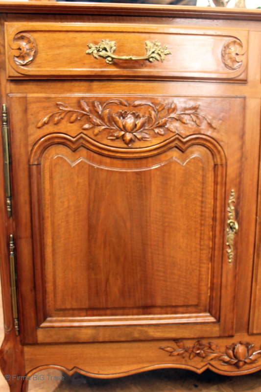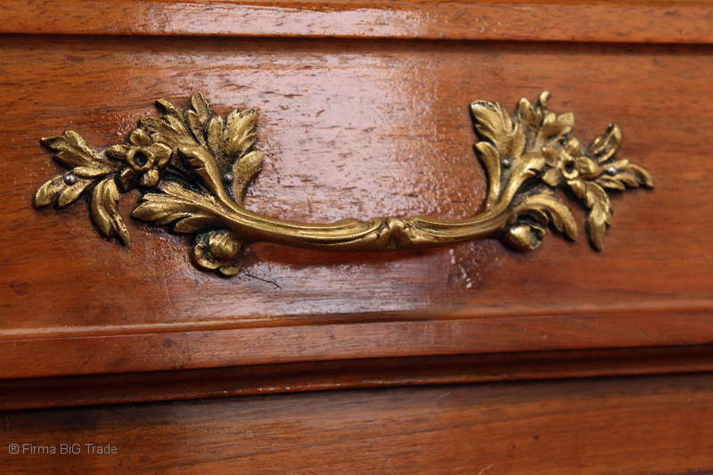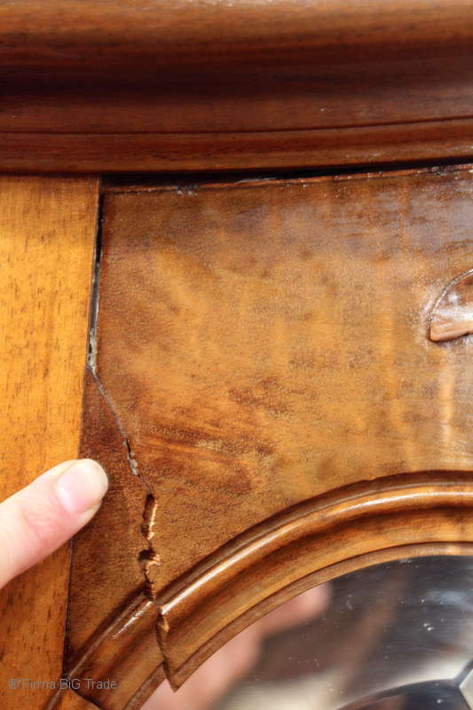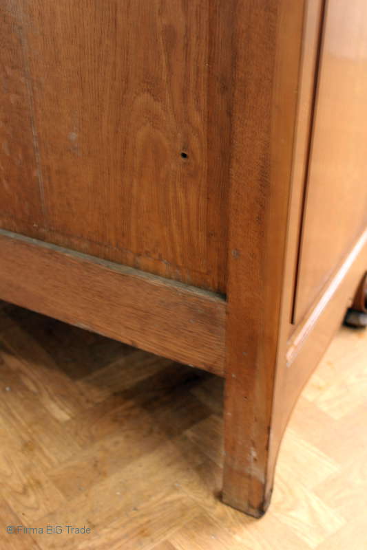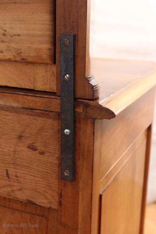 Angeboten wird ein zauberhafter antiker Jugendstil Wohnzimmerschrank / Kredenz / Kommode / Anrichte / Aufsatzschrank aus massivem Eichenholz. Der schöne Schrank besitzt zwei Schubladen darunter im Schrankberiech mit zwei Flügeltüren eine durchgehende Einlageplatte. Die Schubladen und Türen sind meisterlich geschnitzt und mit schweren Metallbeschlägen verziert. Ein breiter bogenförmiger Spiegel mit eleganten Schnitzereien rundet das Bild ab. Die Füße der Kommode wurden in englischen Chippendale Stil geschwungen gestaltet und ebenfalls schön geschnitzt. Der Boden und die Einlageplatte wurden mit einer roten Folie belegt. Der antike Schrank weist hier und da Alters- und Gebrauchsspuren auf u.a. kleine Spannungsrisse am linken oberen Spiegelrahmen (siehe Bilder), befindet sich dennoch in einem guten Zustand. 2 Schlüssel liegen bei.