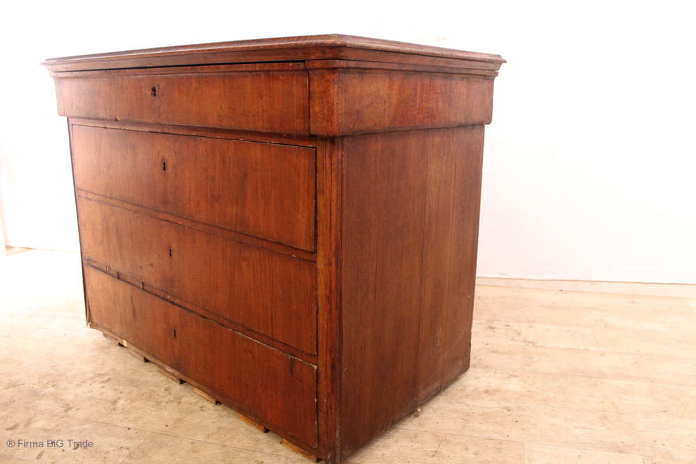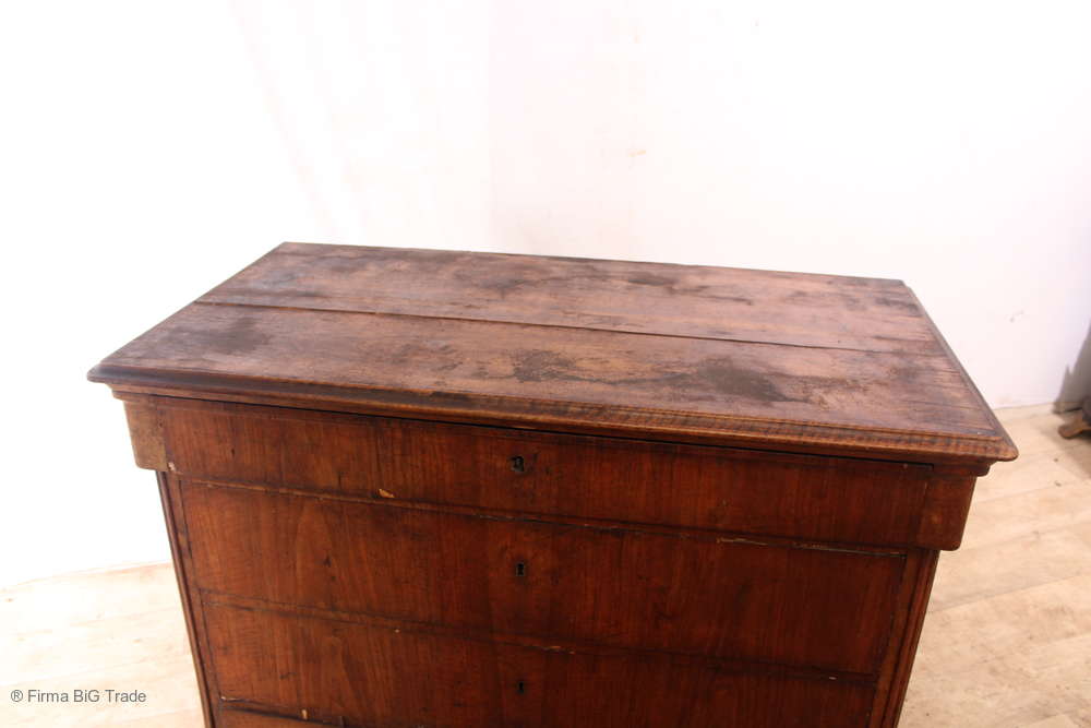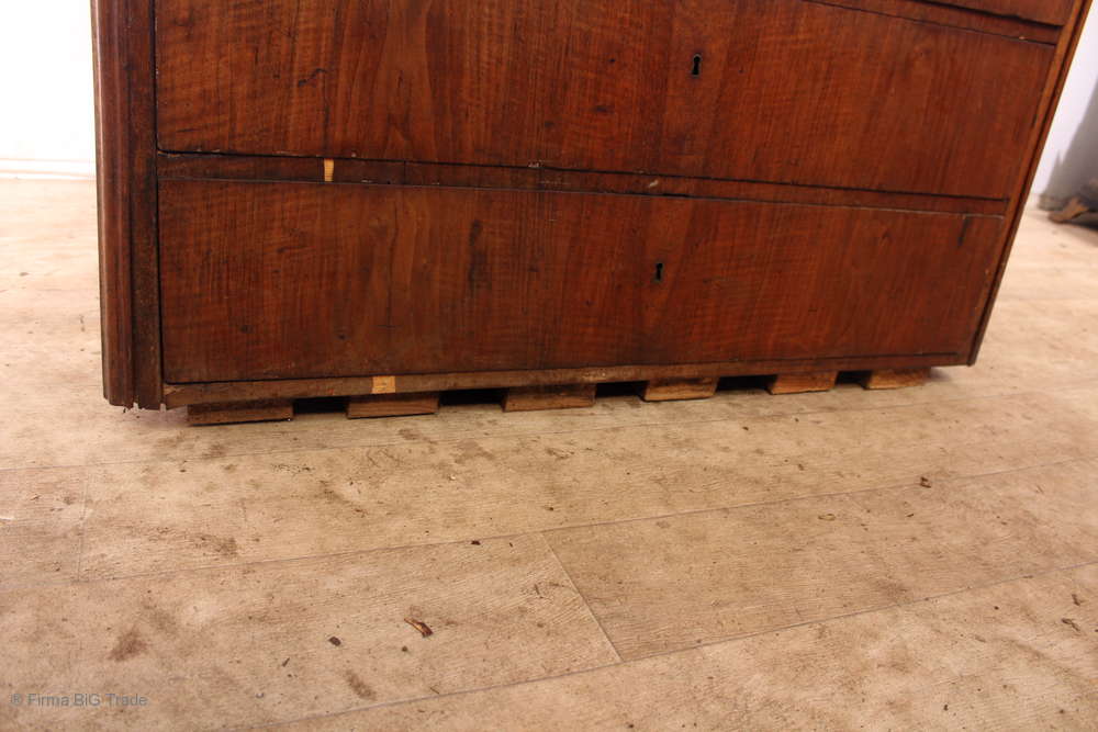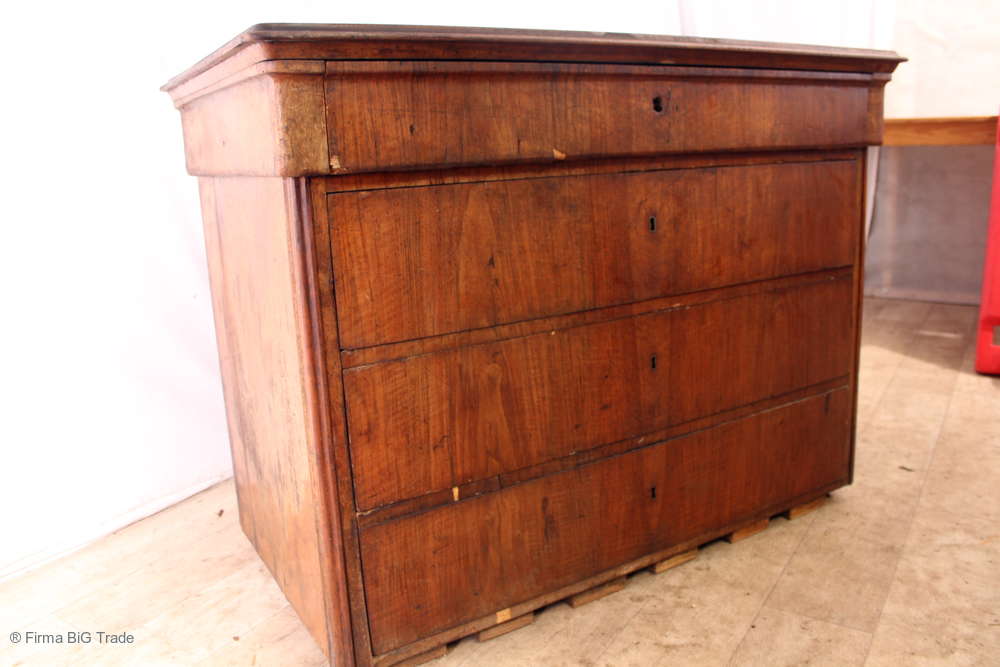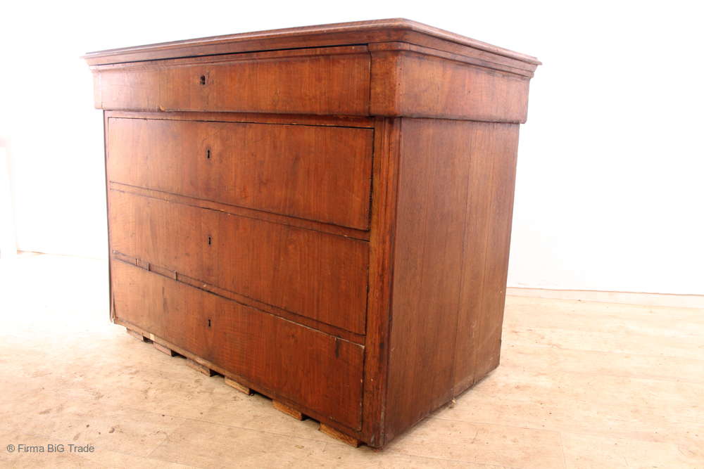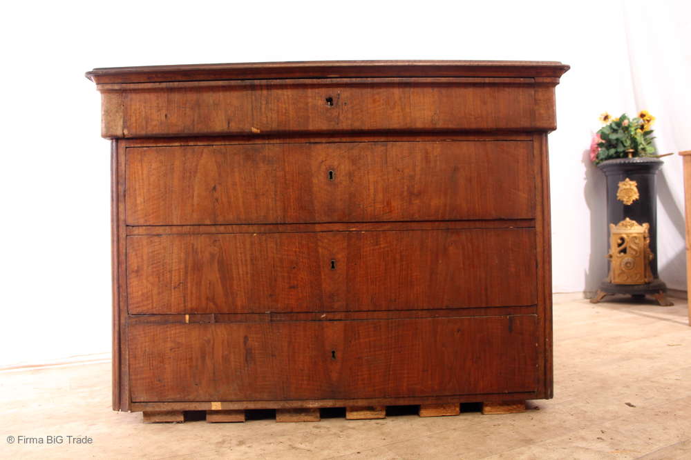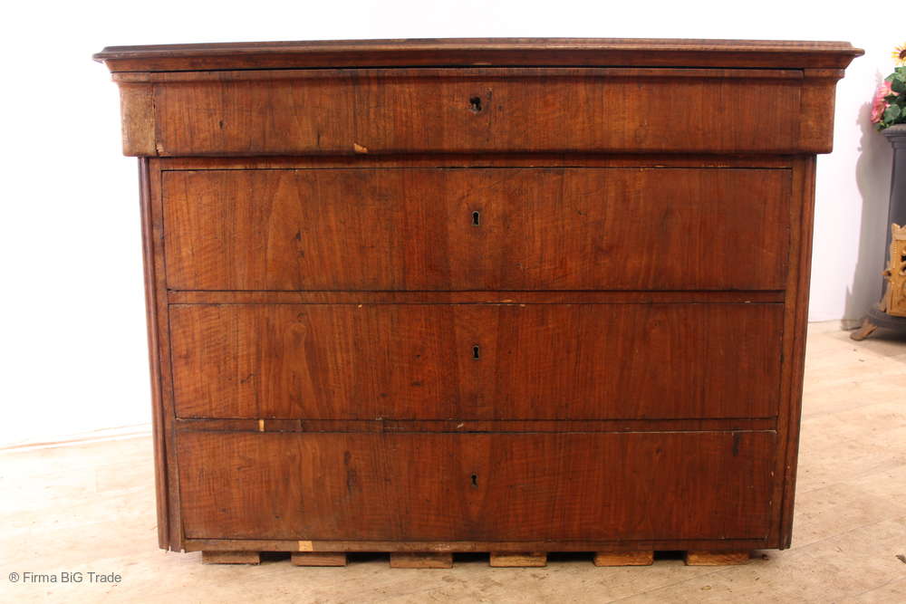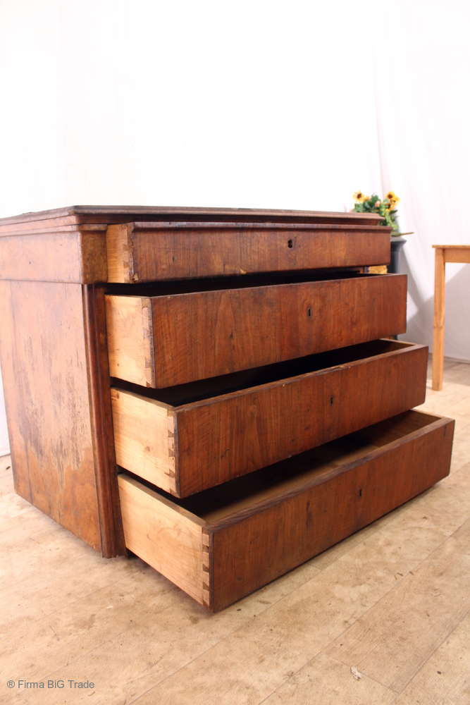 Angeboten wird eine große antike Biedermeier Kommode / Schubladenkommode / Wäschekommode aus massivem Weichholz und mit edlem Nussbaumholz furniert. Die antike Kommode besitzt 4 geräumige Schubladen, die oberste ist etwas niedriger als die anderen. Alle Schlösser sind vorhanden, Schlüssel fehlen jedoch. Die Kanten sind sanft abgerundet, die Platte kantig gehalten. Die schöne und große Kommode weist viele Alters- und Gebrauchsspuren auf u.a. Füße sowie Sockelleisten fehlen, Spannungsrisse, Furnierschäden in im Schubladenbereich, ein Schlüssellochbeschlag fehlt, unterhalb der Schlüssellöcher waren wohl Griffe montiert, diese fehlen, die Rückwand ist gebrochen (alles Siehe Bilder). Die große antike Biedermeierkommode wird zum Aufarbeiten bzw. Restaurieren angeboten.