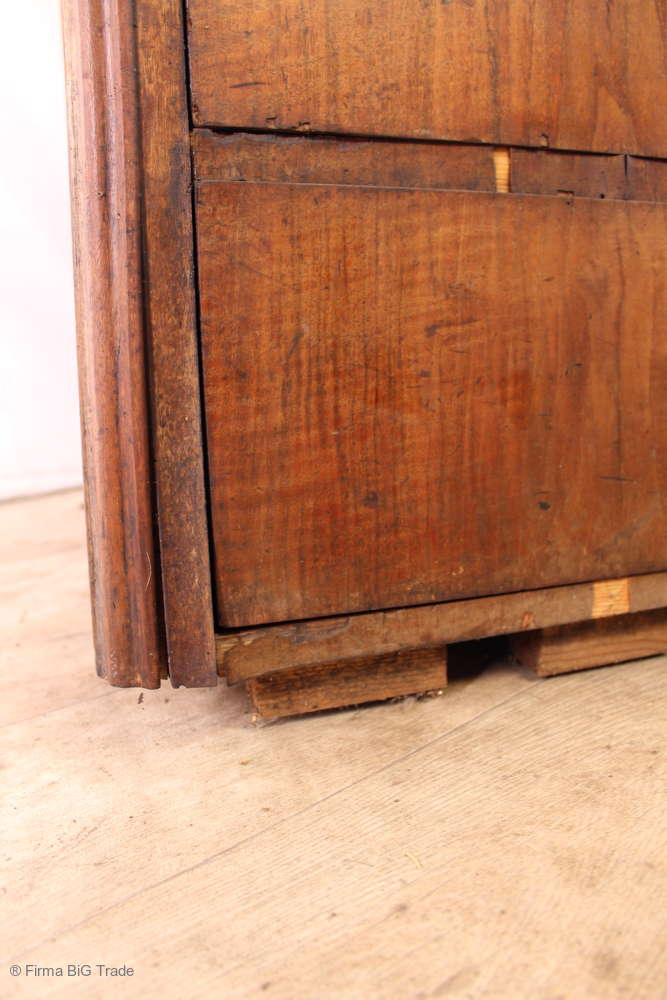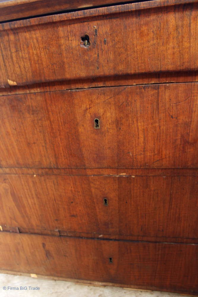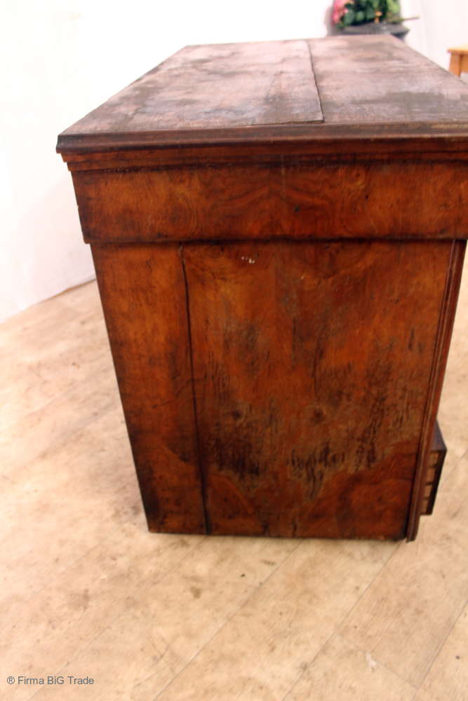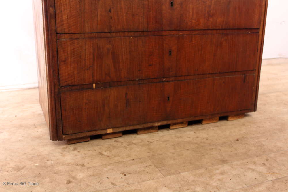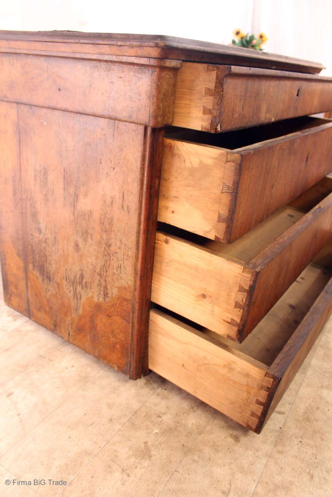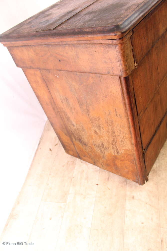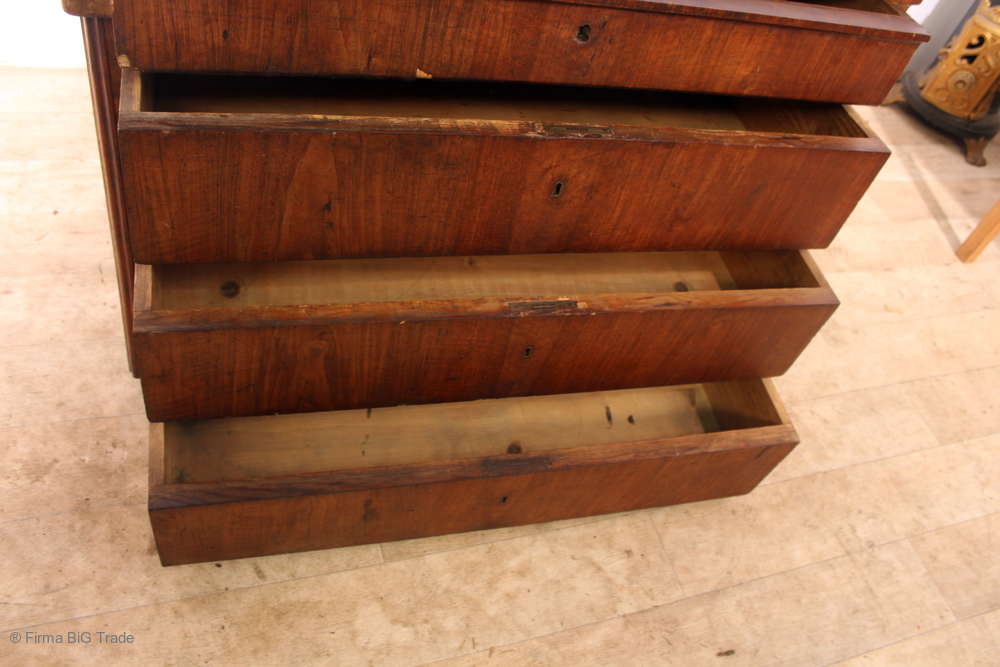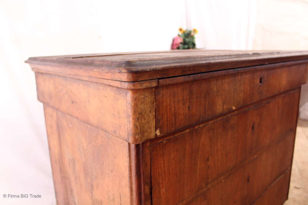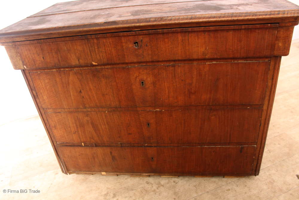 Angeboten wird eine große antike Biedermeier Kommode / Schubladenkommode / Wäschekommode aus massivem Weichholz und mit edlem Nussbaumholz furniert. Die antike Kommode besitzt 4 geräumige Schubladen, die oberste ist etwas niedriger als die anderen. Alle Schlösser sind vorhanden, Schlüssel fehlen jedoch. Die Kanten sind sanft abgerundet, die Platte kantig gehalten. Die schöne und große Kommode weist viele Alters- und Gebrauchsspuren auf u.a. Füße sowie Sockelleisten fehlen, Spannungsrisse, Furnierschäden in im Schubladenbereich, ein Schlüssellochbeschlag fehlt, unterhalb der Schlüssellöcher waren wohl Griffe montiert, diese fehlen, die Rückwand ist gebrochen (alles Siehe Bilder). Die große antike Biedermeierkommode wird zum Aufarbeiten bzw. Restaurieren angeboten.