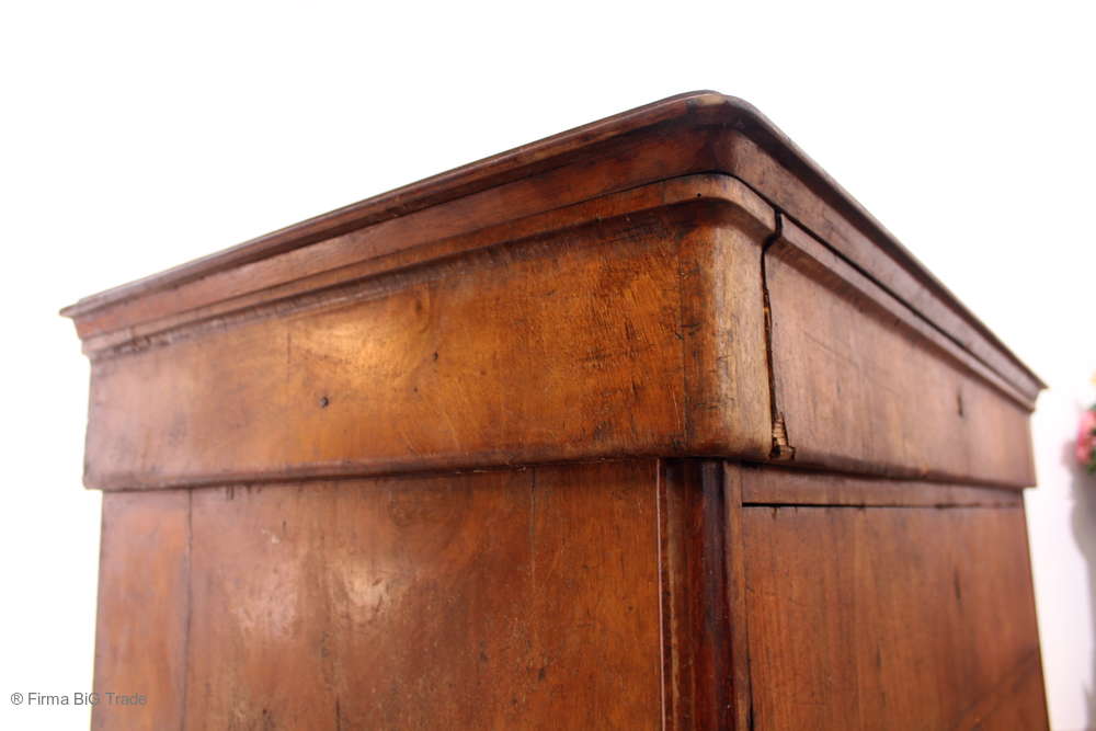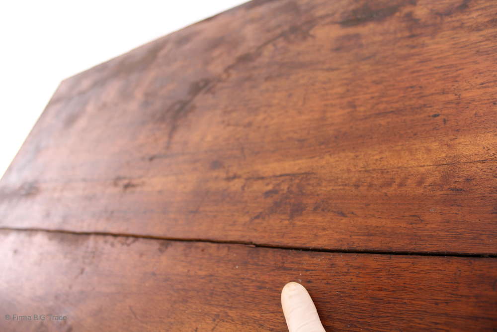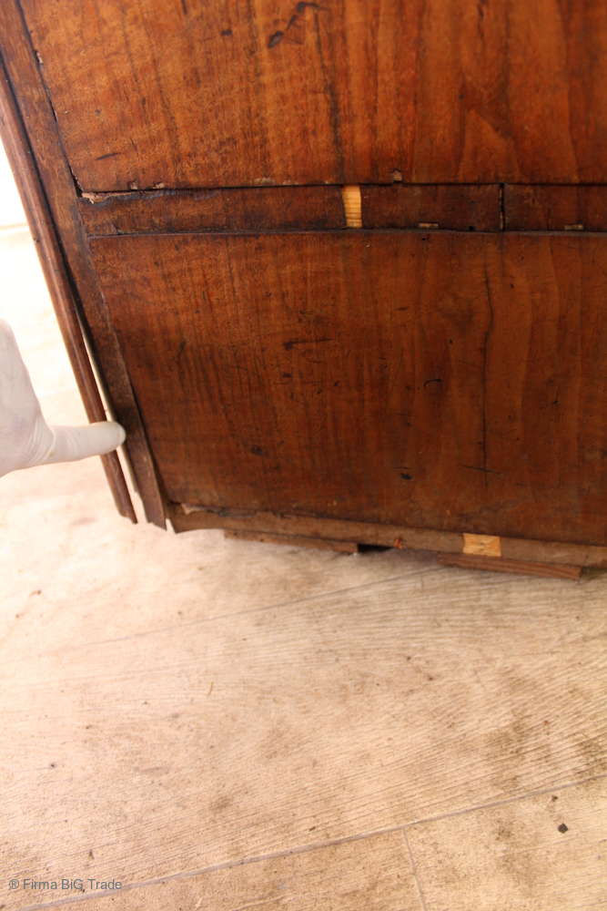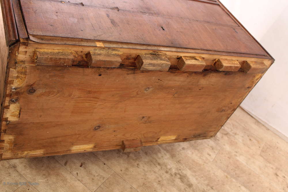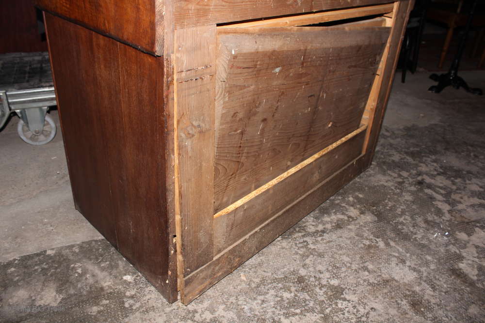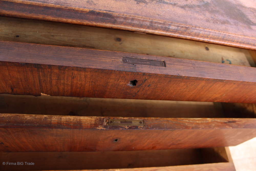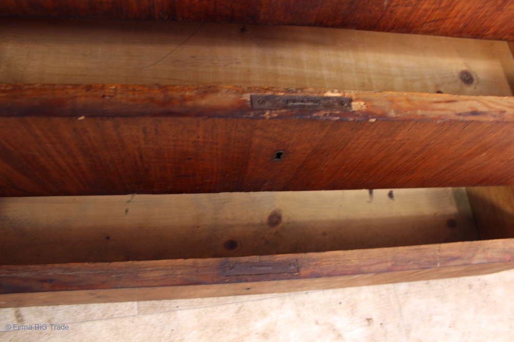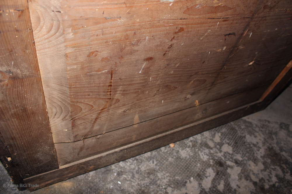 Angeboten wird eine große antike Biedermeier Kommode / Schubladenkommode / Wäschekommode aus massivem Weichholz und mit edlem Nussbaumholz furniert. Die antike Kommode besitzt 4 geräumige Schubladen, die oberste ist etwas niedriger als die anderen. Alle Schlösser sind vorhanden, Schlüssel fehlen jedoch. Die Kanten sind sanft abgerundet, die Platte kantig gehalten. Die schöne und große Kommode weist viele Alters- und Gebrauchsspuren auf u.a. Füße sowie Sockelleisten fehlen, Spannungsrisse, Furnierschäden in im Schubladenbereich, ein Schlüssellochbeschlag fehlt, unterhalb der Schlüssellöcher waren wohl Griffe montiert, diese fehlen, die Rückwand ist gebrochen (alles Siehe Bilder). Die große antike Biedermeierkommode wird zum Aufarbeiten bzw. Restaurieren angeboten.