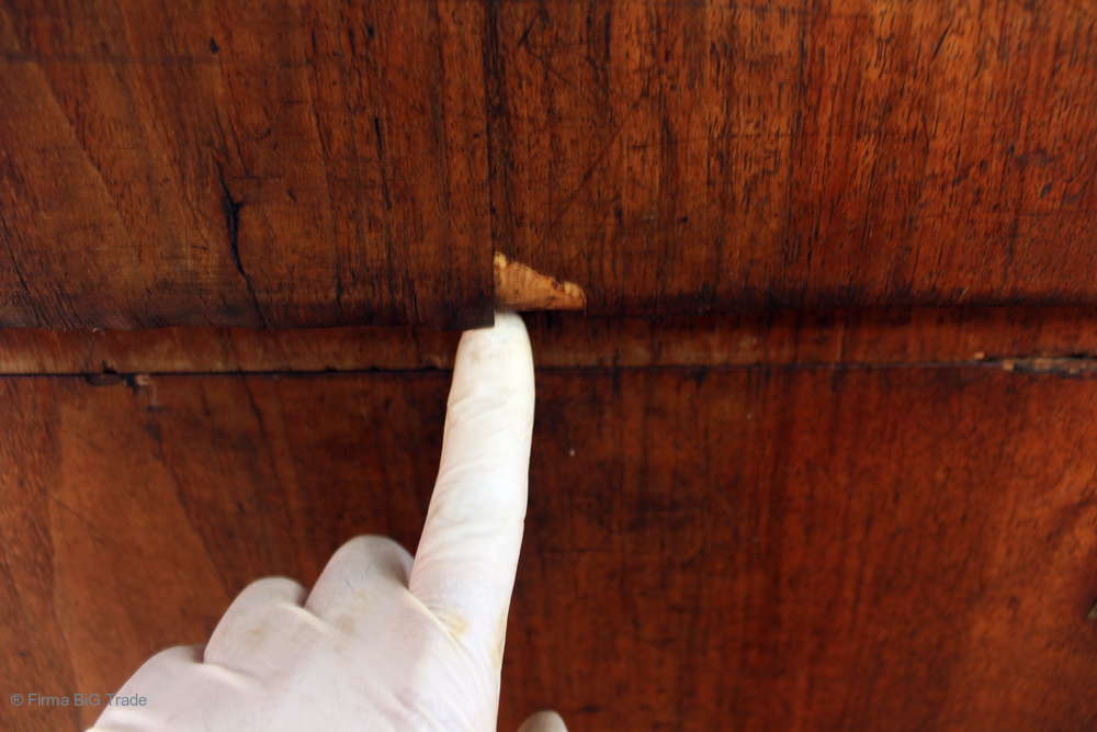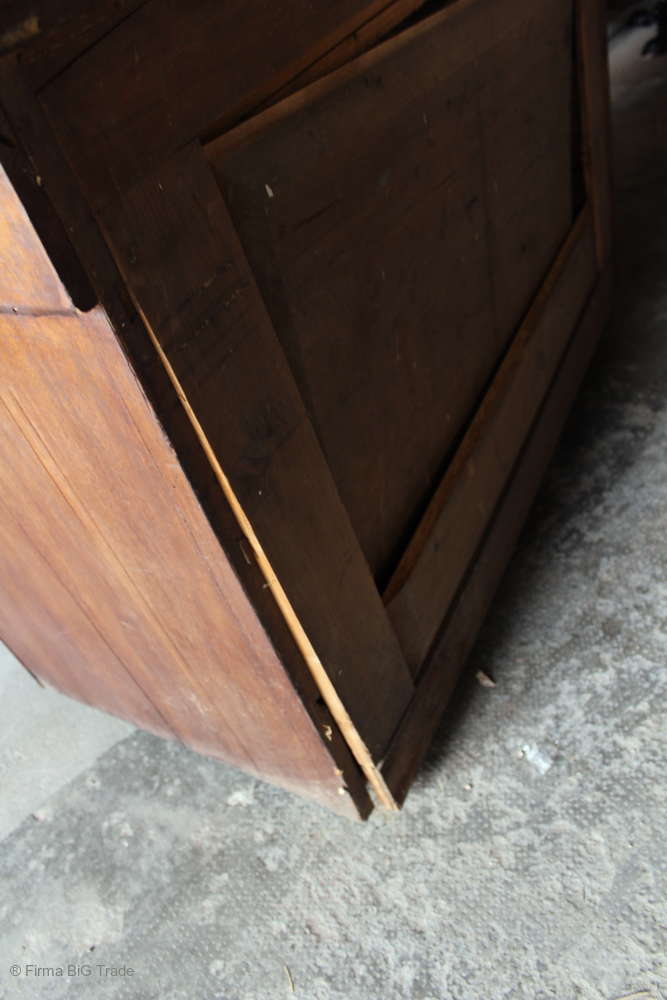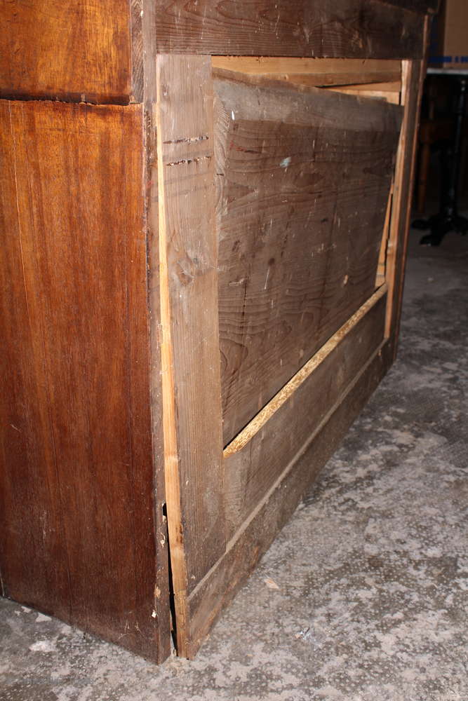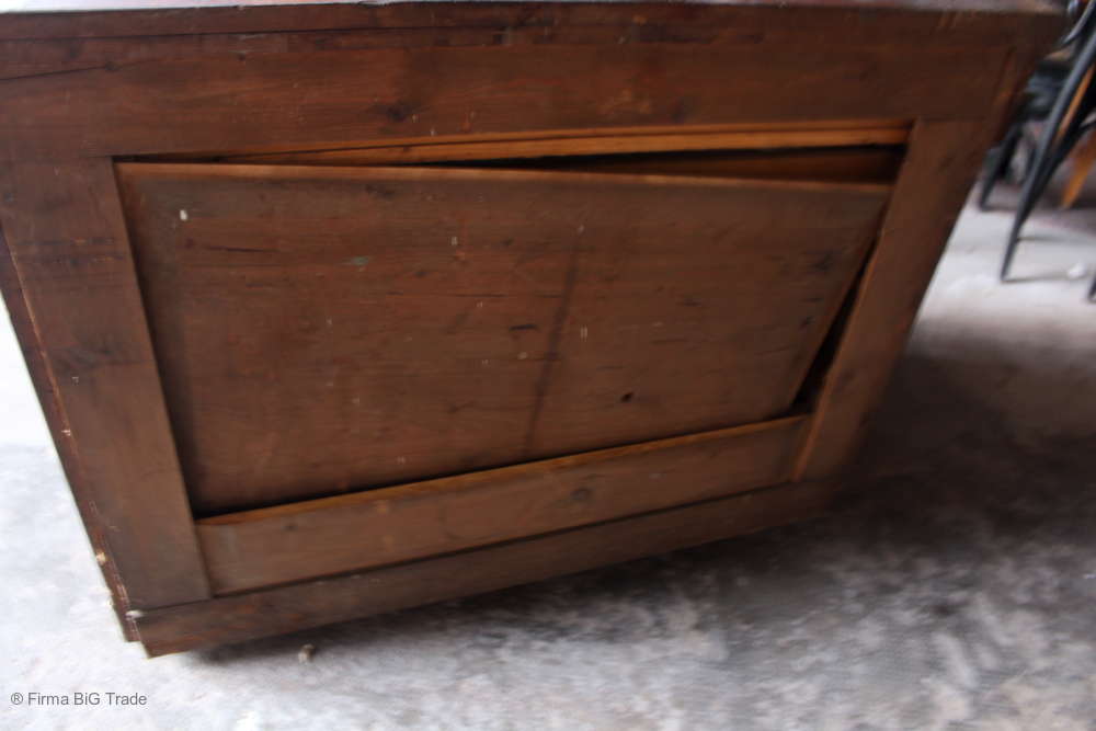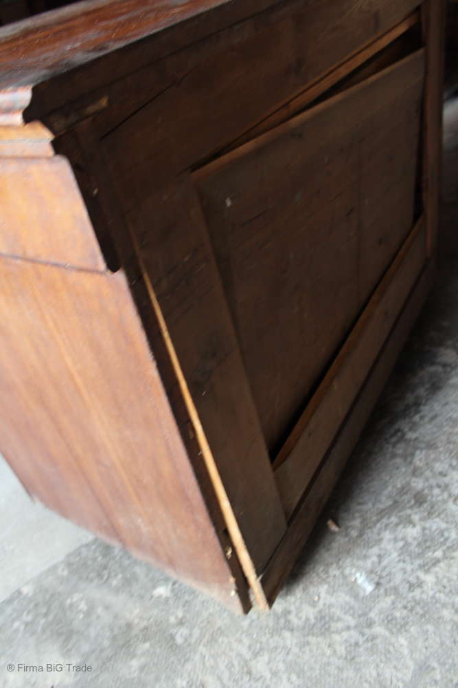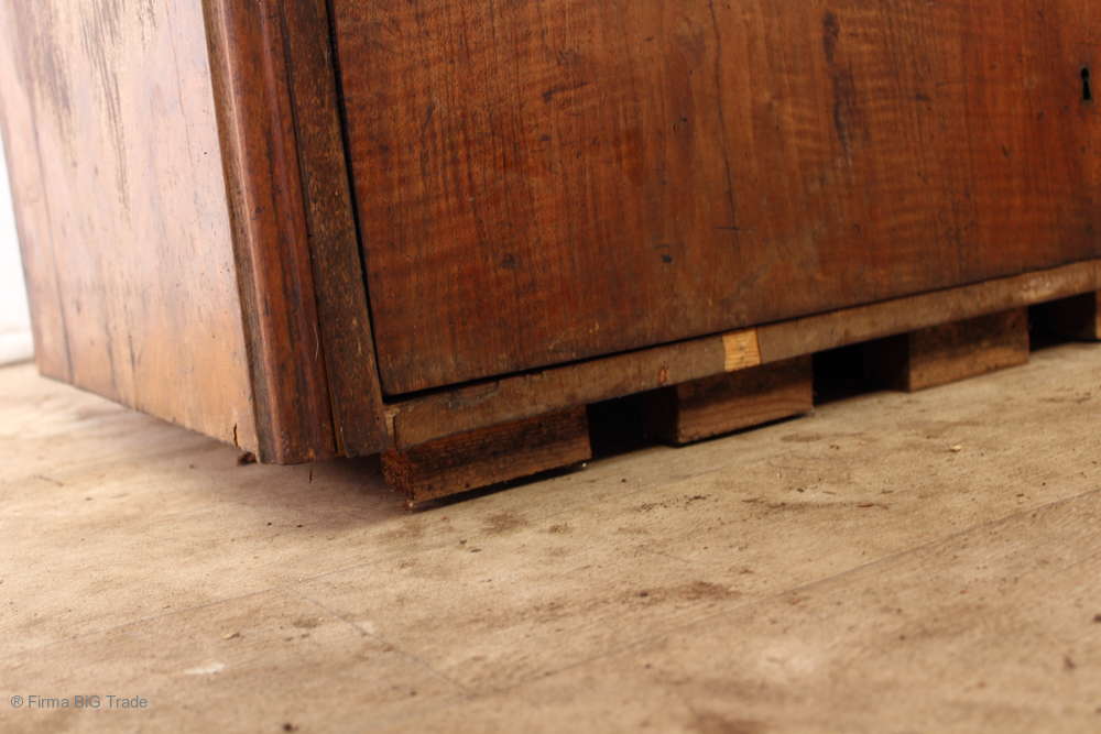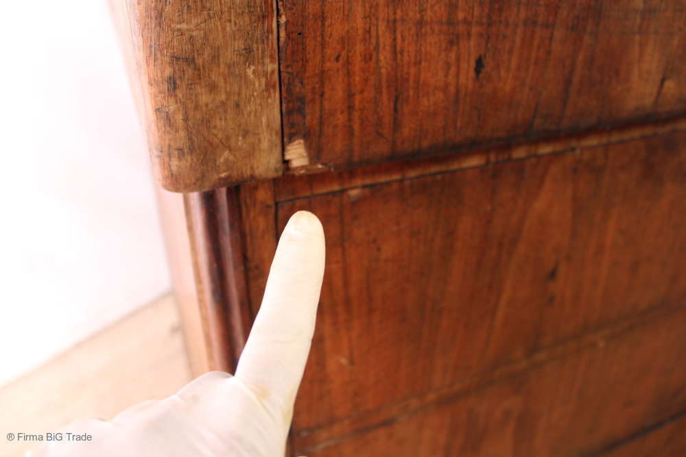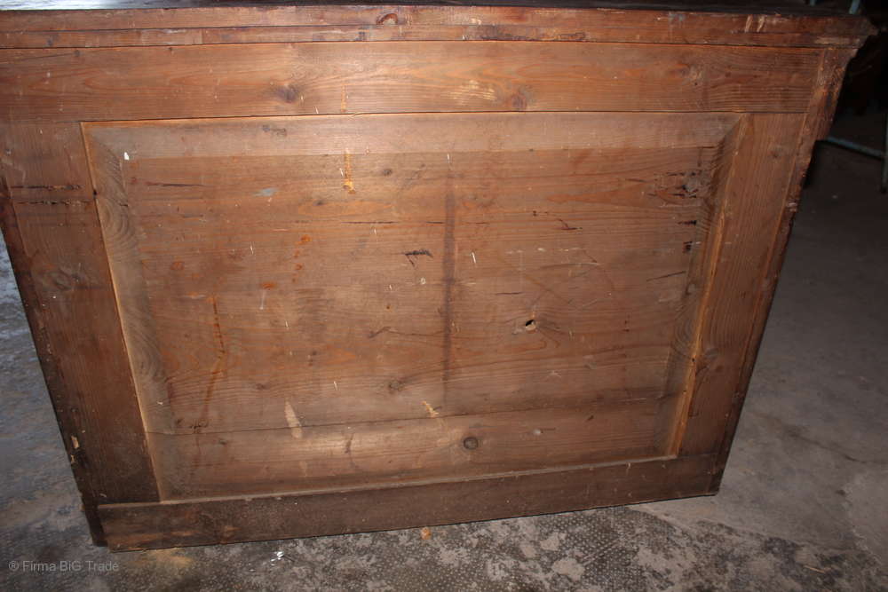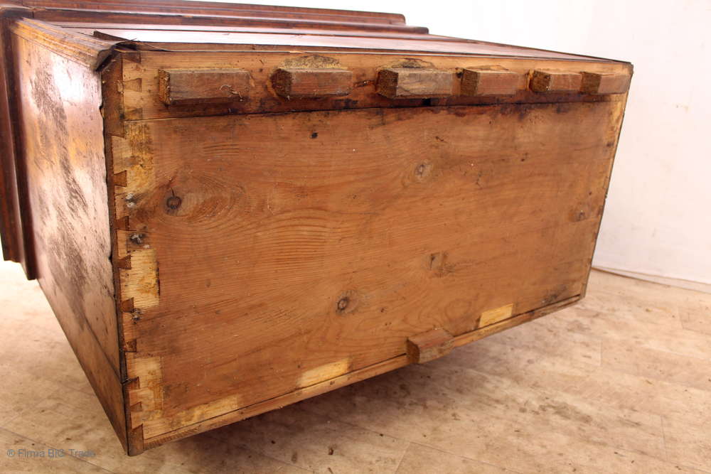 Angeboten wird eine große antike Biedermeier Kommode / Schubladenkommode / Wäschekommode aus massivem Weichholz und mit edlem Nussbaumholz furniert. Die antike Kommode besitzt 4 geräumige Schubladen, die oberste ist etwas niedriger als die anderen. Alle Schlösser sind vorhanden, Schlüssel fehlen jedoch. Die Kanten sind sanft abgerundet, die Platte kantig gehalten. Die schöne und große Kommode weist viele Alters- und Gebrauchsspuren auf u.a. Füße sowie Sockelleisten fehlen, Spannungsrisse, Furnierschäden in im Schubladenbereich, ein Schlüssellochbeschlag fehlt, unterhalb der Schlüssellöcher waren wohl Griffe montiert, diese fehlen, die Rückwand ist gebrochen (alles Siehe Bilder). Die große antike Biedermeierkommode wird zum Aufarbeiten bzw. Restaurieren angeboten.