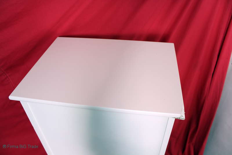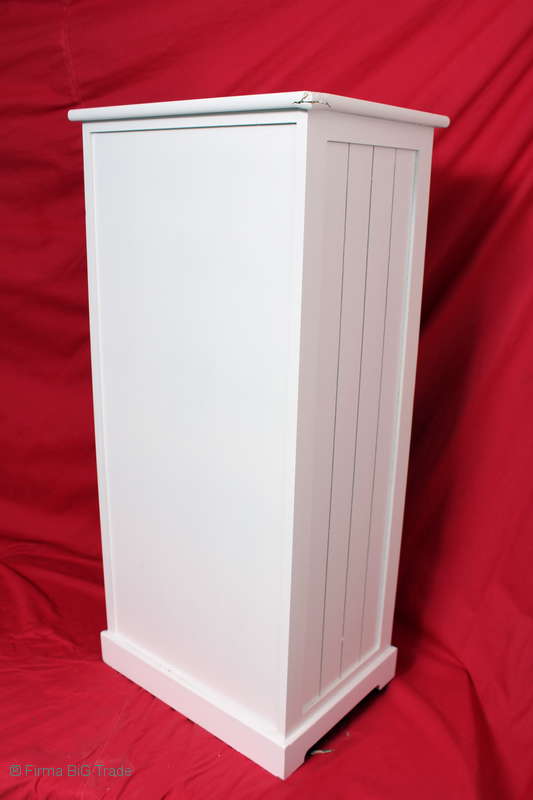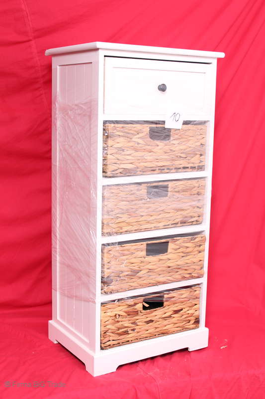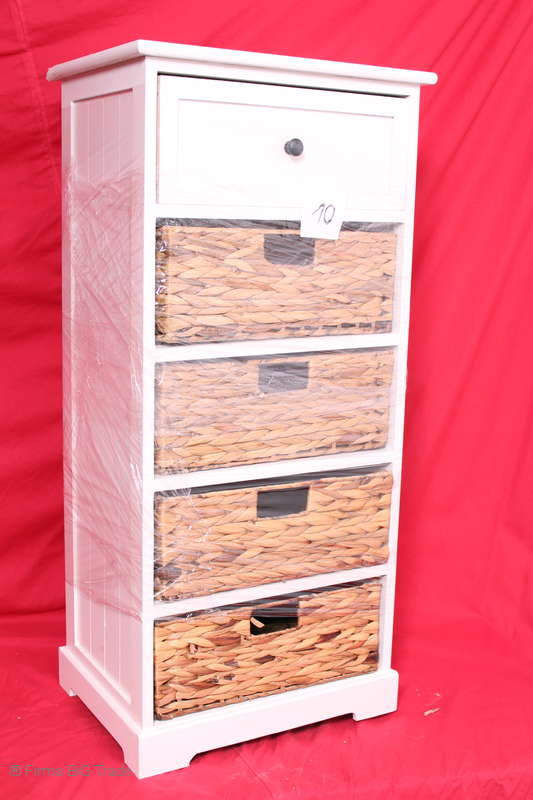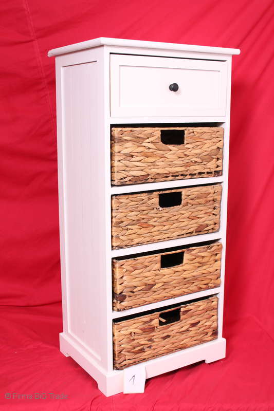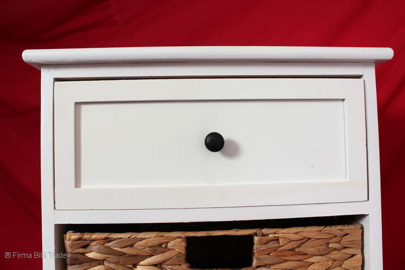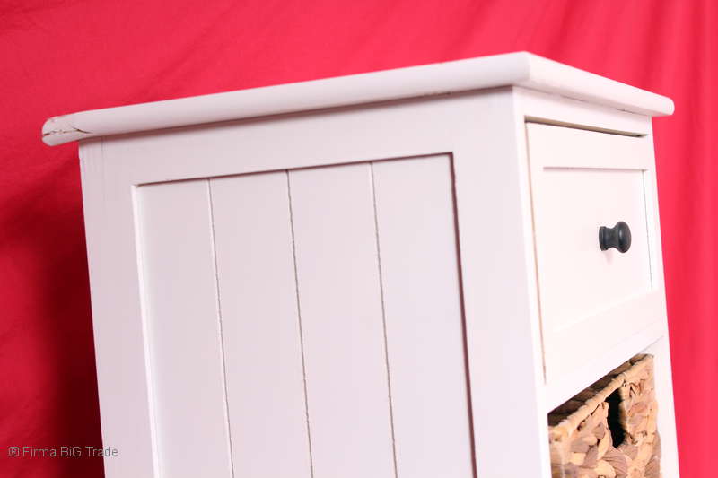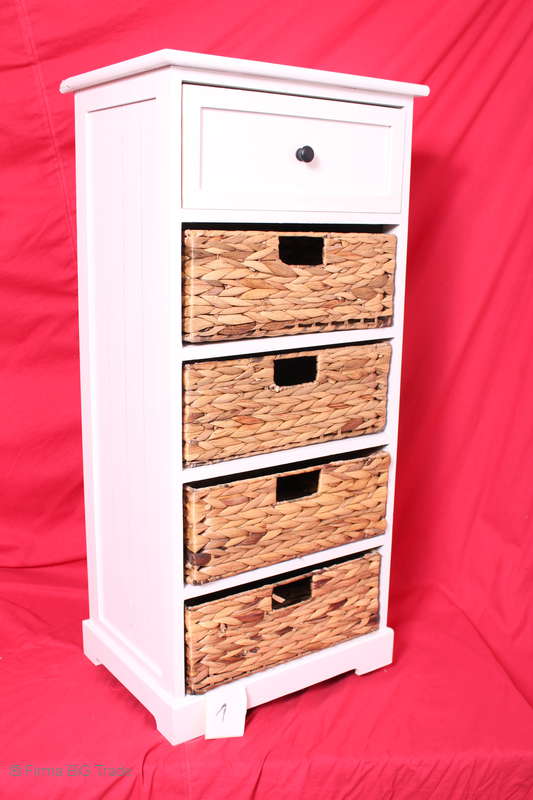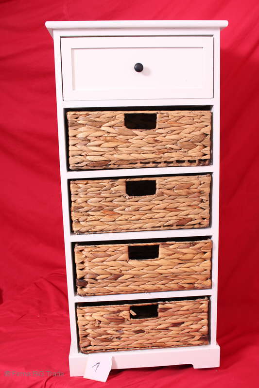 Angeboten wird eine zauberhafte Schubladenkommode / Beistelltisch / Flurschrank / Küchenschrank / Badschrank / Schubladenschrank im modernen Landhaus Stil. Die schöne Schubladenkommode besitzt eine Schublade. Darunter vier Bastkörbe mit einer eingearbeiteten Öffnung als Griff. Die Seitenteile sind in Kassettenform gestaltet und mit Profilrillen verziert. Der praktische Schubladenschrank weist einige Gebrauchsspuren auf u.a. gelbliche Farbverwischungen und eine Stoßstelle an der hinteren Ecke der Deckplatte (siehe Bilder). Ansonsten befindet sich das schöne Schränkchen in einem guten gebrauchten Zustand.
