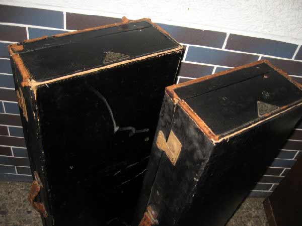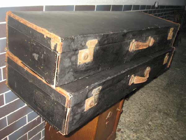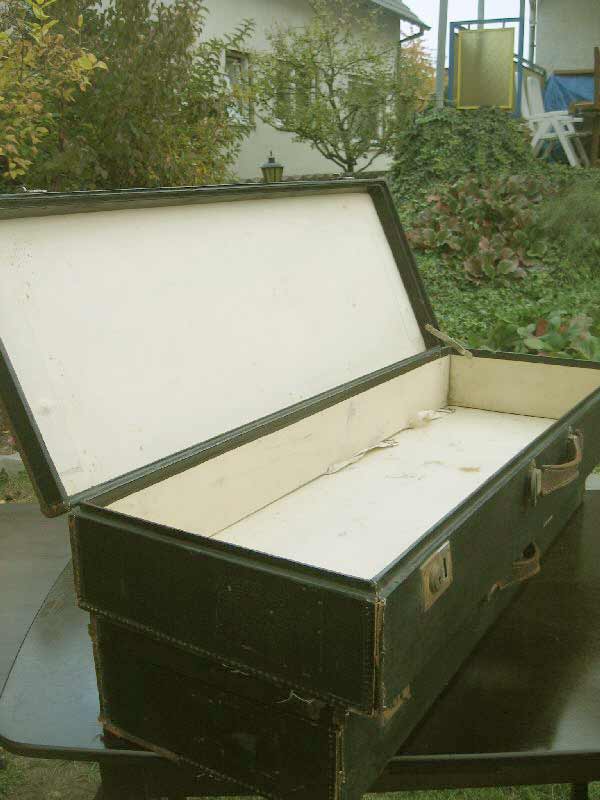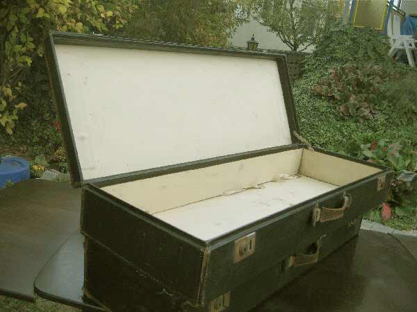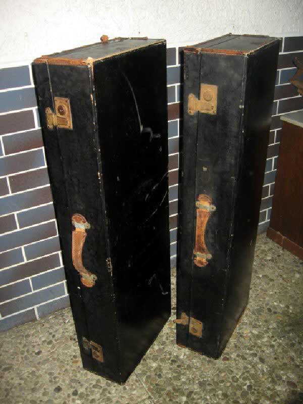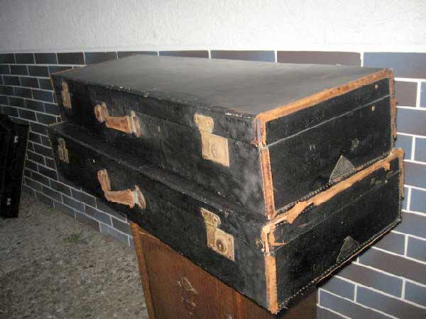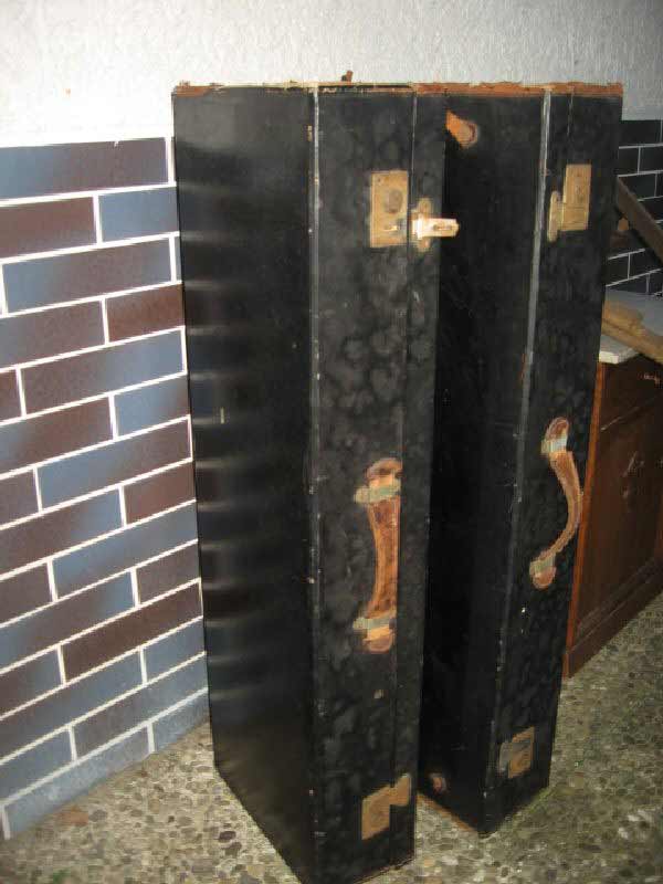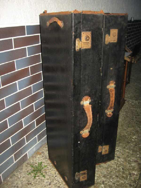 Angeboten werden zwei antike Koffer / Reisekoffer / Schrankkoffer / Überseetruhen. Die schönen Koffer sind sehr schmal und lang. Die beiden Koffer weisen einige Gebrauchsspuren auf und müssen aufgearbeitet werden. Ein günstiger Versand ist möglich (siehe unten).