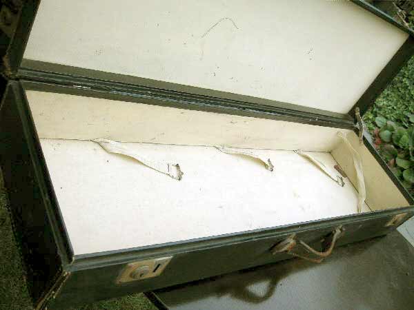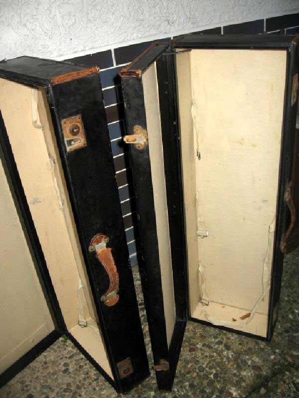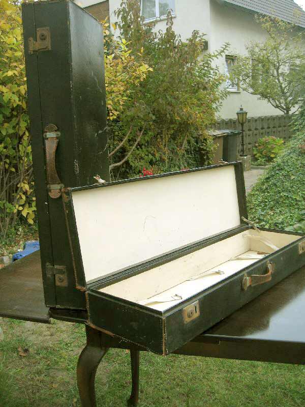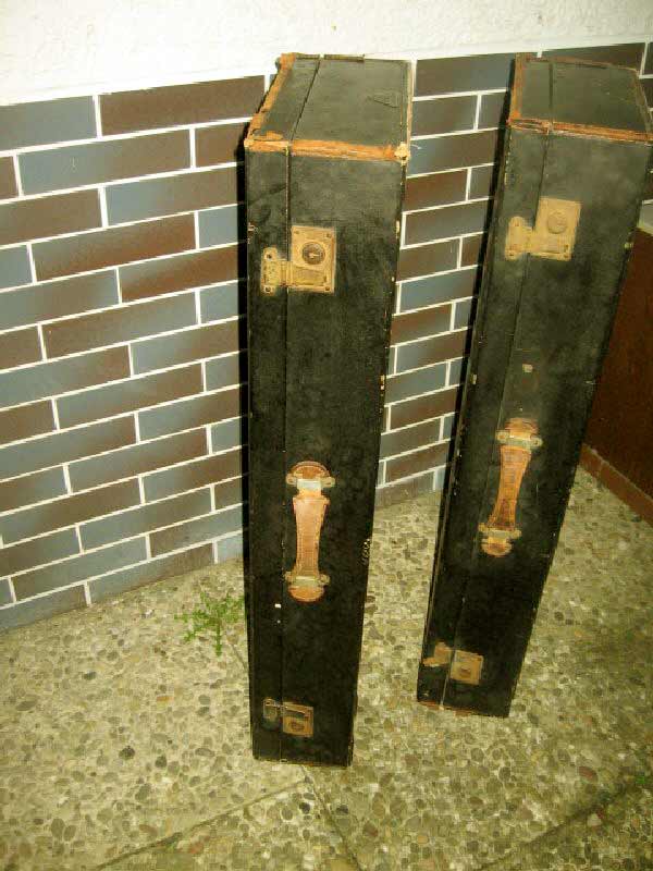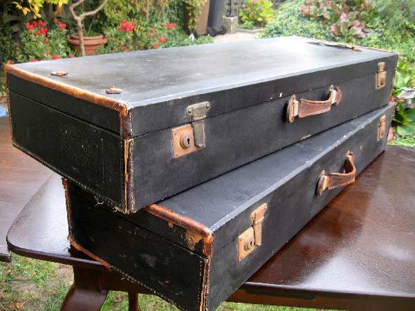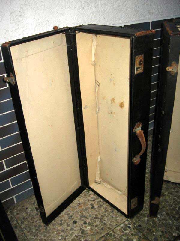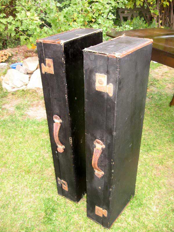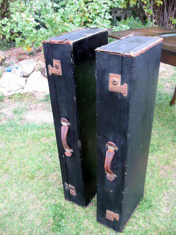 Angeboten werden zwei antike Koffer / Reisekoffer / Schrankkoffer / Überseetruhen. Die schönen Koffer sind sehr schmal und lang. Die beiden Koffer weisen einige Gebrauchsspuren auf und müssen aufgearbeitet werden. Ein günstiger Versand ist möglich (siehe unten).