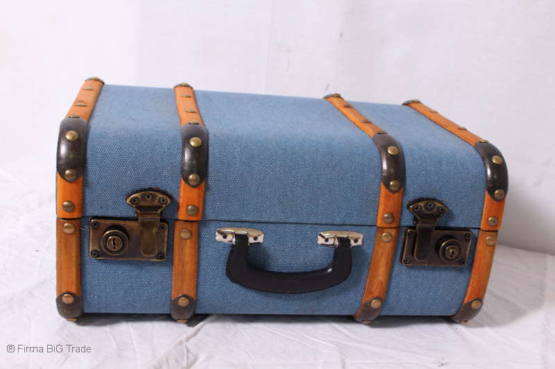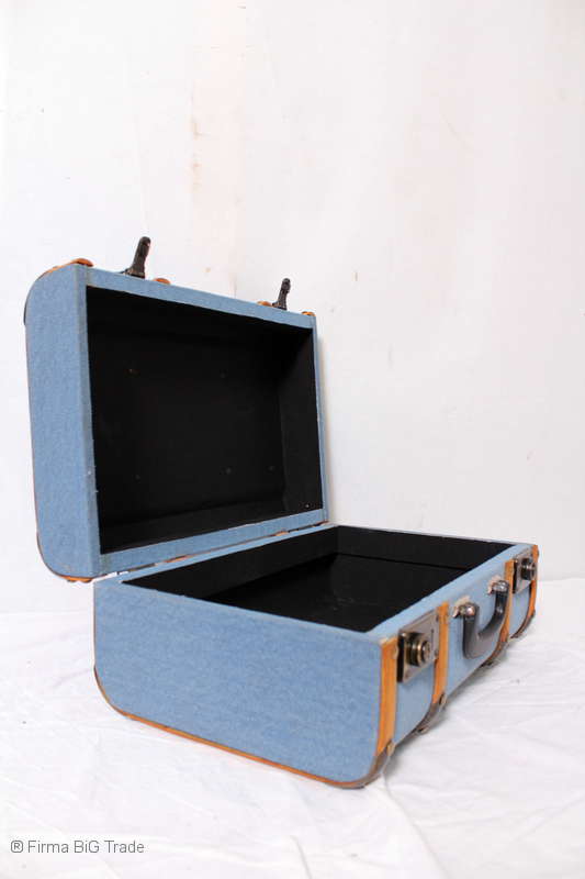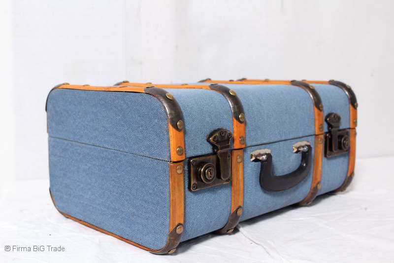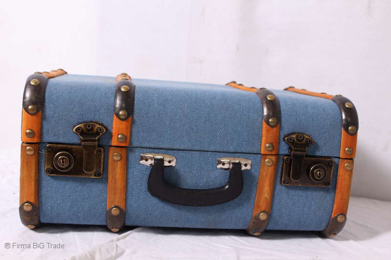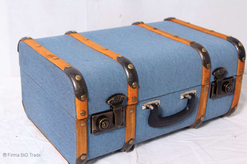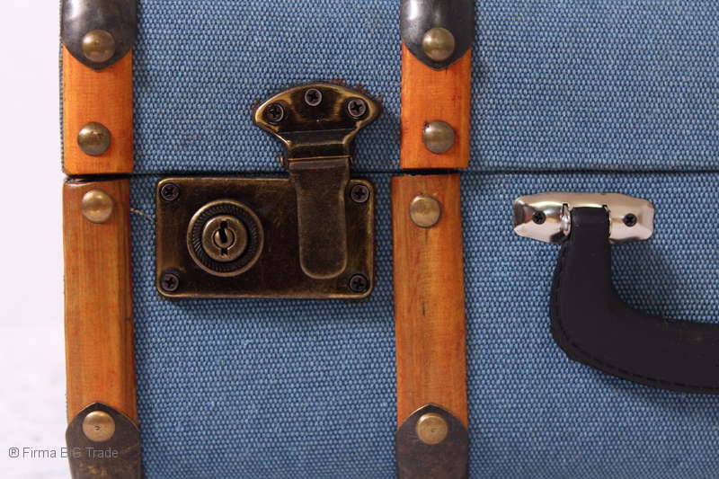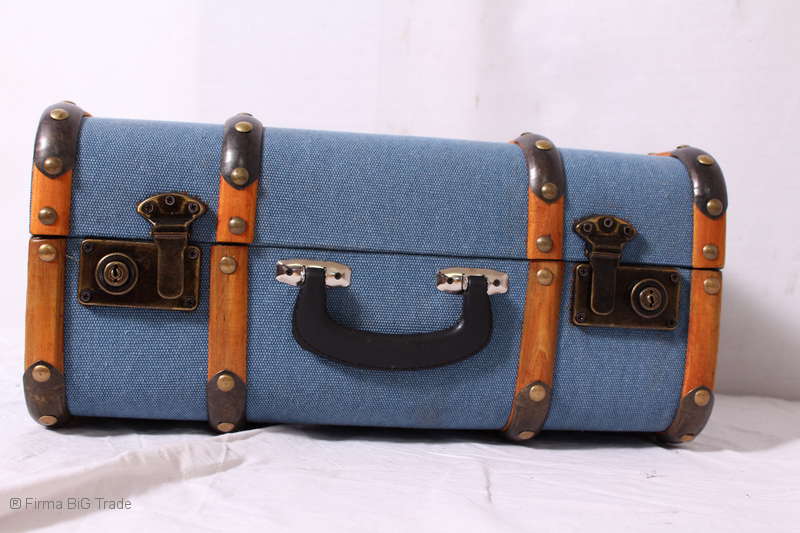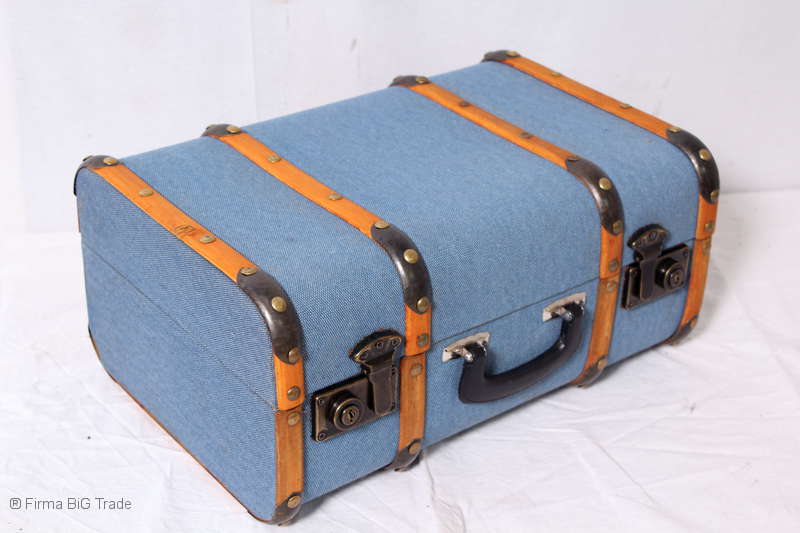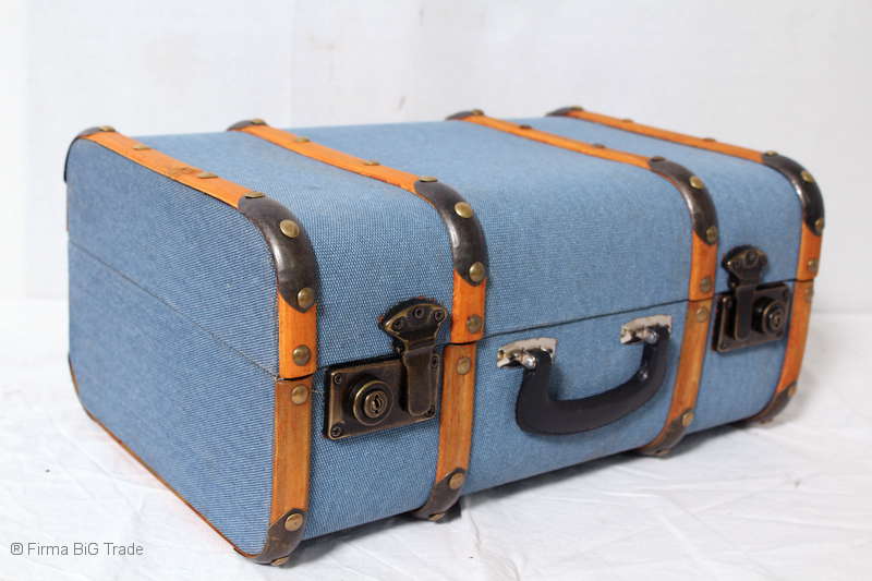 Angeboten wird ein schöner Oldtimerkoffer / Kutscherkoffer / Koffer im antiken Stil. Der tolle Koffer besitzt vorne einen Griff und 2 Schlösser ohne Schlüssel. Die Außenseite ist in einem schönen blau gehalten und mit halbrunden Holzlatten verstärkt, die Kanten sind mit runden Metallkappen verziert. Der tolle Koffer ist neu, kann aber hier und da kleine produktionsbedingte Fehler aufweisen. Wir bieten diesen Koffer in 4 Größen an.