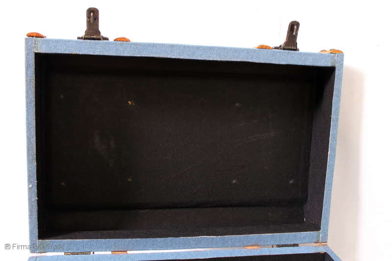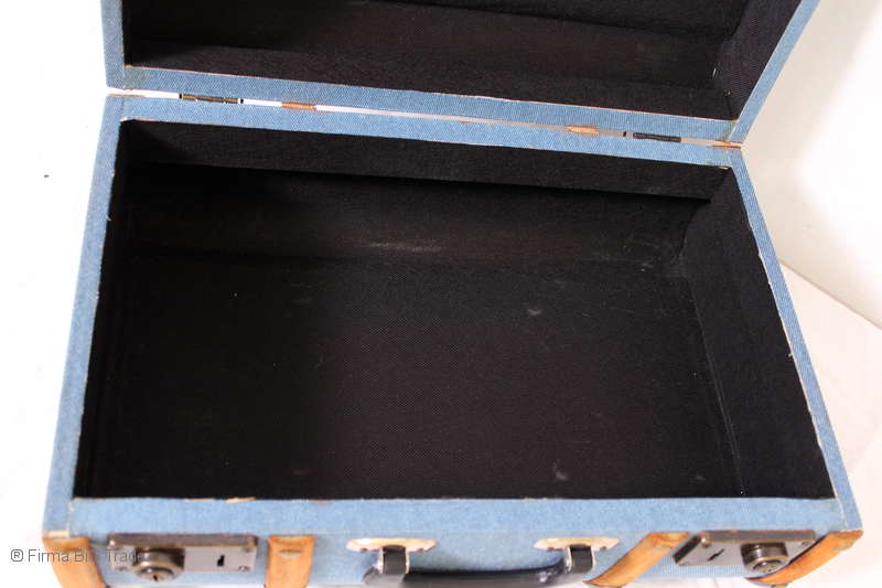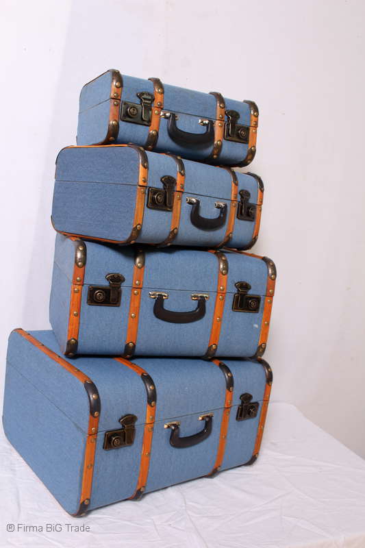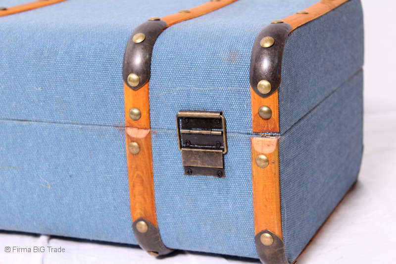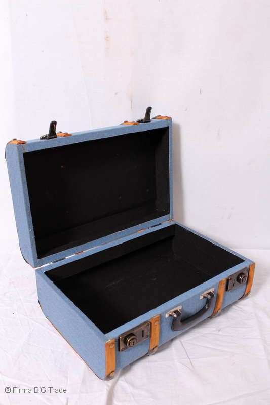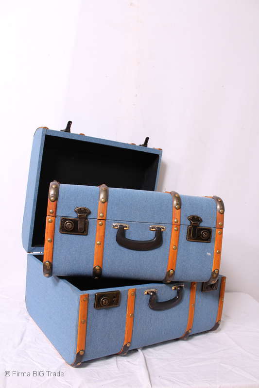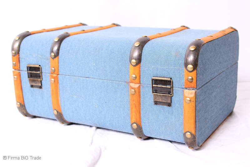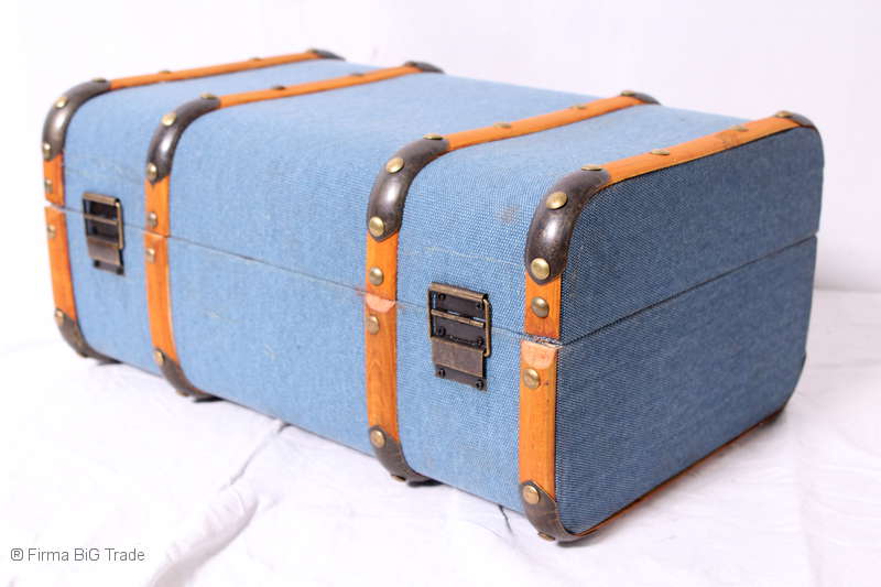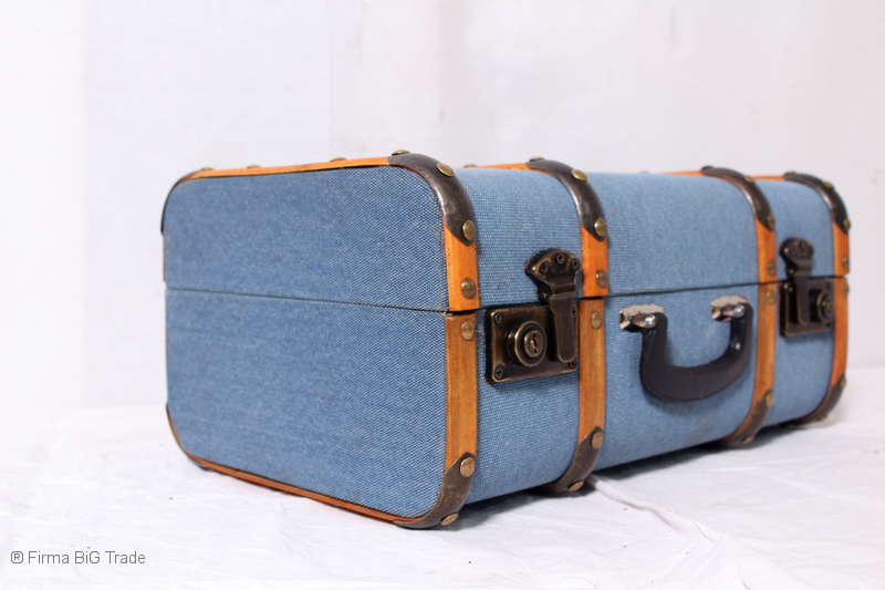 Angeboten wird ein schöner Oldtimerkoffer / Kutscherkoffer / Koffer im antiken Stil. Der tolle Koffer besitzt vorne einen Griff und 2 Schlösser ohne Schlüssel. Die Außenseite ist in einem schönen blau gehalten und mit halbrunden Holzlatten verstärkt, die Kanten sind mit runden Metallkappen verziert. Der tolle Koffer ist neu, kann aber hier und da kleine produktionsbedingte Fehler aufweisen. Wir bieten diesen Koffer in 4 Größen an.