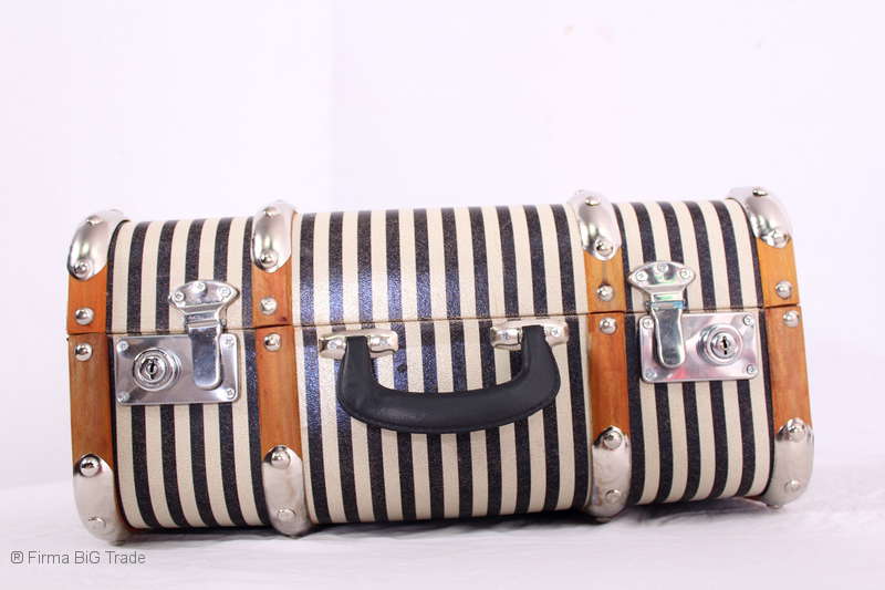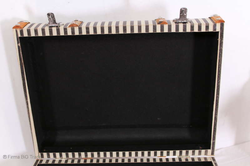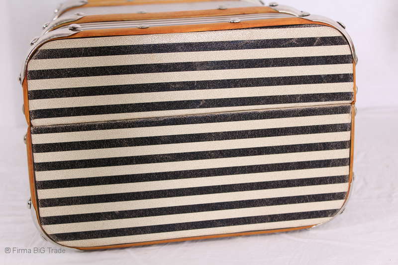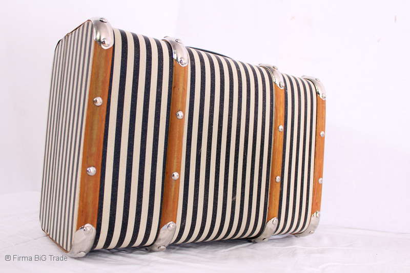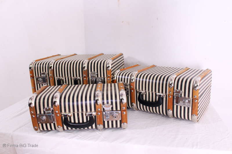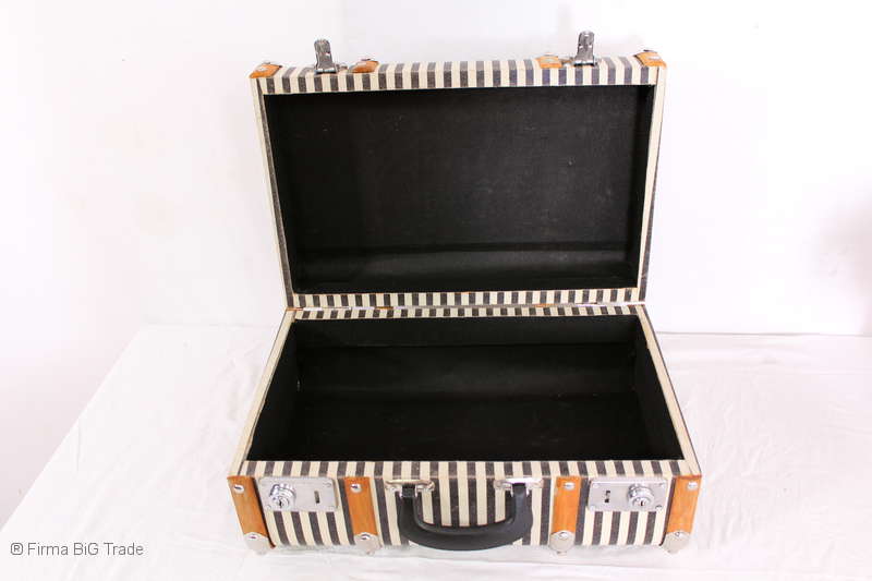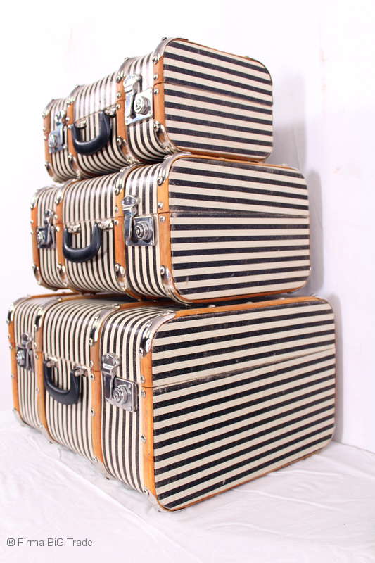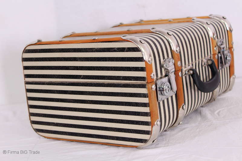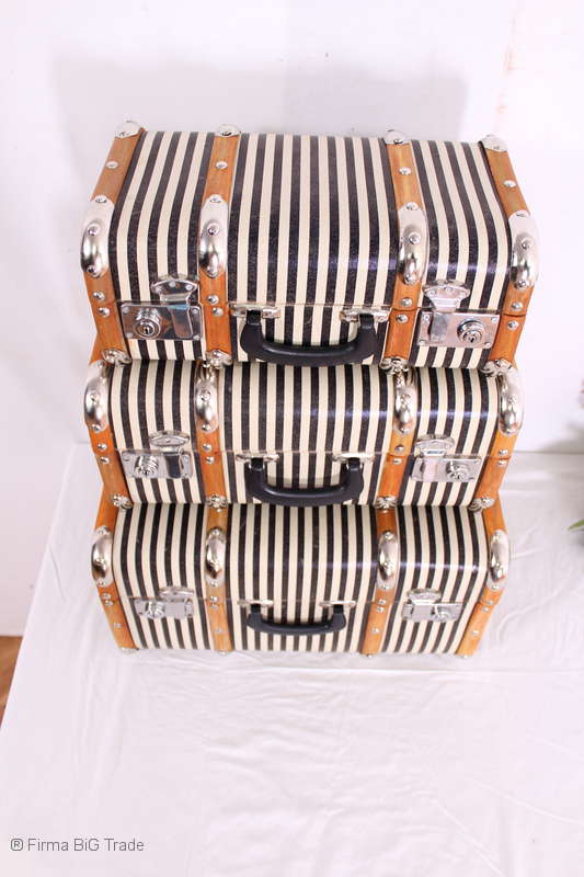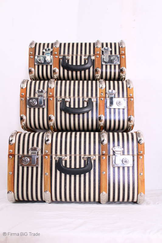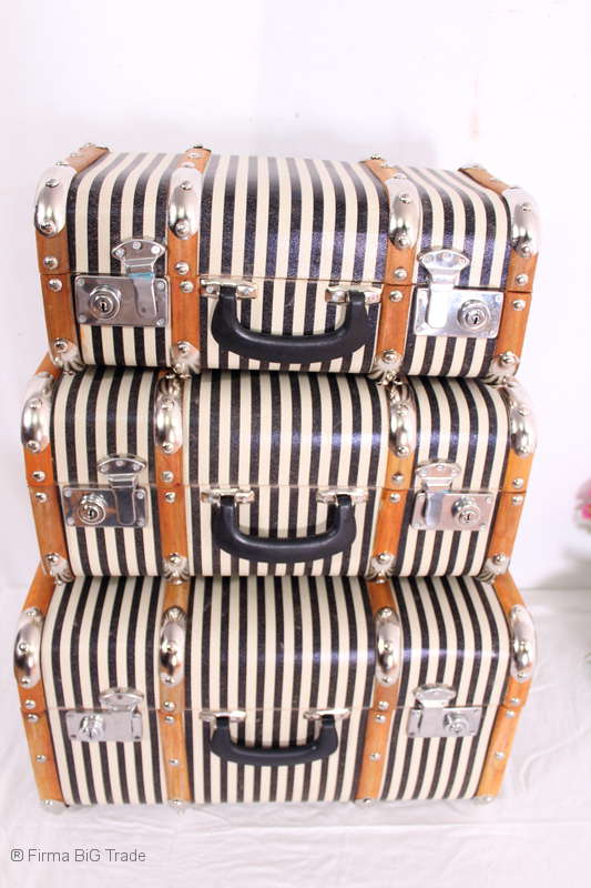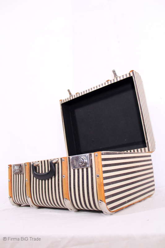 Angeboten wird ein zauberhaftes Oldtimerkoffer Set bestehend aus jeweils 3 Koffer / Reisekoffer / Damenkoffer / Holzkoffer im edlem antiken Stil. Die schönen Koffer besitzen vorne einen Griff und 2 Schlösser, Schlüssel fehlen. Der Korpus ist aus Holz, die Außenseite ist sehr schön in schwarzweiß gestreift und mit halbrunden Holzlatten verstärkt, die Kanten sind mit runden und gechromten Metallkappen verziert. An den nostalgischen Koffer sind hier und da kleine Gebrauchsspuren vorhanden (siehe Bilder), ansonsten befinden sich die schönen Koffer in einem sehr guten Zustand. Die Koffer haben drei unterschiedliche Größen.