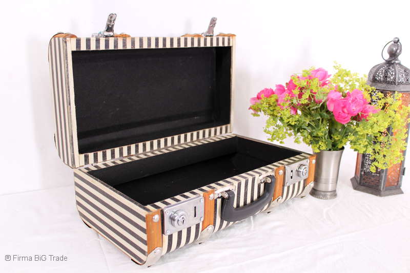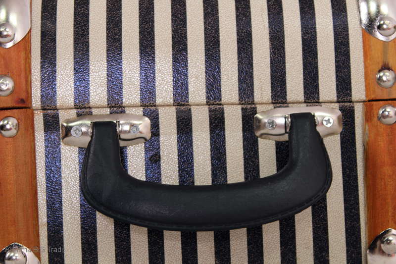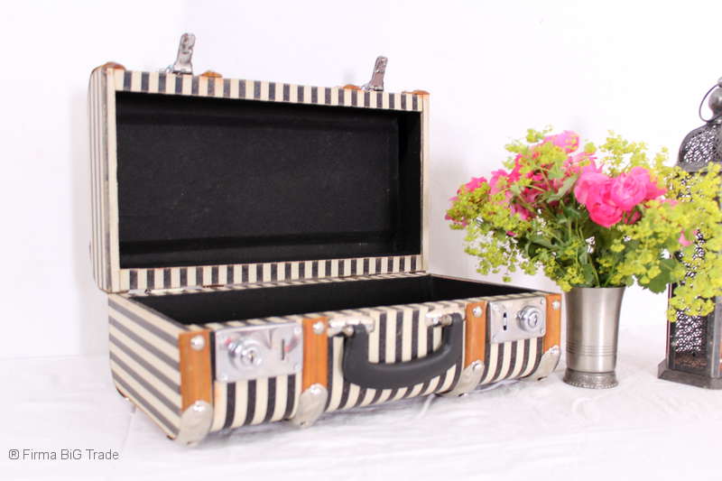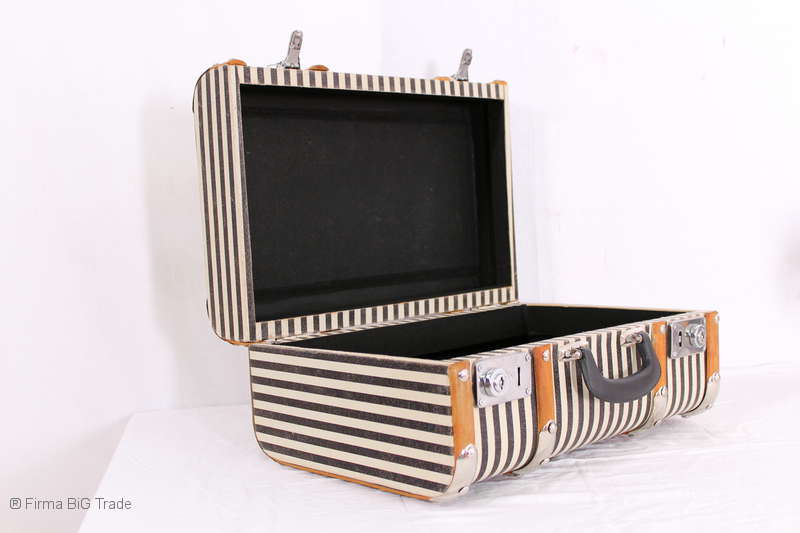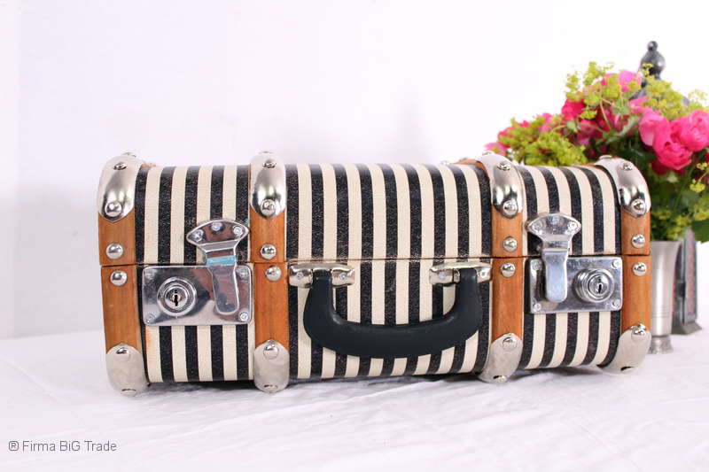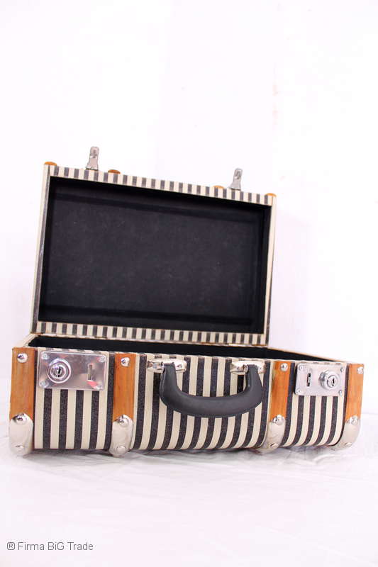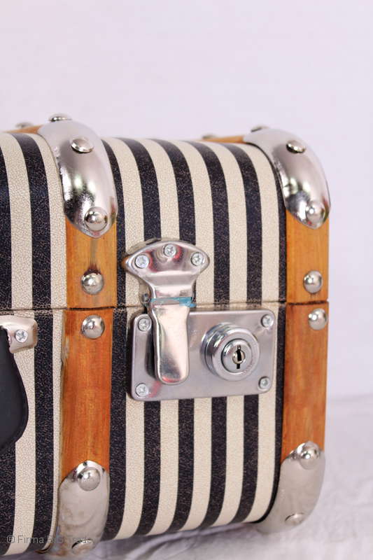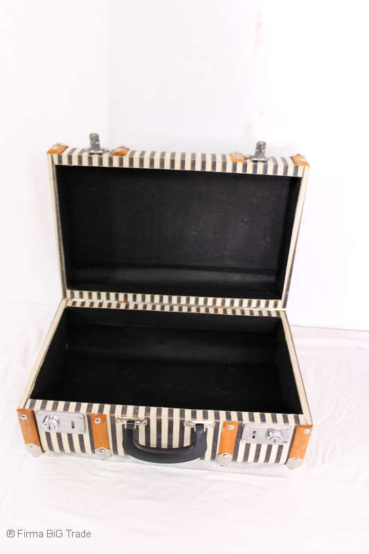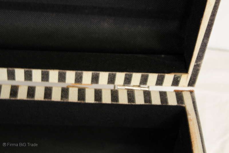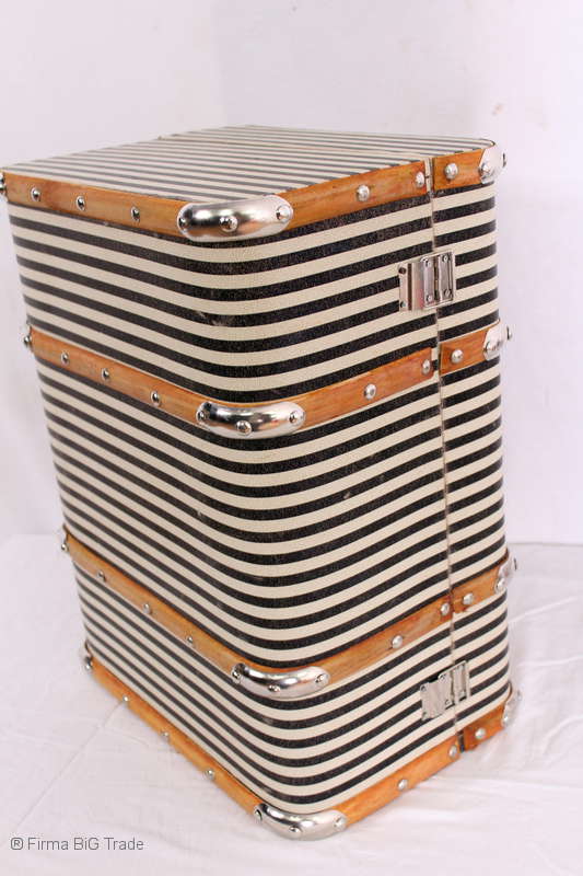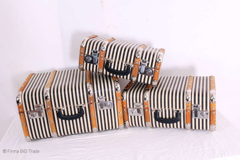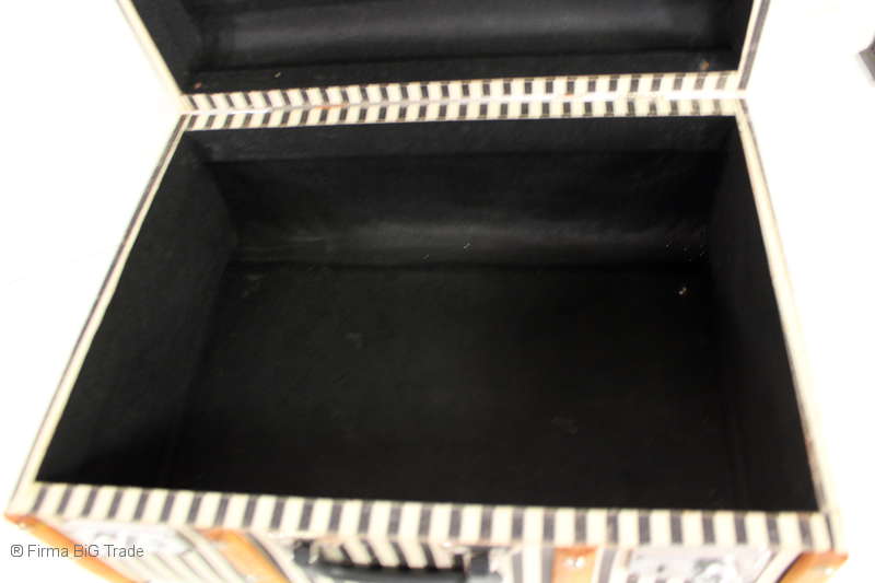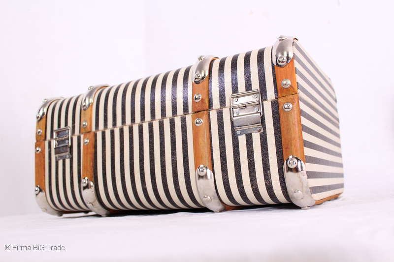 Angeboten wird ein zauberhaftes Oldtimerkoffer Set bestehend aus jeweils 3 Koffer / Reisekoffer / Damenkoffer / Holzkoffer im edlem antiken Stil. Die schönen Koffer besitzen vorne einen Griff und 2 Schlösser, Schlüssel fehlen. Der Korpus ist aus Holz, die Außenseite ist sehr schön in schwarzweiß gestreift und mit halbrunden Holzlatten verstärkt, die Kanten sind mit runden und gechromten Metallkappen verziert. An den nostalgischen Koffer sind hier und da kleine Gebrauchsspuren vorhanden (siehe Bilder), ansonsten befinden sich die schönen Koffer in einem sehr guten Zustand. Die Koffer haben drei unterschiedliche Größen.