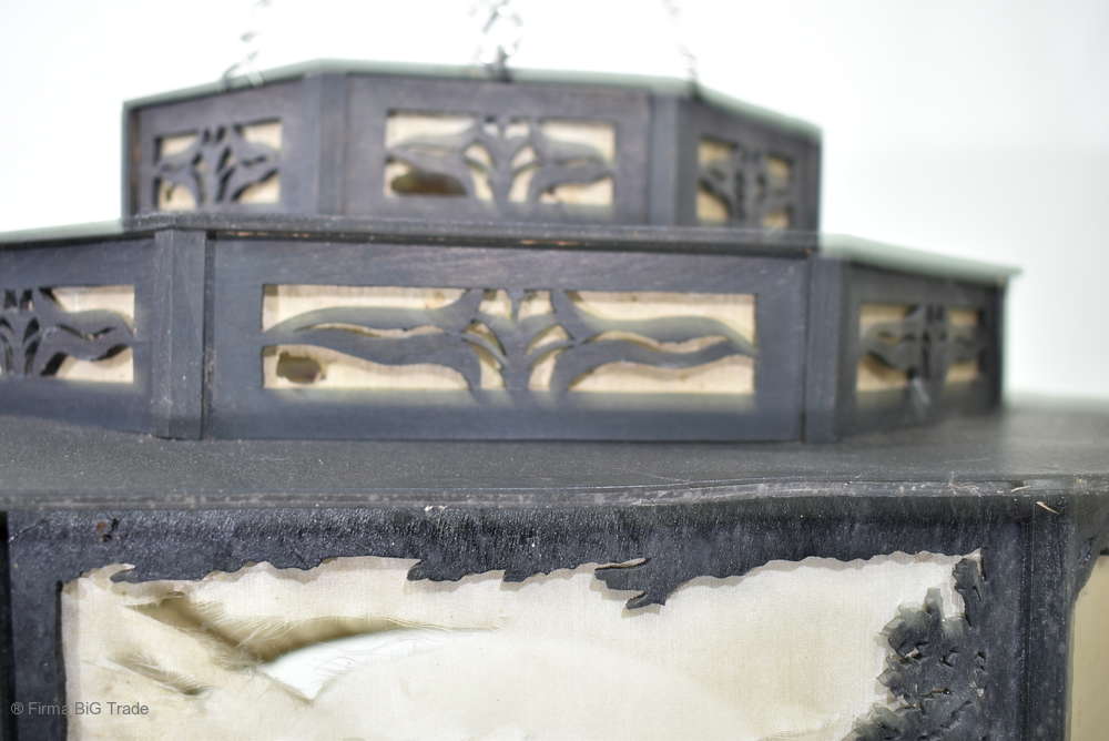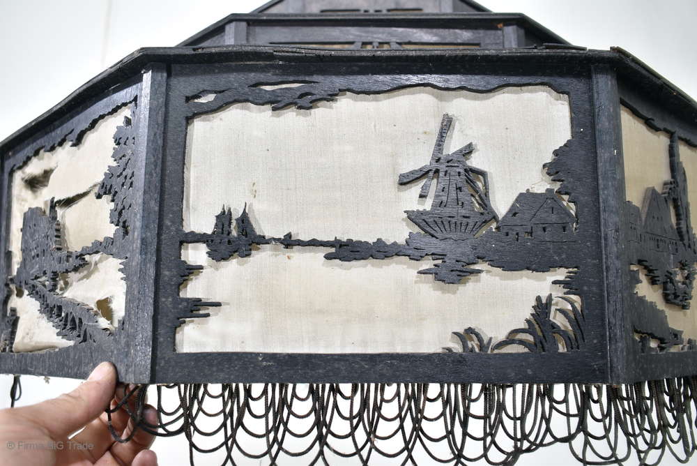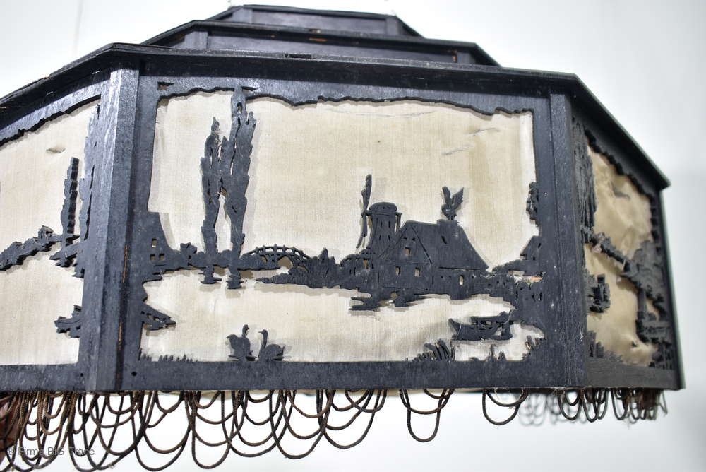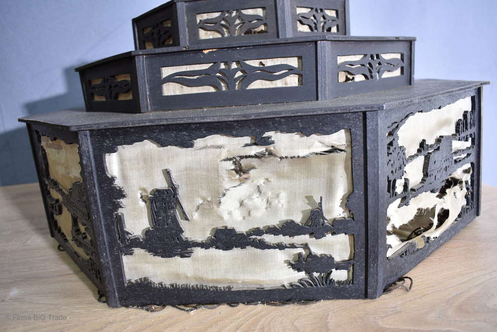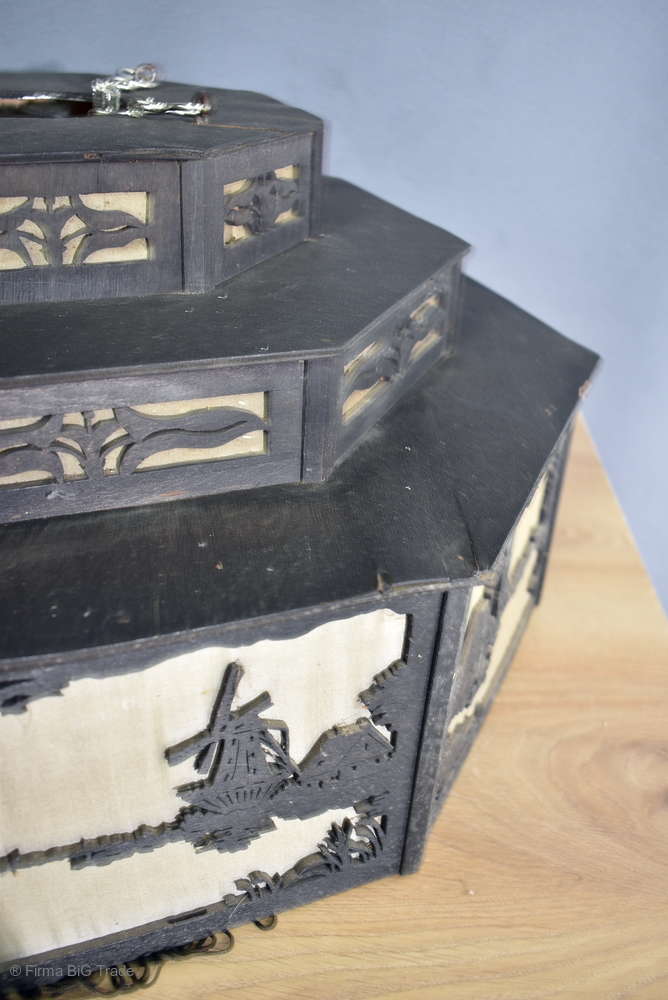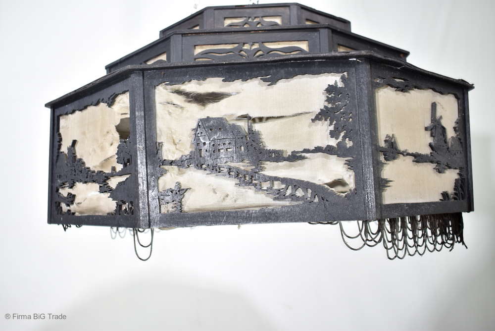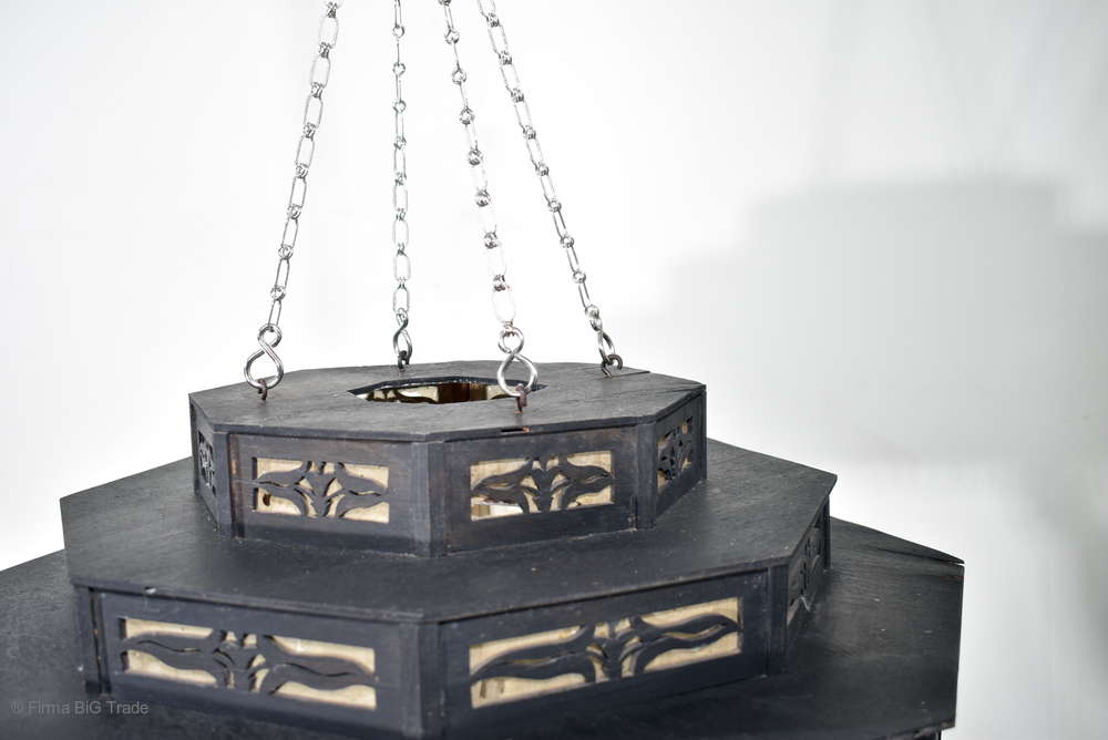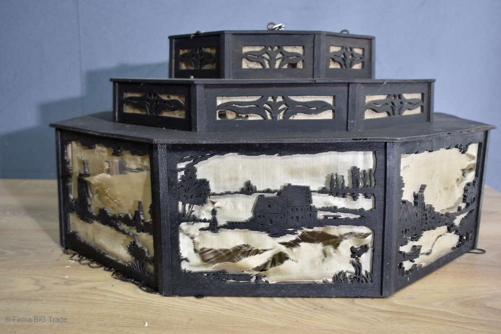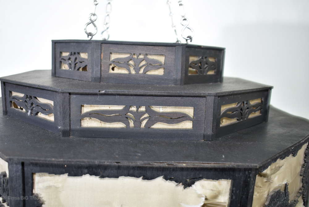 Angeboten wird ein seltener, antiker und großer Jugendstil Lampenschirm / Deckenlampe / Hängelampe aus Holz. Der 8eckige Lampe ist schwarz lackiert und mit detailreichen und meisterlichen Durchbruch-Schnitzereien in unterschiedlichen Motiven verziert. Der Lampenschirm ist Stufenförmig aufgebaut, innen mit dünnem Stoff belegt. Der Boden ist herausnehmbar Auf dem Deckel sind 4 kleine Haken, es werden 2 neuzeitige Ketten zur Befestigung mitgeliefert. Am antiken Lampenschirm sind Alters- und Gebrauchsspuren vorhanden u.a. der Stoff ist an einigen Stellen verschließen, Stoßstellen, Kratzer und Holzabsplitterungen (siehe Bilder), befindet sich ansonsten in einem guten und stabilen Zustand.