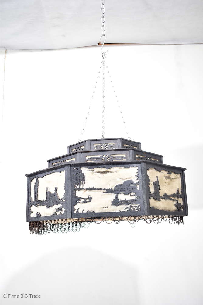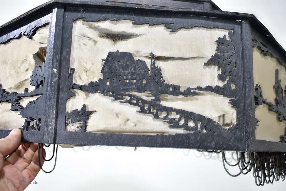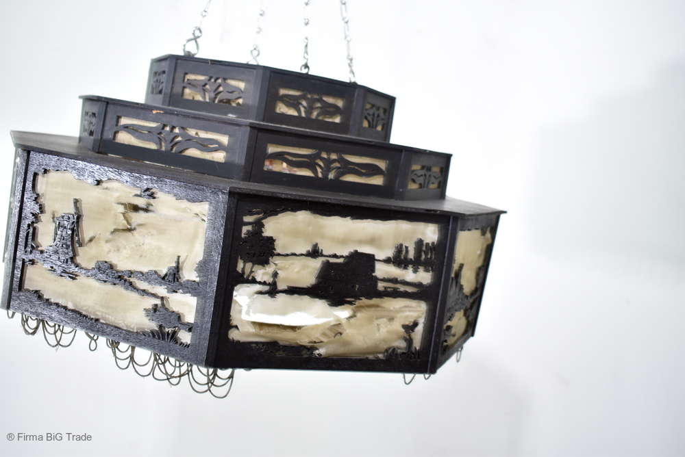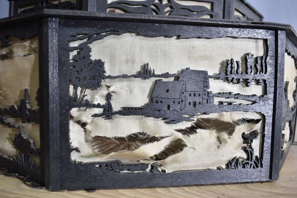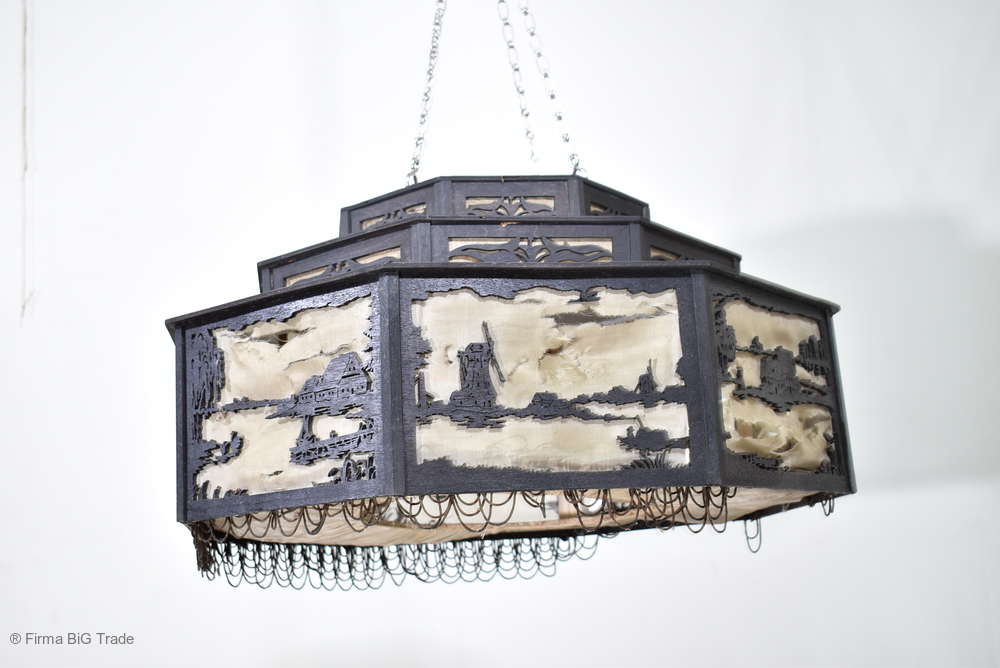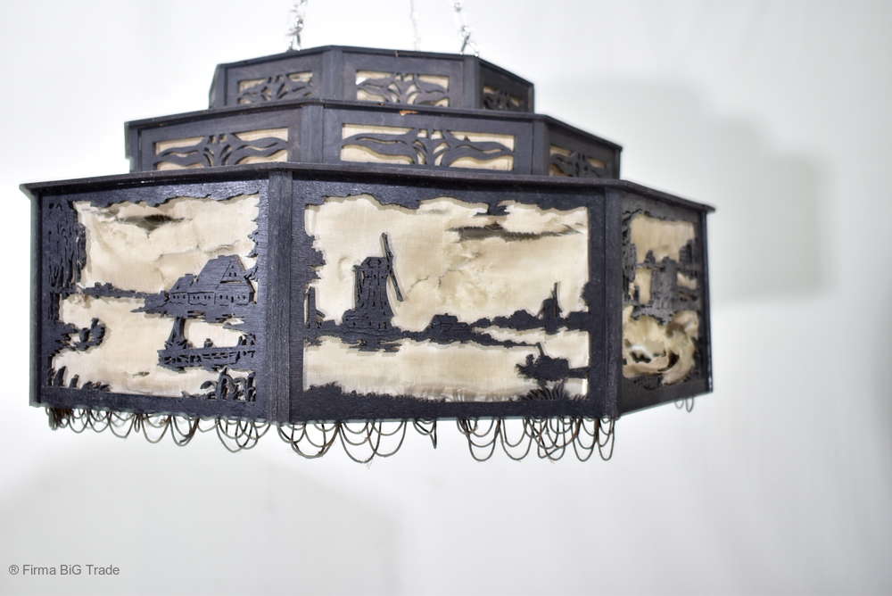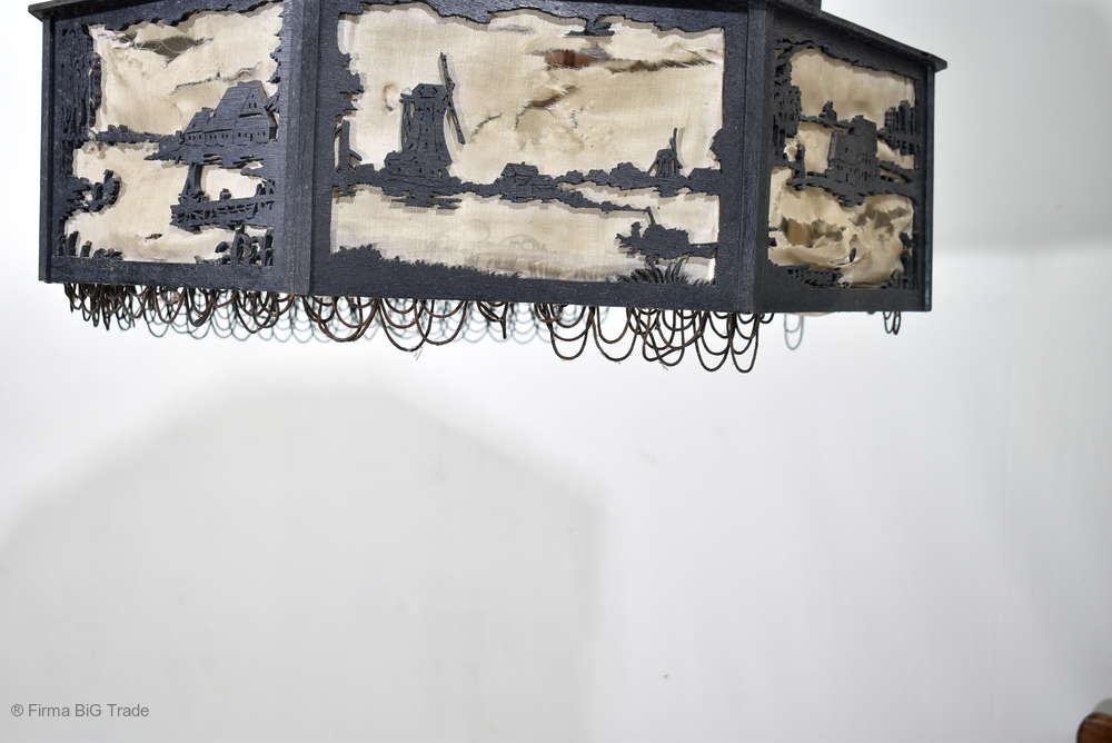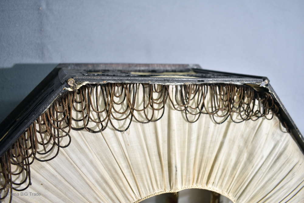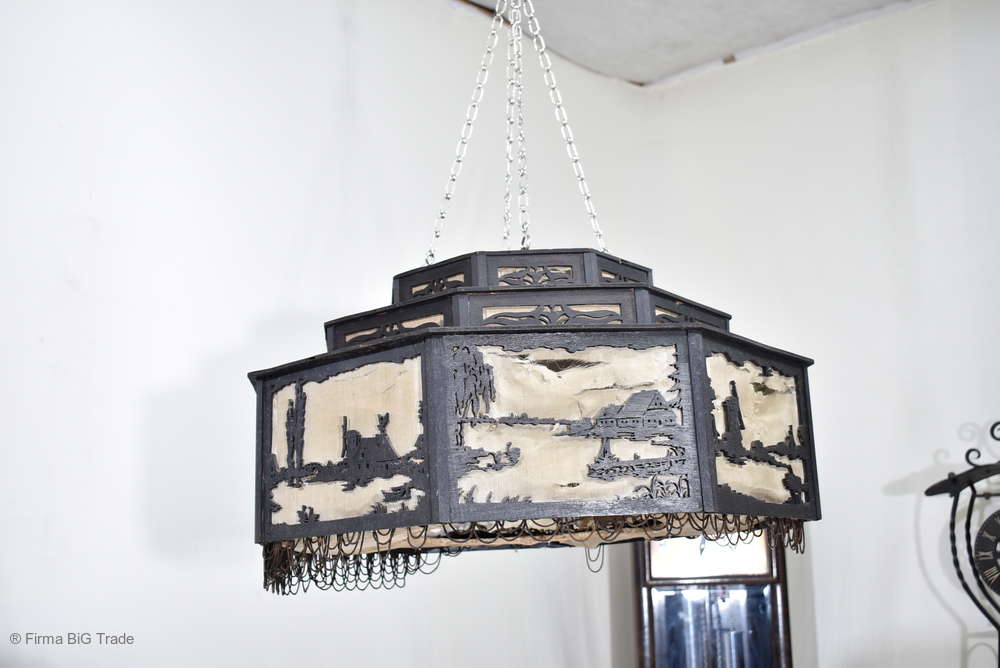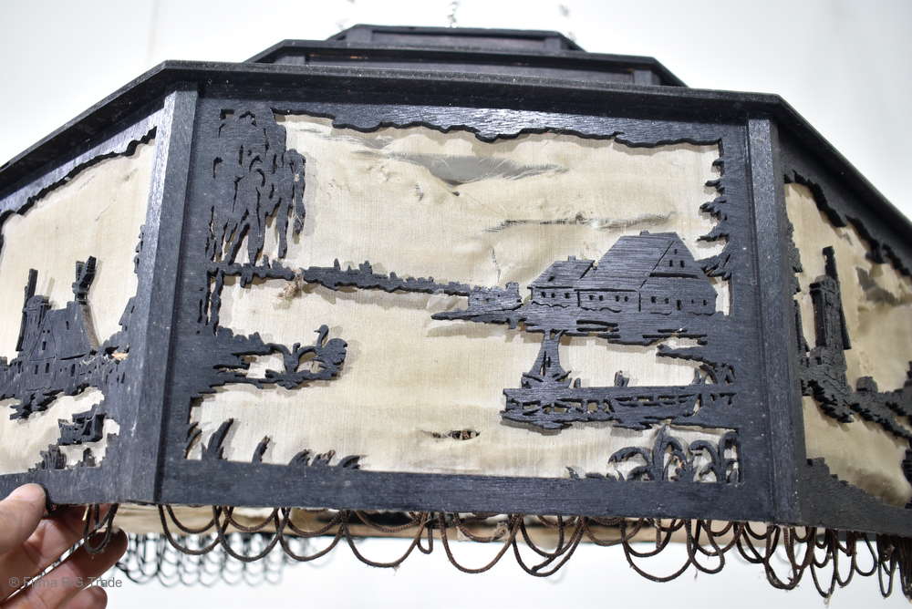 Angeboten wird ein seltener, antiker und großer Jugendstil Lampenschirm / Deckenlampe / Hängelampe aus Holz. Der 8eckige Lampe ist schwarz lackiert und mit detailreichen und meisterlichen Durchbruch-Schnitzereien in unterschiedlichen Motiven verziert. Der Lampenschirm ist Stufenförmig aufgebaut, innen mit dünnem Stoff belegt. Der Boden ist herausnehmbar Auf dem Deckel sind 4 kleine Haken, es werden 2 neuzeitige Ketten zur Befestigung mitgeliefert. Am antiken Lampenschirm sind Alters- und Gebrauchsspuren vorhanden u.a. der Stoff ist an einigen Stellen verschließen, Stoßstellen, Kratzer und Holzabsplitterungen (siehe Bilder), befindet sich ansonsten in einem guten und stabilen Zustand.