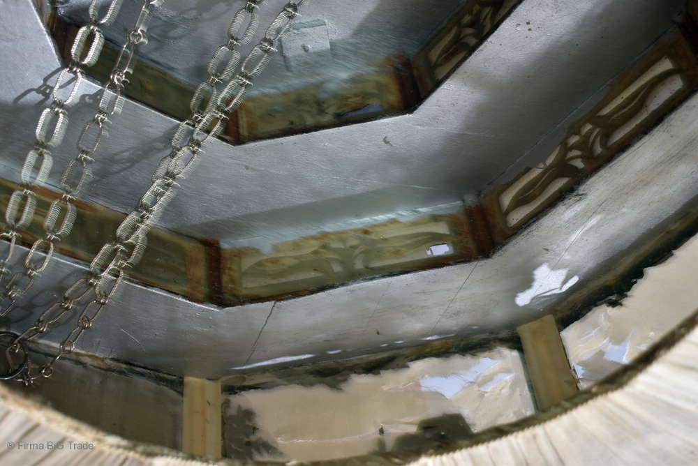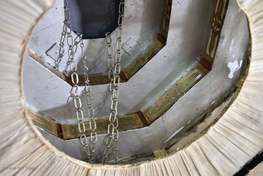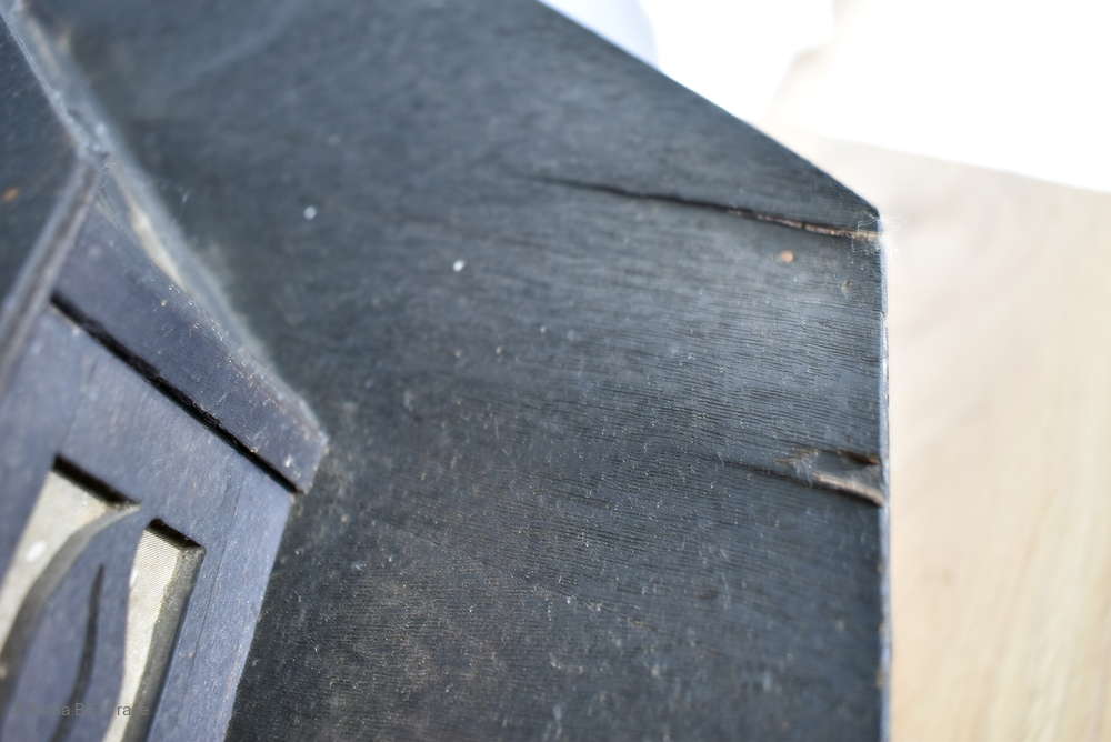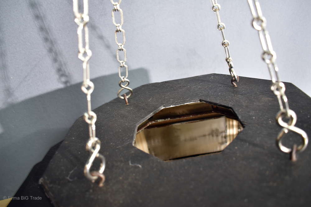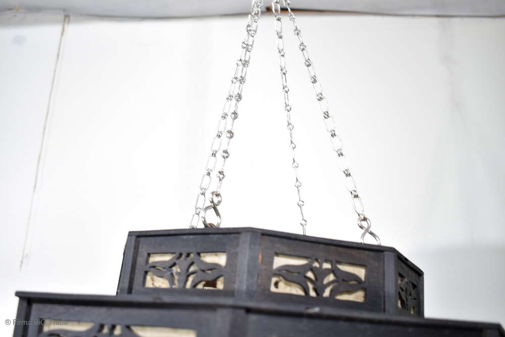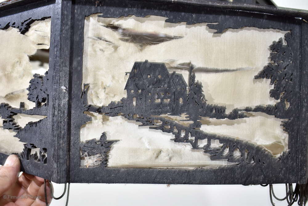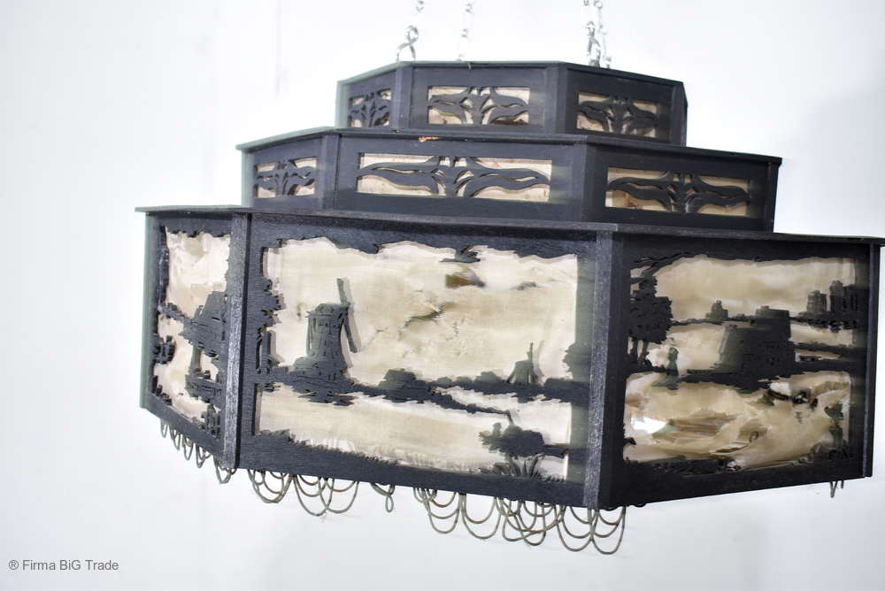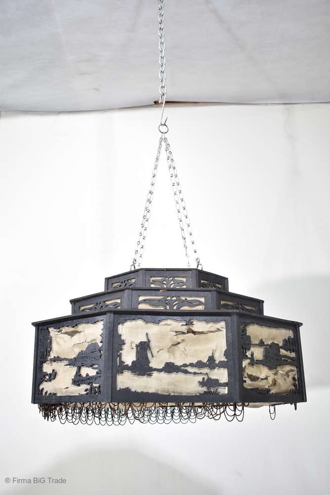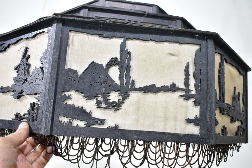 Angeboten wird ein seltener, antiker und großer Jugendstil Lampenschirm / Deckenlampe / Hängelampe aus Holz. Der 8eckige Lampe ist schwarz lackiert und mit detailreichen und meisterlichen Durchbruch-Schnitzereien in unterschiedlichen Motiven verziert. Der Lampenschirm ist Stufenförmig aufgebaut, innen mit dünnem Stoff belegt. Der Boden ist herausnehmbar Auf dem Deckel sind 4 kleine Haken, es werden 2 neuzeitige Ketten zur Befestigung mitgeliefert. Am antiken Lampenschirm sind Alters- und Gebrauchsspuren vorhanden u.a. der Stoff ist an einigen Stellen verschließen, Stoßstellen, Kratzer und Holzabsplitterungen (siehe Bilder), befindet sich ansonsten in einem guten und stabilen Zustand.