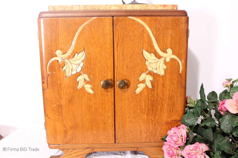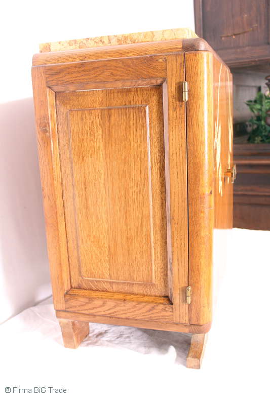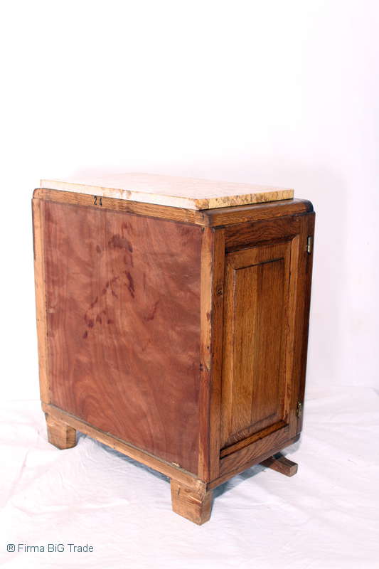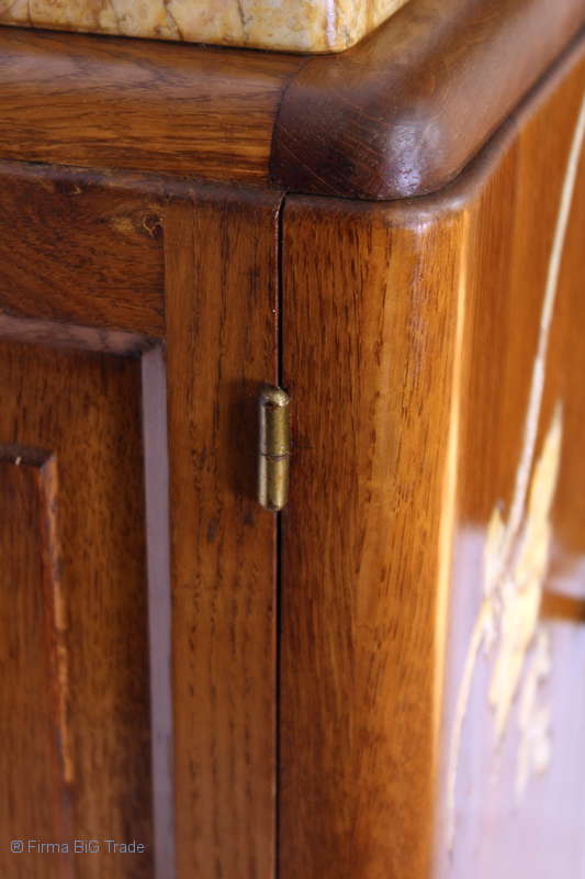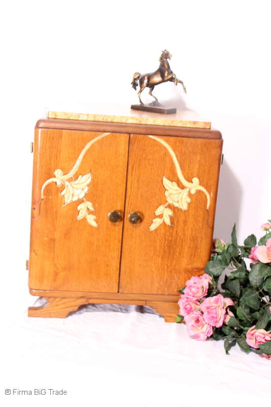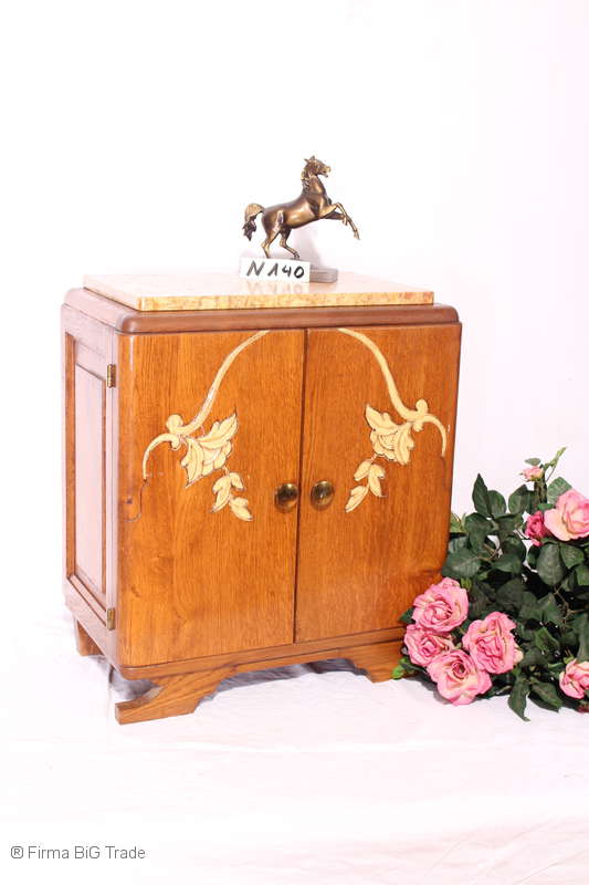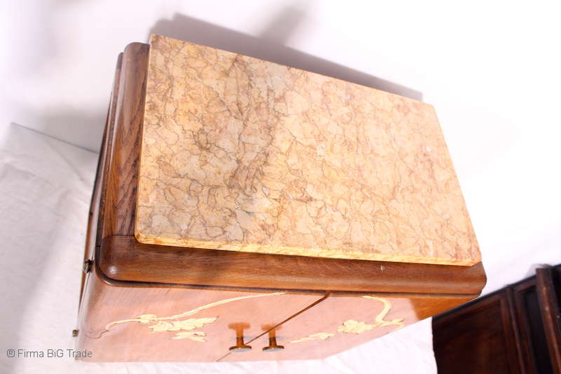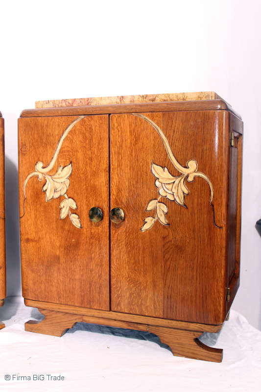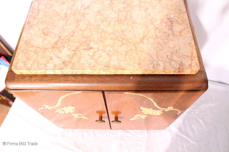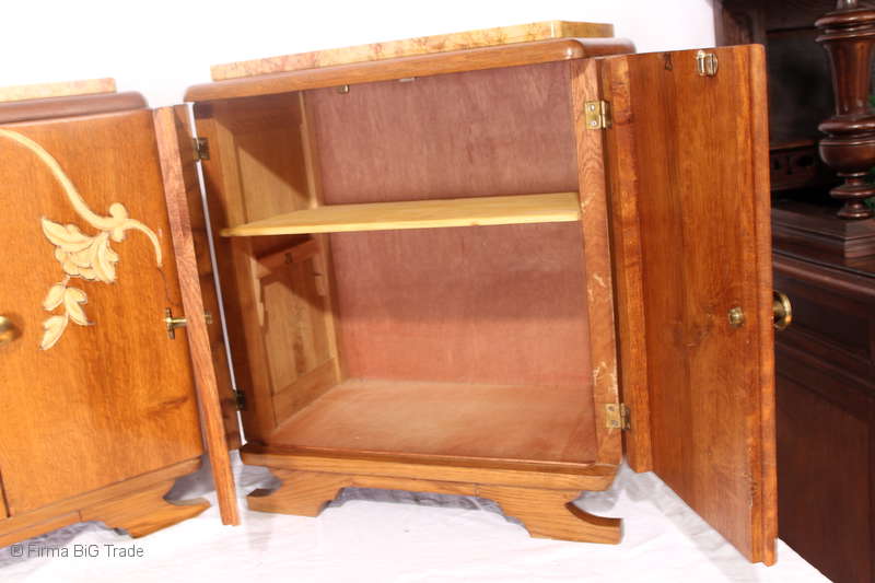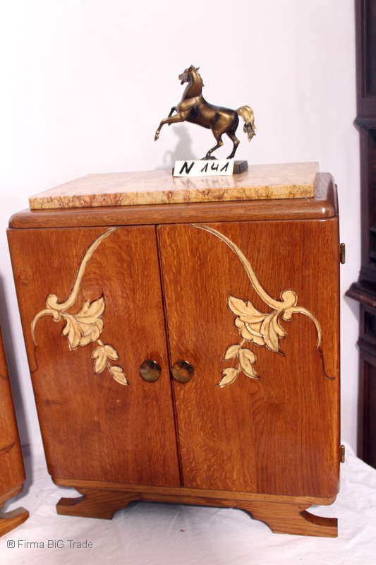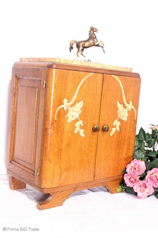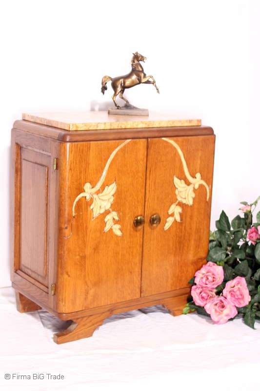 Angeboten wird ein seltener zauberhafter antiker Art Déco Nachttisch / Nachtschrank / Beistellschrank / Flurschrank aus massivem Holz. Das schöne Schränkchen besitzt 2 Flügeltüren mit wunderschönen floralen Schnitzerein die farblich abgesetzt sind. Dahinter ist ein Einlegebrett. Die runden Türgriffe sind aus Metall. Die Vorderfüße sind sehr schön geschwungen gestaltet. Die Deckplatte besteht aus beigem Marmorstein mit schöner Maserung. Der antike Nachtschrank weist hier und da Gebrauchsspuren auf u.a. Kratzer, Flecken, Stoßstellen (siehe Bilder), ansonsten befindet sich der zauberhafte antike Art Déco Nachtschrank in einem guten gebrauchten Zustand. Von diesem Nachtschrank sind 2 Stück vorhanden