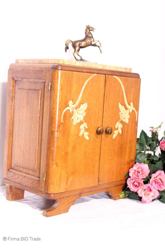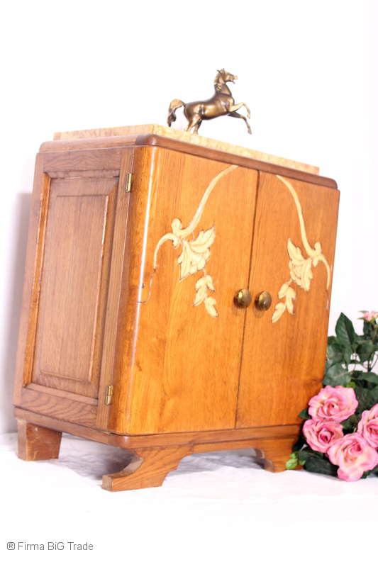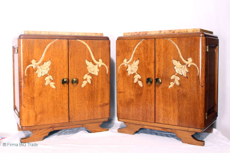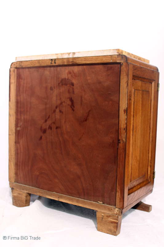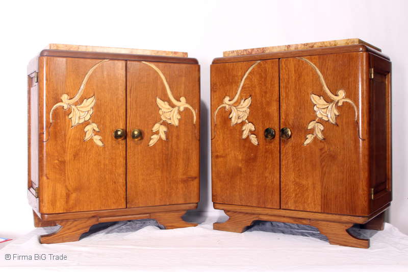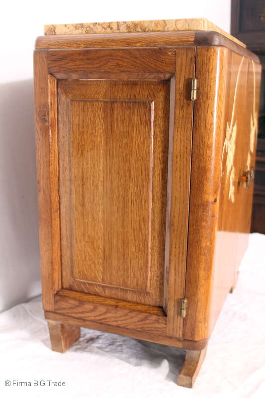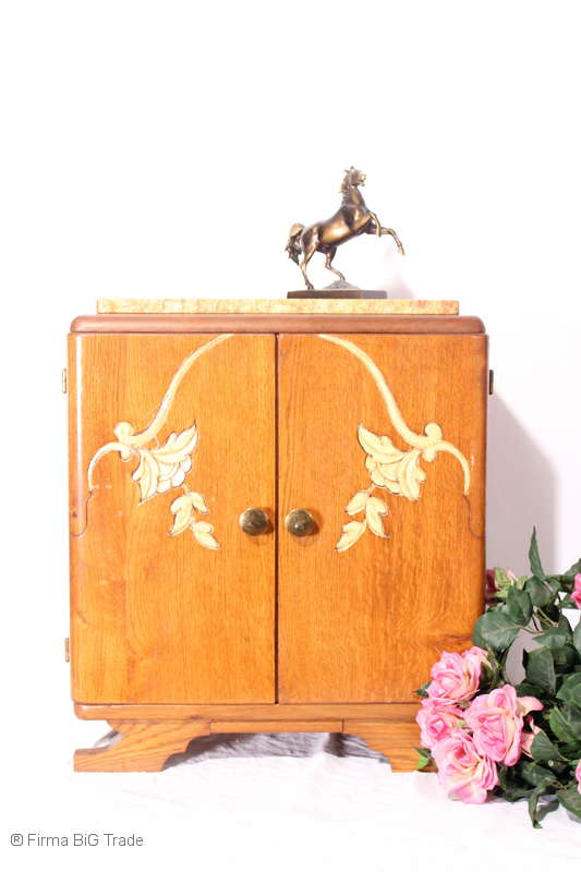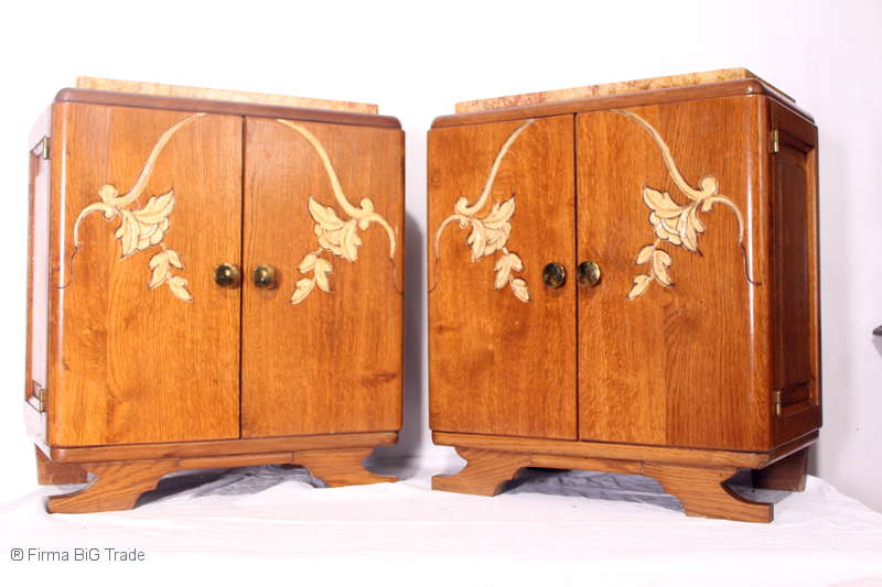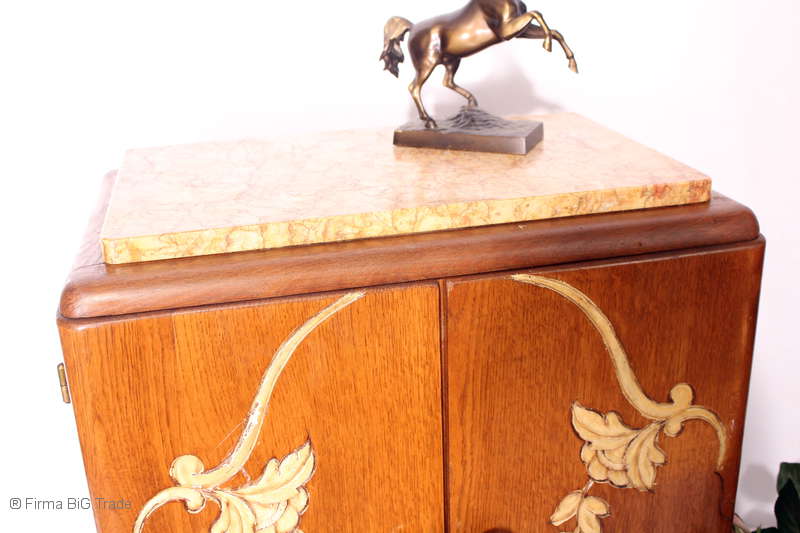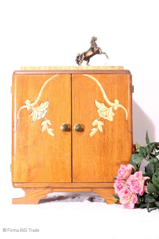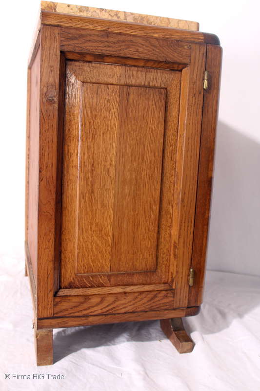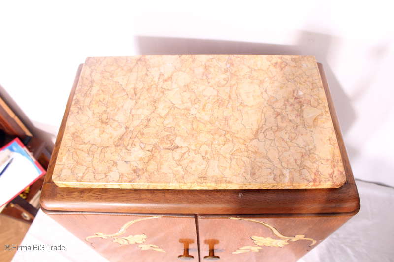 Angeboten wird ein seltener zauberhafter antiker Art Déco Nachttisch / Nachtschrank / Beistellschrank / Flurschrank aus massivem Holz. Das schöne Schränkchen besitzt 2 Flügeltüren mit wunderschönen floralen Schnitzerein die farblich abgesetzt sind. Dahinter ist ein Einlegebrett. Die runden Türgriffe sind aus Metall. Die Vorderfüße sind sehr schön geschwungen gestaltet. Die Deckplatte besteht aus beigem Marmorstein mit schöner Maserung. Der antike Nachtschrank weist hier und da Gebrauchsspuren auf u.a. Kratzer, Flecken, Stoßstellen (siehe Bilder), ansonsten befindet sich der zauberhafte antike Art Déco Nachtschrank in einem guten gebrauchten Zustand. Von diesem Nachtschrank sind 2 Stück vorhanden